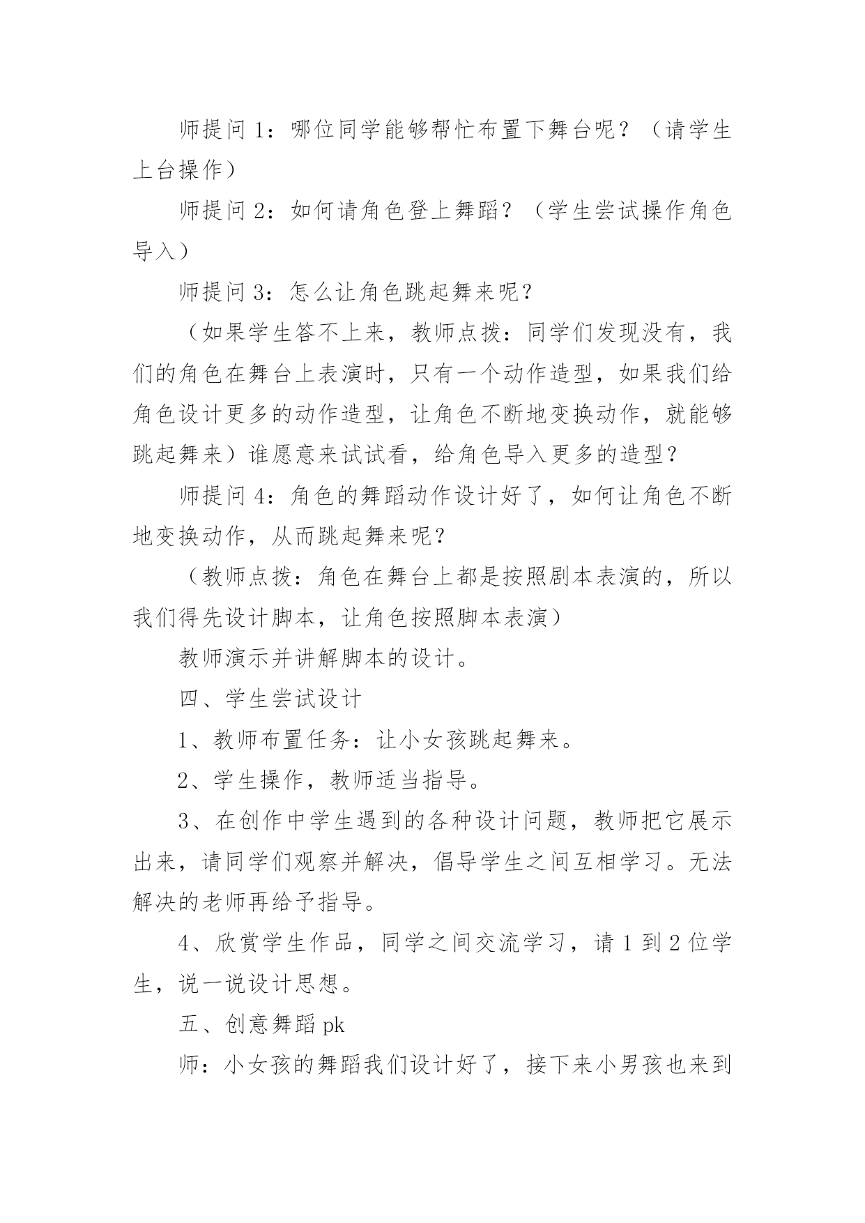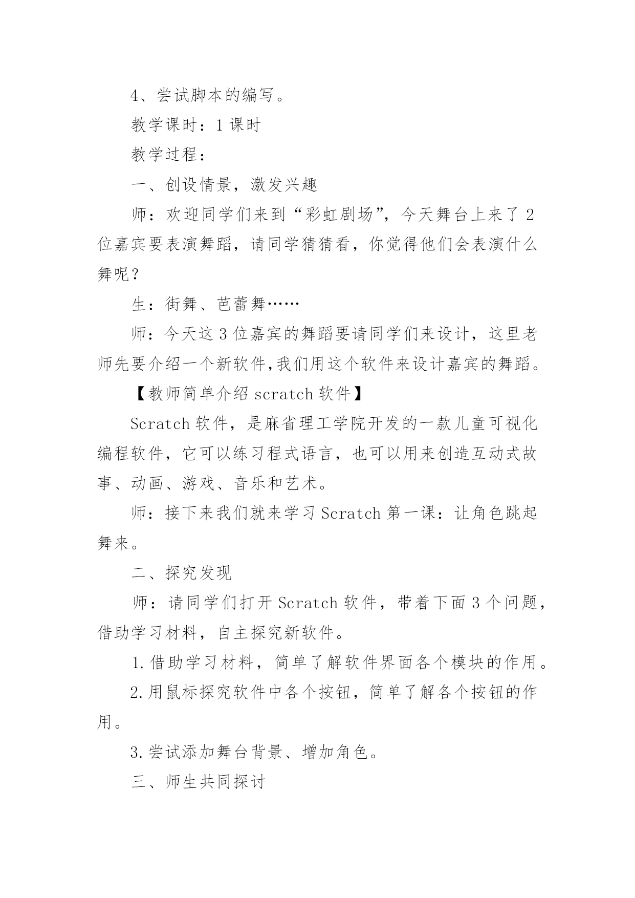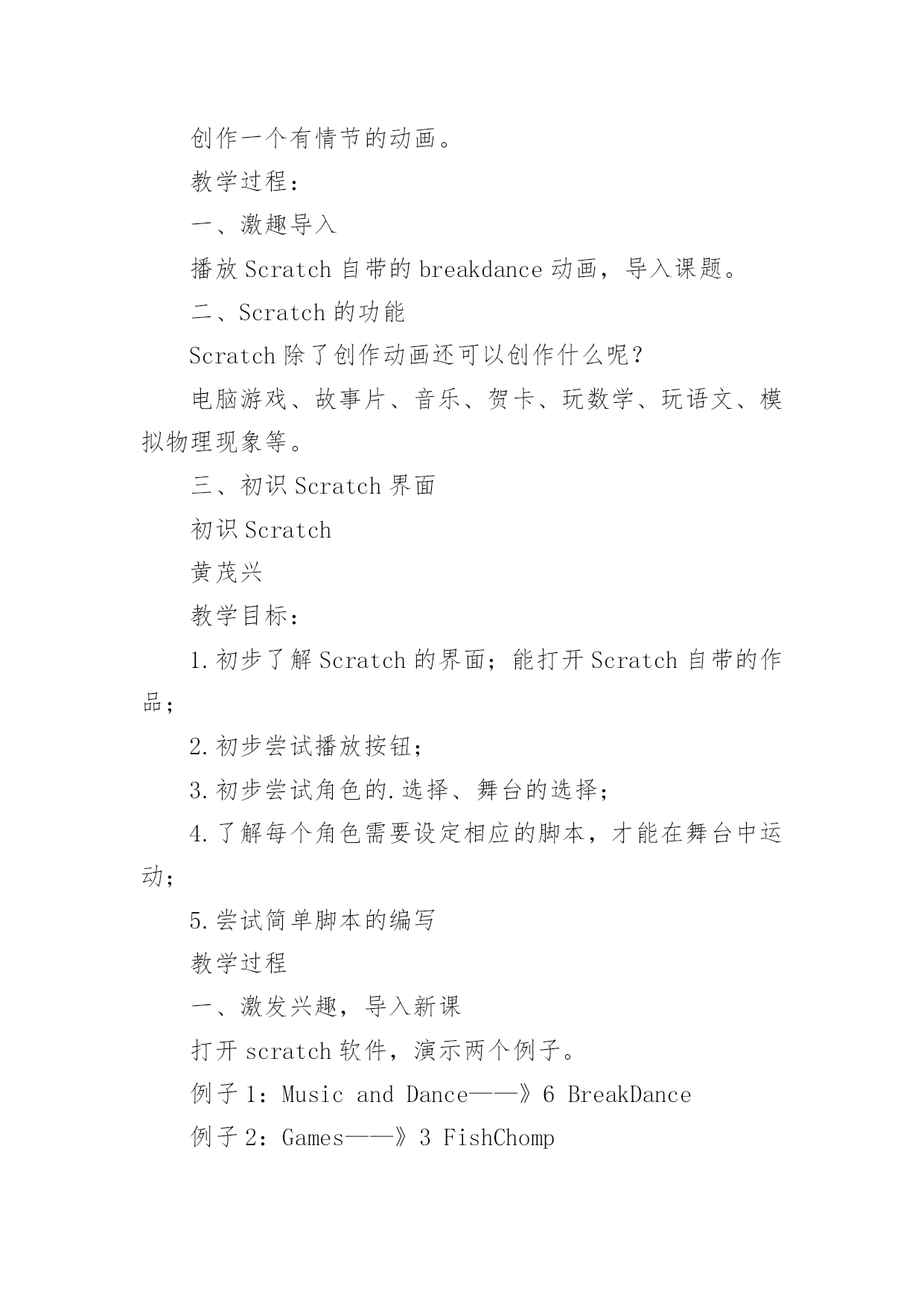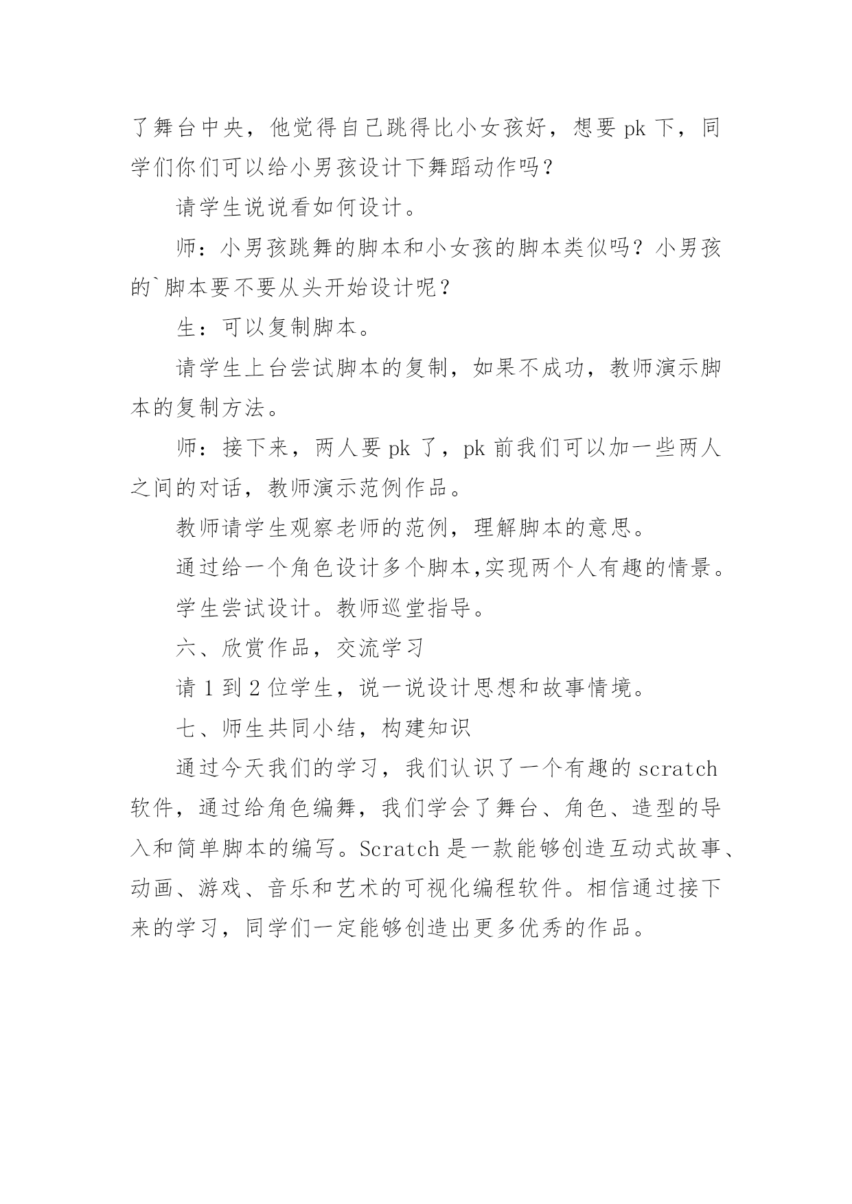 Scratch教学设计Scratch教学设计作为一名教师,通常需要用到教学设计来辅助教学,借助教学设计可以提高教学效率和教学质量。那要怎么写好教学设计呢?下面是小编收集整理的Scratch教学设计,欢迎大家借鉴与参考,希望对大家有所帮助。Scratch教学设计1教学目标:知识与技能:1.学会启动和退出Scratch,认识Scratch的工作界面。2.学会新增舞台背景,会新增/删除角色(演员)3.学会使用如下程序块:过程与方法:通过创作一个有情节的动画,了解舞台、角色列表、角色资料区、脚本区和程序区之间的相互联系。情感态度与价值观:通过学生自己创作动画、展示同学的动画让感受使用Scratch带来的乐趣并对Scratch产生兴趣。教学重点:新增舞台背景,会新增/删除角色(演员)教学难点:创作一个有情节的动画。教学过程:一、激趣导入播放Scratch自带的breakdance动画,导入课题。二、Scratch的功能Scratch除了创作动画还可以创作什么呢?电脑游戏、故事片、音乐、贺卡、玩数学、玩语文、模拟物理现象等。三、初识Scratch界面初识Scratch黄茂兴教学目标:1.初步了解Scratch的界面;能打开Scratch自带的作品;2.初步尝试播放按钮;3.初步尝试角色的.选择、舞台的选择;4.了解每个角色需要设定相应的脚本,才能在舞台中运动;5.尝试简单脚本的编写教学过程一、激发兴趣,导入新课打开scratch软件,演示两个例子。例子1:MusicandDance——》6BreakDance例子2:Games——》3FishChomp在演示例子的过程中,学生掌握“开始执行绿旗控制”、“全部停止”等5个按钮。学生自由操作10分钟时间,根据兴趣导入作品,欣赏作品。介绍Scratch的功能:除了创作动画还可以创作什么呢?二、初识Scratch1.打开软件2.介绍界面(1)舞台:角色演出的地方,随机介绍(2)角色列表区:所有演员都会在这个地方休息(3)角色资料区:显示当前角色的名称,旋转方向,坐标位置等基本资料(4)脚本区:我们将选择好的指令安州顺序放在脚本区内,像搭积木一样设计脚本,告诉角色在舞台上要做什么(5)程序指令区:在这里选择程序命令,只要用拖拉的方式,把命令积木堆叠起来,轻轻松松就可以创作出很棒的作品来。三、尝试创作介绍“程序指令分类”和“脚本”。把“程序指令分类”中的“指令”比喻为“积木”,“程序指令分类”是各种同类型的积木进行分类存放。“脚本”就是“搭积木”的过程。创作在舞台上自由的走动的Scratch小猫,初步学习“动作”、“控制”和“外观”。学生操作。教师巡视,全班一半学生能够在规定的时间内完成。四、添加舞台背景及更多的角色五、课堂小结:这节课你学会了什么?Scratch教学设计2一、教材分析江苏凤凰科学技术出版社出版社五年级第11课《初识scratch》。该单元主要目标是学生对计算机程序设计产生学习兴趣,提升学生用计算机解决问题的能力。作为单元起始课主要内容有:认识Scratch界面、掌握指令的基本操作、编写一个让角色动起来的脚本。二、教学目标1、认识Scratch界面主要组成部分(舞台区、角色列表区、指令面板、脚本区)及其作用。2、通过任务“升上太空”,认识体验按构3、思用指令编写脚本。4、通过任务“采摘仙桃”,体验用Scratch编程的一般过程。5、通过范例试玩、作品制作,对Scratch产生学习兴趣。三、教学重难点教学重点:1、认识Scratch界面。2、按构思编写角色上下左右移动的脚本。教学难点:合理组合指令,用脚本实现预设程序效果。四、学情分析五年级学生有一定的计算机基础,对游戏、动画充满兴趣,有较强的创作欲望。但是学生个体之间依然存在差异,还应当通过个别指导完成教学目标。五、教学方法以任务驱动法与问题探究法为主,展开游戏化学习,将游戏积极元素(问题情境、角色扮演、及时评价等)融入到任务设计与课堂教学中,在游戏轻松的氛围下实现边玩边学。六、教学过程(一)激趣导入这四个指令,师:今天,天宫举行蟠桃大会,王母娘娘邀请孙悟空和宠物小猫去品仙桃,所以孙悟空和小猫相约花果山,打算结伴而行。(观看宠物小猫视频。)师:从“宠物小猫”那里你获得了哪些信息?揭题:初识Scratch。(二)学习新知1、出示Scratch界面,请学生猜猜几个主要区域的作用。2、归纳几个主要区域的作用。结合指令的'基本操作演示编写一小段简单的脚本。3、请学生玩一玩,试着编写一段脚本,指挥自己的小猫动起来。4、引导学生分析太空步由哪些具体的动作组成。具体分析向上走由哪些具体步骤组成。可能会用到哪些指令?5、请学生尝试填写让小猫向上移动200步的脚本。6、布置分层任务:基础任务:模仿教师范例。高级任务:在基础任务的基础上通过修改参数、添