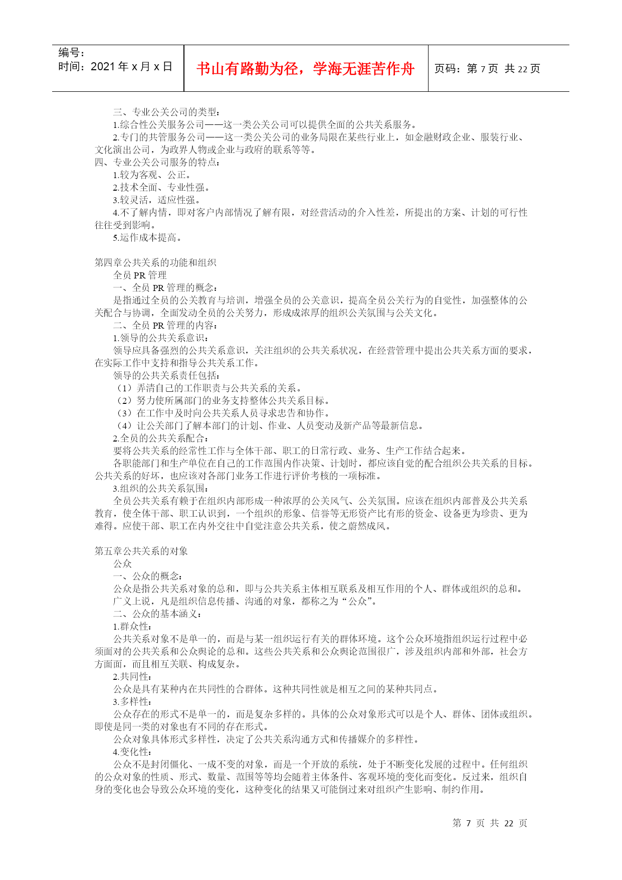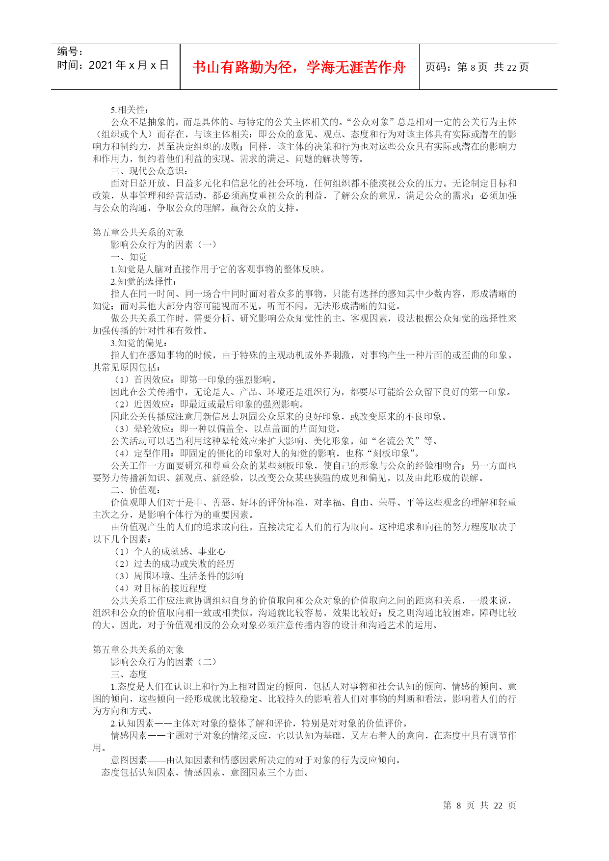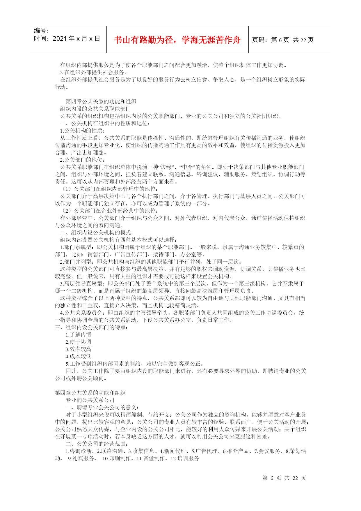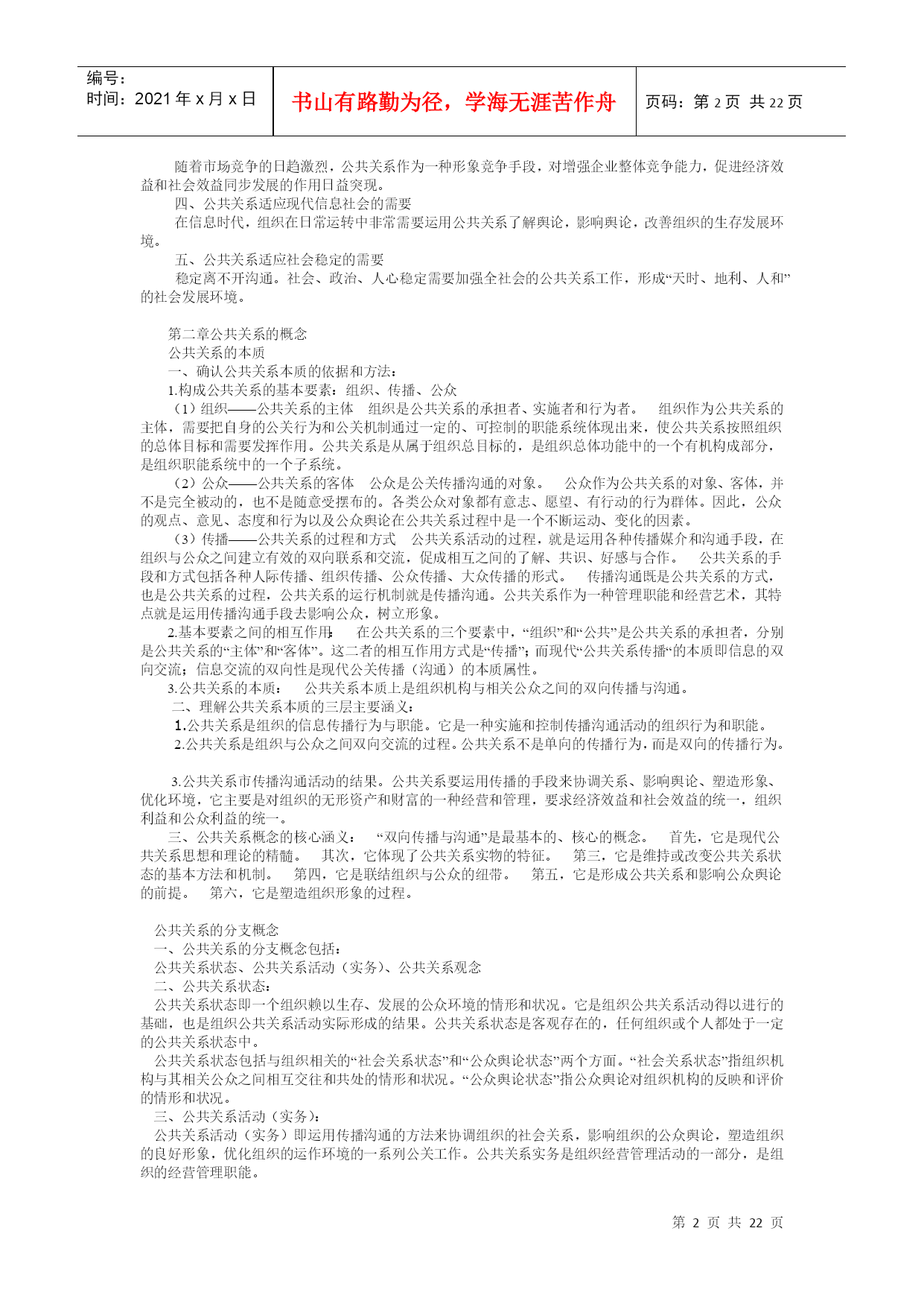 编号:时间:2021年x月x日书山有路勤为径,学海无涯苦作舟页码:第PAGE22页共NUMPAGES22页第PAGE\*MERGEFORMAT22页共NUMPAGES\*MERGEFORMAT22页HYPERLINK"xxxx/"第一章导论第一节公共关系学的研究对象和内容一、公共关系学的研究对象公共关系学的研究对象是“组织与公众之间的传播与沟通”。对于这一概念,应重点从三个角度认真把握。1.“公共关系”的性质:公共关系特指组织与公众之间的传播沟通关系,即组织与公众环境之间信息交流关系;2.“公共关系职能”的性质:即运用各种传播、沟通手段去影响公众的观点、态度和行为,争取公众舆论的理解和支持,为组织的生存、发展创造良好的社会环境。3.“公共关系学科”的性质:是一门综合性的应用传播学、组织传播学,是现代传播学在组织经营管理中的应用和发展。二、公共关系学的基本内容重点理解公共关系学基本内容的九个方面:1.公共关系的概念:公共关系是什么,公共关系的三个基本要素,即社会组织、公众、传播与沟通;2.公共关系的历史:公关的形成、发展概况、产生的社会历史条件;3.公共关系的行为主体:公关由谁来做,有何作用;4.公共关系的对象:公关对谁做;5.公共关系的管理过程:完整地理解公关工作的整个过程;6.公共关系的媒介:学习和掌握公关的基本工具和技术手段;7.公共关系活动实务:包括调查研究、新闻传播、公关广告、专题活动、处理危机、交际事务等;8.公共关系的职业道德和法律制约:公关行为基本准则;9.公共关系在中国应用的国情和特色:公关的中国特色。第二节公共关系的研究角度和方法对公共关系进行研究的学科角度主要有:从管理学角度,从经营学角度,从传播学角度等。一、从管理学角度研究的特点:1.将公共关系作为管理过程的一个要素;2.将公共关系本身视作管理的一个过程。二、从经营学角度研究的特点:1.将公关作为实施推广,影响环境的手段,突出公关的谋略、技巧、艺术的实用研究;2.更重视信息和形象的商业价值,将信息、形象关系作为重要的经营要素和资源,将公共关系作为经营投入的一部分,并努力使其转化为实际财富,产生出经济效益。三、从传播学角度研究的特点:1.按传播的基本模式分析公共关系的三个基本要素;2.从公众舆论的角度研究、处理组织的公众环境和公众形象问题;3.研究各种不同的传播方式及其传播效果;4.直接引入传播学中有关传播媒介与技术的研究,对公共关系各种媒介的特点、功能进行分析。第三节学习公共关系学的现实意义一、公共关系适应对外开放的需要一方面要不断了解世界,汲取对自身建设和发展有利的各种信息;另一方面要传播自己,增进各国对中国的了解、理解和支持。二、公共关系适应体制改革的需要体制改革使公共关系日益成为组织自身的一种行为机制和经营管理方式。三、公共关系适应市场经济发展的需要随着市场竞争的日趋激烈,公共关系作为一种形象竞争手段,对增强企业整体竞争能力,促进经济效益和社会效益同步发展的作用日益突现。四、公共关系适应现代信息社会的需要在信息时代,组织在日常运转中非常需要运用公共关系了解舆论,影响舆论,改善组织的生存发展环境。五、公共关系适应社会稳定的需要稳定离不开沟通。社会、政治、人心稳定需要加强全社会的公共关系工作,形成“天时、地利、人和”的社会发展环境。第二章公共关系的概念公共关系的本质一、确认公共关系本质的依据和方法:1.构成公共关系的基本要素:组织、传播、公众(1)组织——公共关系的主体组织是公共关系的承担者、实施者和行为者。组织作为公共关系的主体,需要把自身的公关行为和公关机制通过一定的、可控制的职能系统体现出来,使公共关系按照组织的总体目标和需要发挥作用。公共关系是从属于组织总目标的,是组织总体功能中的一个有机构成部分,是组织职能系统中的一个子系统。(2)公众——公共关系的客体公众是公关传播沟通的对象。公众作为公共关系的对象、客体,并不是完全被动的,也不是随意受摆布的。各类公众对象都有意志、愿望、有行动的行为群体。因此,公众的观点、意见、态度和行为以及公众舆论在公共关系过程中是一个不断运动、变化的因素。(3)传播——公共关系的过程和方式公共关系活动的过程,就是运用各种传播媒介和沟通手段,在组织与公众之间建立有效的双向联系和交流,促成相互之间的了解、共识、好感与合作。公共关系的手段和方式包括各种人际传播、组织传播、公众传播、大众传播的形式。传播沟通既是公共关系的方式,也是公共关系的过程,公共关系的运行机制就是传播沟通。公共关系作为一种管理职能和经营艺术,其特点就是运用传播沟通手段去影响公众,树立形象。2.基本要素之间的相互作用:在公共关系的三个要素中,“组织”和“公共”是公共关系的承担者,分别是公共关