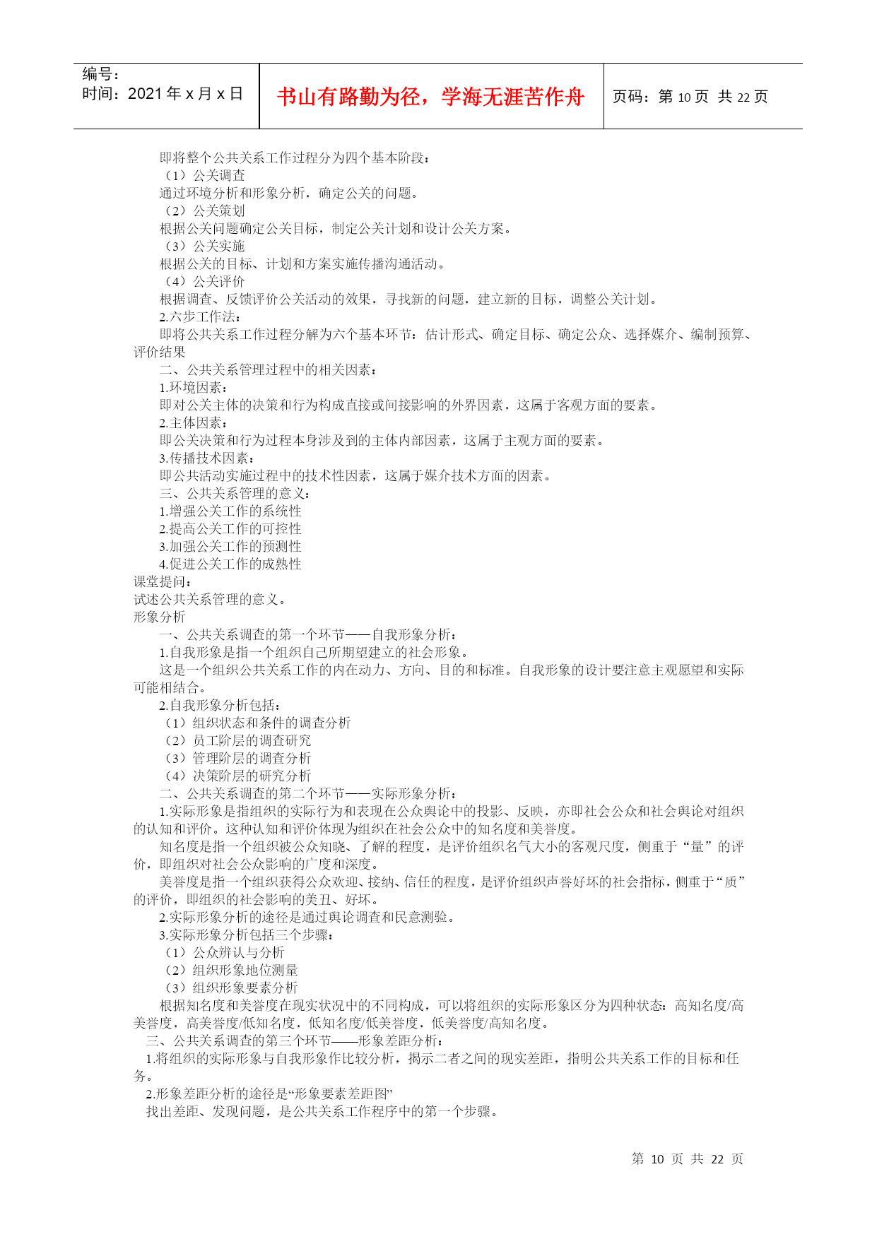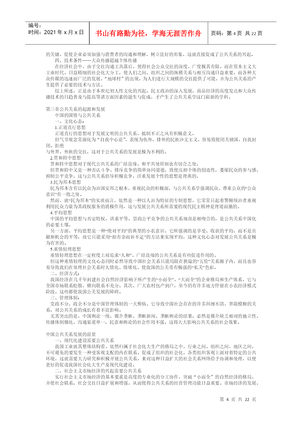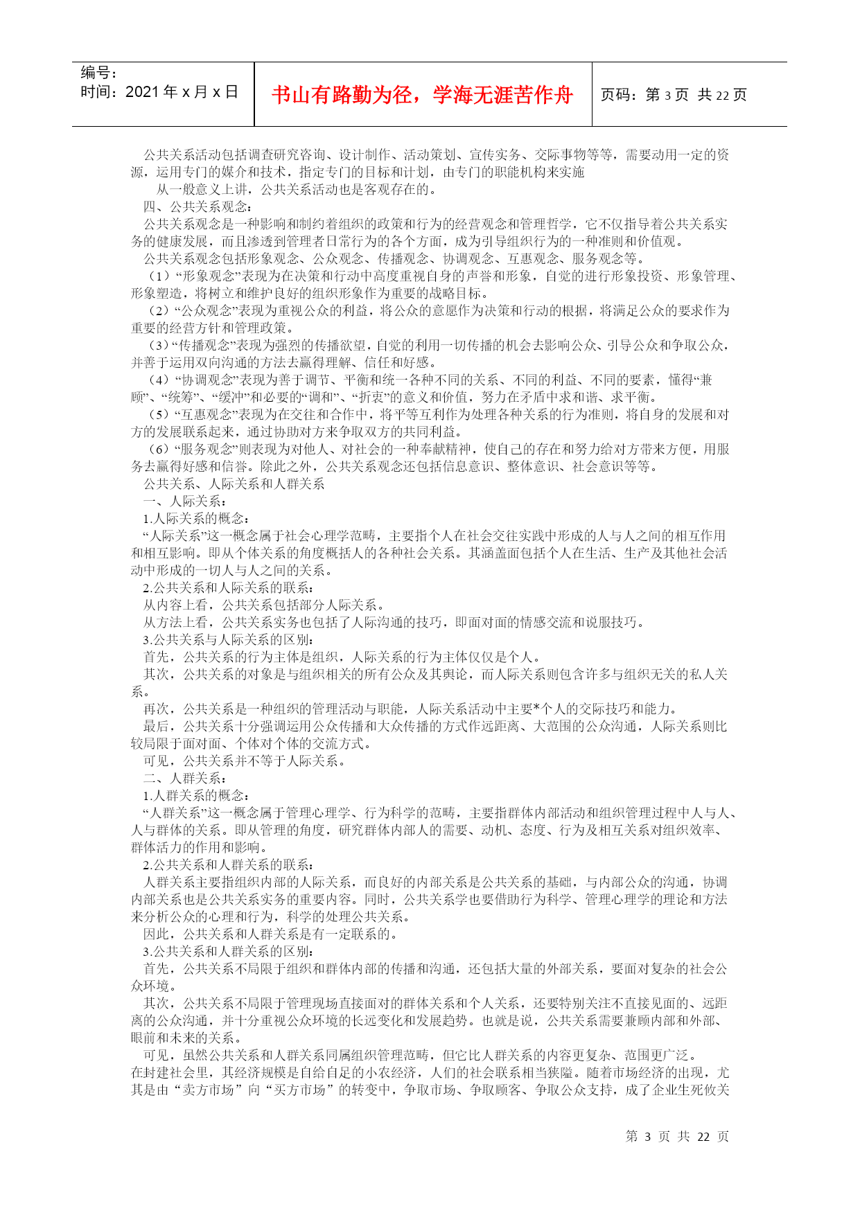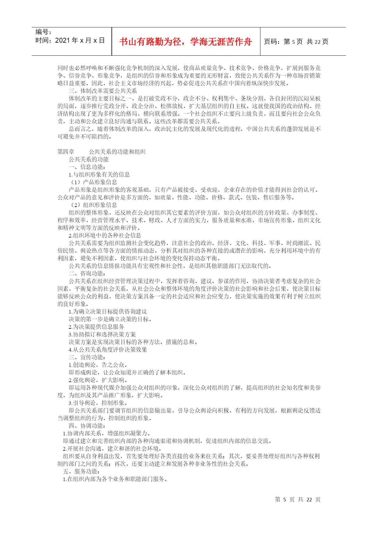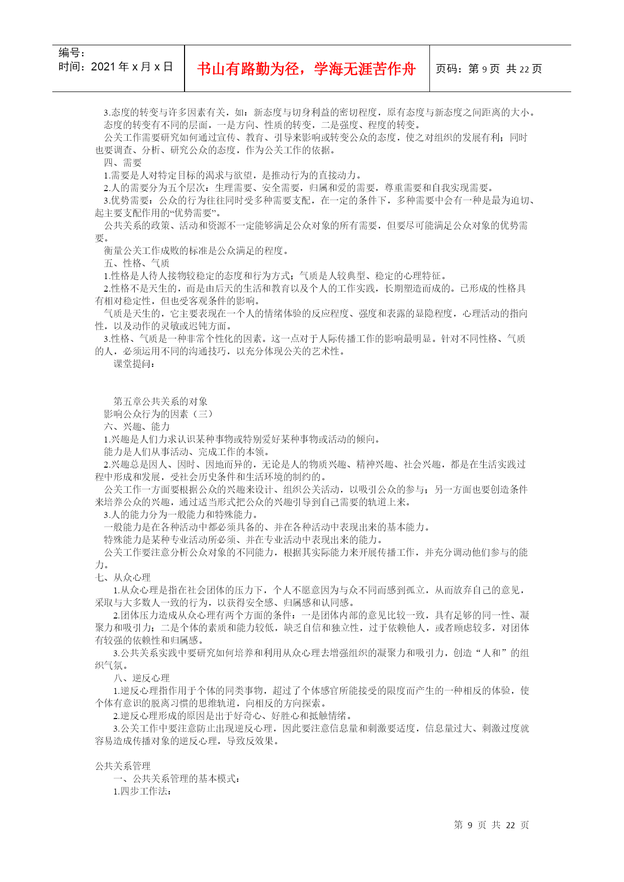 编号:时间:2021年x月x日书山有路勤为径,学海无涯苦作舟页码:第PAGE22页共NUMPAGES22页第PAGE\*MERGEFORMAT22页共NUMPAGES\*MERGEFORMAT22页HYPERLINK"xxxx/"第一章导论第一节公共关系学的研究对象和内容一、公共关系学的研究对象公共关系学的研究对象是“组织与公众之间的传播与沟通”。对于这一概念,应重点从三个角度认真把握。1.“公共关系”的性质:公共关系特指组织与公众之间的传播沟通关系,即组织与公众环境之间信息交流关系;2.“公共关系职能”的性质:即运用各种传播、沟通手段去影响公众的观点、态度和行为,争取公众舆论的理解和支持,为组织的生存、发展创造良好的社会环境。3.“公共关系学科”的性质:是一门综合性的应用传播学、组织传播学,是现代传播学在组织经营管理中的应用和发展。二、公共关系学的基本内容重点理解公共关系学基本内容的九个方面:1.公共关系的概念:公共关系是什么,公共关系的三个基本要素,即社会组织、公众、传播与沟通;2.公共关系的历史:公关的形成、发展概况、产生的社会历史条件;3.公共关系的行为主体:公关由谁来做,有何作用;4.公共关系的对象:公关对谁做;5.公共关系的管理过程:完整地理解公关工作的整个过程;6.公共关系的媒介:学习和掌握公关的基本工具和技术手段;7.公共关系活动实务:包括调查研究、新闻传播、公关广告、专题活动、处理危机、交际事务等;8.公共关系的职业道德和法律制约:公关行为基本准则;9.公共关系在中国应用的国情和特色:公关的中国特色。第二节公共关系的研究角度和方法对公共关系进行研究的学科角度主要有:从管理学角度,从经营学角度,从传播学角度等。一、从管理学角度研究的特点:1.将公共关系作为管理过程的一个要素;2.将公共关系本身视作管理的一个过程。二、从经营学角度研究的特点:1.将公关作为实施推广,影响环境的手段,突出公关的谋略、技巧、艺术的实用研究;2.更重视信息和形象的商业价值,将信息、形象关系作为重要的经营要素和资源,将公共关系作为经营投入的一部分,并努力使其转化为实际财富,产生出经济效益。三、从传播学角度研究的特点:1.按传播的基本模式分析公共关系的三个基本要素;2.从公众舆论的角度研究、处理组织的公众环境和公众形象问题;3.研究各种不同的传播方式及其传播效果;4.直接引入传播学中有关传播媒介与技术的研究,对公共关系各种媒介的特点、功能进行分析。第三节学习公共关系学的现实意义一、公共关系适应对外开放的需要一方面要不断了解世界,汲取对自身建设和发展有利的各种信息;另一方面要传播自己,增进各国对中国的了解、理解和支持。二、公共关系适应体制改革的需要体制改革使公共关系日益成为组织自身的一种行为机制和经营管理方式。三、公共关系适应市场经济发展的需要随着市场竞争的日趋激烈,公共关系作为一种形象竞争手段,对增强企业整体竞争能力,促进经济效益和社会效益同步发展的作用日益突现。四、公共关系适应现代信息社会的需要在信息时代,组织在日常运转中非常需要运用公共关系了解舆论,影响舆论,改善组织的生存发展环境。五、公共关系适应社会稳定的需要稳定离不开沟通。社会、政治、人心稳定需要加强全社会的公共关系工作,形成“天时、地利、人和”的社会发展环境。第二章公共关系的概念公共关系的本质一、确认公共关系本质的依据和方法:1.构成公共关系的基本要素:组织、传播、公众(1)组织——公共关系的主体组织是公共关系的承担者、实施者和行为者。组织作为公共关系的主体,需要把自身的公关行为和公关机制通过一定的、可控制的职能系统体现出来,使公共关系按照组织的总体目标和需要发挥作用。公共关系是从属于组织总目标的,是组织总体功能中的一个有机构成部分,是组织职能系统中的一个子系统。(2)公众——公共关系的客体公众是公关传播沟通的对象。公众作为公共关系的对象、客体,并不是完全被动的,也不是随意受摆布的。各类公众对象都有意志、愿望、有行动的行为群体。因此,公众的观点、意见、态度和行为以及公众舆论在公共关系过程中是一个不断运动、变化的因素。(3)传播——公共关系的过程和方式公共关系活动的过程,就是运用各种传播媒介和沟通手段,在组织与公众之间建立有效的双向联系和交流,促成相互之间的了解、共识、好感与合作。公共关系的手段和方式包括各种人际传播、组织传播、公众传播、大众传播的形式。传播沟通既是公共关系的方式,也是公共关系的过程,公共关系的运行机制就是传播沟通。公共关系作为一种管理职能和经营艺术,其特点就是运用传播沟通手段去影响公众,树立形象。2.基本要素之间的相互作用:在公共关系的三个要素中,“组织”和“公共”是公共关系的承担者,分别是公共关