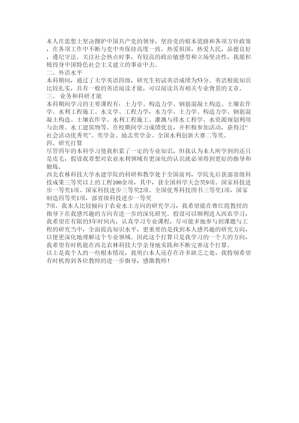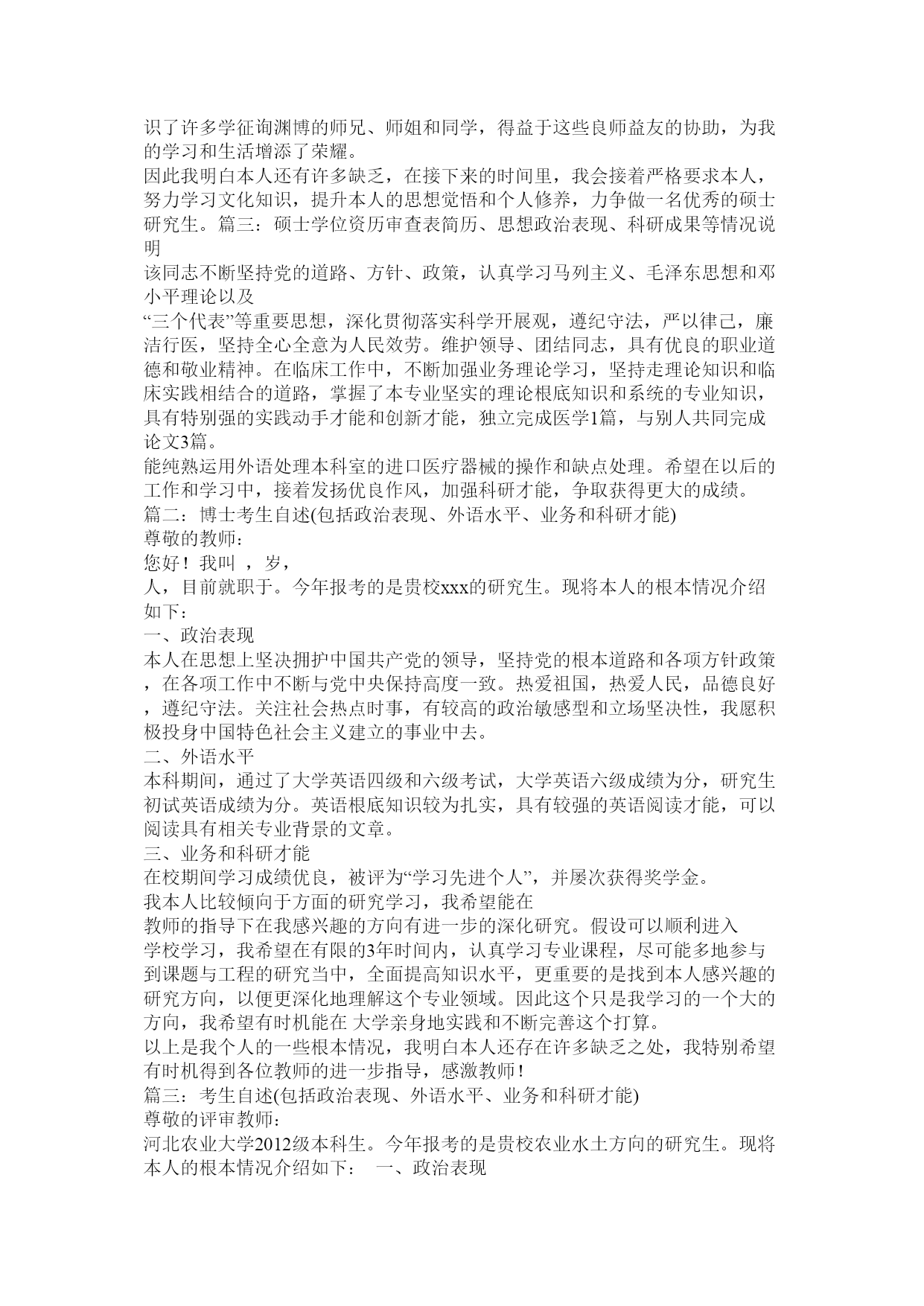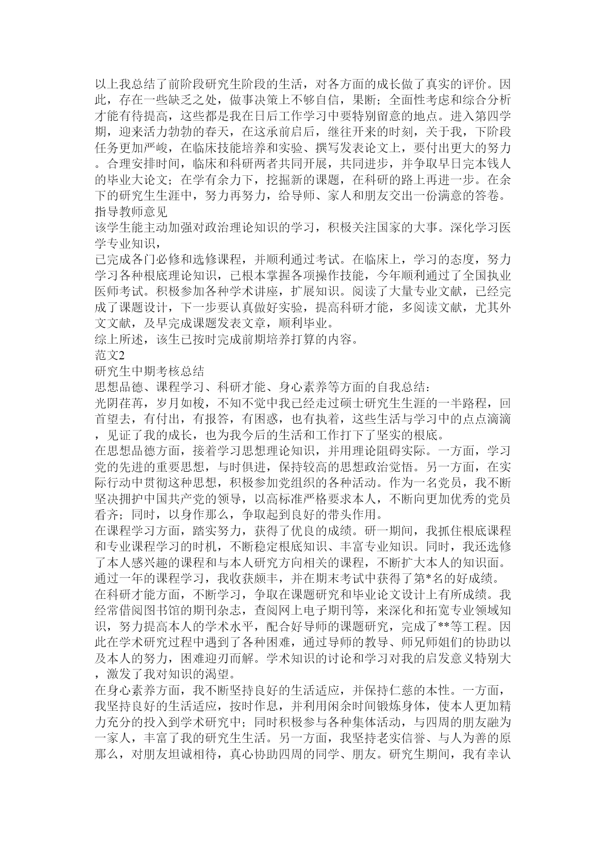 研究生思想政治表现自述篇一:研究生个人总结(包括政治思想表现,学习科研,奖惩情况)篇一:中期考核审查表广西大学在职研究生中期考核审核表学院:公共治理学院填写时间:一起交于学院,参加中期考核篇二:研究生中期考核个人的总结(两篇)范文1研究生中期考核个人总结光阴流逝,一转眼研究生的生活已通过去了一半。回首过去的一年多的时间,我觉得过的仍然比较有意义、比较充实的,有特别多收获,但同样也有失落的时候。在研二进入下半年的时候,为了使本人的工作可以顺利有序的进展下去,我想对前面的工作、生活及学习的方面进展一个小的总结,目确实实是总结经历,觉察缺乏,以利于今后接着发扬优点,补足缺点,为今后适应社会做好充分的预备,把本人的人生道路走得更稳、更好。下面我预备从以下几个方面分别对本人的这一段时间的经历进展总结。首先在思想上,进入研究生阶段,接着保持优良的传统,接着保持党的先进性。接着认真学习马列主义、毛泽东思想、邓小平理论、三个代表”重要思想和科学开展观的精神,牢记“两个务必”,紧抓“八荣八耻”的社会主义荣辱观,贯彻“两会”的精神,不断加强本人的思想政治修养。在认真学习理论知识的同时,积极关注国家的大事,积极向四周的优秀的同学学习,积极的向四周优秀的党员学习,不断以党员的标准严格要求本人,并向党支部递交了入党申请书,成为一名入党积极分子。在学习方面,深化学习医学专业知识,研一期间,完成各门必修和选修课程并顺利通过了期末。完成课程论文的过程中阅读的大量参考文献拓宽了我的专业知识面,同时培养了搜集材料及对材料进展归纳总结的才能。倾听了学术大师和临床专家们的金玉良言,收获颇丰。在第一个学期末,进入临床来,按照学校及个人开展确定了培养打算,严格按照培养打算一步步完成,按时上下班,本着爱岗敬业、学习的态度,认真完成各项任务,积极收治患者,热情效劳病人,努力学习各种根底理论知识,纯熟掌握各项操作技能,在诊治患者,病历书写,根底知识的积累上有了较大的收获,在导师丰富的临床经历和严谨的工作态度熏陶下,学会了常见病的诊疗,在外轮转期间接触了更加丰富的病种,开拓了视野,逐步纠正了临床诊治的误区,加强了与患者的沟通才能,正确处理医患关系。今年通过几个月的紧张预备,9月份参加了全国执业医师考试,并顺利通过了执业医师。尽管通过了考试,但在临床实践中觉察特别多东西要学,要深化体会,尤其是临床思维才能和应变才能有待加强。在临床工作的同时开始着手科研,撰写课题的过程中,阅读了大量的中外文献,获益颇多。尤其认真翻译了一些外文材料对我的英文阅读才能,写作才能上都有特别大协助,积极参加本科室每月举行的文献演讲。总的来说,在各种学习时机中给我的知识库增加了特别多的存储。在确定了选题后,积极预备实验,现在刚开始开始实验,关于将遇到的困难将积极向各位师兄师姐及教师请教,以保证顺利完成实验,及早撰写论文。目前临时无公开发表学术论文。现正在看文献,写综述过程中。以上我总结了前阶段研究生阶段的生活,对各方面的成长做了真实的评价。因此,存在一些缺乏之处,做事决策上不够自信,果断;全面性考虑和综合分析才能有待提高,这些都是我在日后工作学习中要特别留意的地点。进入第四学期,迎来活力勃勃的春天,在这承前启后,继往开来的时刻,关于我,下阶段任务更加严峻,在临床技能培养和实验、撰写发表论文上,要付出更大的努力。合理安排时间,临床和科研两者共同开展,共同进步,并争取早日完本钱人的毕业大论文;在学有余力下,挖掘新的课题,在科研的路上再进一步。在余下的研究生生涯中,努力再努力,给导师、家人和朋友交出一份满意的答卷。指导教师意见该学生能主动加强对政治理论知识的学习,积极关注国家的大事。深化学习医学专业知识,已完成各门必修和选修课程,并顺利通过考试。在临床上,学习的态度,努力学习各种根底理论知识,已根本掌握各项操作技能,今年顺利通过了全国执业医师考试。积极参加各种学术讲座,扩展知识。阅读了大量专业文献,已经完成了课题设计,下一步要认真做好实验,提高科研才能,多阅读文献,尤其外文文献,及早完成课题发表文章,顺利毕业。综上所述,该生已按时完成前期培养打算的内容。范文2研究生中期考核总结思想品德、课程学习、科研才能、身心素养等方面的自我总结:光阴荏苒,岁月如梭,不知不觉中我已经走过硕士研究生生涯的一半路程,回首望去,有付出,有报答,有困惑,也有执着,这些生活与学习中的点点滴滴,见证了我的成长,也为我今后的生活和工作打下了坚实的根底。在思想品德方面,接着学习思想理论知识,并用理论阻碍实际。一方面,学习党的先进的重要思想,与时俱进,保持较高的思想政治觉悟。另一方面,在实际行动中贯彻这种思想,积极参加党组织的各种活动。作为一名党员,我不断坚决拥护中国共产党的领导,以高标准严格要求本人,不断
