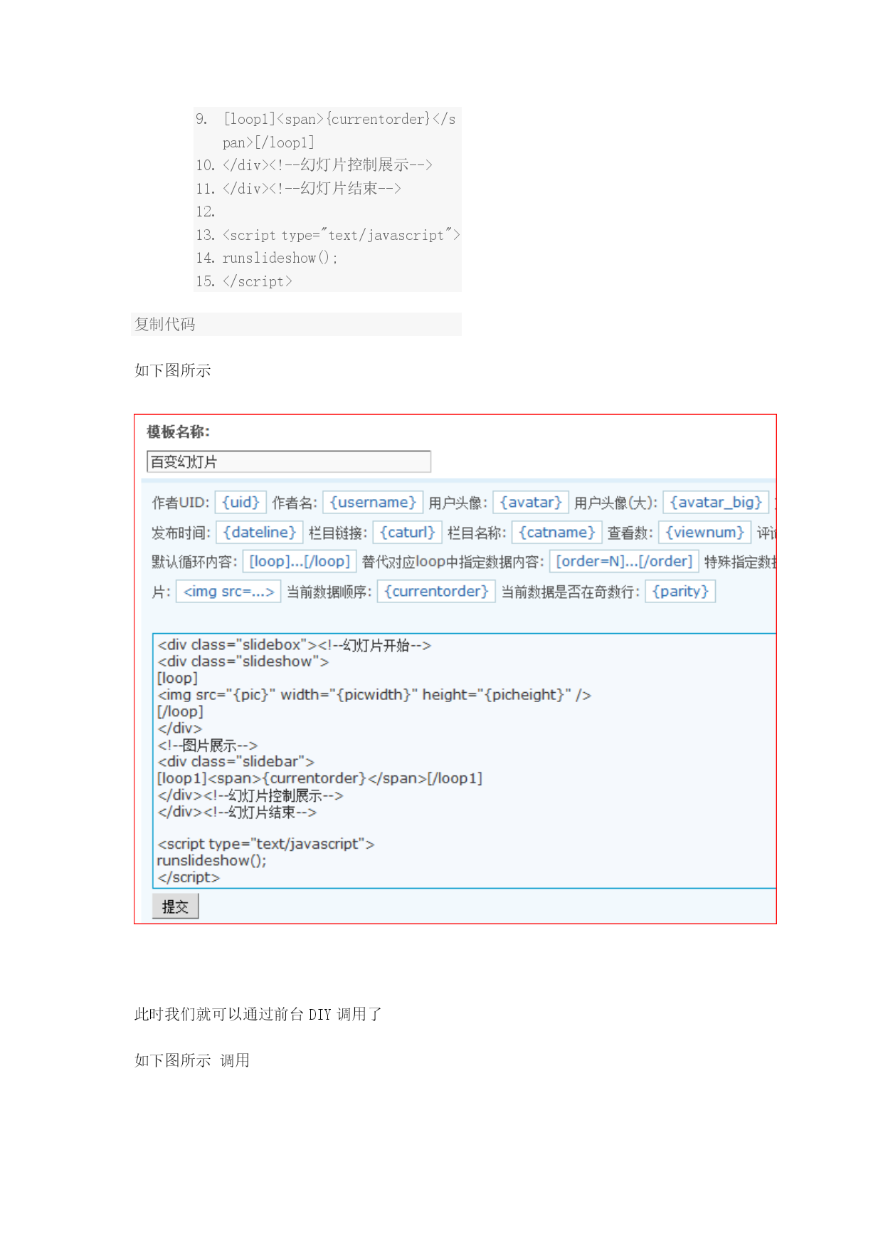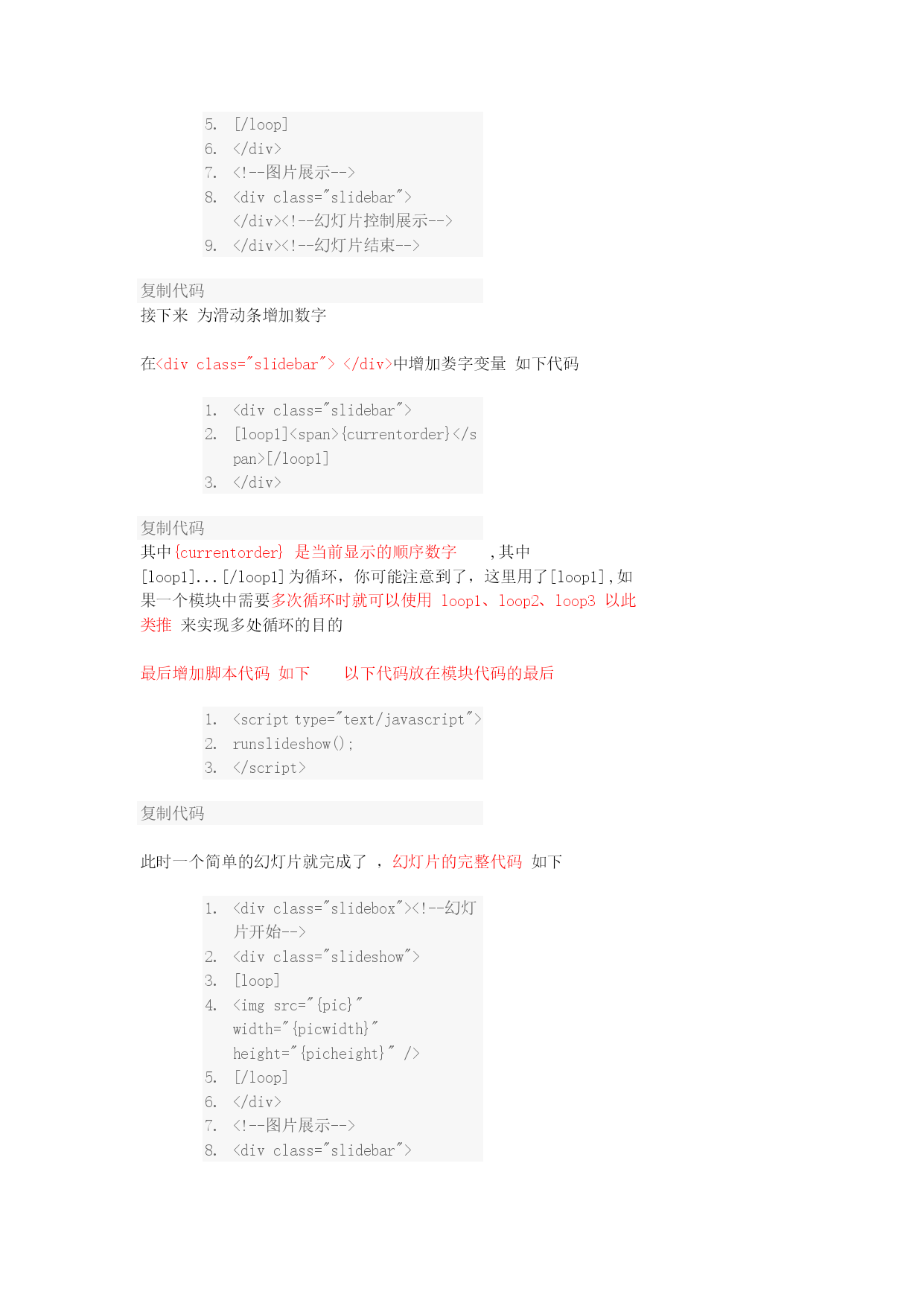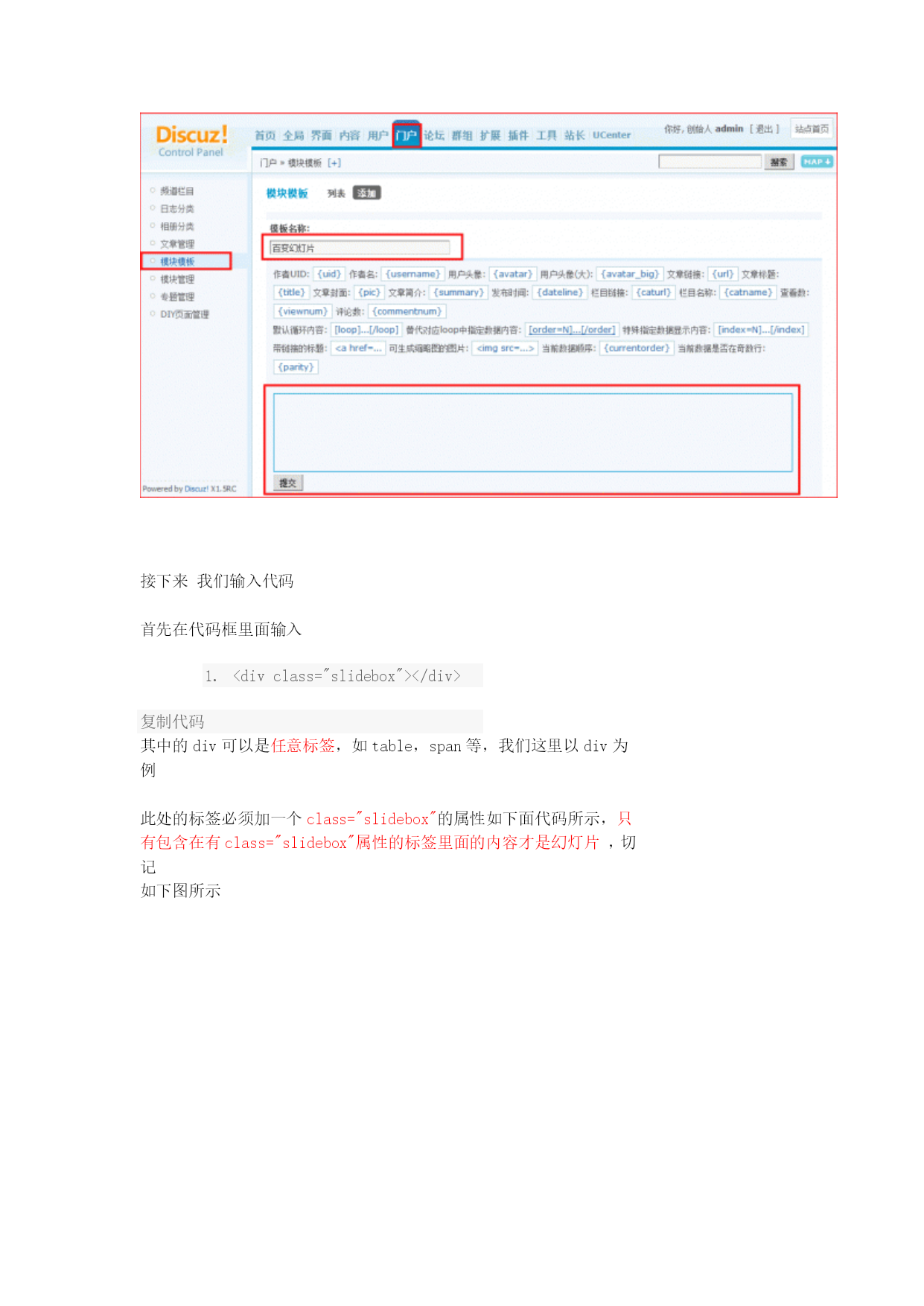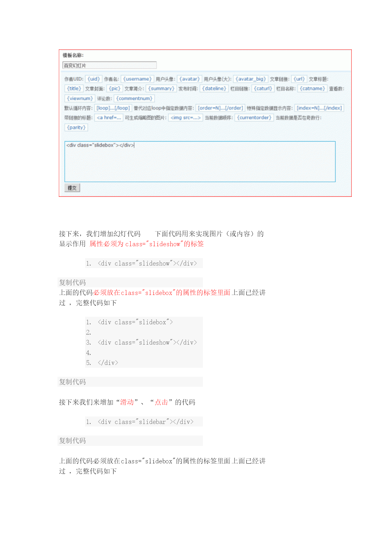 在DIY时如何调用幻灯片,幻灯片该如何制作,这一讲我们来教大家如何制作幻灯片请跟随教程从头到尾仔细阅读,你将收获不小第一步制作幻灯片:后台--》门户--》模块模板点击添加按扭如下图所示2010-9-2510:48上传HYPERLINK"http://www.discuz.net/forum.php?mod=attachment&aid=Nzk4MjIzfGQzZmM5YzUxfDEyOTk3MzY1MzV8MTU4NTg4NQ%3D%3D¬humb=yes"\o"1.gif下载次数:155"\t"_blank"下载附件(12.23KB)此处可以可以选择不同的模块分类如附件类、帖子类、文章类、图片类等等可以根据你的喜好选择不同的模块分类下面我们以文章类为例来讲解,选择文章分类点提交如下图所示,为新建的模块起个名字如“百变幻灯片”把代码框里面的内容全部删除2010-9-2510:56上传HYPERLINK"http://www.discuz.net/forum.php?mod=attachment&aid=Nzk4MjMxfDI1NjIxMTg1fDEyOTk3MzY1MzV8MTU4NTg4NQ%3D%3D¬humb=yes"\o"2.gif下载次数:74"\t"_blank"下载附件(27.19KB)接下来我们输入代码首先在代码框里面输入<divclass="slidebox"></div>复制代码其中的div可以是任意标签,如table,span等,我们这里以div为例此处的标签必须加一个class="slidebox"的属性如下面代码所示,只有包含在有class="slidebox"属性的标签里面的内容才是幻灯片,切记如下图所示2010-9-2511:07上传HYPERLINK"http://www.discuz.net/forum.php?mod=attachment&aid=Nzk4MjQ0fDRiZTYxODA3fDEyOTk3MzY1MzV8MTU4NTg4NQ%3D%3D¬humb=yes"\o"3.gif下载次数:75"\t"_blank"下载附件(13.58KB)接下来,我们增加幻灯代码下面代码用来实现图片(或内容)的显示作用属性必须为class="slideshow"的标签<divclass="slideshow"></div>复制代码上面的代码必须放在class="slidebox"的属性的标签里面上面已经讲过,完整代码如下<divclass="slidebox"><divclass="slideshow"></div></div>复制代码接下来我们来增加“滑动”、“点击”的代码<divclass="slidebar"></div>复制代码上面的代码必须放在class="slidebox"的属性的标签里面上面已经讲过,完整代码如下<divclass="slidebox"><!--幻灯片开始--><divclass="slideshow"></div><!--图片展示--><divclass="slidebar"></div><!--幻灯片控制展示--></div><!--幻灯片结束-->复制代码以上代码已完成幻灯片的框架接下来我们为幻灯片添加数据代码在<divclass="slideshow"></div>代码中间插入图片显示代码如下代码<divclass="slideshow"><imgsrc="{pic}"width="{picwidth}"height="{picheight}"/></div><!--图片展示-->复制代码其中{pic}为图片地址变量,{picwidth}为图片宽度变量,{picheight}为图片高度变量接下来为图片增加循环代码如下代码[loop]<imgsrc="{pic}"width="{picwidth}"height="{picheight}"/>[/loop]复制代码完整代码如下<divclass="slidebox"><!--幻灯片开始--><divclass="slideshow">[loop]<imgsrc="{pic}"width="{picwidth}"height="{picheight}"/>[/loop]</div><!--图片展示--><divclass="slidebar"></div><!--幻灯片控制展示--></div><!--幻灯片结束-->复制代码接下来为滑动条增加数字在<divclass="slidebar"></div>中增加娄字变量如下代码<divclass="slidebar