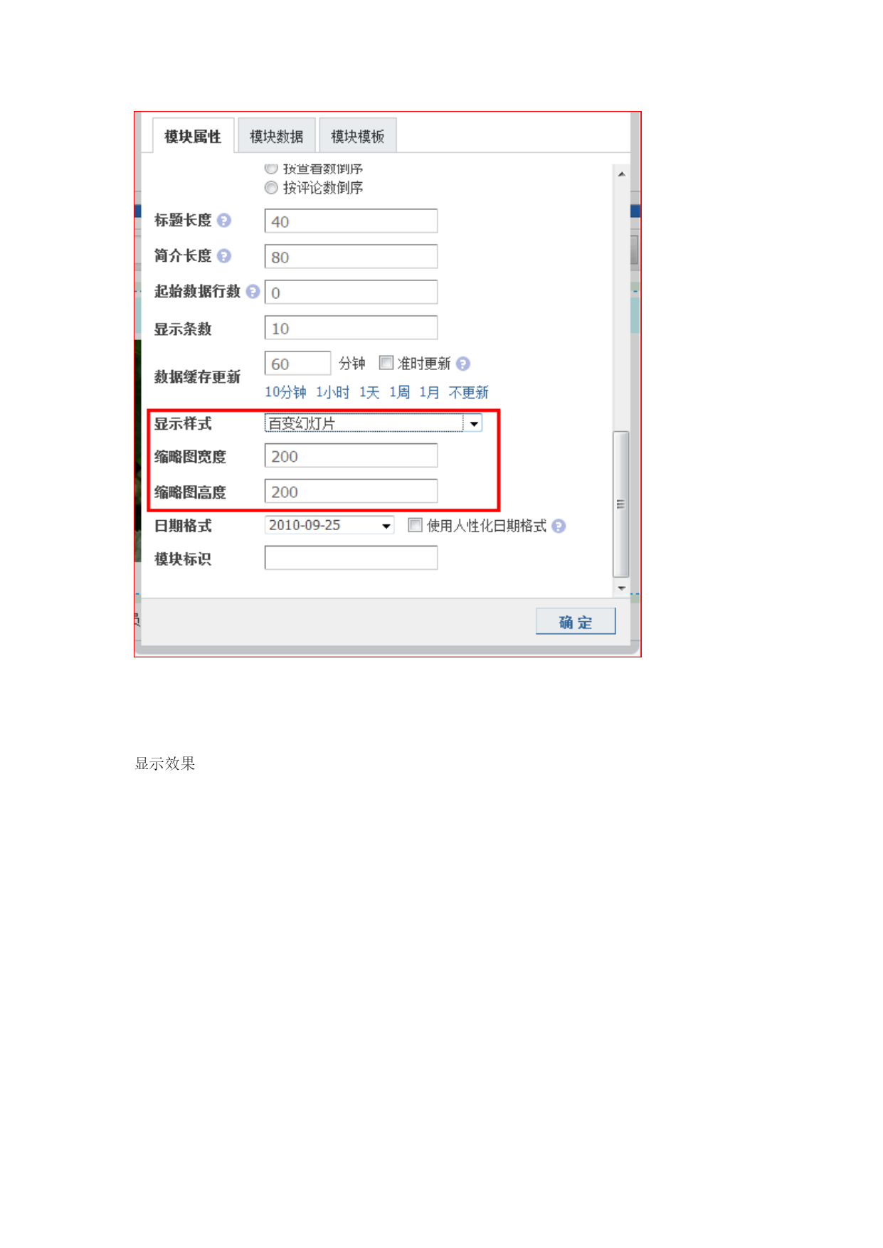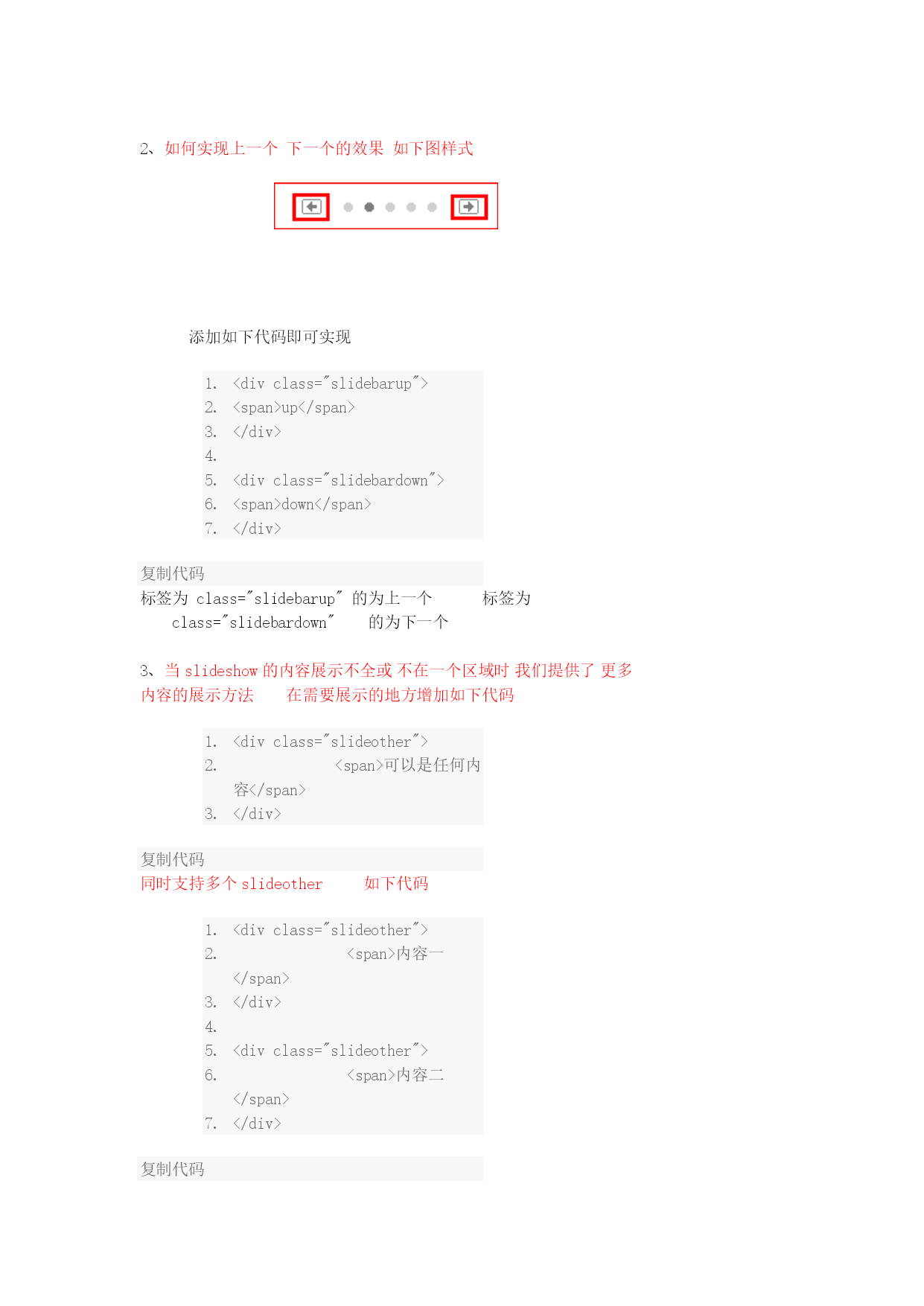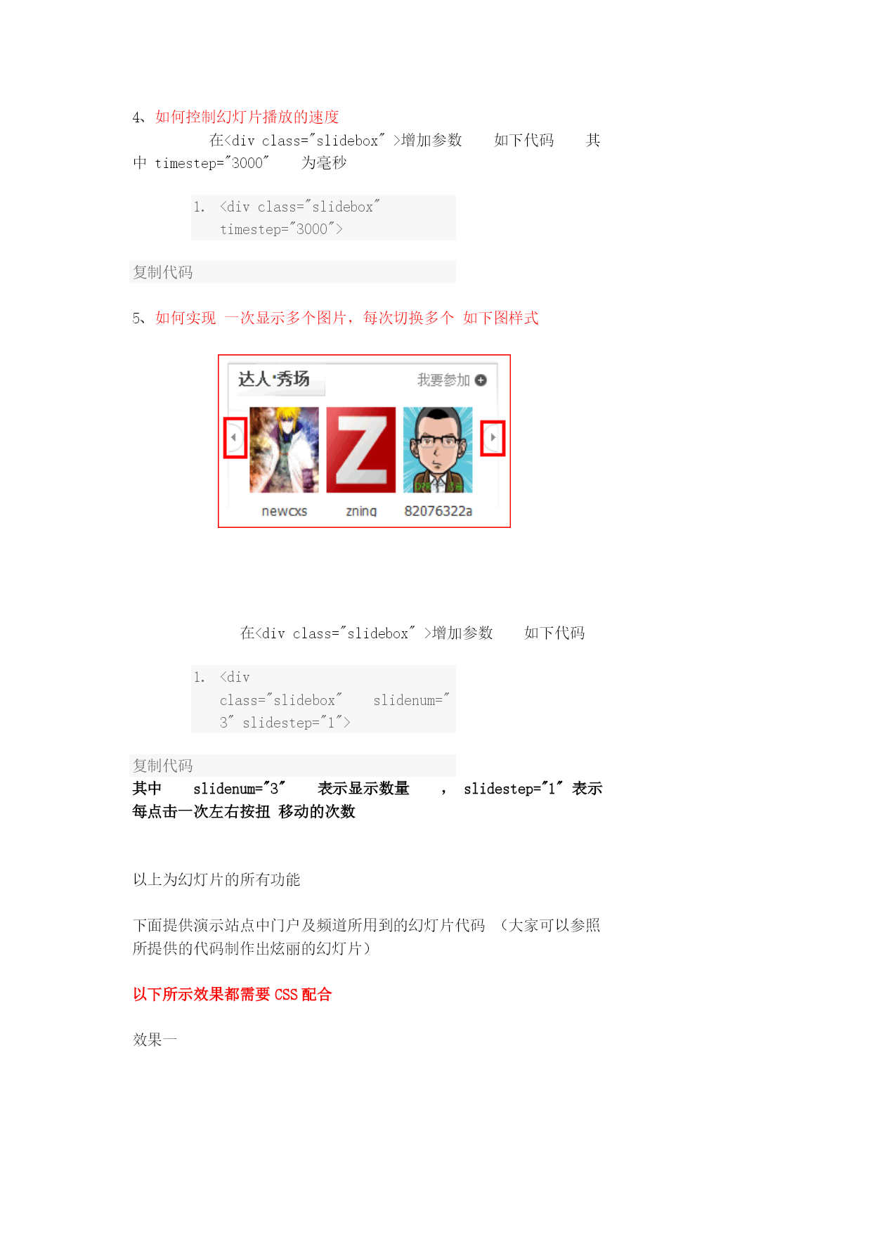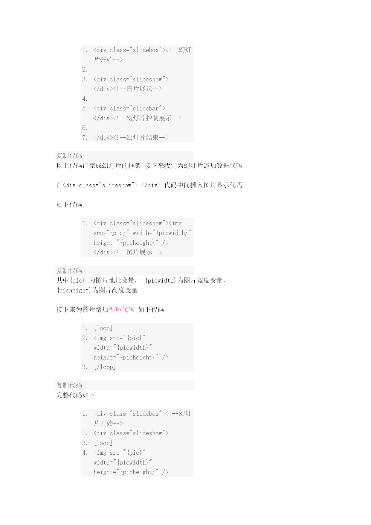 在DIY时如何调用幻灯片,幻灯片该如何制作,这一讲我们来教大家如何制作幻灯片请跟随教程从头到尾仔细阅读,你将收获不小第一步制作幻灯片:后台--》门户--》模块模板点击添加按扭如下图所示2010-9-2510:48上传HYPERLINK"http://www.discuz.net/forum.php?mod=attachment&aid=Nzk4MjIzfGQzZmM5YzUxfDEyOTk3MzY1MzV8MTU4NTg4NQ%3D%3D¬humb=yes"\o"1.gif下载次数:155"\t"_blank"下载附件(12.23KB)此处可以可以选择不同的模块分类如附件类、帖子类、文章类、图片类等等可以根据你的喜好选择不同的模块分类下面我们以文章类为例来讲解,选择文章分类点提交如下图所示,为新建的模块起个名字如“百变幻灯片”把代码框里面的内容全部删除2010-9-2510:56上传HYPERLINK"http://www.discuz.net/forum.php?mod=attachment&aid=Nzk4MjMxfDI1NjIxMTg1fDEyOTk3MzY1MzV8MTU4NTg4NQ%3D%3D¬humb=yes"\o"2.gif下载次数:74"\t"_blank"下载附件(27.19KB)接下来我们输入代码首先在代码框里面输入<divclass="slidebox"></div>复制代码其中的div可以是任意标签,如table,span等,我们这里以div为例此处的标签必须加一个class="slidebox"的属性如下面代码所示,只有包含在有class="slidebox"属性的标签里面的内容才是幻灯片,切记如下图所示2010-9-2511:07上传HYPERLINK"http://www.discuz.net/forum.php?mod=attachment&aid=Nzk4MjQ0fDRiZTYxODA3fDEyOTk3MzY1MzV8MTU4NTg4NQ%3D%3D¬humb=yes"\o"3.gif下载次数:75"\t"_blank"下载附件(13.58KB)接下来,我们增加幻灯代码下面代码用来实现图片(或内容)的显示作用属性必须为class="slideshow"的标签<divclass="slideshow"></div>复制代码上面的代码必须放在class="slidebox"的属性的标签里面上面已经讲过,完整代码如下<divclass="slidebox"><divclass="slideshow"></div></div>复制代码接下来我们来增加“滑动”、“点击”的代码<divclass="slidebar"></div>复制代码上面的代码必须放在class="slidebox"的属性的标签里面上面已经讲过,完整代码如下<divclass="slidebox"><!--幻灯片开始--><divclass="slideshow"></div><!--图片展示--><divclass="slidebar"></div><!--幻灯片控制展示--></div><!--幻灯片结束-->复制代码以上代码已完成幻灯片的框架接下来我们为幻灯片添加数据代码在<divclass="slideshow"></div>代码中间插入图片显示代码如下代码<divclass="slideshow"><imgsrc="{pic}"width="{picwidth}"height="{picheight}"/></div><!--图片展示-->复制代码其中{pic}为图片地址变量,{picwidth}为图片宽度变量,{picheight}为图片高度变量接下来为图片增加循环代码如下代码[loop]<imgsrc="{pic}"width="{picwidth}"height="{picheight}"/>[/loop]复制代码完整代码如下<divclass="slidebox"><!--幻灯片开始--><divclass="slideshow">[loop]<imgsrc="{pic}"width="{picwidth}"height="{picheight}"/>[/loop]</div><!--图片展示--><divclass="slidebar"></div><!--幻灯片控制展示--></div><!--幻灯片结束-->复制代码接下来为滑动条增加数字在<divclass="slidebar"></div>中增加娄字变量如下代码<divclass="slidebar