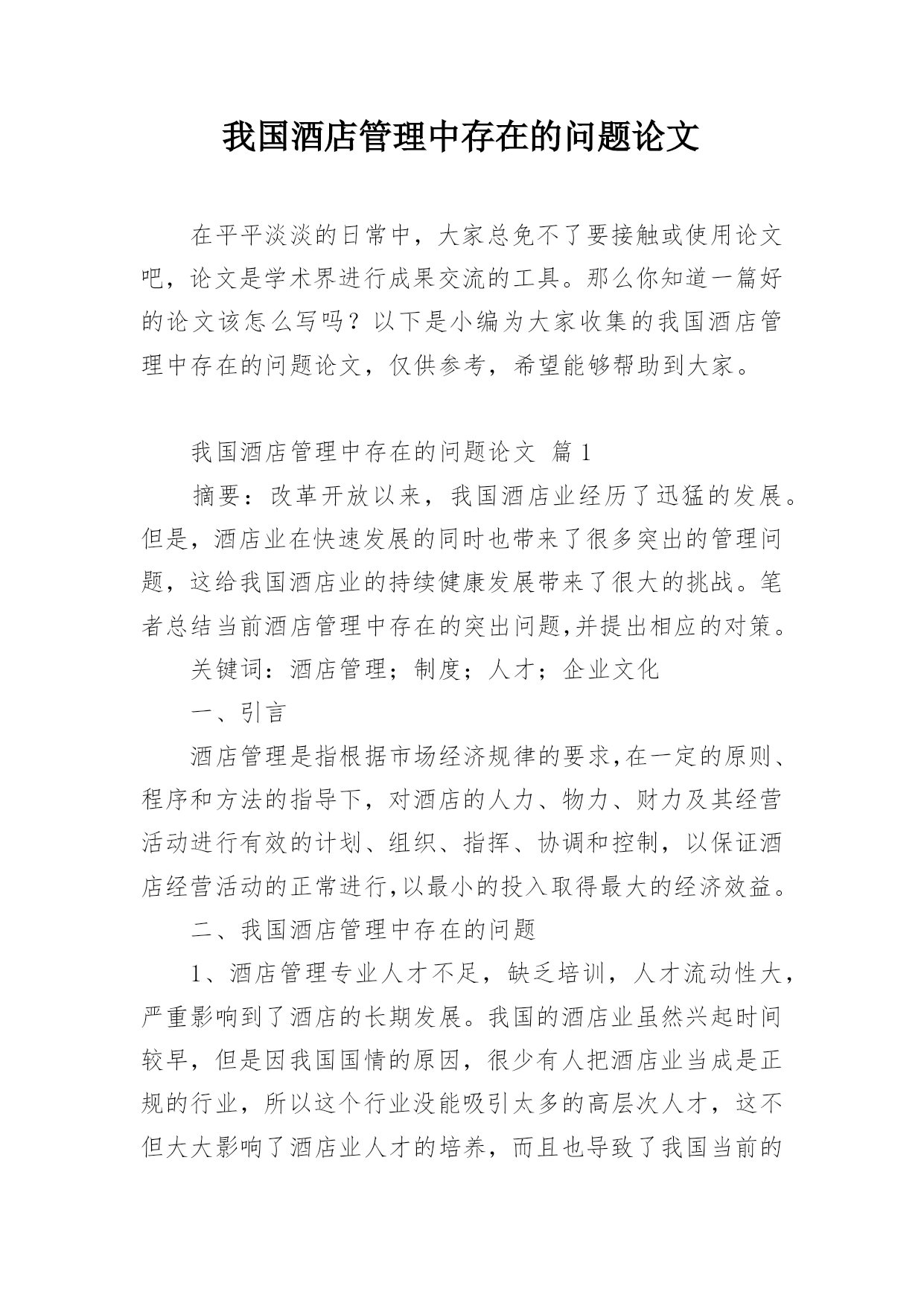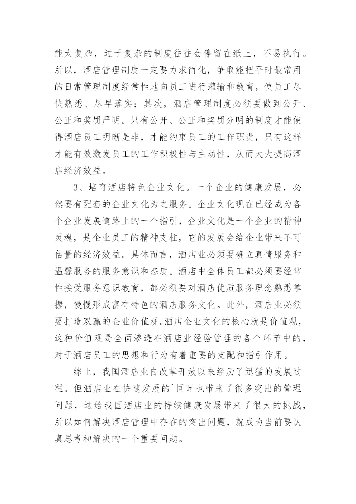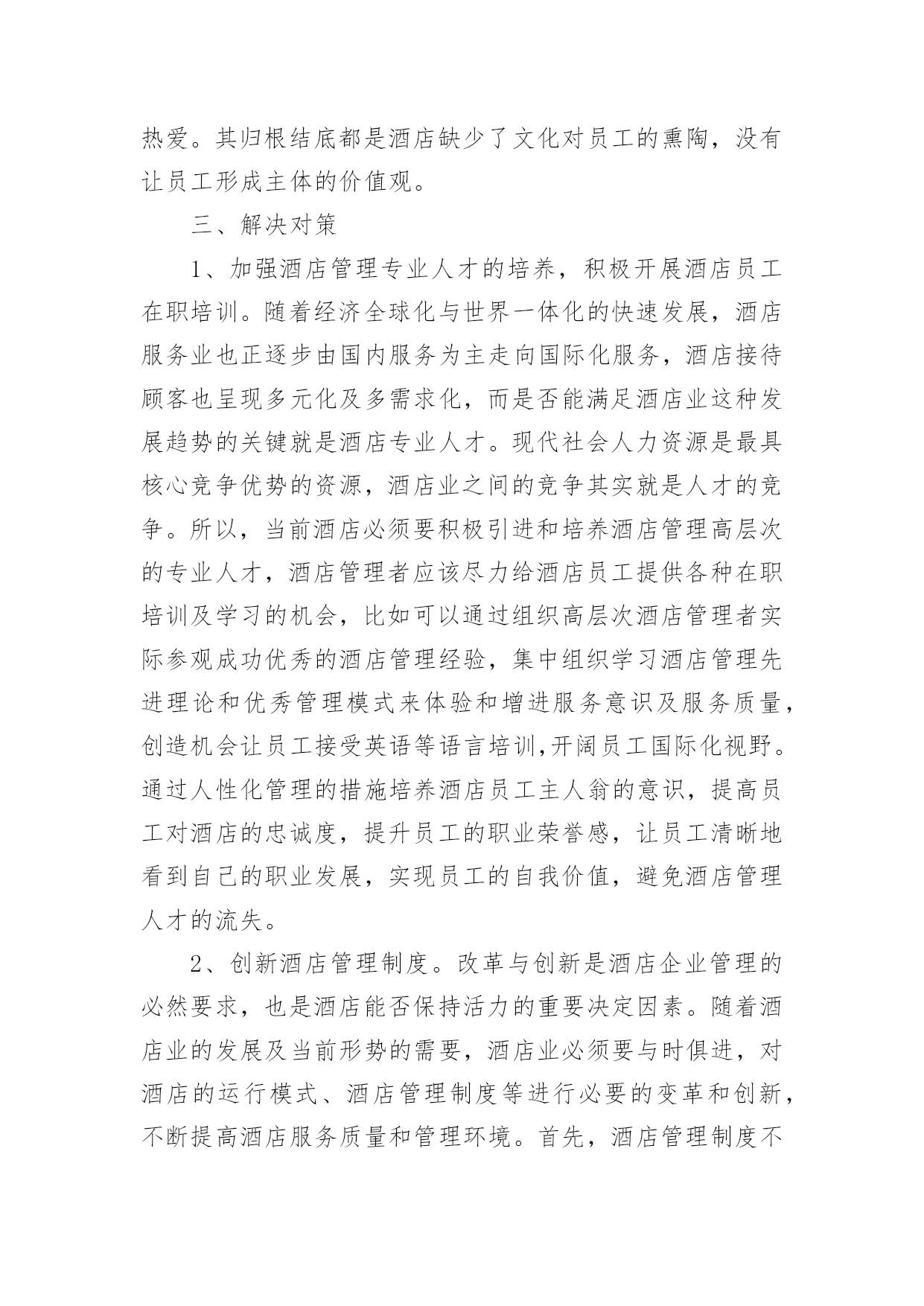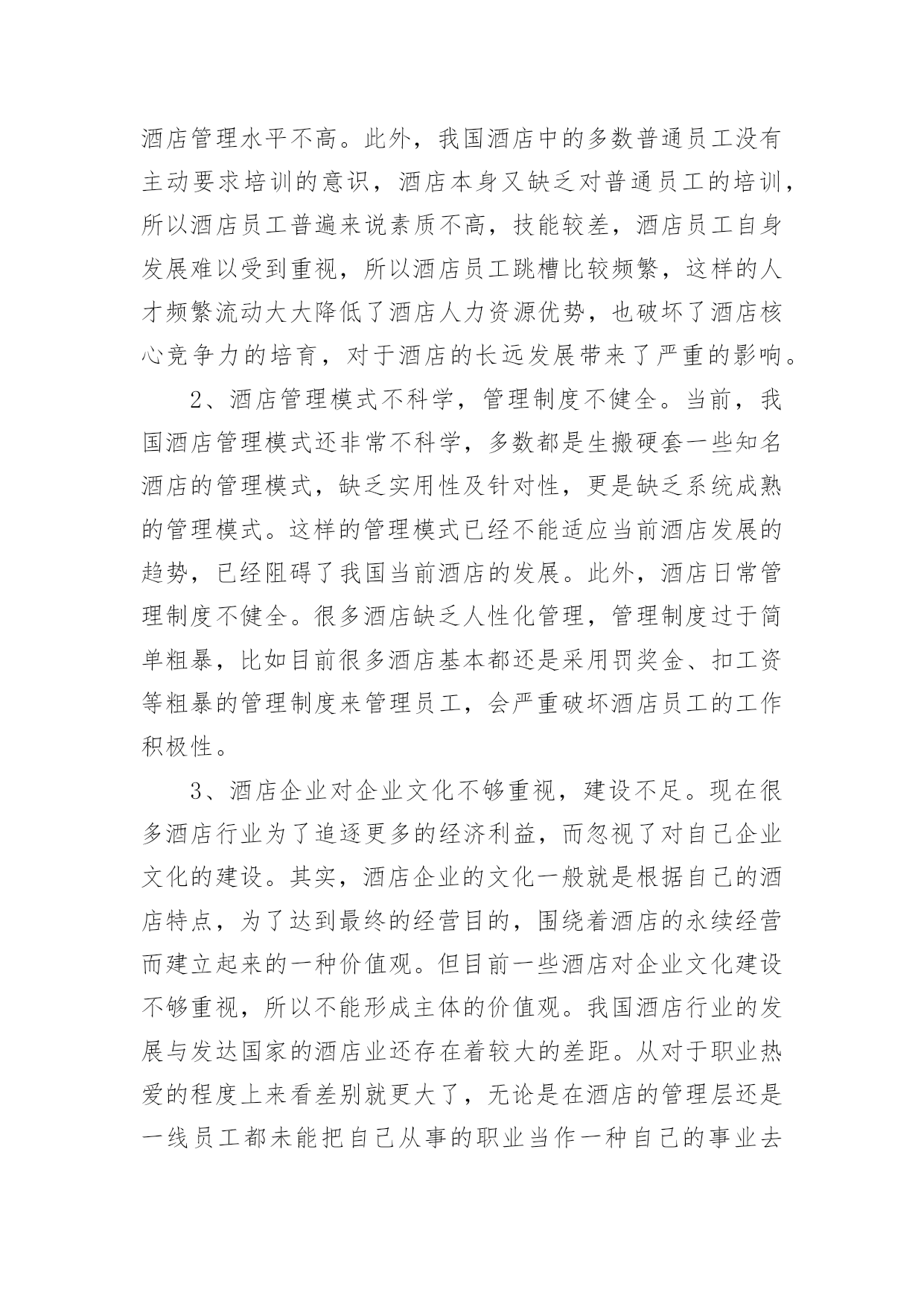 我国酒店管理中存在的问题论文在平平淡淡的日常中,大家总免不了要接触或使用论文吧,论文是学术界进行成果交流的工具。那么你知道一篇好的论文该怎么写吗?以下是小编为大家收集的我国酒店管理中存在的问题论文,仅供参考,希望能够帮助到大家。我国酒店管理中存在的问题论文篇1摘要:改革开放以来,我国酒店业经历了迅猛的发展。但是,酒店业在快速发展的同时也带来了很多突出的管理问题,这给我国酒店业的持续健康发展带来了很大的挑战。笔者总结当前酒店管理中存在的突出问题,并提出相应的对策。关键词:酒店管理;制度;人才;企业文化一、引言酒店管理是指根据市场经济规律的要求,在一定的原则、程序和方法的指导下,对酒店的人力、物力、财力及其经营活动进行有效的计划、组织、指挥、协调和控制,以保证酒店经营活动的正常进行,以最小的投入取得最大的经济效益。二、我国酒店管理中存在的问题1、酒店管理专业人才不足,缺乏培训,人才流动性大,严重影响到了酒店的长期发展。我国的酒店业虽然兴起时间较早,但是因我国国情的原因,很少有人把酒店业当成是正规的行业,所以这个行业没能吸引太多的高层次人才,这不但大大影响了酒店业人才的培养,而且也导致了我国当前的酒店管理水平不高。此外,我国酒店中的多数普通员工没有主动要求培训的意识,酒店本身又缺乏对普通员工的培训,所以酒店员工普遍来说素质不高,技能较差,酒店员工自身发展难以受到重视,所以酒店员工跳槽比较频繁,这样的人才频繁流动大大降低了酒店人力资源优势,也破坏了酒店核心竞争力的培育,对于酒店的长远发展带来了严重的影响。2、酒店管理模式不科学,管理制度不健全。当前,我国酒店管理模式还非常不科学,多数都是生搬硬套一些知名酒店的管理模式,缺乏实用性及针对性,更是缺乏系统成熟的管理模式。这样的管理模式已经不能适应当前酒店发展的趋势,已经阻碍了我国当前酒店的发展。此外,酒店日常管理制度不健全。很多酒店缺乏人性化管理,管理制度过于简单粗暴,比如目前很多酒店基本都还是采用罚奖金、扣工资等粗暴的管理制度来管理员工,会严重破坏酒店员工的工作积极性。3、酒店企业对企业文化不够重视,建设不足。现在很多酒店行业为了追逐更多的经济利益,而忽视了对自己企业文化的建设。其实,酒店企业的文化一般就是根据自己的酒店特点,为了达到最终的经营目的,围绕着酒店的永续经营而建立起来的一种价值观。但目前一些酒店对企业文化建设不够重视,所以不能形成主体的价值观。我国酒店行业的发展与发达国家的酒店业还存在着较大的差距。从对于职业热爱的程度上来看差别就更大了,无论是在酒店的管理层还是一线员工都未能把自己从事的职业当作一种自己的事业去热爱。其归根结底都是酒店缺少了文化对员工的熏陶,没有让员工形成主体的价值观。三、解决对策1、加强酒店管理专业人才的培养,积极开展酒店员工在职培训。随着经济全球化与世界一体化的快速发展,酒店服务业也正逐步由国内服务为主走向国际化服务,酒店接待顾客也呈现多元化及多需求化,而是否能满足酒店业这种发展趋势的关键就是酒店专业人才。现代社会人力资源是最具核心竞争优势的资源,酒店业之间的竞争其实就是人才的竞争。所以,当前酒店必须要积极引进和培养酒店管理高层次的专业人才,酒店管理者应该尽力给酒店员工提供各种在职培训及学习的机会,比如可以通过组织高层次酒店管理者实际参观成功优秀的酒店管理经验,集中组织学习酒店管理先进理论和优秀管理模式来体验和增进服务意识及服务质量,创造机会让员工接受英语等语言培训,开阔员工国际化视野。通过人性化管理的措施培养酒店员工主人翁的意识,提高员工对酒店的忠诚度,提升员工的职业荣誉感,让员工清晰地看到自己的职业发展,实现员工的自我价值,避免酒店管理人才的流失。2、创新酒店管理制度。改革与创新是酒店企业管理的必然要求,也是酒店能否保持活力的重要决定因素。随着酒店业的发展及当前形势的需要,酒店业必须要与时俱进,对酒店的运行模式、酒店管理制度等进行必要的变革和创新,不断提高酒店服务质量和管理环境。首先,酒店管理制度不能太复杂,过于复杂的制度往往会停留在纸上,不易执行。所以,酒店管理制度一定要力求简化,争取能把平时最常用的日常管理制度经常性地向员工进行灌输和教育,使员工尽快熟悉、尽早落实;其次,酒店管理制度必须要做到公开、公正和奖罚严明。只有公开、公正和奖罚分明的制度才能使得酒店员工明晰是非,才能约束员工的工作职责,只有这样才能有效激发员工的工作积极性与主动性,从而大大提高酒店经济效益。3、培育酒店特色企业文化。一个企业的健康发展,必然要有配套的企业文化为之服务。企业文化现在已经成为各个企业发展道路上的一个指引,企业文化是一个企业的精神灵魂,是企业员工的精神支柱,它的发展会给企业带来不可估量的经济效益。具体而言,酒店业必须要确立真情服务和温馨服务的服务意识和态度。酒店