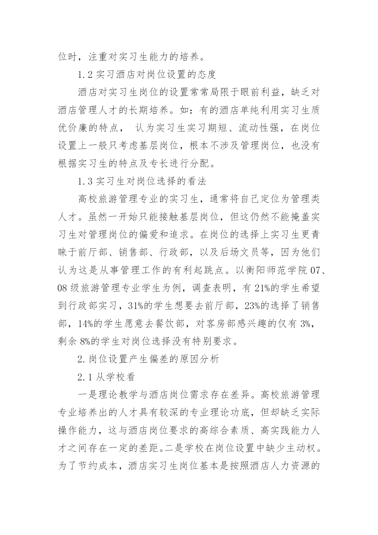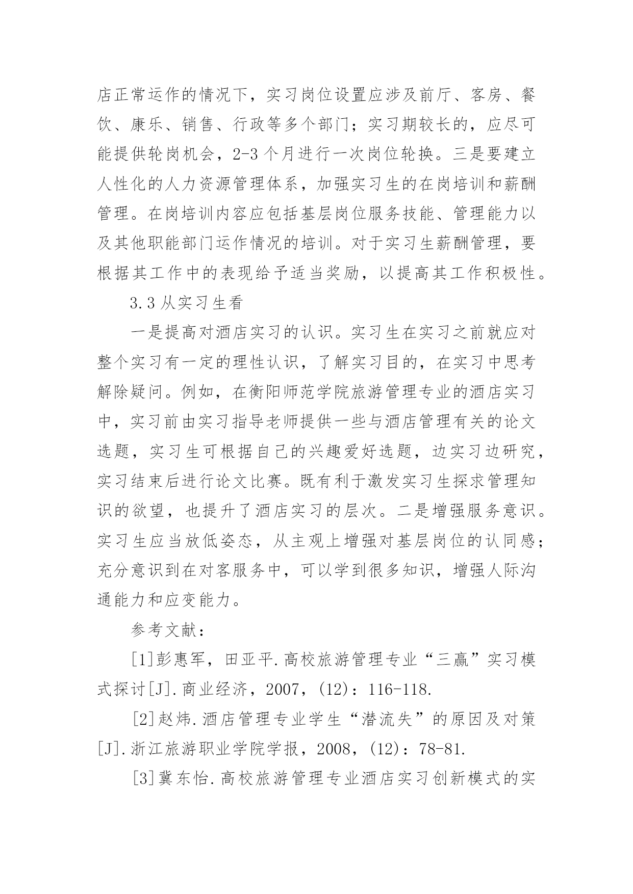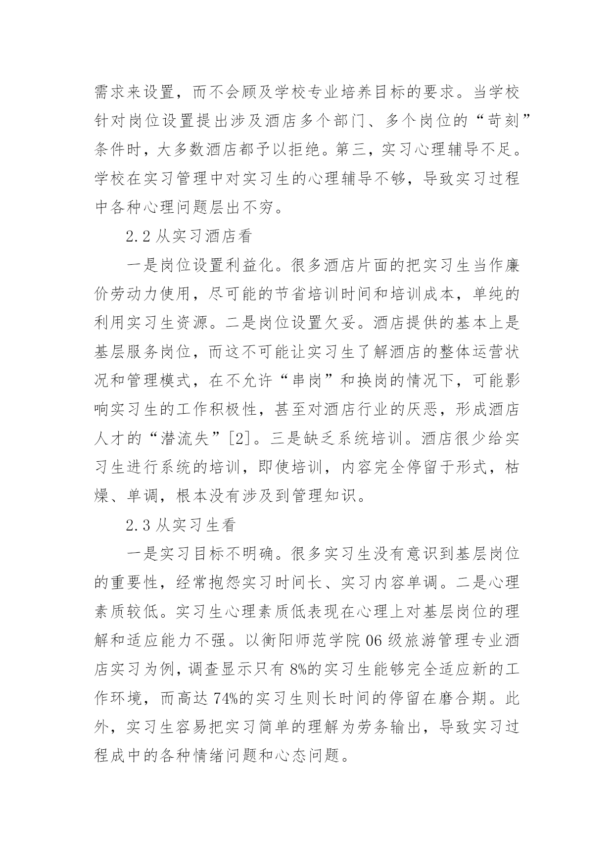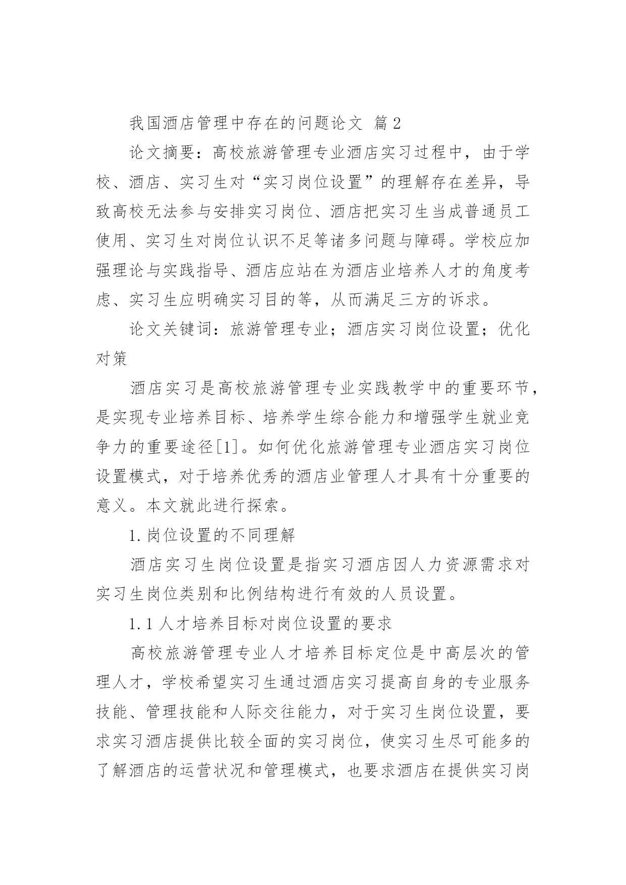 我国酒店管理中存在的问题论文在平平淡淡的日常中,大家总免不了要接触或使用论文吧,论文是学术界进行成果交流的工具。那么你知道一篇好的论文该怎么写吗?以下是小编为大家收集的我国酒店管理中存在的问题论文,仅供参考,希望能够帮助到大家。我国酒店管理中存在的问题论文篇1摘要:改革开放以来,我国酒店业经历了迅猛的发展。但是,酒店业在快速发展的同时也带来了很多突出的管理问题,这给我国酒店业的持续健康发展带来了很大的挑战。笔者总结当前酒店管理中存在的突出问题,并提出相应的对策。关键词:酒店管理;制度;人才;企业文化一、引言酒店管理是指根据市场经济规律的要求,在一定的原则、程序和方法的指导下,对酒店的人力、物力、财力及其经营活动进行有效的计划、组织、指挥、协调和控制,以保证酒店经营活动的正常进行,以最小的投入取得最大的经济效益。二、我国酒店管理中存在的问题1、酒店管理专业人才不足,缺乏培训,人才流动性大,严重影响到了酒店的长期发展。我国的酒店业虽然兴起时间较早,但是因我国国情的原因,很少有人把酒店业当成是正规的行业,所以这个行业没能吸引太多的高层次人才,这不但大大影响了酒店业人才的培养,而且也导致了我国当前的酒店管理水平不高。此外,我国酒店中的多数普通员工没有主动要求培训的意识,酒店本身又缺乏对普通员工的培训,所以酒店员工普遍来说素质不高,技能较差,酒店员工自身发展难以受到重视,所以酒店员工跳槽比较频繁,这样的人才频繁流动大大降低了酒店人力资源优势,也破坏了酒店核心竞争力的培育,对于酒店的长远发展带来了严重的影响。2、酒店管理模式不科学,管理制度不健全。当前,我国酒店管理模式还非常不科学,多数都是生搬硬套一些知名酒店的管理模式,缺乏实用性及针对性,更是缺乏系统成熟的管理模式。这样的管理模式已经不能适应当前酒店发展的趋势,已经阻碍了我国当前酒店的发展。此外,酒店日常管理制度不健全。很多酒店缺乏人性化管理,管理制度过于简单粗暴,比如目前很多酒店基本都还是采用罚奖金、扣工资等粗暴的管理制度来管理员工,会严重破坏酒店员工的工作积极性。3、酒店企业对企业文化不够重视,建设不足。现在很多酒店行业为了追逐更多的经济利益,而忽视了对自己企业文化的建设。其实,酒店企业的文化一般就是根据自己的酒店特点,为了达到最终的经营目的,围绕着酒店的永续经营而建立起来的一种价值观。但目前一些酒店对企业文化建设不够重视,所以不能形成主体的价值观。我国酒店行业的发展与发达国家的酒店业还存在着较大的差距。从对于职业热爱的程度上来看差别就更大了,无论是在酒店的管理层还是一线员工都未能把自己从事的职业当作一种自己的事业去热爱。其归根结底都是酒店缺少了文化对员工的熏陶,没有让员工形成主体的价值观。三、解决对策1、加强酒店管理专业人才的培养,积极开展酒店员工在职培训。随着经济全球化与世界一体化的快速发展,酒店服务业也正逐步由国内服务为主走向国际化服务,酒店接待顾客也呈现多元化及多需求化,而是否能满足酒店业这种发展趋势的关键就是酒店专业人才。现代社会人力资源是最具核心竞争优势的资源,酒店业之间的竞争其实就是人才的竞争。所以,当前酒店必须要积极引进和培养酒店管理高层次的专业人才,酒店管理者应该尽力给酒店员工提供各种在职培训及学习的机会,比如可以通过组织高层次酒店管理者实际参观成功优秀的酒店管理经验,集中组织学习酒店管理先进理论和优秀管理模式来体验和增进服务意识及服务质量,创造机会让员工接受英语等语言培训,开阔员工国际化视野。通过人性化管理的措施培养酒店员工主人翁的意识,提高员工对酒店的忠诚度,提升员工的职业荣誉感,让员工清晰地看到自己的职业发展,实现员工的自我价值,避免酒店管理人才的流失。2、创新酒店管理制度。改革与创新是酒店企业管理的必然要求,也是酒店能否保持活力的重要决定因素。随着酒店业的发展及当前形势的需要,酒店业必须要与时俱进,对酒店的运行模式、酒店管理制度等进行必要的变革和创新,不断提高酒店服务质量和管理环境。首先,酒店管理制度不能太复杂,过于复杂的制度往往会停留在纸上,不易执行。所以,酒店管理制度一定要力求简化,争取能把平时最常用的日常管理制度经常性地向员工进行灌输和教育,使员工尽快熟悉、尽早落实;其次,酒店管理制度必须要做到公开、公正和奖罚严明。只有公开、公正和奖罚分明的制度才能使得酒店员工明晰是非,才能约束员工的工作职责,只有这样才能有效激发员工的工作积极性与主动性,从而大大提高酒店经济效益。3、培育酒店特色企业文化。一个企业的健康发展,必然要有配套的企业文化为之服务。企业文化现在已经成为各个企业发展道路上的一个指引,企业文化是一个企业的精神灵魂,是企业员工的精神支柱,它的发展会给企业带来不可估量的经济效益。具体而言,酒店业必须要确立真情服务和温馨服务的服务意识和态度。酒店