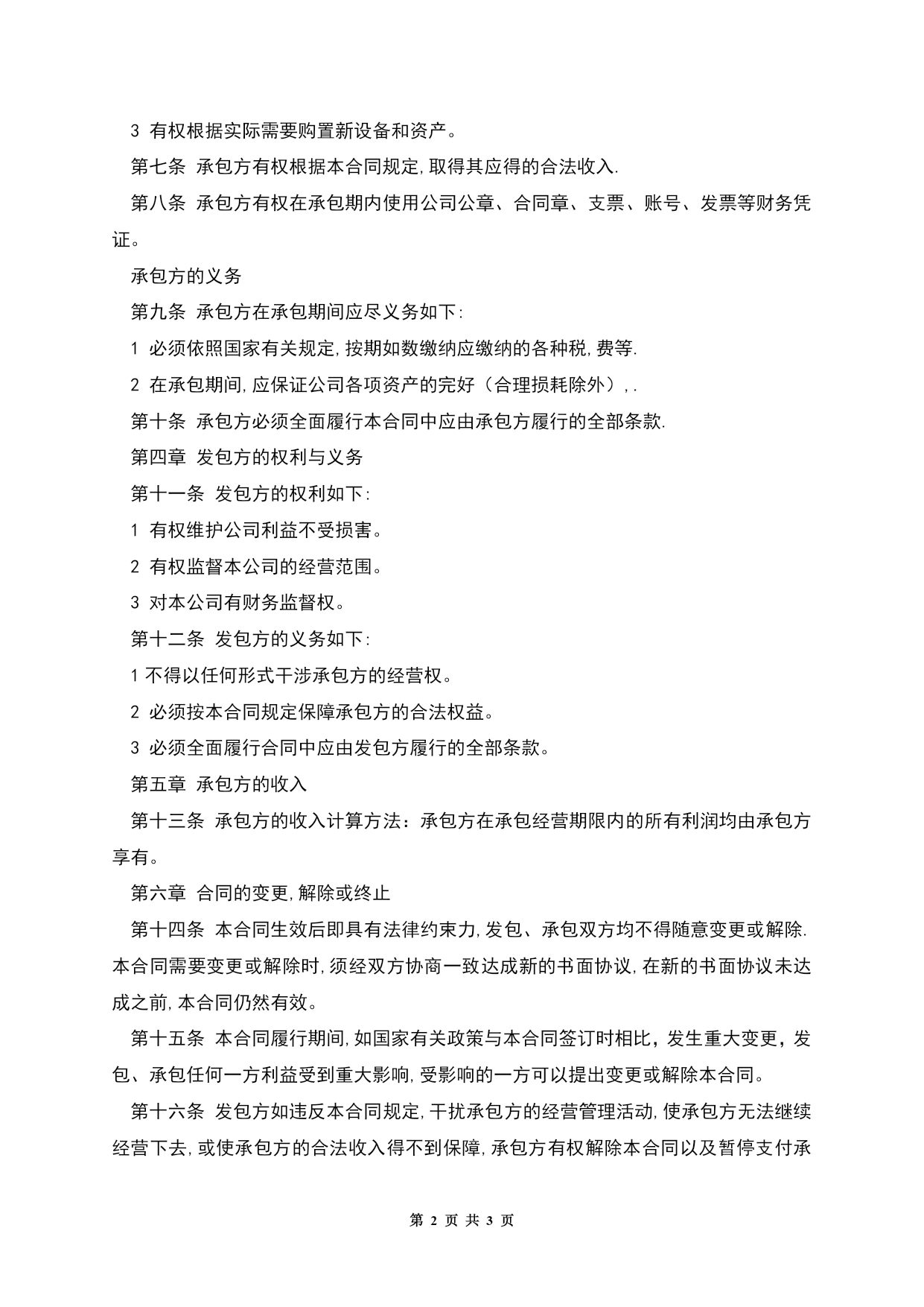 第PAGE\*MERGEFORMAT3页共NUMPAGES\*MERGEFORMAT3页公司承包经营合同公司承包经营合同订立合同双方:发包方:强林唯安*际贸易(上海)有限公司承包方:徐-文强林唯安*际贸易(上海)有限公司(发包方)与徐-文(承包方)经协商一致,且经强林唯安*际贸易(上海)有限公司股东会批准,现将公司经营权在本合同期限内发包给承包方以供经营,订立本合同。第一章总则第一条承包经营期间,公司独立核算、依法纳税,自主经营,自负盈亏.财政,税收渠道不变.第二条承包经营期间,承包方必须在本公司的法定经营范围内从事经营活动(以本公司企业法人营业执照为准)。第二章承包的期限,方式和主要指标第三条承包经营的期限为一年,即从二00三年八月七日起至二00四年八月六日止.第四条承包经营的方式为:发包方在承包经营期限内将公司经营权提供给承包方,承包方为此支付给发包方人民币二千元。该笔款项于____之前付清。第三章承包方的权利与义务承包方的权利第五条承包经营期间,承包方指派的代理人(仅限一人)作为公司的法定代表人,行使总经理的职权。第六条承包方在承包期间,对本公司享有自主、独立的的经营权。具体权利如下:1有权聘任副总经理和各部门经理,组成本公司的领导机构,并报股东会备案,承包期满或合同解除后,该领导机构即告解体.2有权决定公司的机构设置,制定规章制度,人事聘用、任免和奖惩。3有权根据实际需要购置新设备和资产。第七条承包方有权根据本合同规定,取得其应得的合法收入.第八条承包方有权在承包期内使用公司公章、合同章、支票、账号、发票等财务凭证。承包方的义务第九条承包方在承包期间应尽义务如下:1必须依照国家有关规定,按期如数缴纳应缴纳的各种税,费等.2在承包期间,应保证公司各项资产的完好(合理损耗除外),.第十条承包方必须全面履行本合同中应由承包方履行的全部条款.第四章发包方的权利与义务第十一条发包方的权利如下:1有权维护公司利益不受损害。2有权监督本公司的经营范围。3对本公司有财务监督权。第十二条发包方的义务如下:1不得以任何形式干涉承包方的经营权。2必须按本合同规定保障承包方的合法权益。3必须全面履行合同中应由发包方履行的全部条款。第五章承包方的收入第十三条承包方的收入计算方法:承包方在承包经营期限内的所有利润均由承包方享有。第六章合同的变更,解除或终止第十四条本合同生效后即具有法律约束力,发包、承包双方均不得随意变更或解除.本合同需要变更或解除时,须经双方协商一致达成新的书面协议,在新的书面协议未达成之前,本合同仍然有效。第十五条本合同履行期间,如国家有关政策与本合同签订时相比,发生重大变更,发包、承包任何一方利益受到重大影响,受影响的一方可以提出变更或解除本合同。第十六条发包方如违反本合同规定,干扰承包方的经营管理活动,使承包方无法继续经营下去,或使承包方的合法收入得不到保障,承包方有权解除本合同以及暂停支付承包费用,并要求发包方承担违约责任。第十七条由于不可抗力的原因使本合同无法完全履行或无法履行时,须发包,承包双方协商一致,可以变更或解除合同。第十八条本合同规定的承包期满,发包承包双方的权利,义务履行完毕后,本合同自行终止。第十九条本合同期满三十日以前,承包方应接受发包方派出的审计机构对其承包情况进行审核,确定无误后,双方代表在审计意见书上签字,承包方方可离职。第七章违约责任第二十条发包,承包双方应全面实际履行本合同,不履行或不完全履行的应负违约责任。第二十一条发包方如违反本合同第二十条的规定,应承担违约责任,支付承包方对公司的投资总额的50%作为违约金,如承包方的实际损失超出该违约金的,则发包方按承包方的实际损失赔偿。第八章附则第二十二条承包方如发生意外事故,无法继续履行本合同,则由承包方另行推选或指派承包经营者,经发包方认定,继续履行本合同。