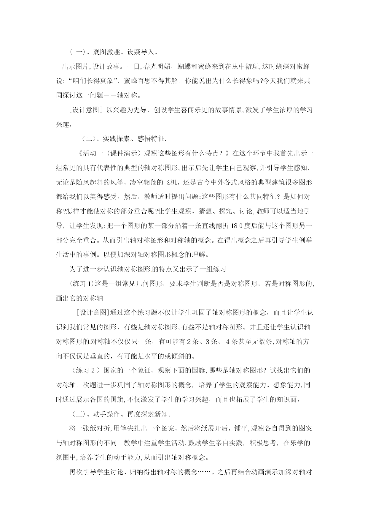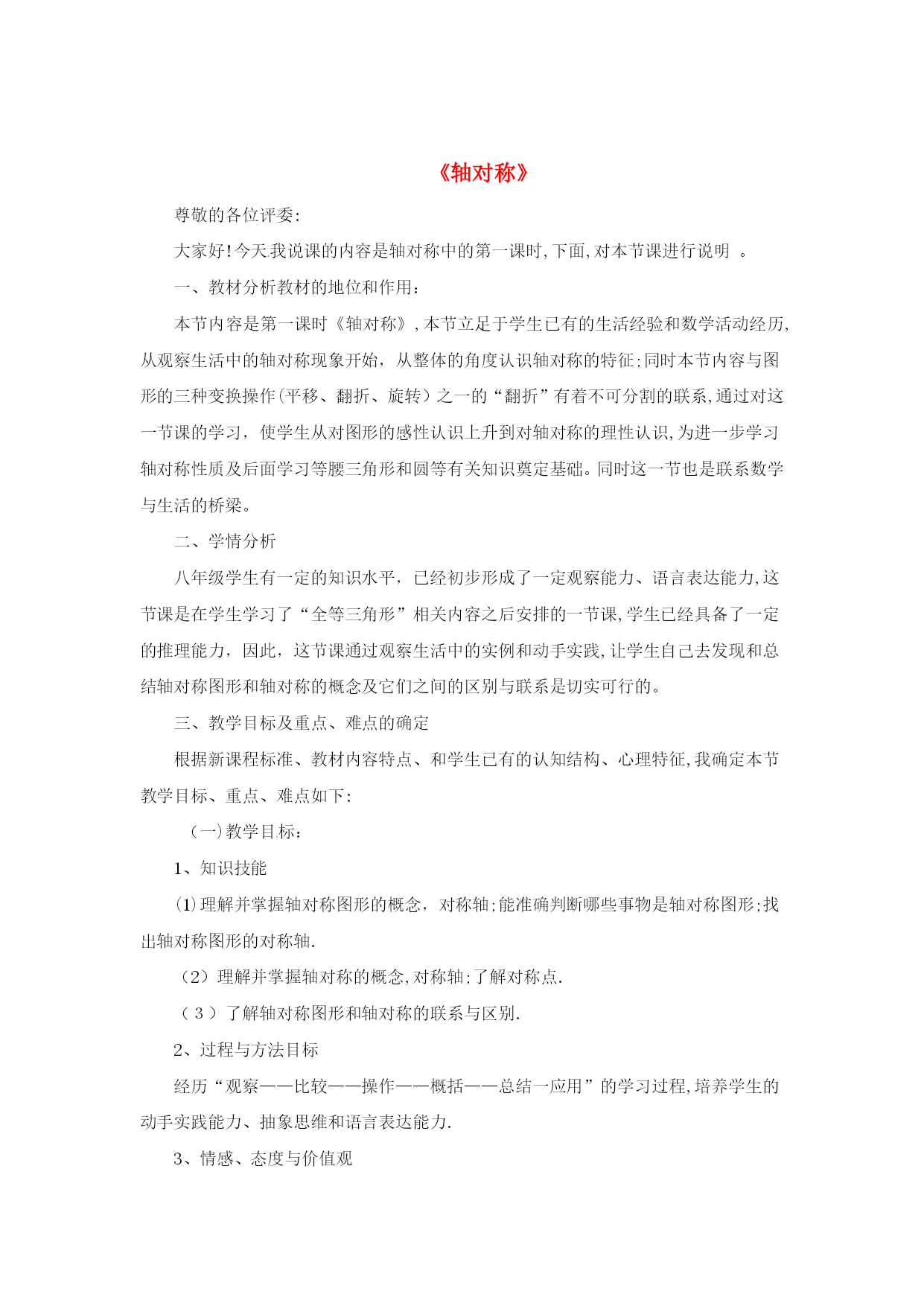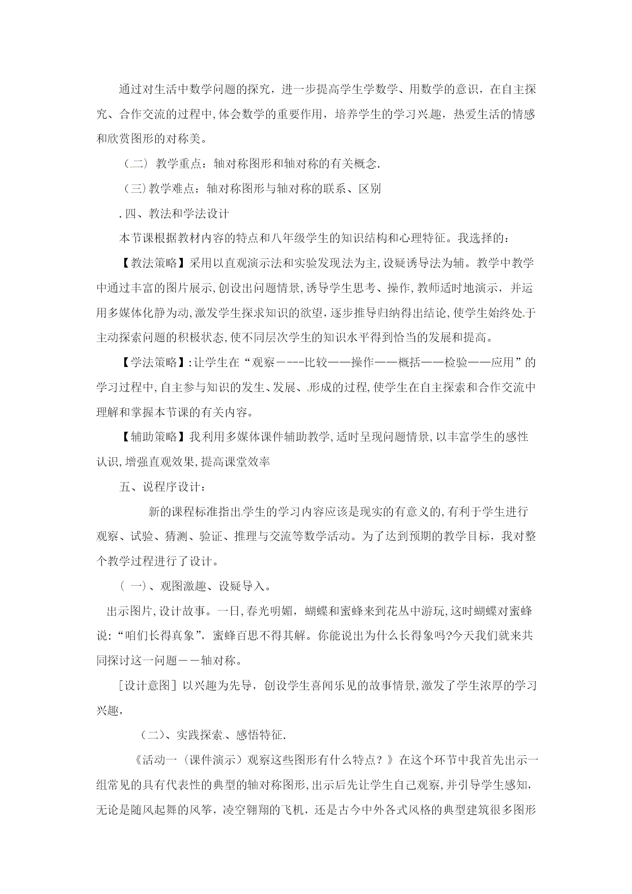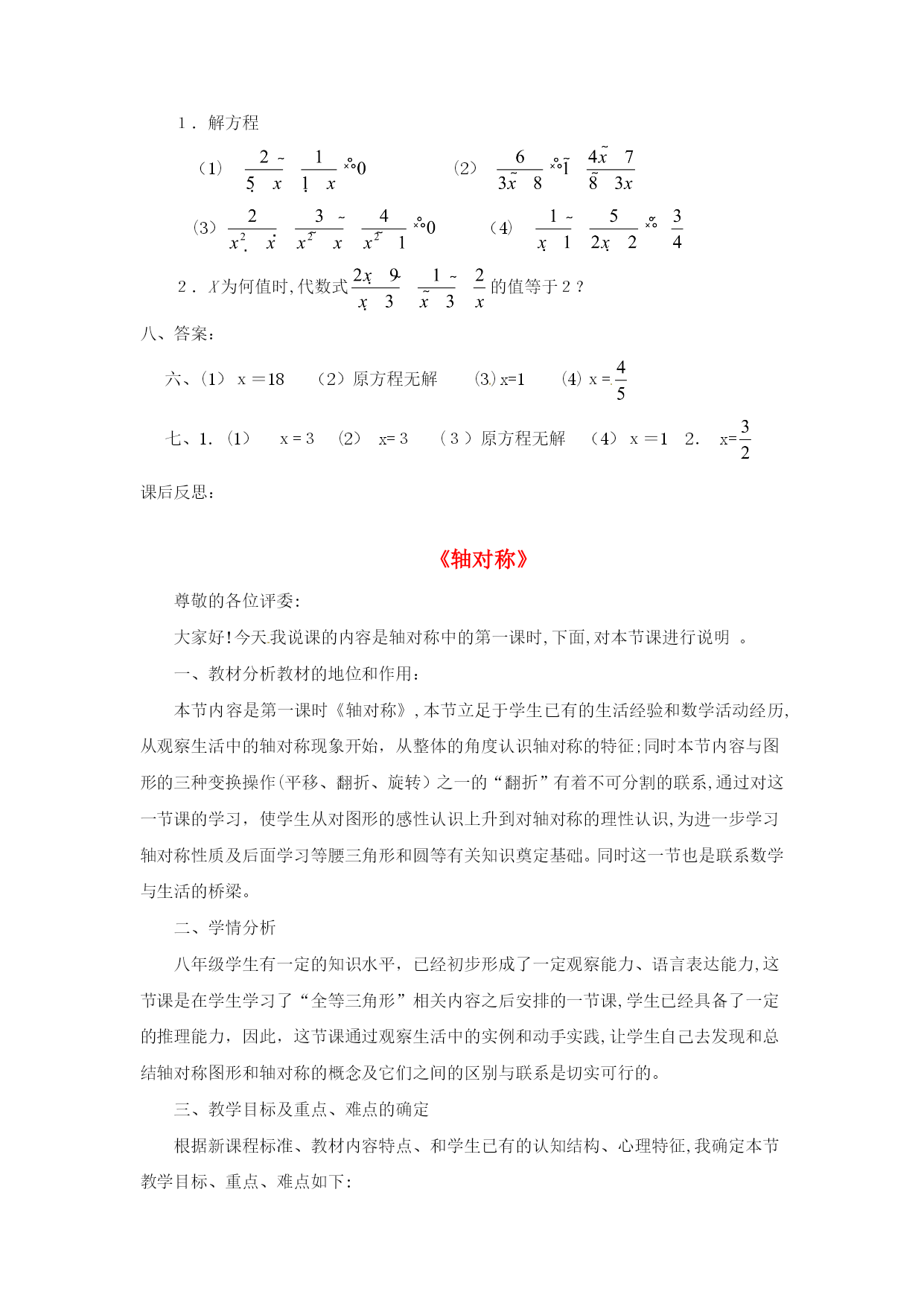 分式方程一、教学目标:1.了解分式方程的概念,和产生增根的原因.2.掌握分式方程的解法,会解可化为一元一次方程的分式方程,会检验一个数是不是原方程的增根.二、重点、难点1.重点:会解可化为一元一次方程的分式方程,会检验一个数是不是原方程的增根.2.难点:会解可化为一元一次方程的分式方程,会检验一个数是不是原方程的增根.三、、课堂引入1.回忆一元一次方程的解法,并且解方程2.提出本章引言的问题:一艘轮船在静水中的最大航速为20千米/时,它沿江以最大航速顺流航行100千米所用时间,与以最大航速逆流航行60千米所用时间相等,江水的流速为多少?分析:设江水的流速为v千米/时,根据“两次航行所用时间相同”这一等量关系,得到方程.像这样分母中含未知数的方程叫做分式方程.五、例题讲解[分析]找对最简公分母x(x-3),方程两边同乘x(x-3),把分式方程转化为整式方程,整式方程的解必须验根这道题还有解法二:利用比例的性质“内项积等于外项积”,这样做也比较简便.[分析]找对最简公分母(x-1)(x+2),方程两边同乘(x-1)(x+2)时,学生容易把整数1漏乘最简公分母(x-1)(x+2),整式方程的解必须验根.六、随堂练习解方程(1)(2)(3)(4)七、课后练习1.解方程(1)(2)(3)(4)2.X为何值时,代数式的值等于2?八、答案:六、(1)x=18(2)原方程无解(3)x=1(4)x=七、1.(1)x=3(2)x=3(3)原方程无解(4)x=12.x=课后反思:《轴对称》尊敬的各位评委:大家好!今天我说课的内容是轴对称中的第一课时,下面,对本节课进行说明。一、教材分析教材的地位和作用:本节内容是第一课时《轴对称》,本节立足于学生已有的生活经验和数学活动经历,从观察生活中的轴对称现象开始,从整体的角度认识轴对称的特征;同时本节内容与图形的三种变换操作(平移、翻折、旋转)之一的“翻折”有着不可分割的联系,通过对这一节课的学习,使学生从对图形的感性认识上升到对轴对称的理性认识,为进一步学习轴对称性质及后面学习等腰三角形和圆等有关知识奠定基础。同时这一节也是联系数学与生活的桥梁。二、学情分析八年级学生有一定的知识水平,已经初步形成了一定观察能力、语言表达能力,这节课是在学生学习了“全等三角形”相关内容之后安排的一节课,学生已经具备了一定的推理能力,因此,这节课通过观察生活中的实例和动手实践,让学生自己去发现和总结轴对称图形和轴对称的概念及它们之间的区别与联系是切实可行的。三、教学目标及重点、难点的确定根据新课程标准、教材内容特点、和学生已有的认知结构、心理特征,我确定本节教学目标、重点、难点如下:(一)教学目标:1、知识技能(1)理解并掌握轴对称图形的概念,对称轴;能准确判断哪些事物是轴对称图形;找出轴对称图形的对称轴.(2)理解并掌握轴对称的概念,对称轴;了解对称点.(3)了解轴对称图形和轴对称的联系与区别.2、过程与方法目标经历“观察——比较——操作——概括——总结一应用”的学习过程,培养学生的动手实践能力、抽象思维和语言表达能力.3、情感、态度与价值观通过对生活中数学问题的探究,进一步提高学生学数学、用数学的意识,在自主探究、合作交流的过程中,体会数学的重要作用,培养学生的学习兴趣,热爱生活的情感和欣赏图形的对称美。(二)教学重点:轴对称图形和轴对称的有关概念.(三)教学难点:轴对称图形与轴对称的联系、区别.四、教法和学法设计本节课根据教材内容的特点和八年级学生的知识结构和心理特征。我选择的:【教法策略】采用以直观演示法和实验发现法为主,设疑诱导法为辅。教学中教学中通过丰富的图片展示,创设出问题情景,诱导学生思考、操作,教师适时地演示,并运用多媒体化静为动,激发学生探求知识的欲望,逐步推导归纳得出结论,使学生始终处于主动探索问题的积极状态,使不同层次学生的知识水平得到恰当的发展和提高。【学法策略】:让学生在“观察----比较——操作——概括——检验——应用”的学习过程中,自主参与知识的发生、发展、形成的过程,使学生在自主探索和合作交流中理解和掌握本节课的有关内容。【辅助策略】我利用多媒体课件辅助教学,适时呈现问题情景,以丰富学生的感性认识,增强直观效果,提高课堂效率五、说程序设计:新的课程标准指出学生的学习内容应该是现实的有意义的,有利于学生进行观察、试验、猜测、验证、推理与交流等数学活动。为了达到预期的教学目标,我对整个教学过程进行了设计。(一)、观图激趣、设疑导入。出示图片,设计故事。一日,春光明媚,蝴蝶和蜜蜂来到花丛中游玩,这时蝴蝶对蜜蜂说:“咱们长得真象”,蜜蜂百思不得其解。你能说出为什么长得象吗?今