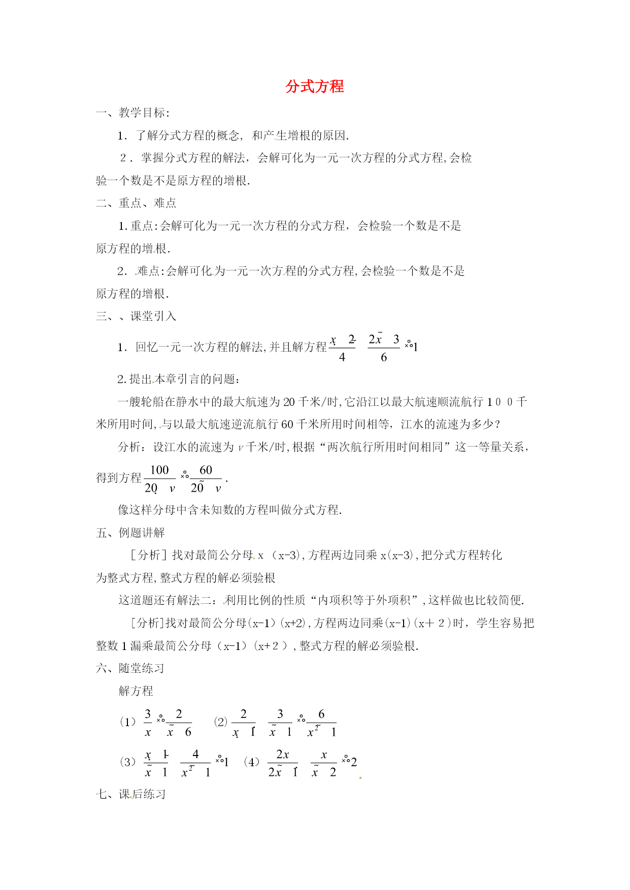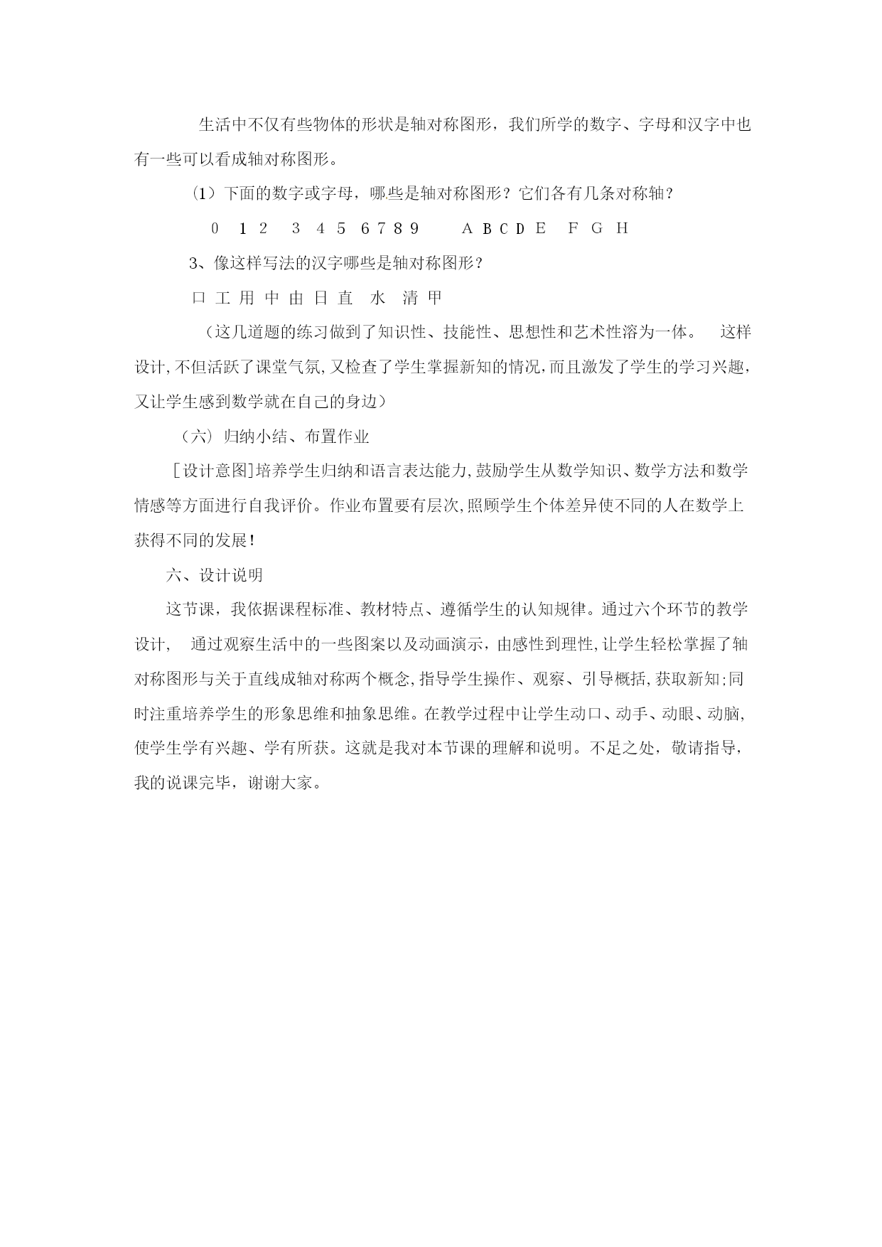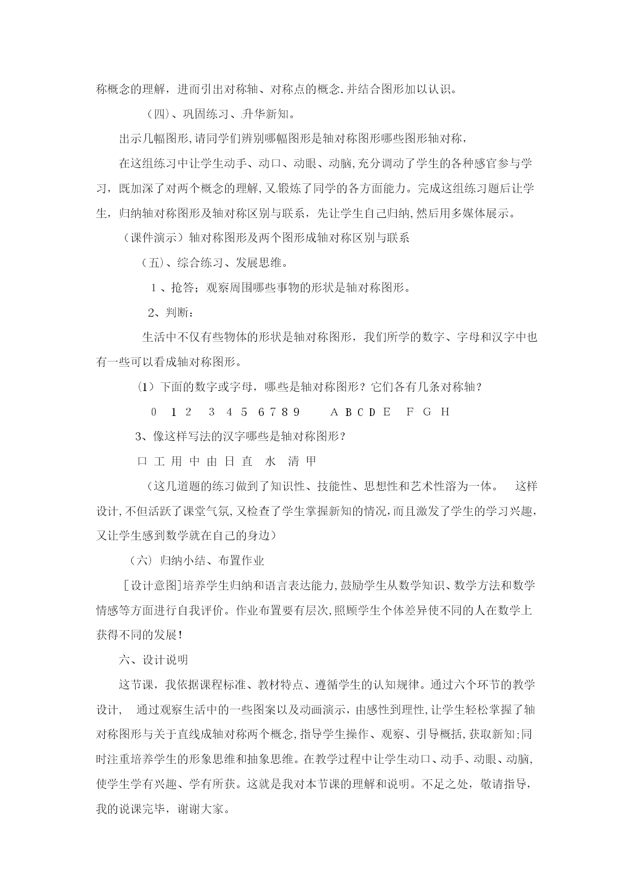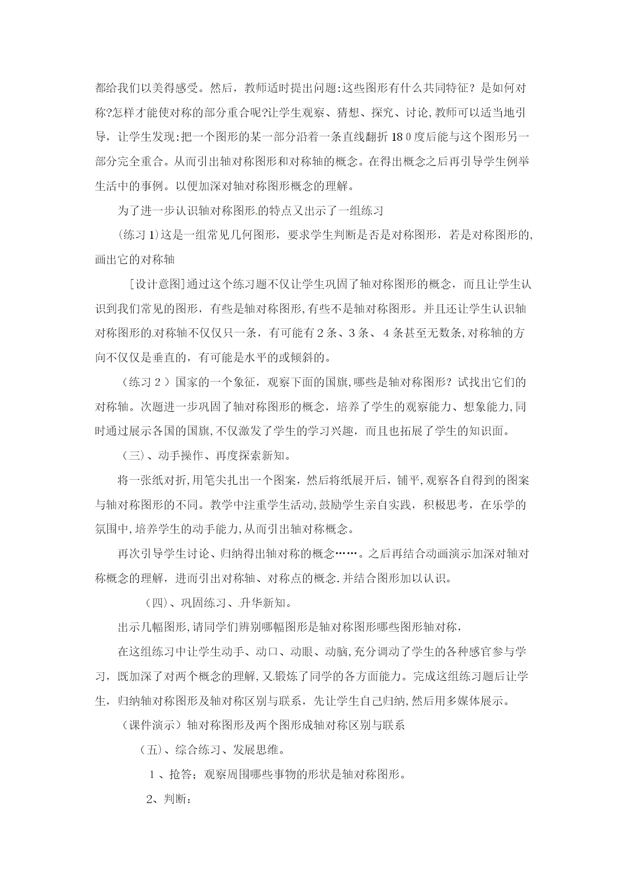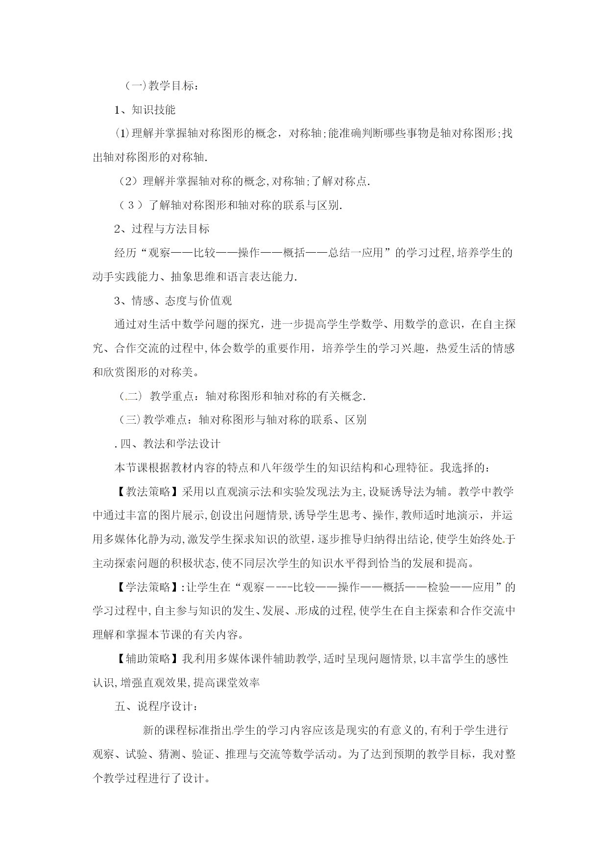分式方程一、教学目标:1.了解分式方程的概念,和产生增根的原因.2.掌握分式方程的解法,会解可化为一元一次方程的分式方程,会检验一个数是不是原方程的增根.二、重点、难点1.重点:会解可化为一元一次方程的分式方程,会检验一个数是不是原方程的增根.2.难点:会解可化为一元一次方程的分式方程,会检验一个数是不是原方程的增根.三、、课堂引入1.回忆一元一次方程的解法,并且解方程2.提出本章引言的问题:一艘轮船在静水中的最大航速为20千米/时,它沿江以最大航速顺流航行100千米所用时间,与以最大航速逆流航行60千米所用时间相等,江水的流速为多少?分析:设江水的流速为v千米/时,根据“两次航行所用时间相同”这一等量关系,得到方程.像这样分母中含未知数的方程叫做分式方程.五、例题讲解[分析]找对最简公分母x(x-3),方程两边同乘x(x-3),把分式方程转化为整式方程,整式方程的解必须验根这道题还有解法二:利用比例的性质“内项积等于外项积”,这样做也比较简便.[分析]找对最简公分母(x-1)(x+2),方程两边同乘(x-1)(x+2)时,学生容易把整数1漏乘最简公分母(x-1)(x+2),整式方程的解必须验根.六、随堂练习解方程(1)(2)(3)(4)七、课后练习1.解方程(1)(2)(3)(4)2.X为何值时,代数式的值等于2?八、答案:六、(1)x=18(2)原方程无解(3)x=1(4)x=七、1.(1)x=3(2)x=3(3)原方程无解(4)x=12.x=课后反思:《轴对称》尊敬的各位评委:大家好!今天我说课的内容是轴对称中的第一课时,下面,对本节课进行说明。一、教材分析教材的地位和作用:本节内容是第一课时《轴对称》,本节立足于学生已有的生活经验和数学活动经历,从观察生活中的轴对称现象开始,从整体的角度认识轴对称的特征;同时本节内容与图形的三种变换操作(平移、翻折、旋转)之一的“翻折”有着不可分割的联系,通过对这一节课的学习,使学生从对图形的感性认识上升到对轴对称的理性认识,为进一步学习轴对称性质及后面学习等腰三角形和圆等有关知识奠定基础。同时这一节也是联系数学与生活的桥梁。二、学情分析八年级学生有一定的知识水平,已经初步形成了一定观察能力、语言表达能力,这节课是在学生学习了“全等三角形”相关内容之后安排的一节课,学生已经具备了一定的推理能力,因此,这节课通过观察生活中的实例和动手实践,让学生自己去发现和总结轴对称图形和轴对称的概念及它们之间的区别与联系是切实可行的。三、教学目标及重点、难点的确定根据新课程标准、教材内容特点、和学生已有的认知结构、心理特征,我确定本节教学目标、重点、难点如下:(一)教学目标:1、知识技能(1)理解并掌握轴对称图形的概念,对称轴;能准确判断哪些事物是轴对称图形;找出轴对称图形的对称轴.(2)理解并掌握轴对称的概念,对称轴;了解对称点.(3)了解轴对称图形和轴对称的联系与区别.2、过程与方法目标经历“观察——比较——操作——概括——总结一应用”的学习过程,培养学生的动手实践能力、抽象思维和语言表达能力.3、情感、态度与价值观通过对生活中数学问题的探究,进一步提高学生学数学、用数学的意识,在自主探究、合作交流的过程中,体会数学的重要作用,培养学生的学习兴趣,热爱生活的情感和欣赏图形的对称美。(二)教学重点:轴对称图形和轴对称的有关概念.(三)教学难点:轴对称图形与轴对称的联系、区别.四、教法和学法设计本节课根据教材内容的特点和八年级学生的知识结构和心理特征。我选择的:【教法策略】采用以直观演示法和实验发现法为主,设疑诱导法为辅。教学中教学中通过丰富的图片展示,创设出问题情景,诱导学生思考、操作,教师适时地演示,并运用多媒体化静为动,激发学生探求知识的欲望,逐步推导归纳得出结论,使学生始终处于主动探索问题的积极状态,使不同层次学生的知识水平得到恰当的发展和提高。【学法策略】:让学生在“观察----比较——操作——概括——检验——应用”的学习过程中,自主参与知识的发生、发展、形成的过程,使学生在自主探索和合作交流中理解和掌握本节课的有关内容。【辅助策略】我利用多媒体课件辅助教学,适时呈现问题情景,以丰富学生的感性认识,增强直观效果,提高课堂效率五、说程序设计:新的课程标准指出学生的学习内容应该是现实的有意义的,有利于学生进行观察、试验、猜测、验证、推理与交流等数学活动。为了达到预期的教学目标,我对整个教学过程进行了设计。(一)、观图激趣、设疑导入。出示图片,设计故事。一日,春光明媚,蝴蝶和蜜蜂来到花丛中游玩,这时蝴蝶对蜜蜂说:“咱们长得真象”,蜜蜂百思不得其解。你能说出为什么长得象吗?今