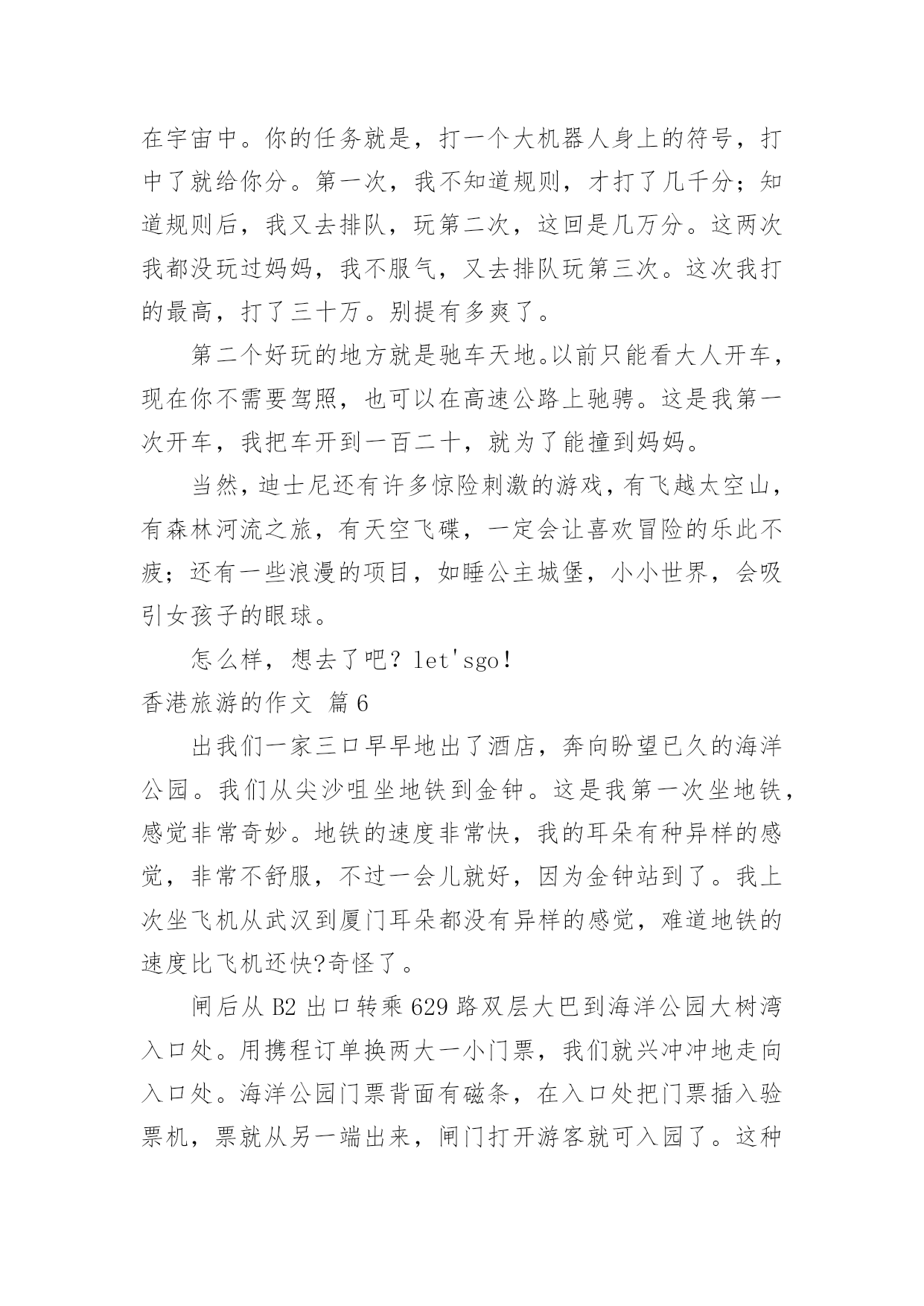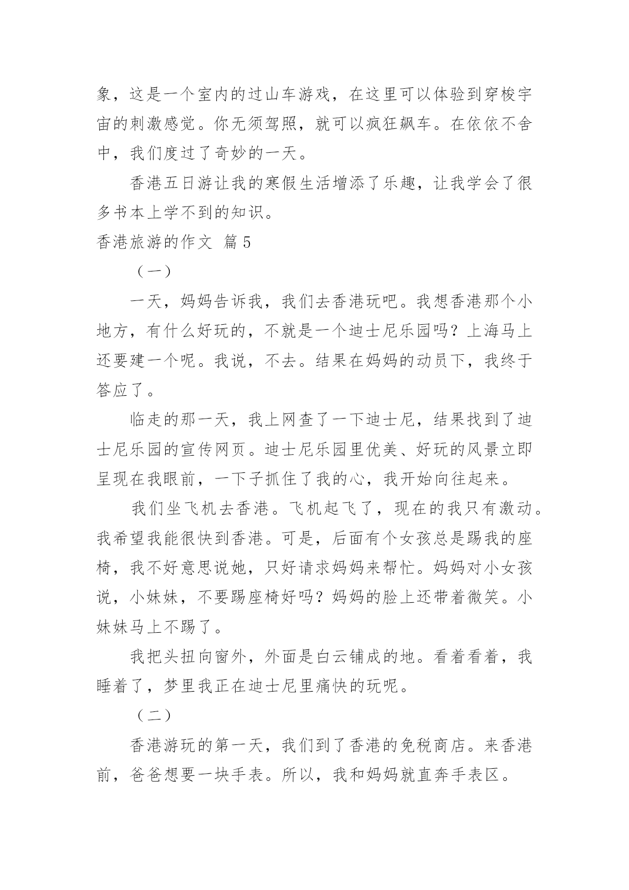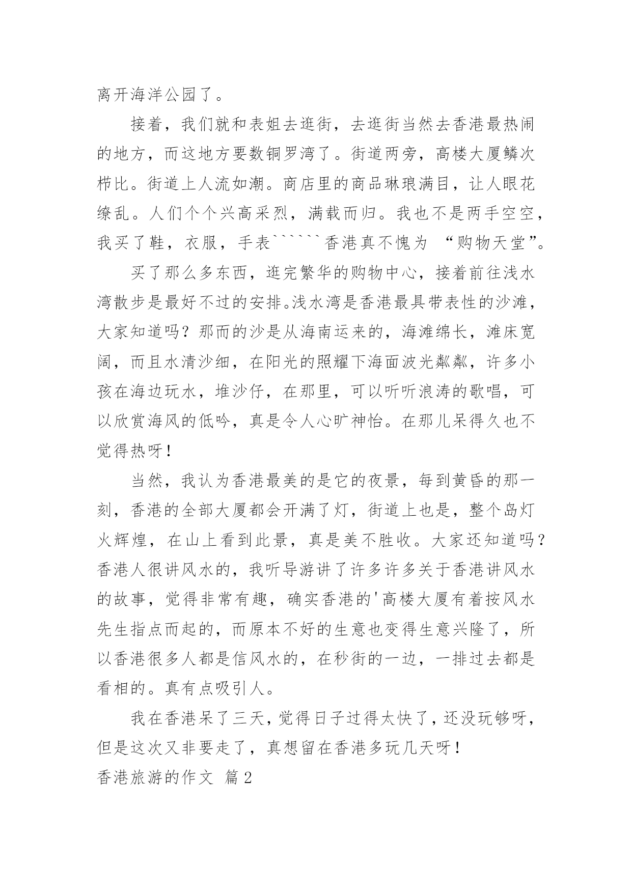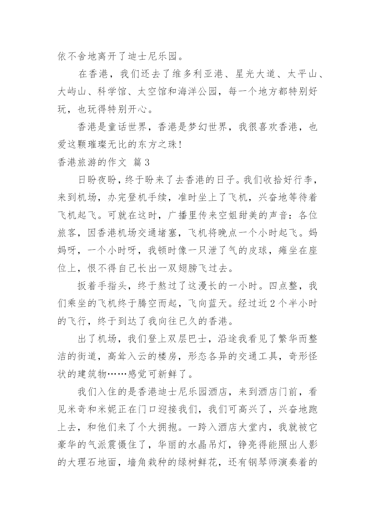 香港旅游的作文香港旅游的作文8篇在学习、工作、生活中,大家对作文都不陌生吧,通过作文可以把我们那些零零散散的思想,聚集在一块。相信写作文是一个让许多人都头痛的问题,以下是小编为大家收集的香港旅游的作文9篇,欢迎阅读与收藏。香港旅游的作文篇17月28日早上5点,我的闹钟就把我叫醒了,我真不想起来,可是我非起不可呀,这是我第一次去香港,我渴望去那很久了,听说香港呀,富丽堂皇,人杰地灵,资讯快速,物流迅速,高新科技飞速发展````````真是说也说不完。首先,我们先去了香港出名的海洋公园,山上以海洋馆、海洋剧场、海涛馆、机动游戏为主。山下则有水上乐园、花园剧场、金鱼馆及仿照历代文物所建的集古村,仿中国宫廷建筑,村内有亭台楼阁、庙宇街景,反映中国历史风貌,使中国古代街景重现,并有民间艺术表演。我再那玩得可开心拉,那些机动游戏真够刺激,玩过山车,跳楼机的时候弄得你惊心动魄,但玩玩后又使人回味无穷。玩玩之后就是看表演了,那是我最喜欢得动物-------海豚表演,我当然不能错过拉,看表演前有一些歌手搞搞场面气氛才开始海豚表演,你瞧,小海豚正在水里随着音乐和工作人员指挥的节奏舞动呢!那动作可滑鳍了,精彩的海豚表演吸引了游客的目光,令人流连忘返。最后,又看了海底世界,鲨鱼馆,就依依不舍的离开海洋公园了。接着,我们就和表姐去逛街,去逛街当然去香港最热闹的地方,而这地方要数铜罗湾了。街道两旁,高楼大厦鳞次栉比。街道上人流如潮。商店里的商品琳琅满目,让人眼花缭乱。人们个个兴高采烈,满载而归。我也不是两手空空,我买了鞋,衣服,手表``````香港真不愧为“购物天堂”。买了那么多东西,逛完繁华的购物中心,接着前往浅水湾散步是最好不过的安排。浅水湾是香港最具带表性的沙滩,大家知道吗?那而的沙是从海南运来的,海滩绵长,滩床宽阔,而且水清沙细,在阳光的照耀下海面波光粼粼,许多小孩在海边玩水,堆沙仔,在那里,可以听听浪涛的歌唱,可以欣赏海风的低吟,真是令人心旷神怡。在那儿呆得久也不觉得热呀!当然,我认为香港最美的是它的夜景,每到黄昏的那一刻,香港的全部大厦都会开满了灯,街道上也是,整个岛灯火辉煌,在山上看到此景,真是美不胜收。大家还知道吗?香港人很讲风水的,我听导游讲了许多许多关于香港讲风水的故事,觉得非常有趣,确实香港的'高楼大厦有着按风水先生指点而起的,而原本不好的生意也变得生意兴隆了,所以香港很多人都是信风水的,在秒街的一边,一排过去都是看相的。真有点吸引人。我在香港呆了三天,觉得日子过得太快了,还没玩够呀,但是这次又非要走了,真想留在香港多玩几天呀!香港旅游的作文篇2暑假,爸爸妈妈带我去香港玩。我们来到香港,香港的马路一干二净,没有人不讲卫生的。香港的马路虽然很窄,汽车却驶得飞快,也很少见到大塞车。我们去了好多地方,让我印象最深的就是到迪士尼乐园玩啦。我们一大早就来到迪士尼乐园。迪士尼是小朋友们的天堂,是小朋友最喜欢去的地方,所以快开学了,这里还是人山人海,热闹非凡。让我最喜欢的游乐项目是小小世界和明日世界。我们坐上小舟,悠悠荡荡地前往小小世界,小小世界是一个小小的'童话世界,汇聚了世界各地的卡通形象。瞧,几个“解放军叔叔”正向我们挥手呢!继续往前,有许多衣着鲜艳美丽的“小姑娘”在跳民族舞蹈,再往前,就看到各个国家的特色建筑:有埃非尔铁塔、香港的中银大厦……在这些著名的建筑之间,有时候会冒出几只“小动物”,惹得我们哈哈大笑。到明日世界就更好玩了。我和爸爸妈妈到巴斯光年玩打枪游戏,我们坐上“未来战车”,每人拿起一把“未来战枪”,我瞄准目标打,立刻得了100分,“战车”不断向前进,我继续对着目标打,当我打中一个左摇右晃的“怪兽”时,一下子加了1万分,我高兴得欢呼雀跃!游戏结束时,我得了836000分,排第一名,妈妈的得分是51100,排第二,爸爸得了21400分,排第三。我兴奋得一蹦三尺高。后来,我们还去了探险世界、迷离庄园等各种好玩的地方。到了晚上,我们在城堡外看烟花表演,五光十色的烟花,照亮整个迪士尼,感觉特别梦幻。烟花表演结束,我们便依依不舍地离开了迪士尼乐园。在香港,我们还去了维多利亚港、星光大道、太平山、大屿山、科学馆、太空馆和海洋公园,每一个地方都特别好玩,也玩得特别开心。香港是童话世界,香港是梦幻世界,我很喜欢香港,也爱这颗璀璨无比的东方之珠!香港旅游的作文篇3日盼夜盼,终于盼来了去香港的日子。我们收拾好行李,来到机场,办完登机手续,准时坐上了飞机,兴奋地等待着飞机起飞。可就在这时,广播里传来空姐甜美的声音:各位旅客,因香港机场交通堵塞,飞机将晚点一个小时起飞。妈妈呀,一个小时呀,我顿时像一只泄了气的皮球,瘫坐在座位上,恨不得自己长出一双翅膀飞过去。扳着手指头,终于熬过了这漫长的一小时。四点整,我们乘坐的飞机终于腾空而起,飞向蓝天。经过近2