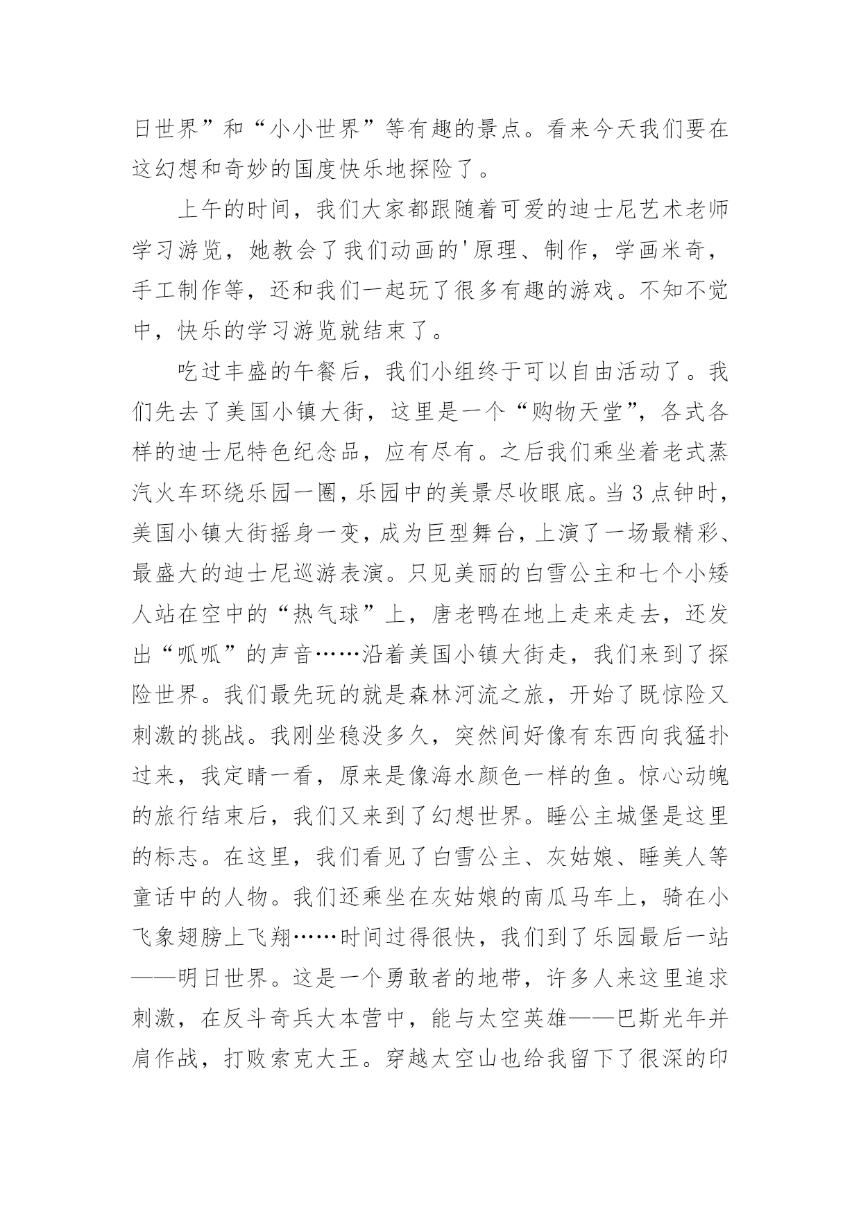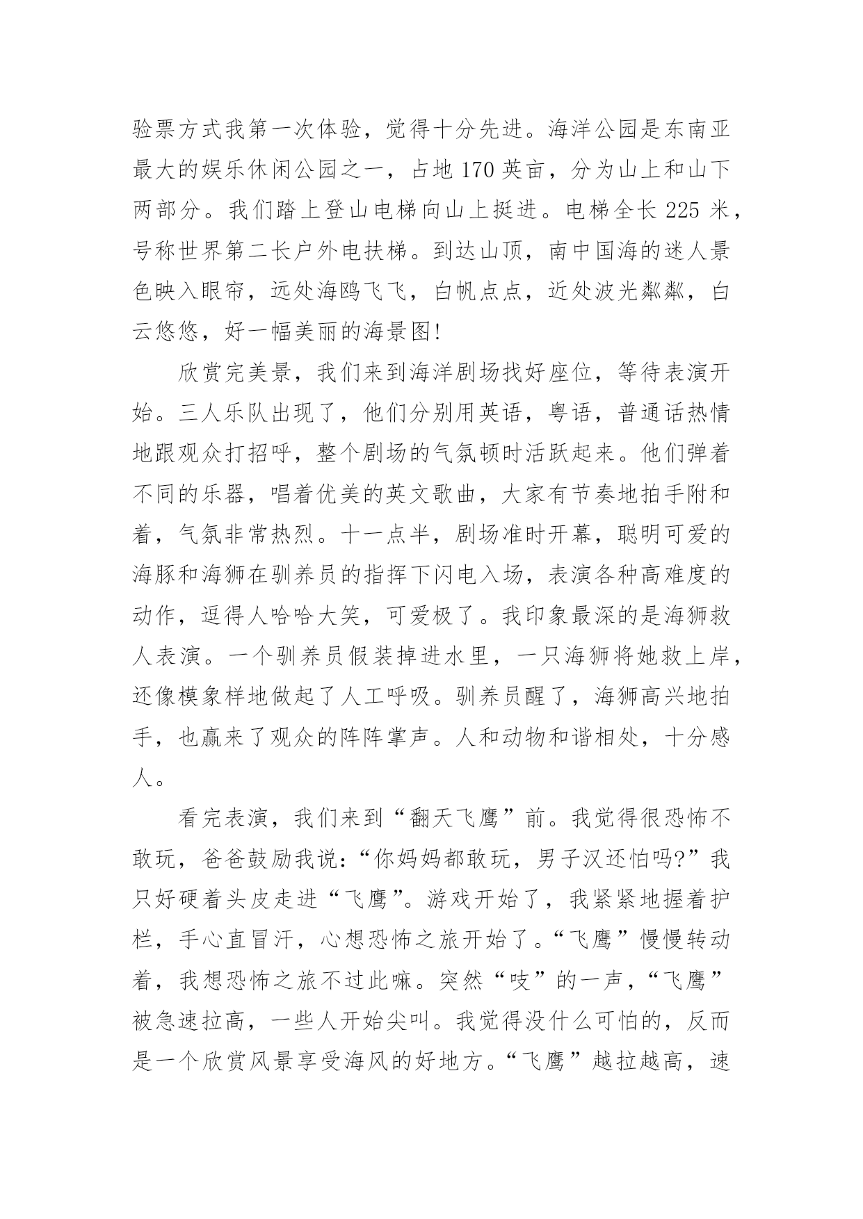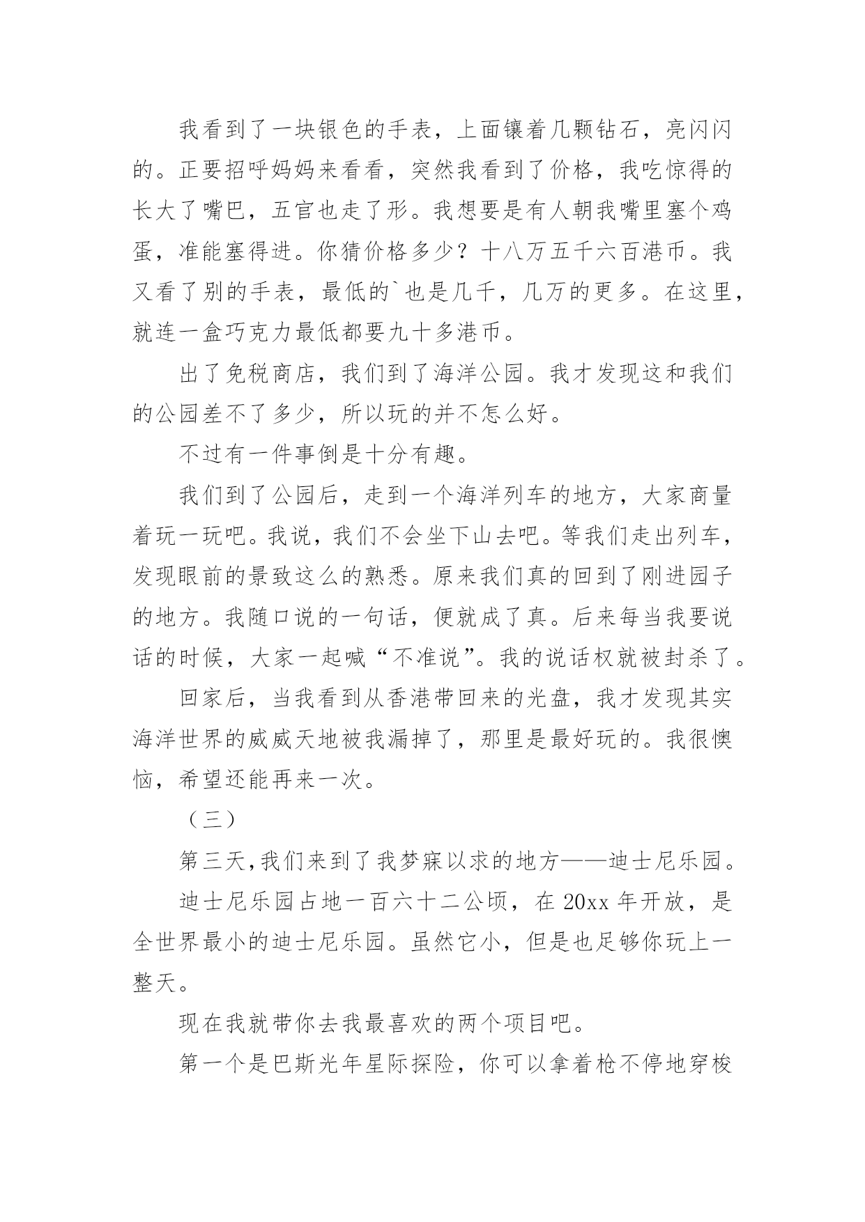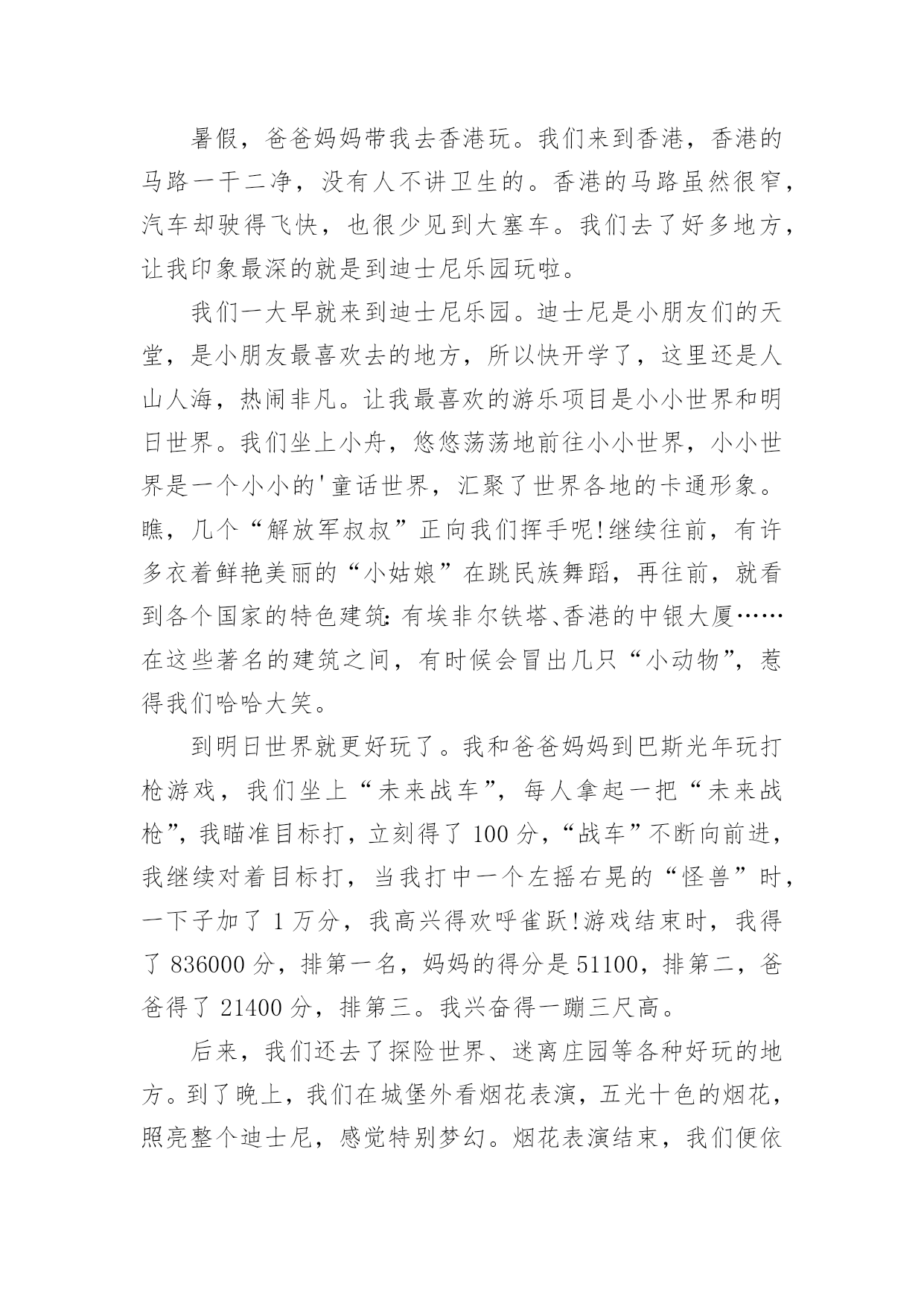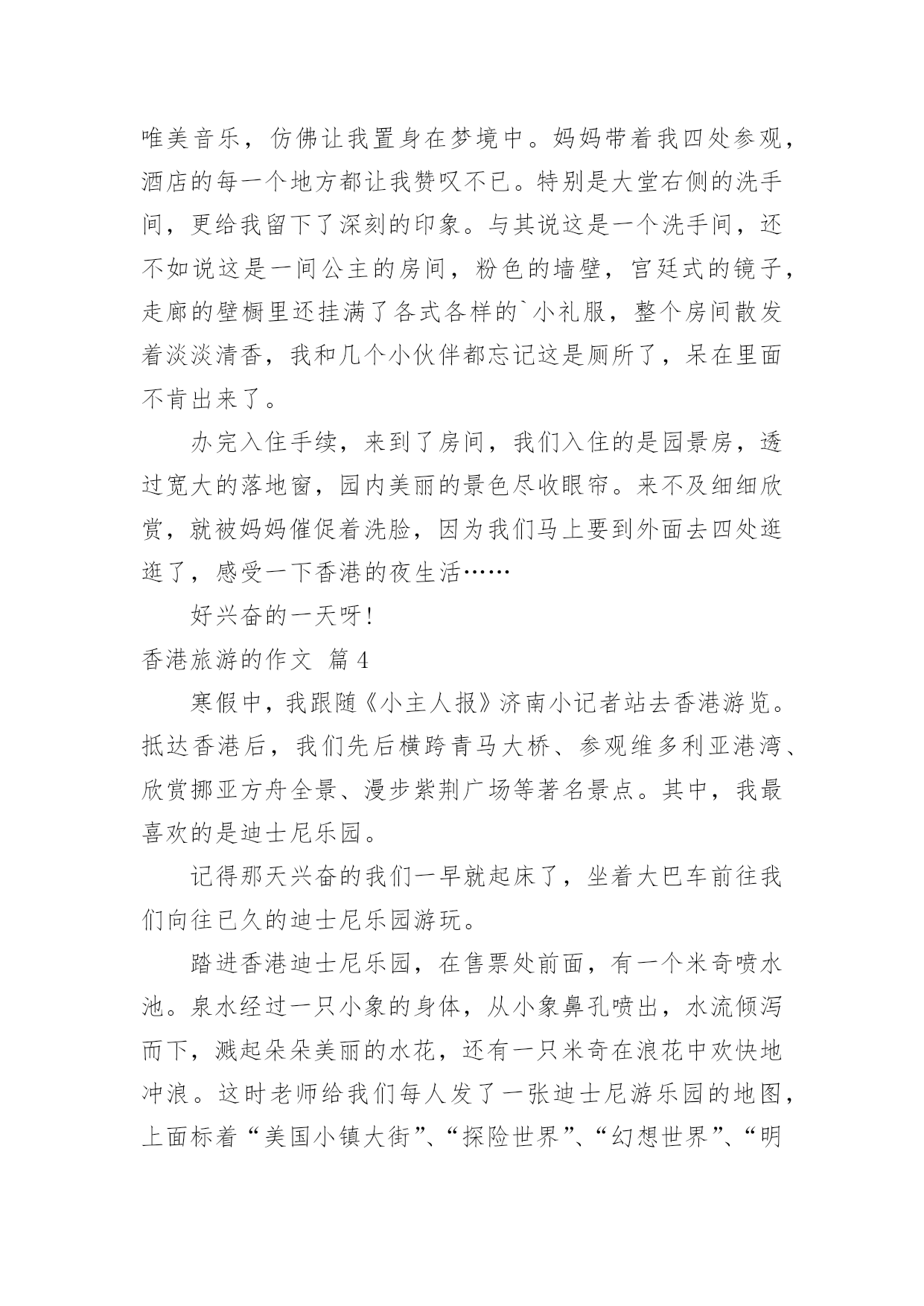 香港旅游的作文香港旅游的作文8篇在学习、工作、生活中,大家对作文都不陌生吧,通过作文可以把我们那些零零散散的思想,聚集在一块。相信写作文是一个让许多人都头痛的问题,以下是小编为大家收集的香港旅游的作文9篇,欢迎阅读与收藏。香港旅游的作文篇17月28日早上5点,我的闹钟就把我叫醒了,我真不想起来,可是我非起不可呀,这是我第一次去香港,我渴望去那很久了,听说香港呀,富丽堂皇,人杰地灵,资讯快速,物流迅速,高新科技飞速发展````````真是说也说不完。首先,我们先去了香港出名的海洋公园,山上以海洋馆、海洋剧场、海涛馆、机动游戏为主。山下则有水上乐园、花园剧场、金鱼馆及仿照历代文物所建的集古村,仿中国宫廷建筑,村内有亭台楼阁、庙宇街景,反映中国历史风貌,使中国古代街景重现,并有民间艺术表演。我再那玩得可开心拉,那些机动游戏真够刺激,玩过山车,跳楼机的时候弄得你惊心动魄,但玩玩后又使人回味无穷。玩玩之后就是看表演了,那是我最喜欢得动物-------海豚表演,我当然不能错过拉,看表演前有一些歌手搞搞场面气氛才开始海豚表演,你瞧,小海豚正在水里随着音乐和工作人员指挥的节奏舞动呢!那动作可滑鳍了,精彩的海豚表演吸引了游客的目光,令人流连忘返。最后,又看了海底世界,鲨鱼馆,就依依不舍的离开海洋公园了。接着,我们就和表姐去逛街,去逛街当然去香港最热闹的地方,而这地方要数铜罗湾了。街道两旁,高楼大厦鳞次栉比。街道上人流如潮。商店里的商品琳琅满目,让人眼花缭乱。人们个个兴高采烈,满载而归。我也不是两手空空,我买了鞋,衣服,手表``````香港真不愧为“购物天堂”。买了那么多东西,逛完繁华的购物中心,接着前往浅水湾散步是最好不过的安排。浅水湾是香港最具带表性的沙滩,大家知道吗?那而的沙是从海南运来的,海滩绵长,滩床宽阔,而且水清沙细,在阳光的照耀下海面波光粼粼,许多小孩在海边玩水,堆沙仔,在那里,可以听听浪涛的歌唱,可以欣赏海风的低吟,真是令人心旷神怡。在那儿呆得久也不觉得热呀!当然,我认为香港最美的是它的夜景,每到黄昏的那一刻,香港的全部大厦都会开满了灯,街道上也是,整个岛灯火辉煌,在山上看到此景,真是美不胜收。大家还知道吗?香港人很讲风水的,我听导游讲了许多许多关于香港讲风水的故事,觉得非常有趣,确实香港的'高楼大厦有着按风水先生指点而起的,而原本不好的生意也变得生意兴隆了,所以香港很多人都是信风水的,在秒街的一边,一排过去都是看相的。真有点吸引人。我在香港呆了三天,觉得日子过得太快了,还没玩够呀,但是这次又非要走了,真想留在香港多玩几天呀!香港旅游的作文篇2暑假,爸爸妈妈带我去香港玩。我们来到香港,香港的马路一干二净,没有人不讲卫生的。香港的马路虽然很窄,汽车却驶得飞快,也很少见到大塞车。我们去了好多地方,让我印象最深的就是到迪士尼乐园玩啦。我们一大早就来到迪士尼乐园。迪士尼是小朋友们的天堂,是小朋友最喜欢去的地方,所以快开学了,这里还是人山人海,热闹非凡。让我最喜欢的游乐项目是小小世界和明日世界。我们坐上小舟,悠悠荡荡地前往小小世界,小小世界是一个小小的'童话世界,汇聚了世界各地的卡通形象。瞧,几个“解放军叔叔”正向我们挥手呢!继续往前,有许多衣着鲜艳美丽的“小姑娘”在跳民族舞蹈,再往前,就看到各个国家的特色建筑:有埃非尔铁塔、香港的中银大厦……在这些著名的建筑之间,有时候会冒出几只“小动物”,惹得我们哈哈大笑。到明日世界就更好玩了。我和爸爸妈妈到巴斯光年玩打枪游戏,我们坐上“未来战车”,每人拿起一把“未来战枪”,我瞄准目标打,立刻得了100分,“战车”不断向前进,我继续对着目标打,当我打中一个左摇右晃的“怪兽”时,一下子加了1万分,我高兴得欢呼雀跃!游戏结束时,我得了836000分,排第一名,妈妈的得分是51100,排第二,爸爸得了21400分,排第三。我兴奋得一蹦三尺高。后来,我们还去了探险世界、迷离庄园等各种好玩的地方。到了晚上,我们在城堡外看烟花表演,五光十色的烟花,照亮整个迪士尼,感觉特别梦幻。烟花表演结束,我们便依依不舍地离开了迪士尼乐园。在香港,我们还去了维多利亚港、星光大道、太平山、大屿山、科学馆、太空馆和海洋公园,每一个地方都特别好玩,也玩得特别开心。香港是童话世界,香港是梦幻世界,我很喜欢香港,也爱这颗璀璨无比的东方之珠!香港旅游的作文篇3日盼夜盼,终于盼来了去香港的日子。我们收拾好行李,来到机场,办完登机手续,准时坐上了飞机,兴奋地等待着飞机起飞。可就在这时,广播里传来空姐甜美的声音:各位旅客,因香港机场交通堵塞,飞机将晚点一个小时起飞。妈妈呀,一个小时呀,我顿时像一只泄了气的皮球,瘫坐在座位上,恨不得自己长出一双翅膀飞过去。扳着手指头,终于熬过了这漫长的一小时。四点整,我们乘坐的飞机终于腾空而起,飞向蓝天。经过近2
