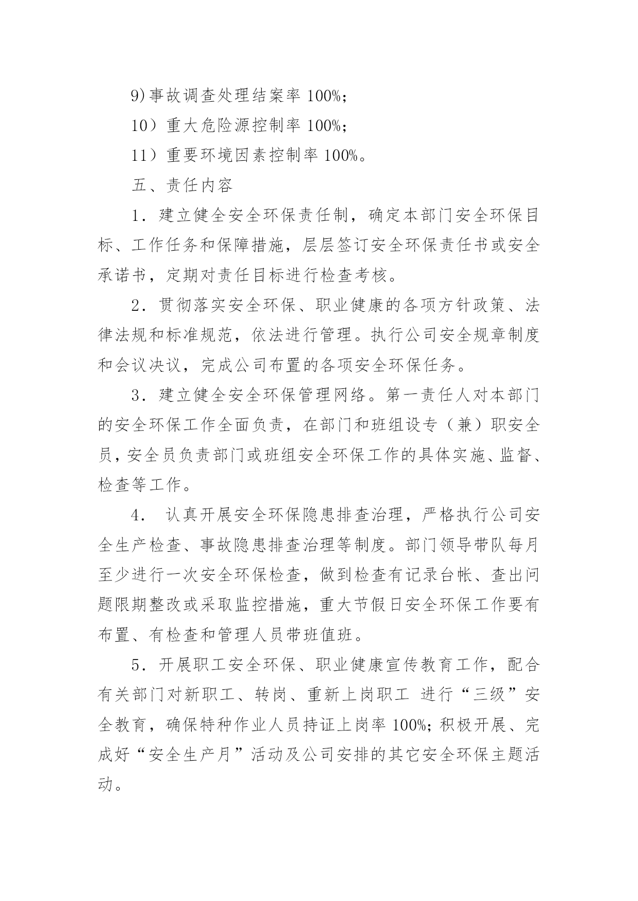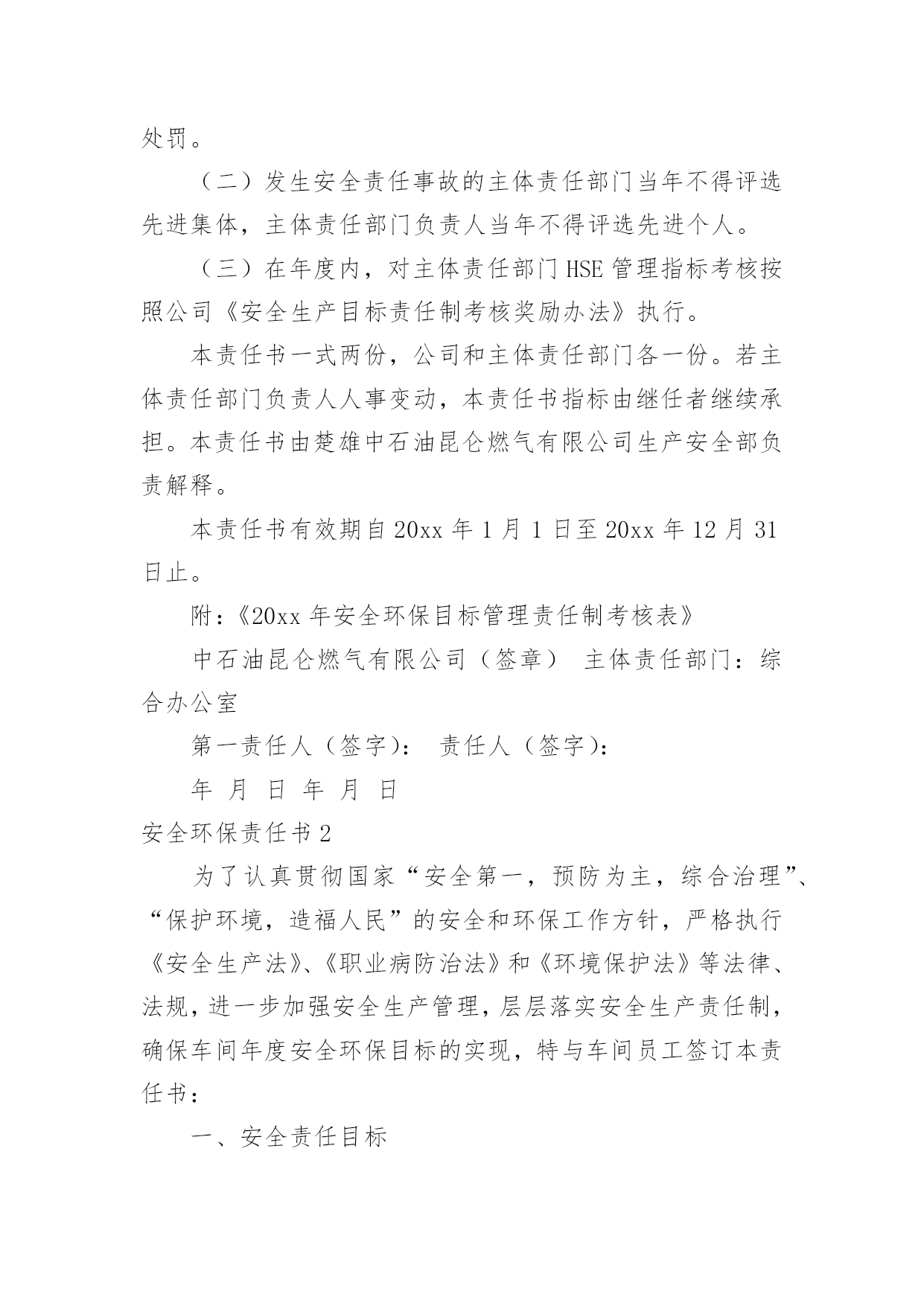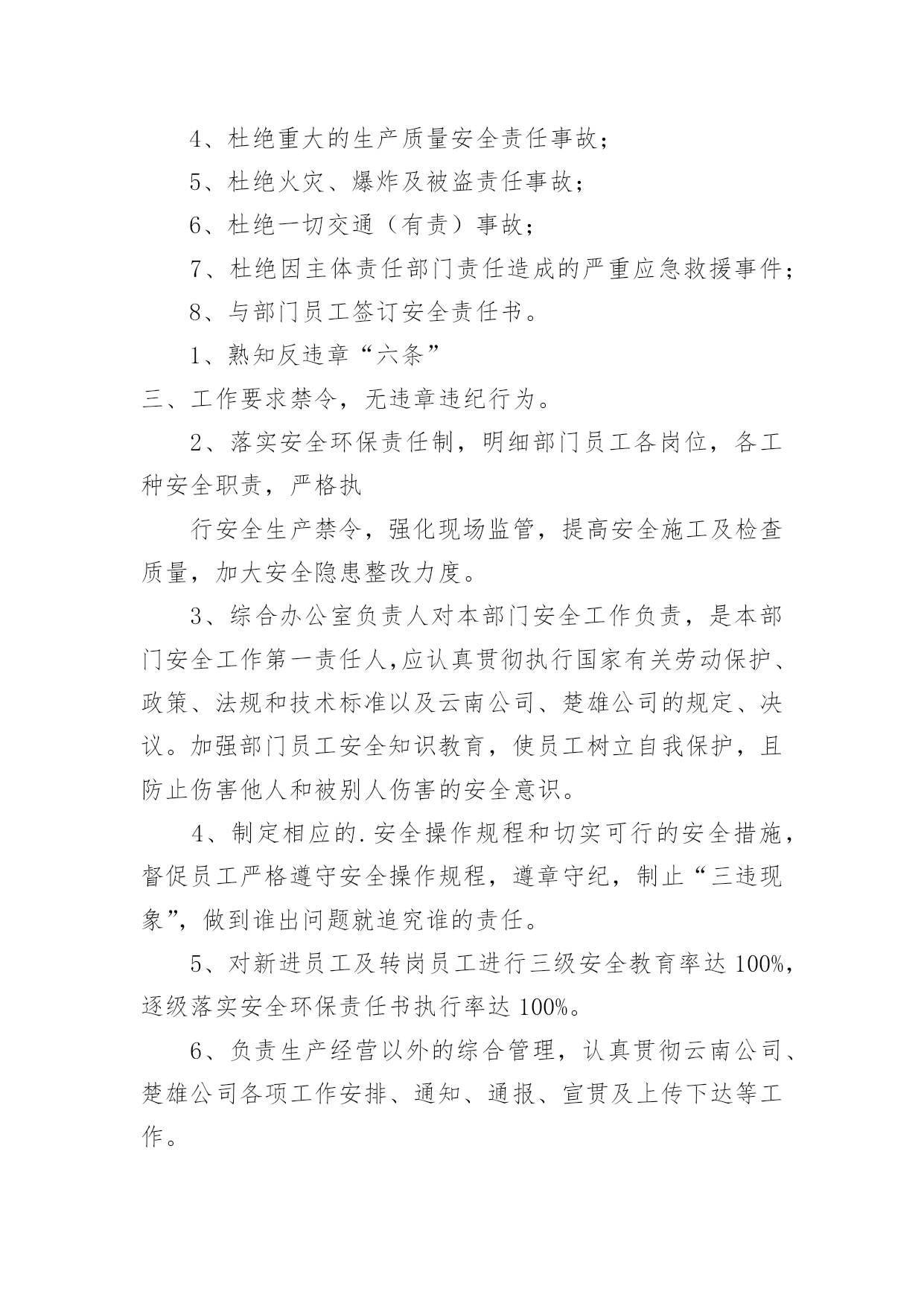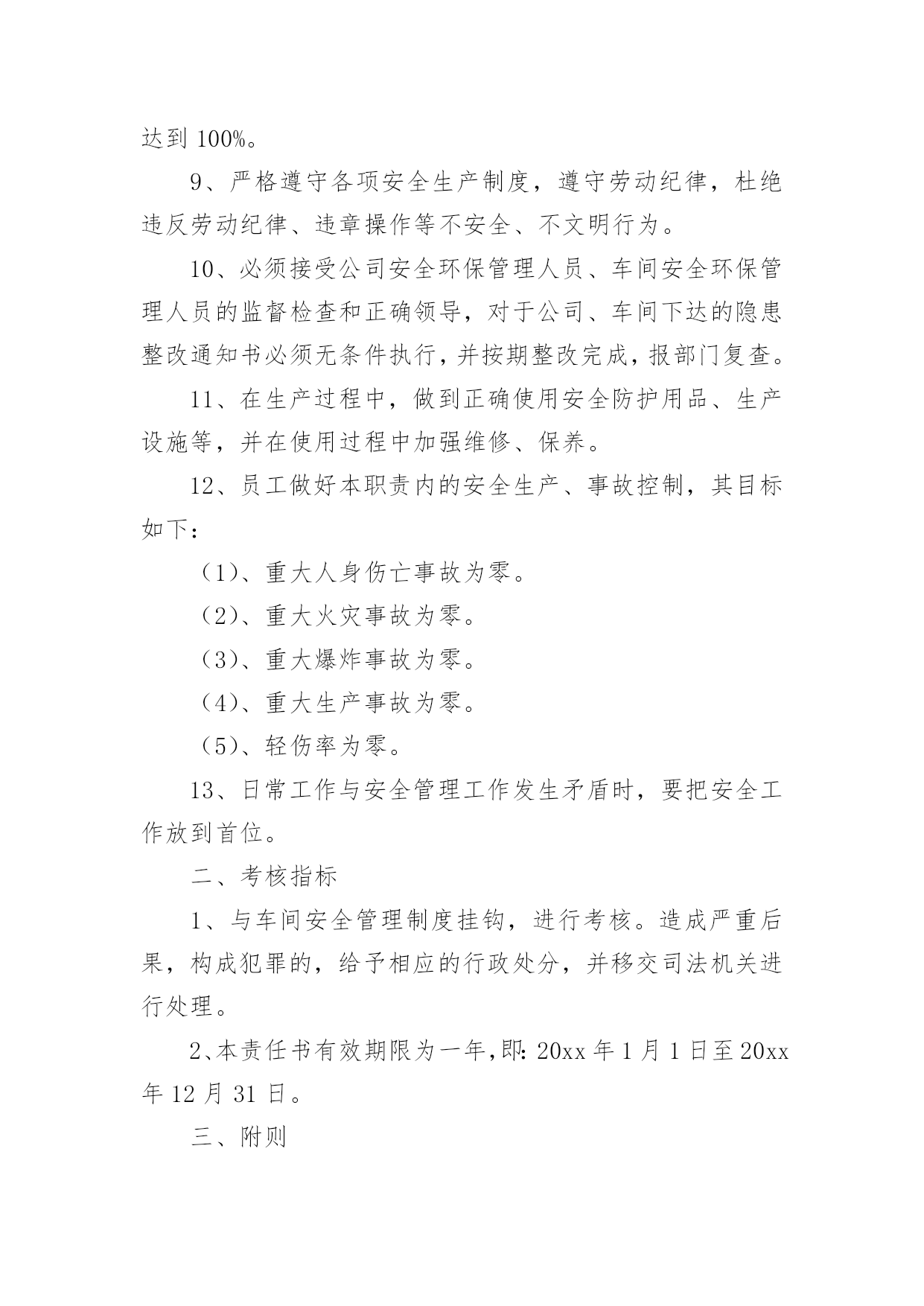 安全环保责任书安全环保责任书随着社会一步步向前发展,责任书使用的频率越来越高,责任书是写明责任范围、职责,多用于平行的文书。那么拟定责任书真的很难吗?以下是小编收集整理的安全环保责任书,供大家参考借鉴,希望可以帮助到有需要的朋友。安全环保责任书1元月中石油昆仑燃气有限公司与XX中石油昆仑燃气有限公司签订了20xx年度安全环保责任书,为贯彻落实安全环保主体责任,强化安全环保意识,使之形成全员参与,共负总责,努力实现“零事故、零伤亡、零污染、零泄漏、降能耗”的工作目标,XX中石油昆仑燃气有限公司与所属综合办公室签订20xx年度安全环保责任书。一、责任人综合办公室负责人二、责任指标1、杜绝所管资产及人员人身和财产安全责任事故,避免一般性安全责任事故、减少微小责任事故,及时发现并排除事故隐患;2、杜绝重大及以上的环境污染责任事故;3、杜绝造成重大社会影响的责任事故;4、杜绝重大的生产质量安全责任事故;5、杜绝火灾、爆炸及被盗责任事故;6、杜绝一切交通(有责)事故;7、杜绝因主体责任部门责任造成的严重应急救援事件;8、与部门员工签订安全责任书。1、熟知反违章“六条”三、工作要求禁令,无违章违纪行为。2、落实安全环保责任制,明细部门员工各岗位,各工种安全职责,严格执行安全生产禁令,强化现场监管,提高安全施工及检查质量,加大安全隐患整改力度。3、综合办公室负责人对本部门安全工作负责,是本部门安全工作第一责任人,应认真贯彻执行国家有关劳动保护、政策、法规和技术标准以及云南公司、楚雄公司的规定、决议。加强部门员工安全知识教育,使员工树立自我保护,且防止伤害他人和被别人伤害的安全意识。4、制定相应的.安全操作规程和切实可行的安全措施,督促员工严格遵守安全操作规程,遵章守纪,制止“三违现象”,做到谁出问题就追究谁的责任。5、对新进员工及转岗员工进行三级安全教育率达100%,逐级落实安全环保责任书执行率达100%。6、负责生产经营以外的综合管理,认真贯彻云南公司、楚雄公司各项工作安排、通知、通报、宣贯及上传下达等工作。7、负责对员工食堂、生活用水、环境卫生的管理,确保饮用水达到国家标准,生活、办公区等公共场所清洁卫生,杜绝脏乱差现象和食物中毒事故的发生。8、对公司重要文件做好备案工作,妥善保管公司所有档案资料。抓好安全管理工作,按规定建立建全各种管理台账,定期填报各类报表,按时完成年度安全计划、总结。9、落实所有合同的资金支付情况,避免出现因资金支付导致的各类纠纷。10、负责楚雄公司车辆运行安全管理,公车公用,确保行车安全,严格执行用车申请、用车记录;每月须对车辆进行安全自检自查,做好专、兼职驾驶员交通安全教育培训,避免责任事故的发生。11、合理安排好车辆、机械设备维护保养工作,确保使用正常。12、根据楚雄公司的工作实际,明确职责、任务、权限,并按照与部门员工的责任书内容检查落实,检查的结果纳入员工年终考核。13、做好公司节电节水等环保指标的考核工作。14、及时掌握本部门员工的思想动态及实际问题,发现不稳定因素及时向楚雄公司领导反映。四、责任追究(一)在年度内,主体责任部门如发生一起一般C级事故,或发生两起未遂伤亡事故,或发生一起较大及以上社会影响的责任事故,按照公司《安全管理制度》相关规定进行处罚。(二)发生安全责任事故的主体责任部门当年不得评选先进集体,主体责任部门负责人当年不得评选先进个人。(三)在年度内,对主体责任部门HSE管理指标考核按照公司《安全生产目标责任制考核奖励办法》执行。本责任书一式两份,公司和主体责任部门各一份。若主体责任部门负责人人事变动,本责任书指标由继任者继续承担。本责任书由楚雄中石油昆仑燃气有限公司生产安全部负责解释。本责任书有效期自20xx年1月1日至20xx年12月31日止。附:《20xx年安全环保目标管理责任制考核表》中石油昆仑燃气有限公司(签章)主体责任部门:综合办公室第一责任人(签字):责任人(签字):年月日年月日安全环保责任书2为了认真贯彻国家“安全第一,预防为主,综合治理”、“保护环境,造福人民”的安全和环保工作方针,严格执行《安全生产法》、《职业病防治法》和《环境保护法》等法律、法规,进一步加强安全生产管理,层层落实安全生产责任制,确保车间年度安全环保目标的实现,特与车间员工签订本责任书:一、安全责任目标1、员工承诺在公司工作期间必须服从公司、车间的安全管理,严格遵守公司、车间的各项安全规章制度和操作流程。2、在车间发现不安全隐患时,须及时进行控制,并迅速上报本车间负责人。3、员工必须执行“三不伤害”,不违章作业,并劝阻或制止他人违章作业,有权拒绝各种违章指挥。员工自愿接受安全教育,不断提高安全操作技能,以满足安全生产的需要。4、员工在工作期间因违章操作设备用具或不按规定流程进行作业等造成不安全隐患、