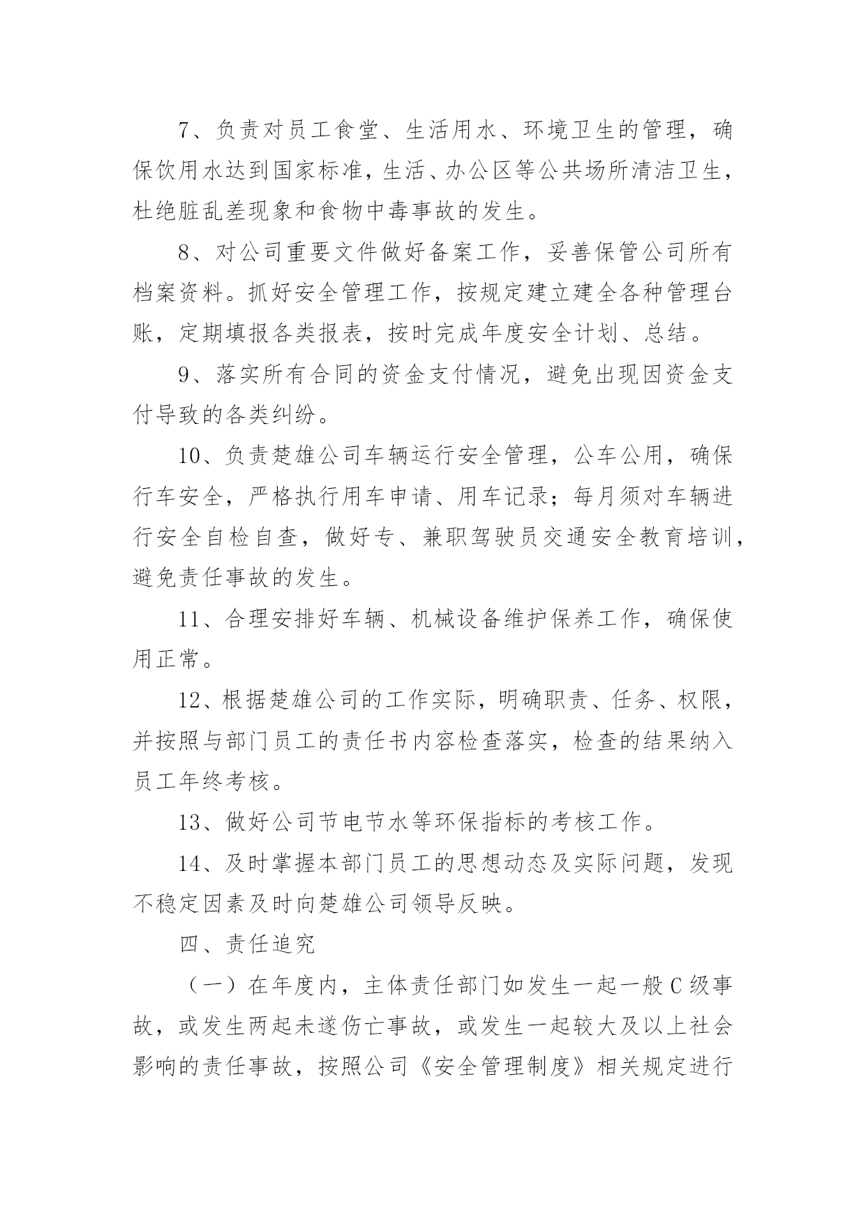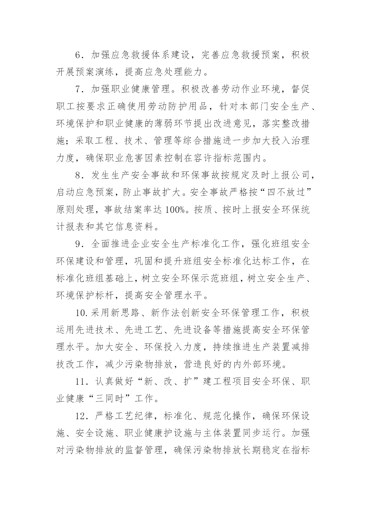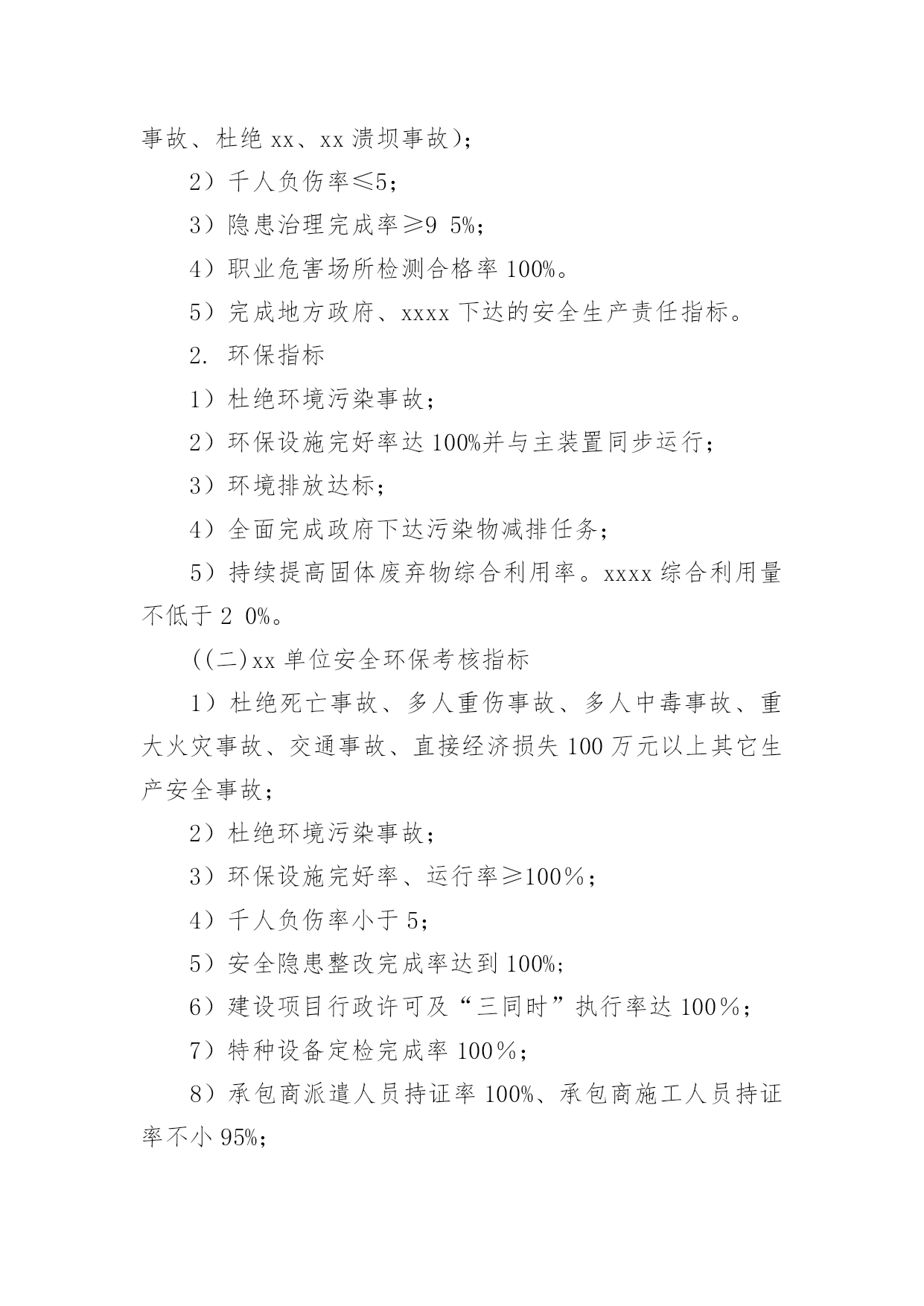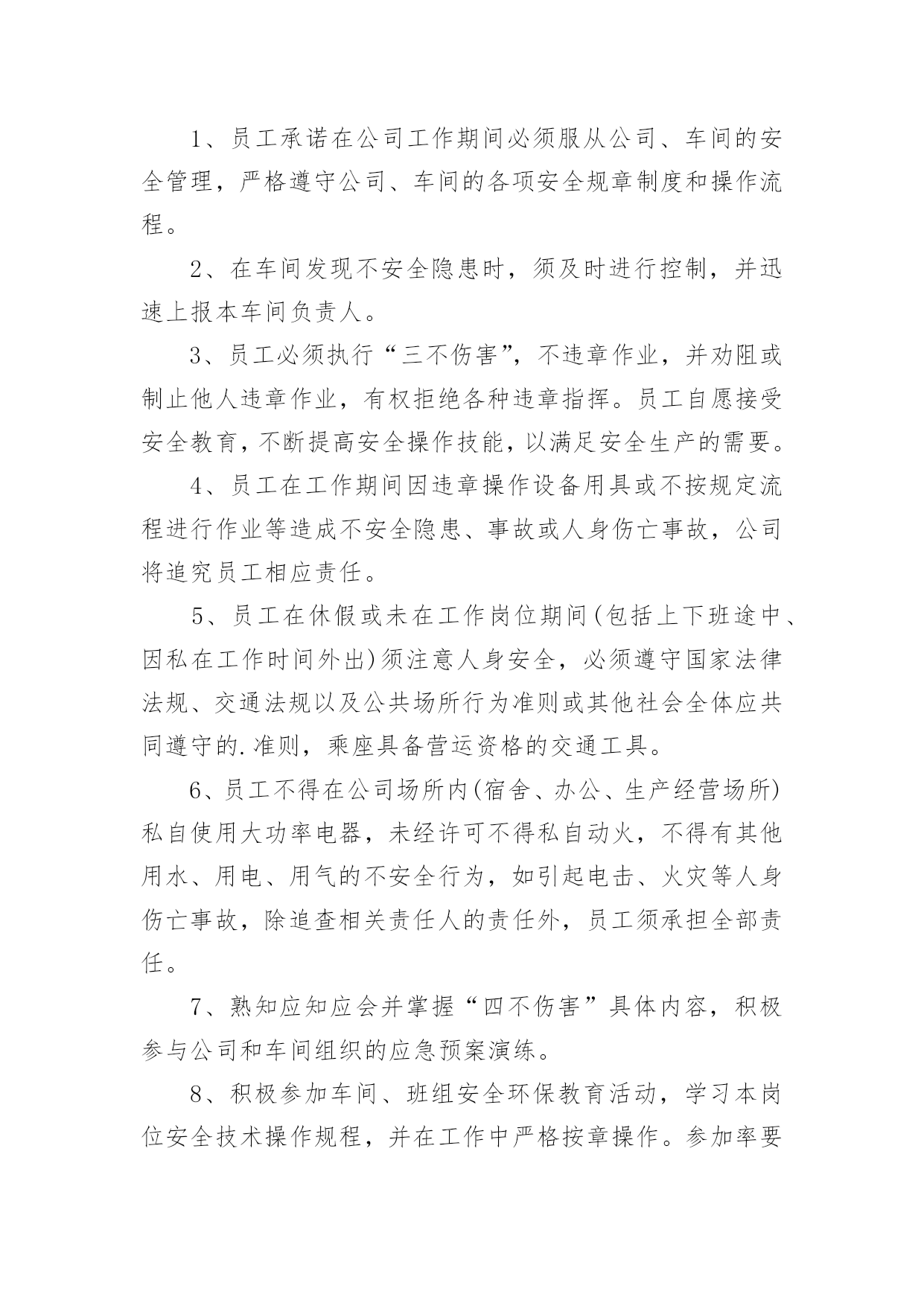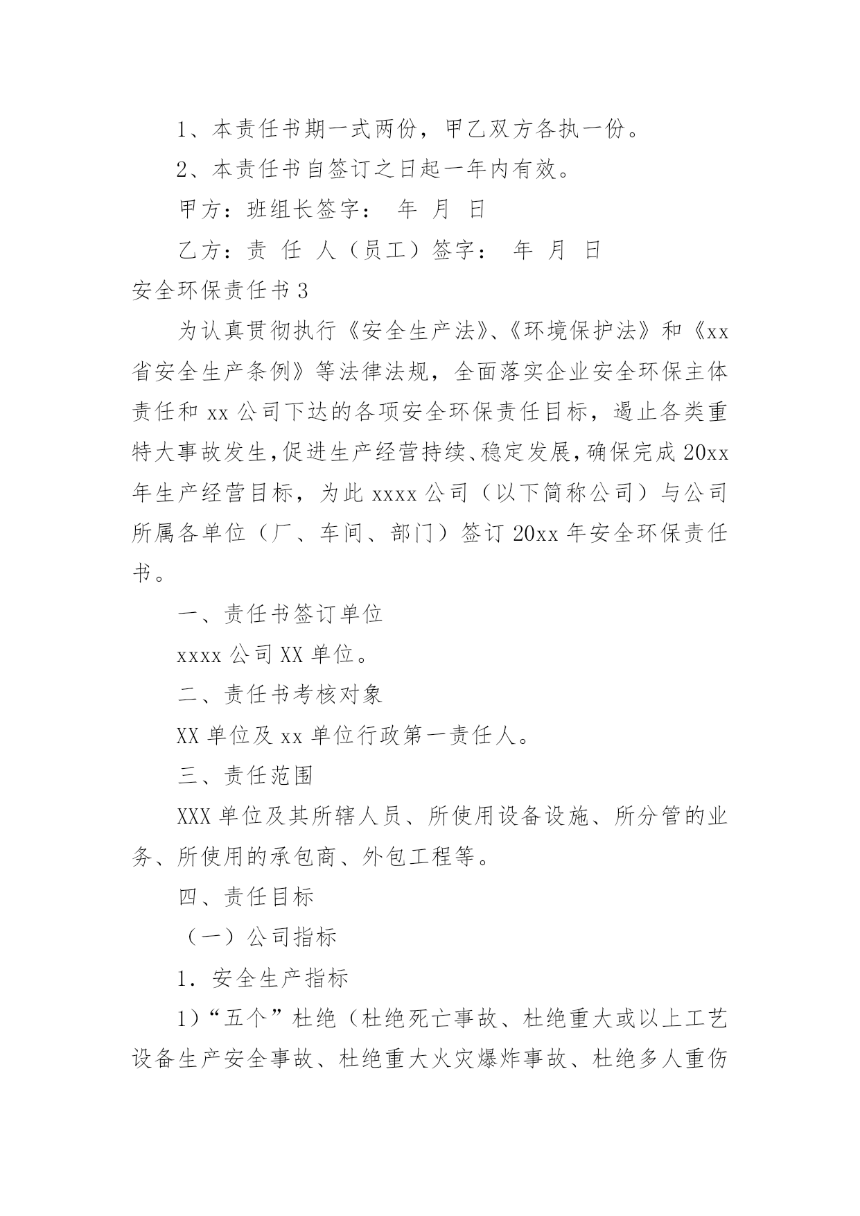 安全环保责任书安全环保责任书随着社会一步步向前发展,责任书使用的频率越来越高,责任书是写明责任范围、职责,多用于平行的文书。那么拟定责任书真的很难吗?以下是小编收集整理的安全环保责任书,供大家参考借鉴,希望可以帮助到有需要的朋友。安全环保责任书1元月中石油昆仑燃气有限公司与XX中石油昆仑燃气有限公司签订了20xx年度安全环保责任书,为贯彻落实安全环保主体责任,强化安全环保意识,使之形成全员参与,共负总责,努力实现“零事故、零伤亡、零污染、零泄漏、降能耗”的工作目标,XX中石油昆仑燃气有限公司与所属综合办公室签订20xx年度安全环保责任书。一、责任人综合办公室负责人二、责任指标1、杜绝所管资产及人员人身和财产安全责任事故,避免一般性安全责任事故、减少微小责任事故,及时发现并排除事故隐患;2、杜绝重大及以上的环境污染责任事故;3、杜绝造成重大社会影响的责任事故;4、杜绝重大的生产质量安全责任事故;5、杜绝火灾、爆炸及被盗责任事故;6、杜绝一切交通(有责)事故;7、杜绝因主体责任部门责任造成的严重应急救援事件;8、与部门员工签订安全责任书。1、熟知反违章“六条”三、工作要求禁令,无违章违纪行为。2、落实安全环保责任制,明细部门员工各岗位,各工种安全职责,严格执行安全生产禁令,强化现场监管,提高安全施工及检查质量,加大安全隐患整改力度。3、综合办公室负责人对本部门安全工作负责,是本部门安全工作第一责任人,应认真贯彻执行国家有关劳动保护、政策、法规和技术标准以及云南公司、楚雄公司的规定、决议。加强部门员工安全知识教育,使员工树立自我保护,且防止伤害他人和被别人伤害的安全意识。4、制定相应的.安全操作规程和切实可行的安全措施,督促员工严格遵守安全操作规程,遵章守纪,制止“三违现象”,做到谁出问题就追究谁的责任。5、对新进员工及转岗员工进行三级安全教育率达100%,逐级落实安全环保责任书执行率达100%。6、负责生产经营以外的综合管理,认真贯彻云南公司、楚雄公司各项工作安排、通知、通报、宣贯及上传下达等工作。7、负责对员工食堂、生活用水、环境卫生的管理,确保饮用水达到国家标准,生活、办公区等公共场所清洁卫生,杜绝脏乱差现象和食物中毒事故的发生。8、对公司重要文件做好备案工作,妥善保管公司所有档案资料。抓好安全管理工作,按规定建立建全各种管理台账,定期填报各类报表,按时完成年度安全计划、总结。9、落实所有合同的资金支付情况,避免出现因资金支付导致的各类纠纷。10、负责楚雄公司车辆运行安全管理,公车公用,确保行车安全,严格执行用车申请、用车记录;每月须对车辆进行安全自检自查,做好专、兼职驾驶员交通安全教育培训,避免责任事故的发生。11、合理安排好车辆、机械设备维护保养工作,确保使用正常。12、根据楚雄公司的工作实际,明确职责、任务、权限,并按照与部门员工的责任书内容检查落实,检查的结果纳入员工年终考核。13、做好公司节电节水等环保指标的考核工作。14、及时掌握本部门员工的思想动态及实际问题,发现不稳定因素及时向楚雄公司领导反映。四、责任追究(一)在年度内,主体责任部门如发生一起一般C级事故,或发生两起未遂伤亡事故,或发生一起较大及以上社会影响的责任事故,按照公司《安全管理制度》相关规定进行处罚。(二)发生安全责任事故的主体责任部门当年不得评选先进集体,主体责任部门负责人当年不得评选先进个人。(三)在年度内,对主体责任部门HSE管理指标考核按照公司《安全生产目标责任制考核奖励办法》执行。本责任书一式两份,公司和主体责任部门各一份。若主体责任部门负责人人事变动,本责任书指标由继任者继续承担。本责任书由楚雄中石油昆仑燃气有限公司生产安全部负责解释。本责任书有效期自20xx年1月1日至20xx年12月31日止。附:《20xx年安全环保目标管理责任制考核表》中石油昆仑燃气有限公司(签章)主体责任部门:综合办公室第一责任人(签字):责任人(签字):年月日年月日安全环保责任书2为了认真贯彻国家“安全第一,预防为主,综合治理”、“保护环境,造福人民”的安全和环保工作方针,严格执行《安全生产法》、《职业病防治法》和《环境保护法》等法律、法规,进一步加强安全生产管理,层层落实安全生产责任制,确保车间年度安全环保目标的实现,特与车间员工签订本责任书:一、安全责任目标1、员工承诺在公司工作期间必须服从公司、车间的安全管理,严格遵守公司、车间的各项安全规章制度和操作流程。2、在车间发现不安全隐患时,须及时进行控制,并迅速上报本车间负责人。3、员工必须执行“三不伤害”,不违章作业,并劝阻或制止他人违章作业,有权拒绝各种违章指挥。员工自愿接受安全教育,不断提高安全操作技能,以满足安全生产的需要。4、员工在工作期间因违章操作设备用具或不按规定流程进行作业等造成不安全隐患、