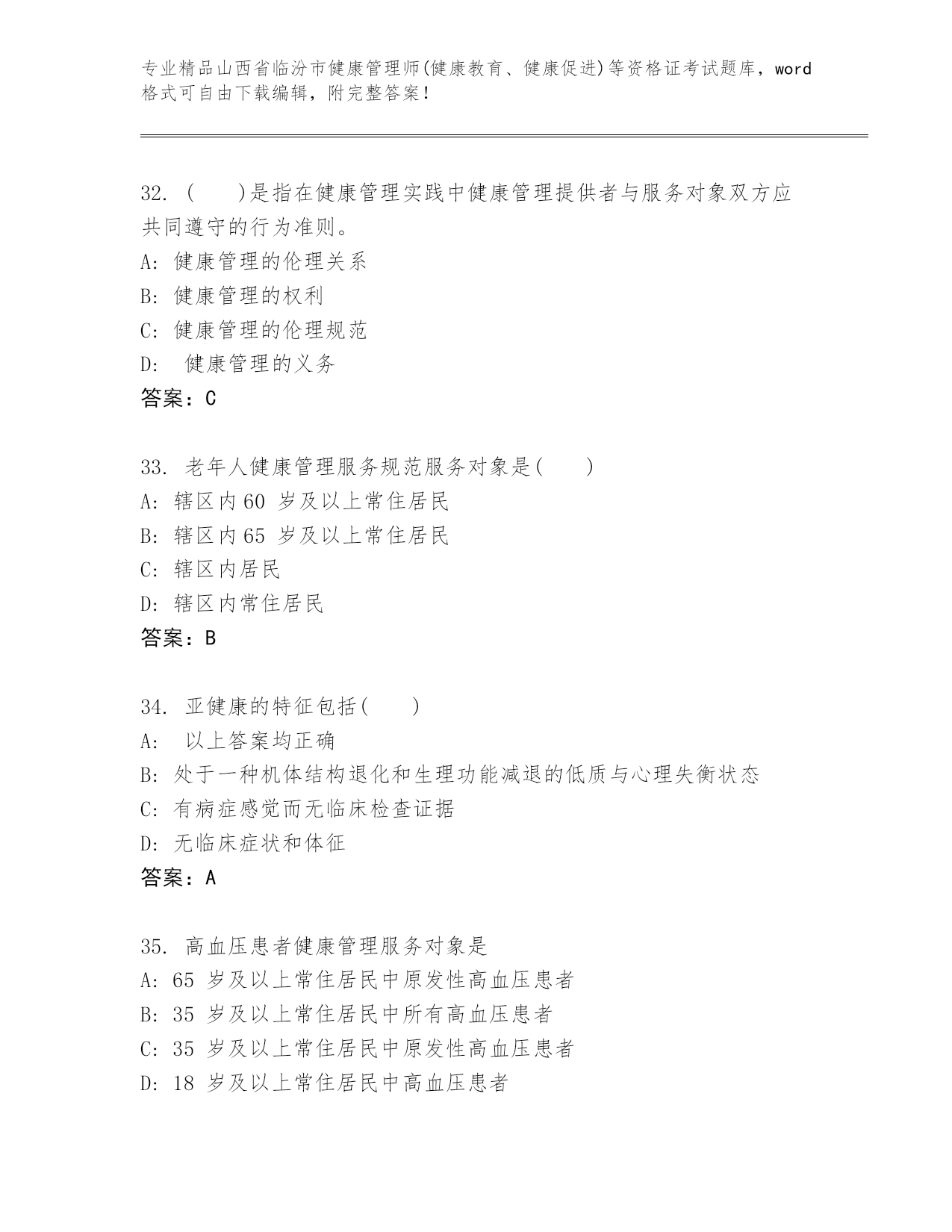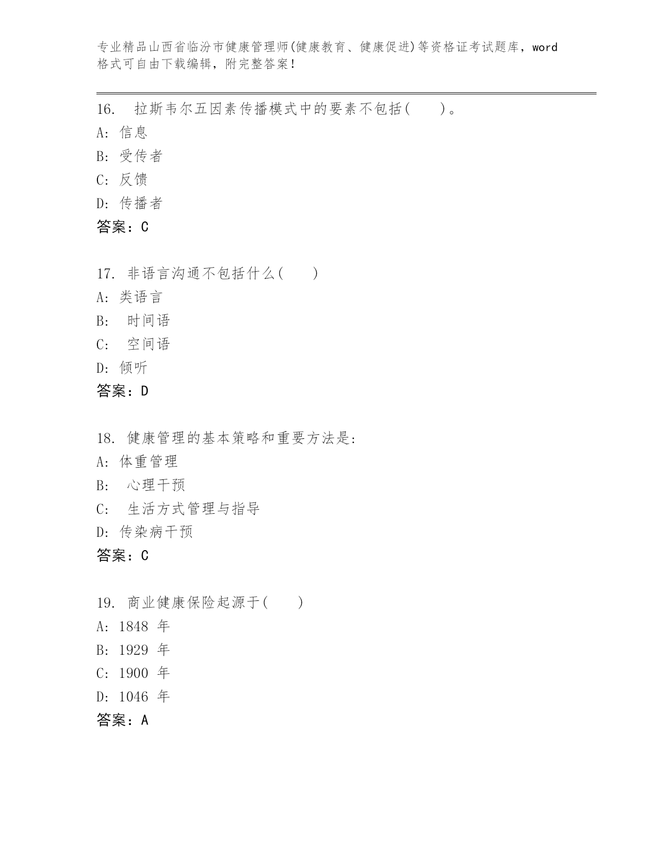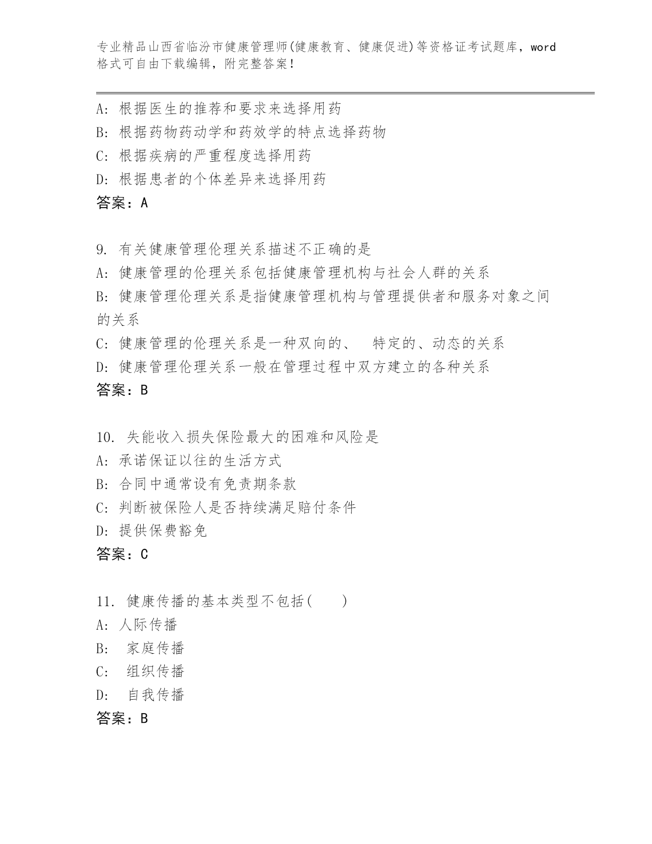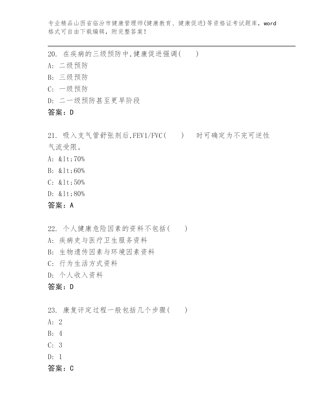 最新山西省临汾市健康管理师(健康教育、健康促进)等资格证考试通用题库【精品】