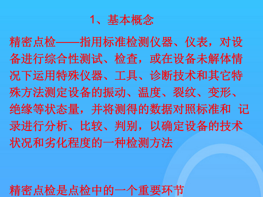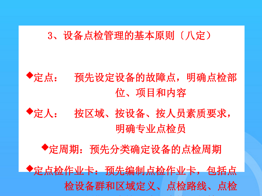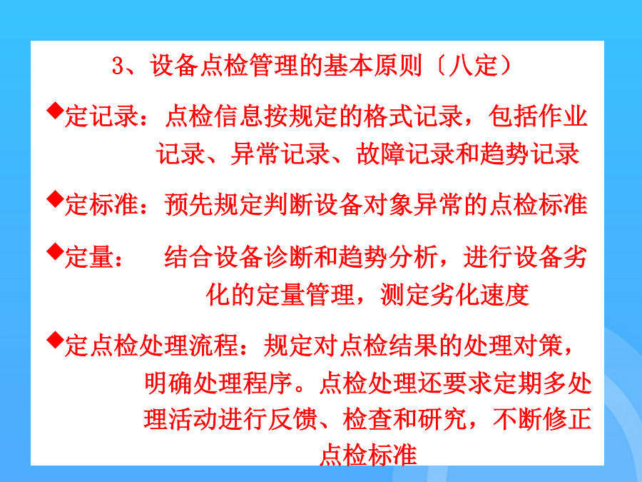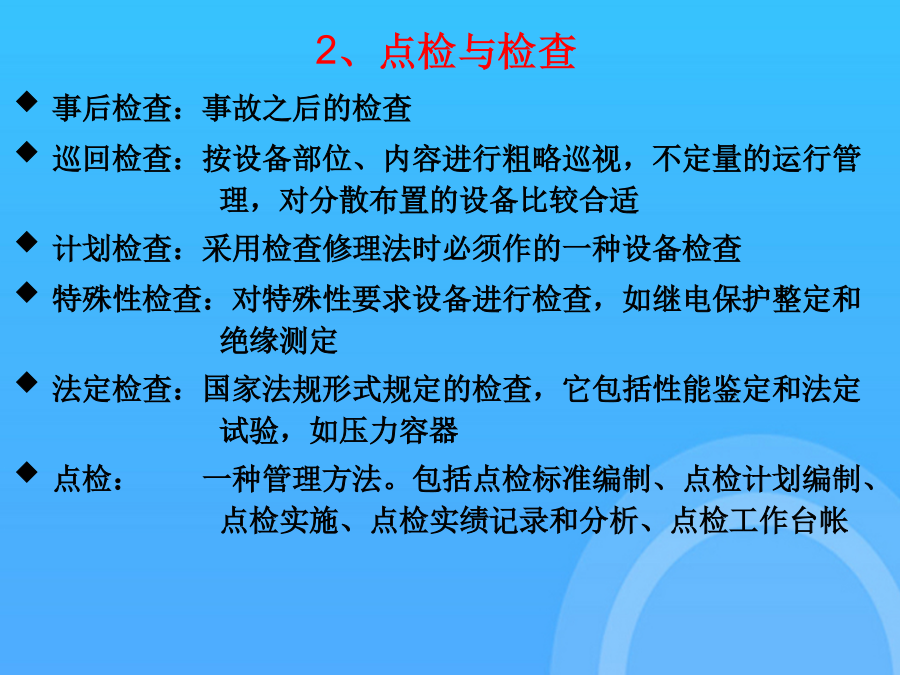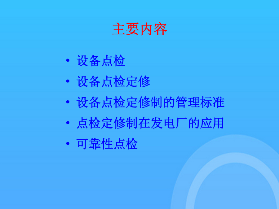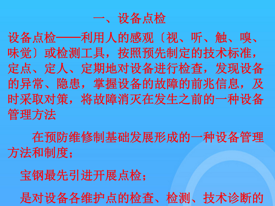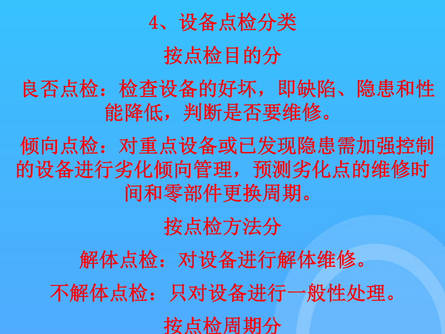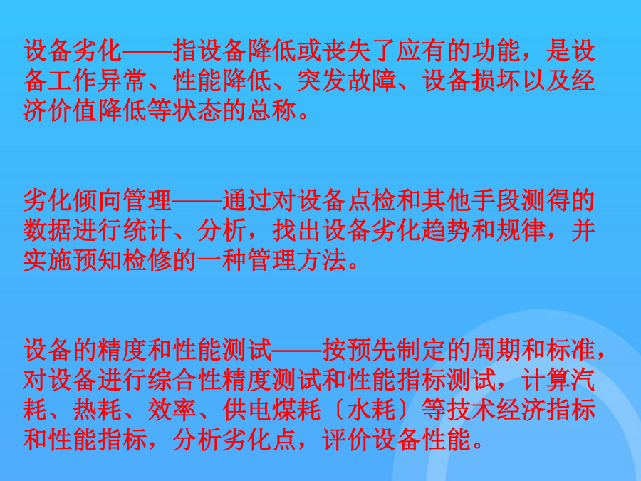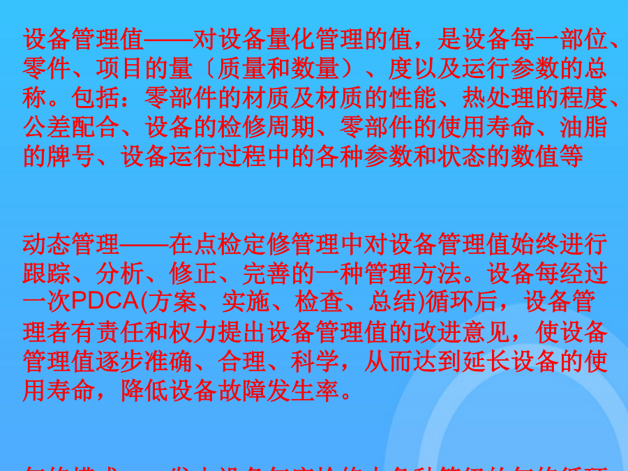 发电设备点检定修管理主要内容设备点检——利用人的感观〔视、听、触、嗅、味觉〕或检测工具,按照预先制定的技术标准,定点、定人、定期地对设备进行检查,发现设备的异常、隐患,掌握设备的故障的前兆信息,及时采取对策,将故障消灭在发生之前的一种设备管理方法在预防维修制基础发展形成的一种设备管理方法和制度;宝钢最先引进开展点检;是对设备各维护点的检查、检测、技术诊断的总和,根据这些状态信息确定设备劣化程度,判定设备健康状况,并安排检修;以设备受控作业点检管理为目标,从以修为主转为以管为主精密点检——指用标准检测仪器、仪表,对设备进行综合性测试、检查,或在设备未解体情况下运用特殊仪器、工具、诊断技术和其它特殊方法测定设备的振动、温度、裂纹、变形、绝缘等状态量,并将测得的数据对照标准和记录进行分析、比较、判别,以确定设备的技术状况和劣化程度的一种检测方法精密点检是点检中的一个重要环节设备劣化——指设备降低或丧失了应有的功能,是设备工作异常、性能降低、突发故障、设备损坏以及经济价值降低等状态的总称。劣化倾向管理——通过对设备点检和其他手段测得的数据进行统计、分析,找出设备劣化趋势和规律,并实施预知检修的一种管理方法。设备的精度和性能测试——按预先制定的周期和标准,对设备进行综合性精度测试和性能指标测试,计算汽耗、热耗、效率、供电煤耗〔水耗〕等技术经济指标和性能指标,分析劣化点,评价设备性能。设备管理值——对设备量化管理的值,是设备每一部位、零件、项目的量〔质量和数量)、度以及运行参数的总称。包括:零部件的材质及材质的性能、热处理的程度、公差配合、设备的检修周期、零部件的使用寿命、油脂的牌号、设备运行过程中的各种参数和状态的数值等动态管理——在点检定修管理中对设备管理值始终进行跟踪、分析、修正、完善的一种管理方法。设备每经过一次PDCA(方案、实施、检查、总结)循环后,设备管理者有责任和权力提出设备管理值的改进意见,使设备管理值逐步准确、合理、科学,从而达到延长设备的使用寿命,降低设备故障发生率。年修模式——发电设备年度检修中各种等级的年修循环周期的排列组合。♦事后检查:事故之后的检查♦巡回检查:按设备部位、内容进行粗略巡视,不定量的运行管理,对分散布置的设备比较合适♦计划检查:采用检查修理法时必须作的一种设备检查♦特殊性检查:对特殊性要求设备进行检查,如继电保护整定和绝缘测定♦法定检查:国家法规形式规定的检查,它包括性能鉴定和法定试验,如压力容器♦点检:一种管理方法。包括点检标准编制、点检计划编制、点检实施、点检实绩记录和分析、点检工作台帐3、设备点检管理的基本原则〔八定)♦定点:预先设定设备的故障点,明确点检部位、项目和内容♦定人:按区域、按设备、按人员素质要求,明确专业点检员♦定周期:预先分类确定设备的点检周期♦定点检作业卡:预先编制点检作业卡,包括点检设备群和区域定义、点检路线、点检周期、点检方法、点检工具等3、设备点检管理的基本原则〔八定)♦定记录:点检信息按规定的格式记录,包括作业记录、异常记录、故障记录和趋势记录♦定标准:预先规定判断设备对象异常的点检标准♦定量:结合设备诊断和趋势分析,进行设备劣化的定量管理,测定劣化速度♦定点检处理流程:规定对点检结果的处理对策,明确处理程序。点检处理还要求定期多处理活动进行反馈、检查和研究,不断修正点检标准4、设备点检分类按点检目的分良否点检:检查设备的好坏,即缺陷、隐患和性能降低,判断是否要维修。倾向点检:对重点设备或已发现隐患需加强控制的设备进行劣化倾向管理,预测劣化点的维修时间和零部件更换周期。按点检方法分解体点检:对设备进行解体维修。不解体点检:只对设备进行一般性处理。按点检周期分日常点检:即在设备运行中的巡检,由运行人员完成。定期点检:由专业点检员完成。精密点检:由专业点检员、专业技术人员利用特殊仪器共同完成,测定设备的实际劣化程度。种类点检作业区:设备管理人员所负责设备点检作业区划分♦按专业划分:按汽机、锅炉、电气、热控、燃料等专业划分作业区,该方法目前在我国普遍应用。♦按区域划分:按机组设立主管,下设若干点检员,要求点检员要求一专多能,该方法先进,但应用较少;一般火电厂设备管理部人员设置设备管理部人员设置方式2设备管理部主任职责:1、贯彻电力生产方针、法规、标准及技术规范,全面负责本企业的设备管理工作,努力提高设备运行可靠性和经济性。2、负责编制修订点检定修各项技术标准、作业标准和管理标准,并组织实施。3、组织编制设备检修计划及科技、技改、反措施计划,组织实施。4、深入现场,督促各专业及时消除重大设备缺陷,督促各专业做好设备异常分析并采取相应防范措施,健全设备档案、点检定修技术记录及异常情况