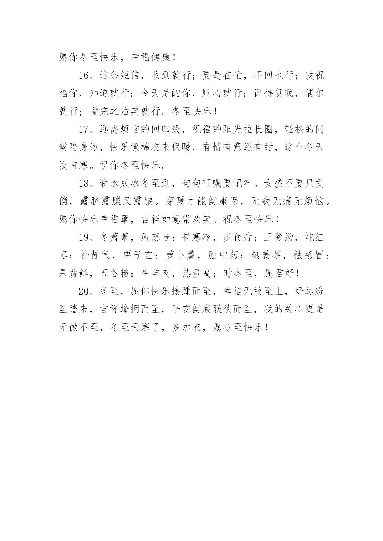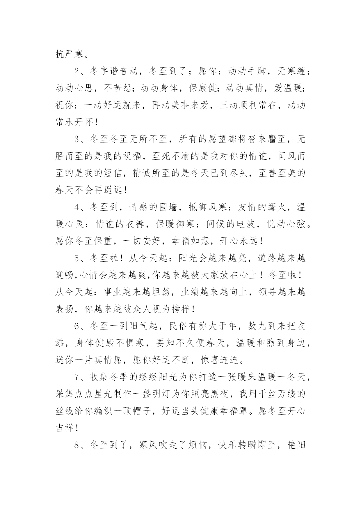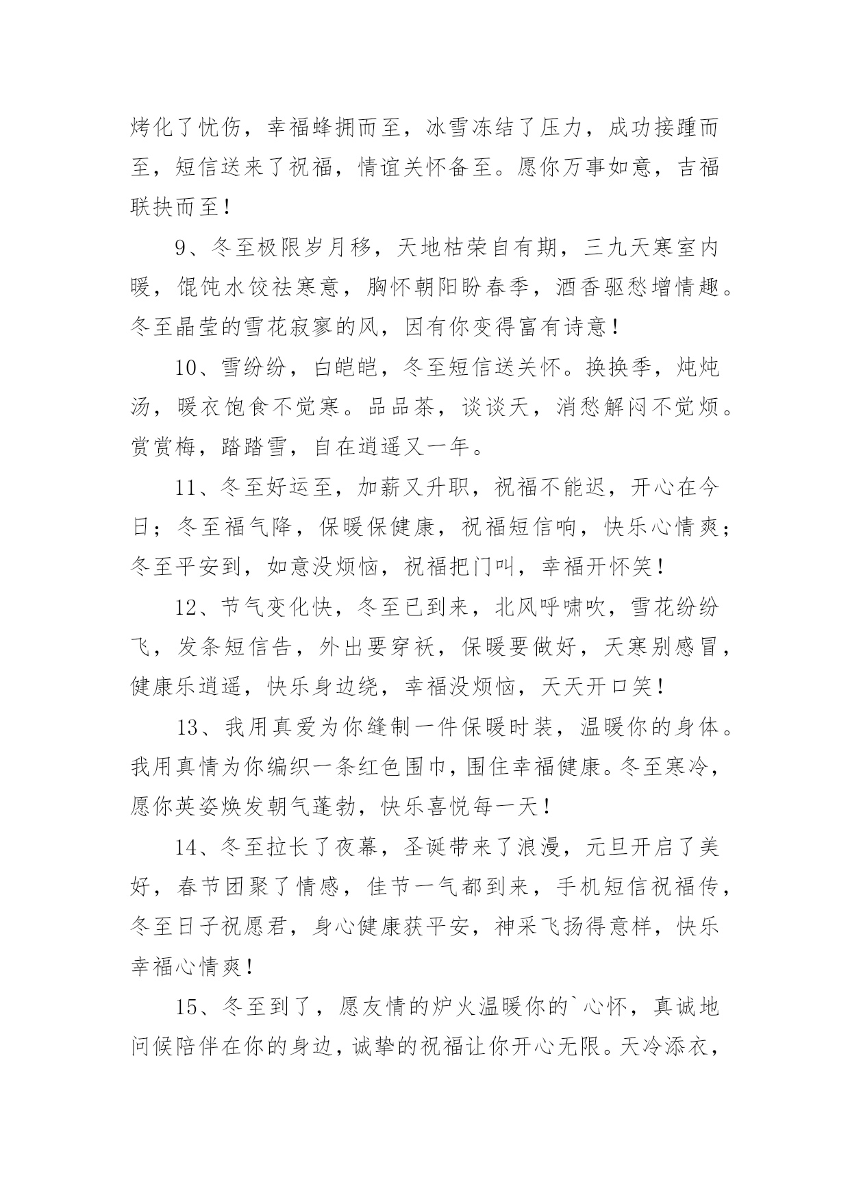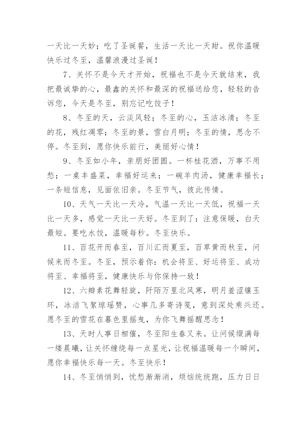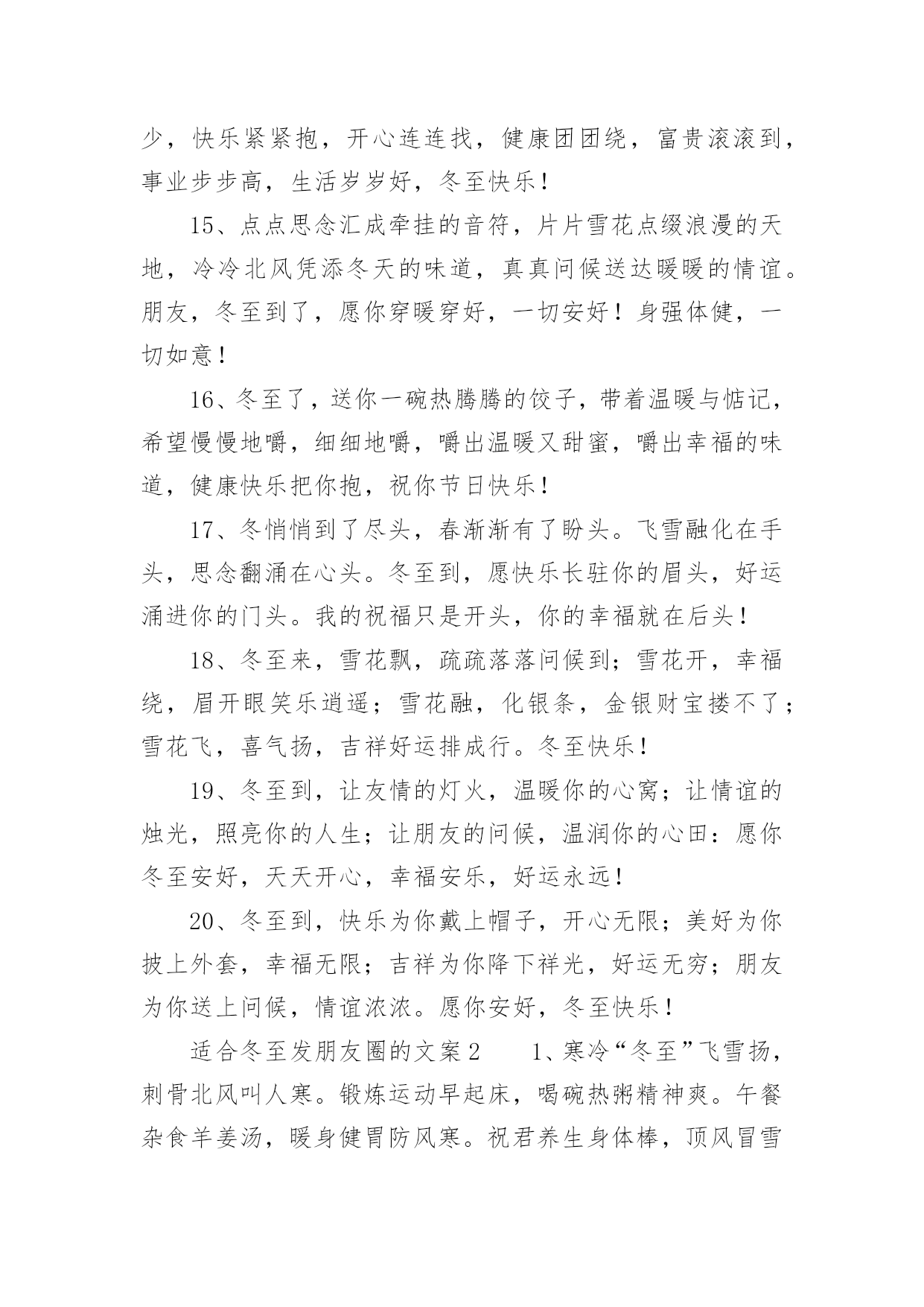 适合冬至发朋友圈的文案适合冬至发朋友圈的文案随着社交网络的兴起和普及,越来越多人钟情于发布文案,文案用以分享自己的生活。那么都有哪些类型的文案呢?以下是小编整理的适合冬至发朋友圈的文案,供大家参考借鉴,希望可以帮助到有需要的朋友。适合冬至发朋友圈的文案11、冬至了,让冬日的暖阳呵护你,心窝暖暖;让熊熊的火炉烘烤你,身安体健;让朋友的问候亲吻你,情浓谊切。愿你冬至安好,幸福永远!2、迎来冬至蕴琼花,香飘万里展芳华,数九寒冬今晨到,水饺汤圆暖万家,山河锦绣舞奇葩,盛世和谐美如画。冬至时节我是你纯洁的雪花,轻轻亲吻你的面颊!3、快乐做皮,幸福做馅,包了一个如意饺,平安做皮,健康做馅,做了一个吉祥汤圆,冬至到了,将这些全部送给你,只愿你浇好运,合家团圆,冬至快乐!4、依门赏雪冬至到,片片雪花似鹅毛。一杯热茗暖心肺,诗情画意身边绕。木桶泡脚添中药,半卷古书乐滔滔。风吹枝摇乱梅影,一缕清香满怀抱。冬至快乐!5、炖一碗浓浓的情谊汤,为你驱驱寒,烫一壶醇醇的快乐酒,为你除除湿,煮一锅香香的幸福饺,为你去去忧,发一条诚诚的.小问候,为你送祝福,冬至到,愿你开心相伴,健康相随,如意相拥。6、吃了冬至饭,白天一天长一线;吃了冬至饺,心情一天比一天妙;吃了圣诞餐,生活一天比一天甜。祝你温暖快乐过冬至,温馨浪漫过圣诞!7、关怀不是今天才开始,祝福也不是今天就结束,我把最诚挚的心,最鑫的关怀和最深的祝福送给您,轻轻的告诉您,今天是冬至,别忘记吃饺子!8、冬至的天,云淡风轻;冬至的心,玉洁冰清;冬至的花,残红凋零;冬至的景,雪白月明;冬至的情,思念不停。冬至到,愿你快乐前行,美丽好心情!9、冬至如小年,亲朋好团圆。一杯桂花酒,万事不用愁;一桌丰盛菜,幸福好运来;一碗羊肉汤,健康幸福长;一条短信息,见面依旧亲。冬至节气,彼此传情。10、天气一天比一天冷,气温一天比一天低,祝福一天比一天多,感觉一天比一天好。冬至到了:注意保暖,白天最短。要吃水饺,温暖每秒。冬至快乐。11、百花开而春至,百川汇而夏至,百草黄而秋至,问候来而冬至。冬至,预示着你:机会将至、好运将至、成功将至、幸福将至,健康快乐与你保持一致!12、六瓣素花舞轻旋,阡陌万里北风寒,明月羞涩镶玉环,冰洁飞絮琼瑶赞,心事几多寄诗笺,意到深处乘兴还。愿冬至的雪花在暮色里摇曳,为你飞舞摇醒思念!13、天时人事日相催,冬至阳生春又来。让问候缀满每一缕晨曦,让关怀缠绕每一点星光,让祝福温暖每一个瞬间,愿你幸福快乐每一天。冬至快乐!14、冬至悄悄到,忧愁渐渐消,烦恼统统跑,压力日日少,快乐紧紧抱,开心连连找,健康团团绕,富贵滚滚到,事业步步高,生活岁岁好,冬至快乐!15、点点思念汇成牵挂的音符,片片雪花点缀浪漫的天地,冷冷北风凭添冬天的味道,真真问候送达暖暖的情谊。朋友,冬至到了,愿你穿暖穿好,一切安好!身强体健,一切如意!16、冬至了,送你一碗热腾腾的饺子,带着温暖与惦记,希望慢慢地嚼,细细地嚼,嚼出温暖又甜蜜,嚼出幸福的味道,健康快乐把你抱,祝你节日快乐!17、冬悄悄到了尽头,春渐渐有了盼头。飞雪融化在手头,思念翻涌在心头。冬至到,愿快乐长驻你的眉头,好运涌进你的门头。我的祝福只是开头,你的幸福就在后头!18、冬至来,雪花飘,疏疏落落问候到;雪花开,幸福绕,眉开眼笑乐逍遥;雪花融,化银条,金银财宝搂不了;雪花飞,喜气扬,吉祥好运排成行。冬至快乐!19、冬至到,让友情的灯火,温暖你的心窝;让情谊的烛光,照亮你的人生;让朋友的问候,温润你的心田:愿你冬至安好,天天开心,幸福安乐,好运永远!20、冬至到,快乐为你戴上帽子,开心无限;美好为你披上外套,幸福无限;吉祥为你降下祥光,好运无穷;朋友为你送上问候,情谊浓浓。愿你安好,冬至快乐!适合冬至发朋友圈的文案21、寒冷“冬至”飞雪扬,刺骨北风叫人寒。锻炼运动早起床,喝碗热粥精神爽。午餐杂食羊姜汤,暖身健胃防风寒。祝君养生身体棒,顶风冒雪抗严寒。2、冬字谐音动,冬至到了;愿你:动动手脚,无寒缠;动动心思,不苦怨;动动身体,保康健;动动真情,爱温暖;祝你:一动好运就来,再动美事来爱,三动顺利常在,动动常乐开怀!3、冬至冬至无所不至,所有的愿望都将沓来麕至,无胫而至的是我的祝福,至死不渝的是我对你的情谊,闻风而至的是我的短信,精诚所至的是冬天已到尽头,至善至美的春天不会再遥远!4、冬至到,情感的围墙,抵御风寒;友情的篝火,温暖心灵;情谊的衣裤,保暖御寒;问候的电波,悦动心弦。愿你冬至保重,一切安好,幸福如意,开心永远!5、冬至啦!从今天起:阳光会越来越亮,道路越来越通畅,心情会越来越爽,你越来越被大家放在心上!冬至啦!从今天起:事业越来越坦荡,业绩越来越向上,领导越来越表扬,你越来越被众人视为榜样!6、冬至一到阳气起,民俗有称大于年,数九到来把衣添,身体健康不惧寒,要知