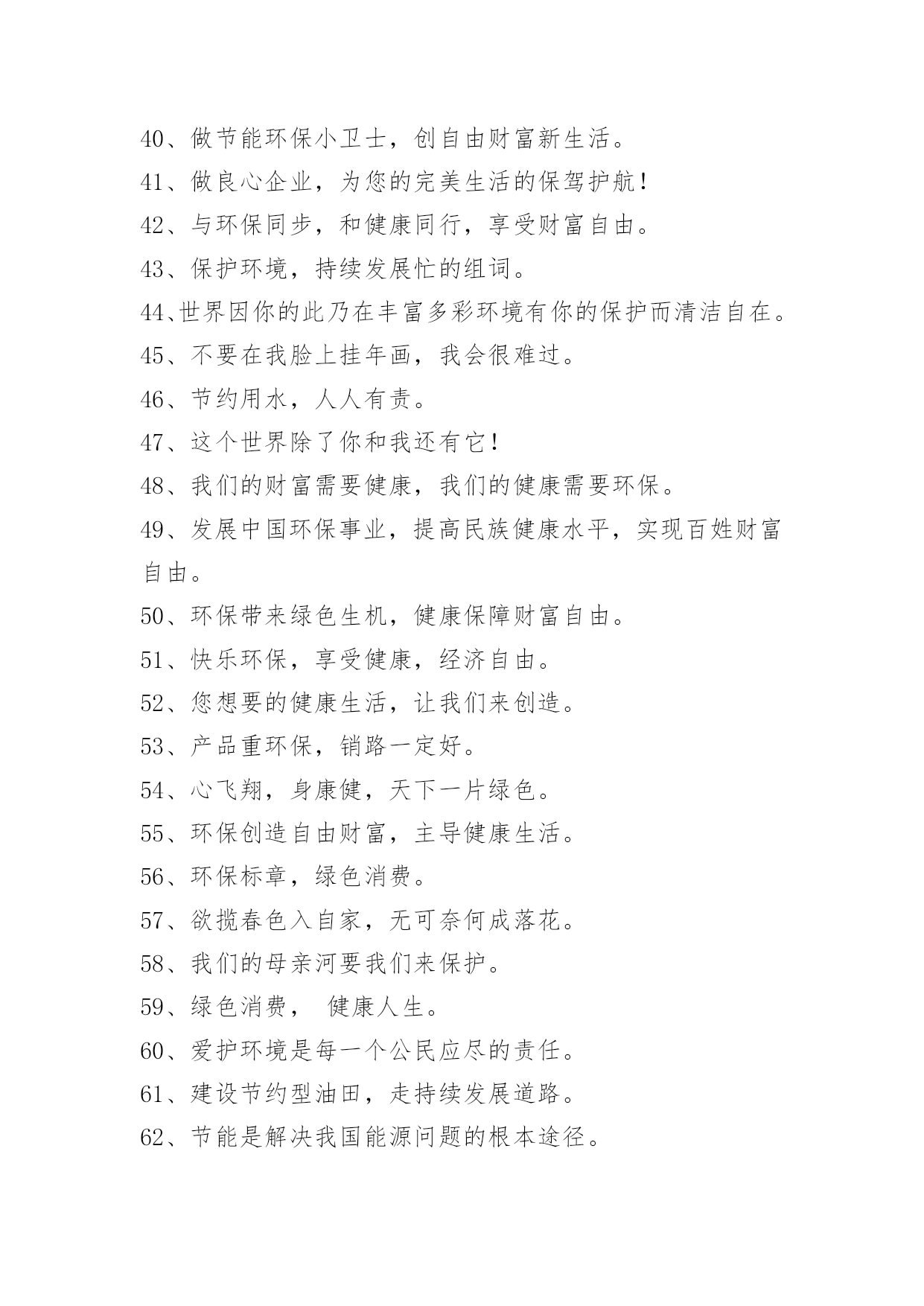 有特色的环保标语2021年有特色的环保标语大集合67条有了您的真心呵护,工厂才会更加美丽。下面是小编整理的有特色的环保标语67条,一起来看一下吧。1、垃圾有家我送它,保护环境你我他。2、创蓝天碧水新城福泽你我他,建文明和谐人居惠及千万家。3、塑造经典装饰,提高人居环境!4、大自然是善良的慈母,同时也是冷酷的屠夫。5、花草树木是朋友,大家都要爱护好。6、有限的资源,无限的利用,垃圾为宝,利国利民!7、水是生命之源,节约用水就是保护环境。8、小草有生命,请君足留情。9、保护环境,人人有责。美丽的环境,离不开大家的维护。10、同享一片蓝天,共创无限和谐。打造一方净土,共享一片蓝天。11、倡树低碳生活,促进人与自然协调发展。12、地球能源有穷时,节能低碳无尽期。13、建设项目务必依法进行环境影响评价。14、用咱们的小手放飞绿色的期望。15、生活垃圾不乱倒,村庄洁净风光好。16、连片整治大发展,农村环境大改善。17、杨柳散和风,青山淡吾虑。18、人人节能,绿色人生。19、建节约型机关,做低碳型表率。20、绿色环保,引领时尚。21、健康新节能,绿色自由风。22、环保生活,健康财富。23、为环保献力,为自己添富。24、健康环保,财富一生。25、分工合作来清扫,相信明天会更好。26、绿色是生命之色,生命呼唤着绿色。保护环境,从我做起。27、共同节约能源,共创美好未来。28、珍惜您用的每一滴水,因为她们是珍稀的生命之源,请爱护我们的地球。29、节能减排人人参与,生态文明家家共享。30、人人关爱美丽城市,个个参与节能减排。31、绿色照明,节约用电。32、低碳生活新时代,节能减排更精彩。33、与节能减排同行,为绿色城市添彩。34、争当节能减排卫士,乐做低碳环保先锋。35、节能减排见行动,低碳城市更闻名。36、低碳让地球,解脱苦难。37、推进节能降耗,强化环境保护。38、种一棵树,就像给地球一份礼物。39、天蓝,海蓝,心也蓝。我们的.智联,我们的环保。40、做节能环保小卫士,创自由财富新生活。41、做良心企业,为您的完美生活的保驾护航!42、与环保同步,和健康同行,享受财富自由。43、保护环境,持续发展忙的组词。44、世界因你的此乃在丰富多彩环境有你的保护而清洁自在。45、不要在我脸上挂年画,我会很难过。46、节约用水,人人有责。47、这个世界除了你和我还有它!48、我们的财富需要健康,我们的健康需要环保。49、发展中国环保事业,提高民族健康水平,实现百姓财富自由。50、环保带来绿色生机,健康保障财富自由。51、快乐环保,享受健康,经济自由。52、您想要的健康生活,让我们来创造。53、产品重环保,销路一定好。54、心飞翔,身康健,天下一片绿色。55、环保创造自由财富,主导健康生活。56、环保标章,绿色消费。57、欲揽春色入自家,无可奈何成落花。58、我们的母亲河要我们来保护。59、绿色消费,健康人生。60、爱护环境是每一个公民应尽的责任。61、建设节约型油田,走持续发展道路。62、节能是解决我国能源问题的根本途径。63、草木——如果我香消玉陨,就无法装扮校园的美丽校园。如果你怜香惜玉,请您给我们一些关爱吧!64、保护环境,道法自然。65、人人关心节能减排,时时注意保护环境。66、全民动员,真抓实干,加快推进绿色生态岱山建设。67、绿化与发展双赢,生态与和谐同行。