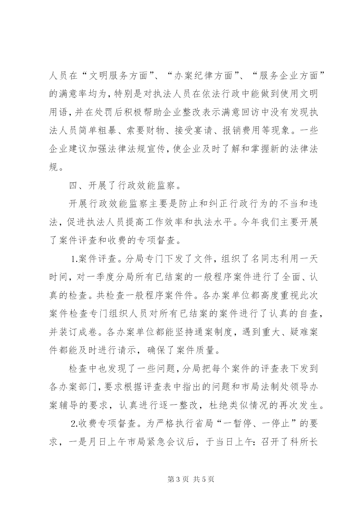 第PAGE\*Arabic\*MERGEFORMAT5页共NUMPAGES\*MERGEFORMAT5页司法局纪检监察工作汇报今年,我局在市局党组、纪检组领导下,以队伍建设为中心,认真落实了党风廉政建设责任制,加强了学习教育,开展了队伍教育整顿,不断加大了监察力度,干部队伍素质有了进一步的提高。现将主要工作汇报如下:一、实行了党风廉政建设责任制。我局根据上级的部署和要求,明确一把手负总责,同时按照“一岗双责”的要求,明确每位班子成员对党风廉政建设所承担的责任。年初,分局局长与市局签订了党风廉政建设责任状,各科科长与分局局长签订了责任状,层层落实,分级负责,权责明确。日常工作中,我局坚持将党风廉政建设与业务工作一起部署,一起检查,一起考核。在开展党风廉政建设过程中,分局领导班子率先垂范,坚持民主集中制原则,定期召开民主生活会,自觉接受监督,发挥了应有的模范带头作用。科(所)长是我们局的中坚力量,是做好各项工作的关键,也是抓党风廉政建设的重点。为此,今年我们加强了对中层干部的考核,成立了由局长室、纪检组、综合科三部门负责人组成的考核小组,制订了考核方案和计划,利用两天的时间召集分局名中层干部逐个谈话,全面了解每人的德、能、勤、绩、廉情况。考核小组在全面综合的基础上,对每名中层干部进行了实是求事的评定,写出了考察报告。二、组织了一系列的学习教育活动。分局在年初即制订了全员学习教育计划和中心组学习计划。通过学习党的十六届四中全会精神、条规知识和邓小平理论、三个代表重要思想,使全体干部做到在政治上合格;通过学习廉洁自律的相关制度规定,让大家自觉加强纪律约束;通过正反两方面的典型教育,做到警钟长鸣。一是组织全体人员到监狱,听取服刑人员的现身说法,教育大家要算好“三笔帐”,即政治账、家庭账、经济账,要提高法律意识,加强世界观、人生观、权力观、价值观的改造。;二是组织全体干部职工学习和观看“两个条例”的资料和辅导录像,进一步了解了两个条例的立法背景、起草过程、主要框架和内容;三是组织了一次两个条例的知识竞赛,从中选拔出三名队员参加市局的竞赛;四是开展了一次专题讨论,在党的生日到来之际,分局在全体党员干部中开展了“如何保持党员干部先锋模范带头作用”的讨论。三、委托区纪工委开展了行政执法回访。为保障行政执法的公平、公正,杜绝不良行政行为,根据省、市局的要求,分局在办案单位自访、纪检组上门访的基础上,于六月份委托区纪工委,对今年以来分局所查办的一般程序案件进行了回访。此次回访采取了发送“征求意见函”的方式,共发出征求意见函封。根据反馈回来的意见函统计,案件当事人对执法人员在“文明服务方面”、“办案纪律方面”、“服务企业方面”的满意率均为,特别是对执法人员在依法行政中能做到使用文明用语,并在处罚后积极帮助企业整改表示满意回访中没有发现执法人员简单粗暴、索要财物、接受宴请、报销费用等现象。一些企业建议加强法律法规宣传,使企业及时了解和掌握新的法律法规。四、开展了行政效能监察。开展行政效能监察主要是防止和纠正行政行为的不当和违法,促进执法人员提高工作效率和执法水平。今年我们主要开展了案件评查和收费的专项督查。⒈案件评查。分局专门下发了文件,组织了名同志利用一天时间,对一季度分局所有已结案的一般程序案件进行了全面、认真的检查。共检查一般程序案件件。各办案单位都高度重视此次案件检查专门组织人员对所有已结案的案件进行了认真的自查,并装订成卷。各办案单位都能坚持通案制度,遇到重大、疑难案件都能及时进行请示,确保了案件质量。检查中也发现了一些问题,分局把每个案件的评查表下发到各办案部门,要求根据评查表中指出的问题和市局法制处领导办案辅导的要求,认真进行逐一整改,杜绝类似情况的再次发生。⒉收费专项督查。为严格执行省局“一暂停、一停止”的要求,一是月日上午市局紧急会议后,于当日上午:召开了科所长会议,及时传达了讲话精神,要求将会议精神于日中午点前传达到每一名干部,将每一名干部的思想都统一到省市局要求上来,增强大家对这项工作重要性、紧迫性的认识。二是决定于月日下午开始,坚决执行省市局提出的“一个停止,一个暂停”的要求。三是对照市纠风办反馈的有关意见,认真进行排查,杜绝乱收费、乱罚款、服务态度差、因业务不熟而不能一口清等违规违纪行为的发生。四是实行层级负责制。各科所负责人对本科所负责,分管局长对分管科所负责,一级抓一级,一级对一级负责,确保分局在收费、行风等方面不出任何问题。五是在收费公示及咨询服务中心的人员、办公场所、收费“三分开”早已统一落实到位的基础上,分局狠抓了督查工作,在市局月日督查以后,分局于月日上午开始进行了多次全面检查。检查人员在分局两个所和监管科年检集中办理场所,随机询问了来年检的企业人员,他们均对收费和服务表示满意。五司法局纪