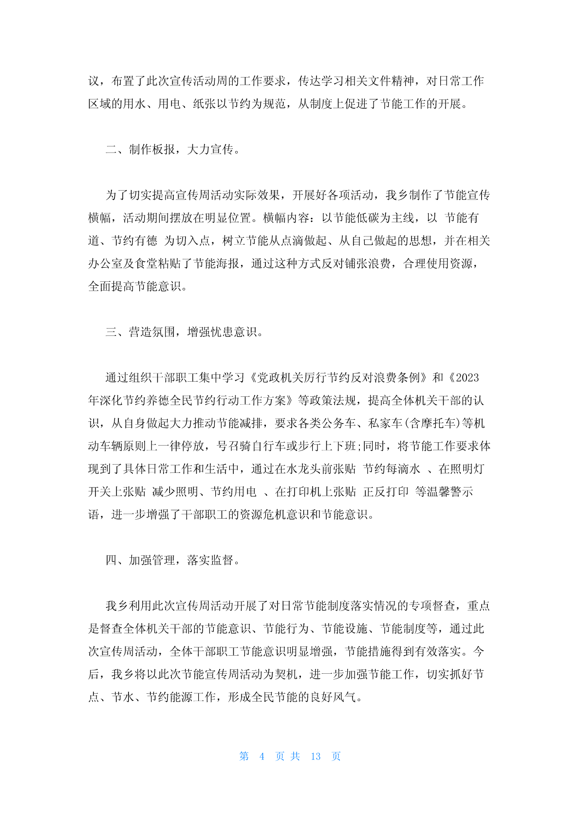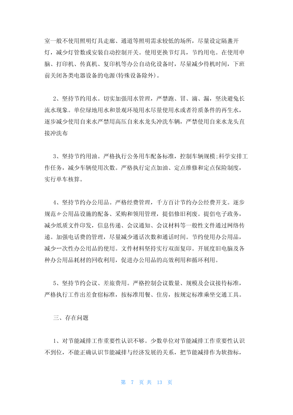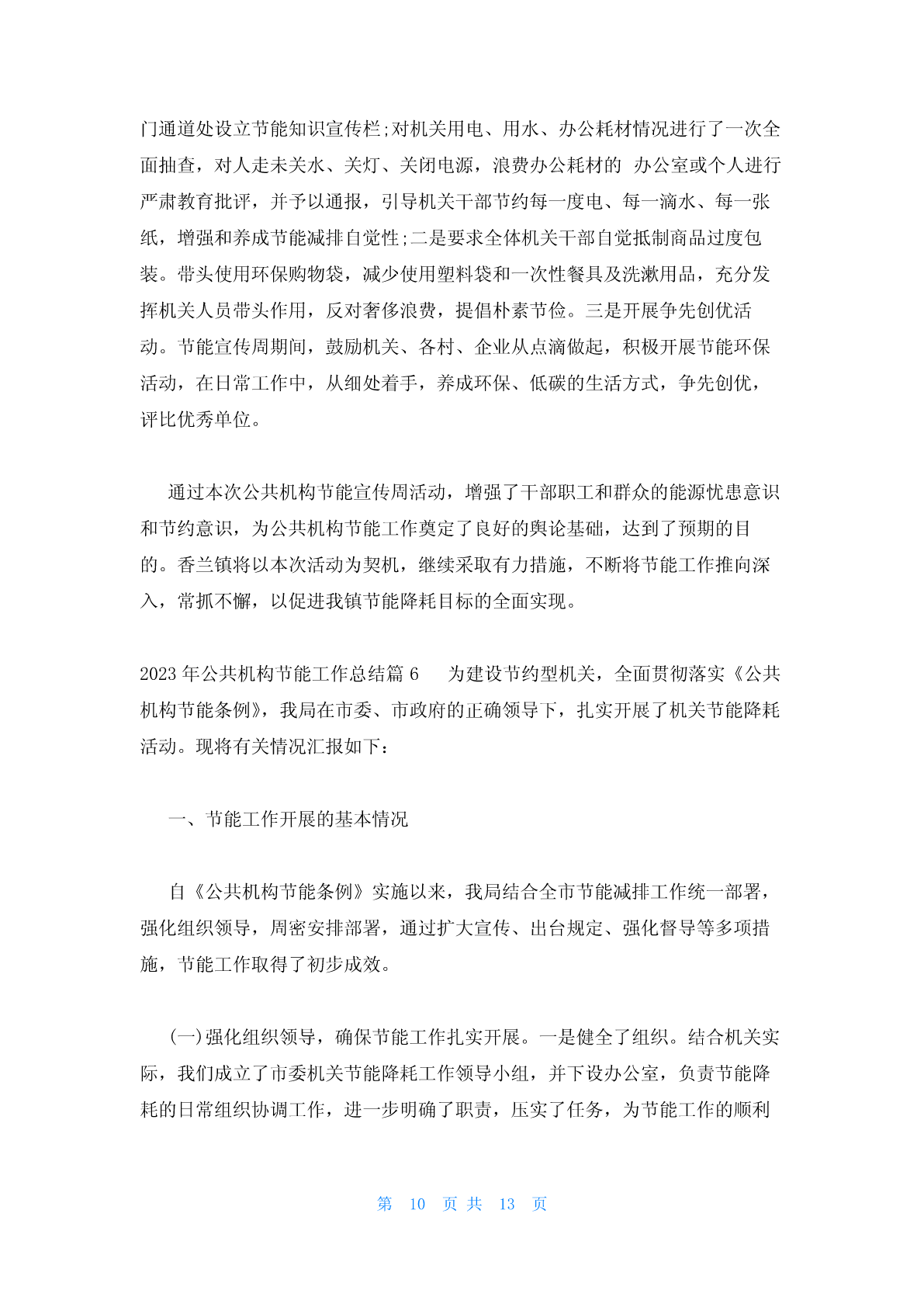 2023年公共机构节能工作总结以下是为大家整理的关于2023年公共机构节能工作总结的文章6篇,欢迎大家参考查阅!2023年公共机构节能工作总结篇1根据市节能办《关于在全市开展xxxx年公共机构节能宣传周活动的通知》(贵公节办〔xxxx〕6号)的文件精神,贵港市信访局结合实际扎实有效地开展各项节能宣传活动。现将活动开展情况总结如下:一、高度重视,加强组织领导成立了由局主要领导任组长,其他局领导为副组长,各科室(中心)负责人为成员的宣传周活动领导小组,为宣传周活动的开展提供了强有力的组织保障。二、紧扣活动主题,多形式宣传(一)制定节能宣传周活动方案为了达到宣传节能效果,制定贵港市信访局xxxx年节能宣传周活动实施方案。把节能降耗工作落在实处,进一步制定了节能减排实施方案,落实了相关责任人、重点工作、节能措施、保障措施等,并对节能指标进行了分解。(二)开展以节能有我、绿色共享、工业低碳发展为主题的宣传活动节能宣传周活动期间,我局紧紧围绕节能有我,绿色共享、工业低碳发展主题,结合信访工作实际,开展了形式多样,丰富多彩的宣传活动。1、展出板报、悬挂和张贴各种宣传标语及宣传画在市信访局办公楼正门口悬挂宣传标语;在办公楼一楼、二楼、三楼等楼道显眼处张贴宣传画。在一楼接访大厅展出以节能有我绿色共享为主题的节能宣传板报,向更多的干部职工及来访群众普及能源资源节约和资源循环利用知识,营造浓厚的节能宣传氛围。通过多形式向干部职工宣传节约用水、用电的重要意义和必要性,号召全体干部职工在工作和生活中积极主动节约用水、用电,提高干部职工节能减排的意识。2、开展各种主题宣传和体验活动一是开展节能低碳主题宣传活动。在节能宣传周期间,以建设生态文明为主线,凝聚社会各界力量,普及生态文明、绿色低碳发展理念,通过群众喜闻乐见的各种宣传形式,普及生态文明理念和知识,引领带动全社会形成崇尚节约节能、绿色消费与低碳环保的社会风尚,倡导绿色化生产生活方式。二是开展低碳日能源紧缺体验活动。6月13日是全国低碳日,当天,我局机关和人民群众来访接访中心办公区域停开空调一天,公共场所停开照明灯一天,办公室、会议室内充分利用自然光,不开或者少开照明灯;办公区域停开电视、电风扇等非办公电器。办公楼、办公室一律停开工作照明灯、空调,饮水机进行定时定点开电供水,做到人离切电。积极响应市提倡的节能措施,以绿色低碳的办公模式和出行方式支持能源紧缺体验日活动。三是开展废旧商品回收利用宣传活动。通过召开会议的形式,向全体干部职工宣传随意丢弃废旧灯管、电池对生态环境和人体健康的危害性,牢固树立保护环境、节约能源与循环利用的思想观念、形成保护环境、人人有责的良好风尚。局机关设置废旧灯管和废旧电池回收箱,鼓励广大干部职工及家属把办公场所、家里的废旧灯管(电池)统一拿到回收点进行处理。(三)建立并完善单位节约用水、用电制度结合单位实际,经局领导决定,制定了单位节约用水、用电制度,对节约用水、用电的总体要求、管理细则、处罚制度等作了详细规定,并安排人员对各科室遵守节约用水、用电管理制度情况进行不定期检查,对检查中发现的问题,视情况给予通报批评、停用空调电扇等不同的惩处措施。三、存在问题及建议由于节能宣传周时间短、内容多,当前,我市信访工作压力大,任务重,我局把工作重心放在全力做好社会矛盾纠纷的排查化解工作上,宣传教育活动方面还留有一些死角。下一步我们将按照节能办的要求,在今后的工作中继续投入更多的人力、物力和财力,加大宣传力度,逐步提高广大干部职工的思想意识,形成绿色生产生活方式,营造崇尚节约、合理消费与低碳环保的社会风尚。2023年公共机构节能工作总结篇22023年6月13日至19日是全国公共机构节能宣传周,根据市政府机关事务管理局《关于全市20xx年公共机构节能宣传周活动安排的通知》的精神,我乡结合工作实际,精密围绕节能有道、节约有德的活动主题,广泛开展节能宣传活动,现将有关情况总结如下。一、领导重视、狠抓落实。6月10日,我乡成立了以宣传委员颜学斌同志为组长的工作专班,围绕节能宣传活动安排,制定了宣传活动方案。6月13日,召开了全体机关干部会议,布置了此次宣传活动周的工作要求,传达学习相关文件精神,对日常工作区域的用水、用电、纸张以节约为规范,从制度上促进了节能工作的开展。二、制作板报,大力宣传。为了切实提高宣传周活动实际效果,开展好各项活动,我乡制作了节能宣传横幅,活动期间摆放在明显位置。横幅内容:以节能低碳为主线,以节能有道、节约有德为切入点,树立节能从点滴做起、从自己