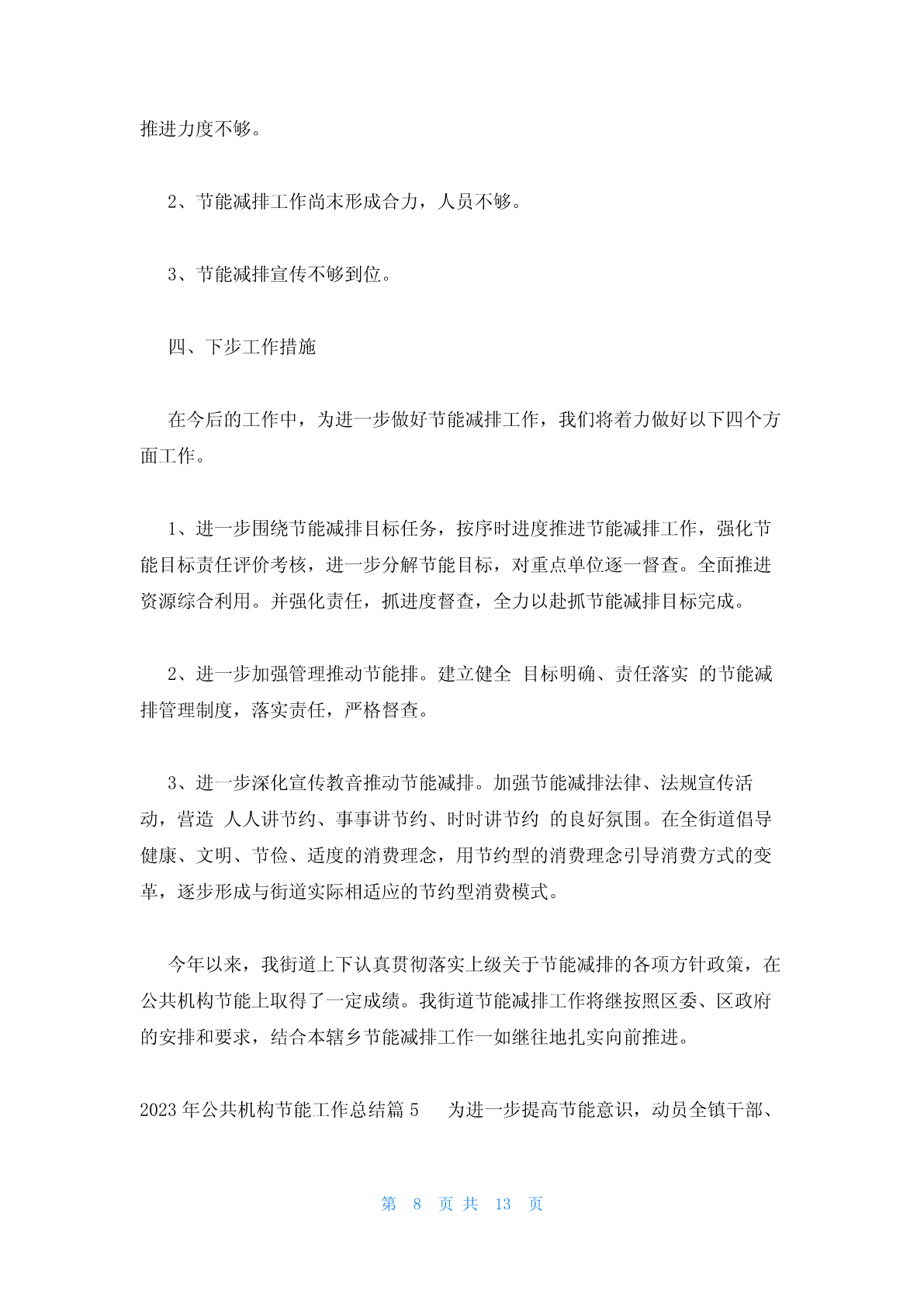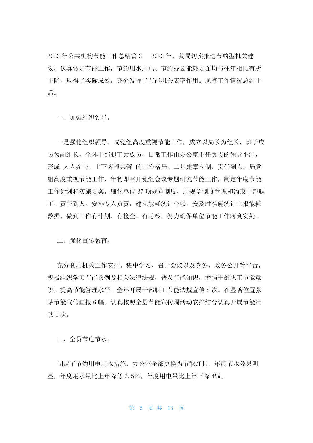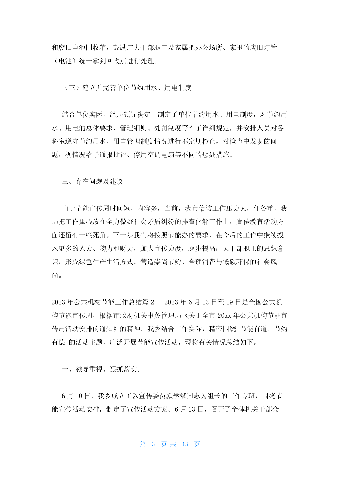 2023年公共机构节能工作总结以下是为大家整理的关于2023年公共机构节能工作总结的文章6篇,欢迎大家参考查阅!2023年公共机构节能工作总结篇1根据市节能办《关于在全市开展xxxx年公共机构节能宣传周活动的通知》(贵公节办〔xxxx〕6号)的文件精神,贵港市信访局结合实际扎实有效地开展各项节能宣传活动。现将活动开展情况总结如下:一、高度重视,加强组织领导成立了由局主要领导任组长,其他局领导为副组长,各科室(中心)负责人为成员的宣传周活动领导小组,为宣传周活动的开展提供了强有力的组织保障。二、紧扣活动主题,多形式宣传(一)制定节能宣传周活动方案为了达到宣传节能效果,制定贵港市信访局xxxx年节能宣传周活动实施方案。把节能降耗工作落在实处,进一步制定了节能减排实施方案,落实了相关责任人、重点工作、节能措施、保障措施等,并对节能指标进行了分解。(二)开展以节能有我、绿色共享、工业低碳发展为主题的宣传活动节能宣传周活动期间,我局紧紧围绕节能有我,绿色共享、工业低碳发展主题,结合信访工作实际,开展了形式多样,丰富多彩的宣传活动。1、展出板报、悬挂和张贴各种宣传标语及宣传画在市信访局办公楼正门口悬挂宣传标语;在办公楼一楼、二楼、三楼等楼道显眼处张贴宣传画。在一楼接访大厅展出以节能有我绿色共享为主题的节能宣传板报,向更多的干部职工及来访群众普及能源资源节约和资源循环利用知识,营造浓厚的节能宣传氛围。通过多形式向干部职工宣传节约用水、用电的重要意义和必要性,号召全体干部职工在工作和生活中积极主动节约用水、用电,提高干部职工节能减排的意识。2、开展各种主题宣传和体验活动一是开展节能低碳主题宣传活动。在节能宣传周期间,以建设生态文明为主线,凝聚社会各界力量,普及生态文明、绿色低碳发展理念,通过群众喜闻乐见的各种宣传形式,普及生态文明理念和知识,引领带动全社会形成崇尚节约节能、绿色消费与低碳环保的社会风尚,倡导绿色化生产生活方式。二是开展低碳日能源紧缺体验活动。6月13日是全国低碳日,当天,我局机关和人民群众来访接访中心办公区域停开空调一天,公共场所停开照明灯一天,办公室、会议室内充分利用自然光,不开或者少开照明灯;办公区域停开电视、电风扇等非办公电器。办公楼、办公室一律停开工作照明灯、空调,饮水机进行定时定点开电供水,做到人离切电。积极响应市提倡的节能措施,以绿色低碳的办公模式和出行方式支持能源紧缺体验日活动。三是开展废旧商品回收利用宣传活动。通过召开会议的形式,向全体干部职工宣传随意丢弃废旧灯管、电池对生态环境和人体健康的危害性,牢固树立保护环境、节约能源与循环利用的思想观念、形成保护环境、人人有责的良好风尚。局机关设置废旧灯管和废旧电池回收箱,鼓励广大干部职工及家属把办公场所、家里的废旧灯管(电池)统一拿到回收点进行处理。(三)建立并完善单位节约用水、用电制度结合单位实际,经局领导决定,制定了单位节约用水、用电制度,对节约用水、用电的总体要求、管理细则、处罚制度等作了详细规定,并安排人员对各科室遵守节约用水、用电管理制度情况进行不定期检查,对检查中发现的问题,视情况给予通报批评、停用空调电扇等不同的惩处措施。三、存在问题及建议由于节能宣传周时间短、内容多,当前,我市信访工作压力大,任务重,我局把工作重心放在全力做好社会矛盾纠纷的排查化解工作上,宣传教育活动方面还留有一些死角。下一步我们将按照节能办的要求,在今后的工作中继续投入更多的人力、物力和财力,加大宣传力度,逐步提高广大干部职工的思想意识,形成绿色生产生活方式,营造崇尚节约、合理消费与低碳环保的社会风尚。2023年公共机构节能工作总结篇22023年6月13日至19日是全国公共机构节能宣传周,根据市政府机关事务管理局《关于全市20xx年公共机构节能宣传周活动安排的通知》的精神,我乡结合工作实际,精密围绕节能有道、节约有德的活动主题,广泛开展节能宣传活动,现将有关情况总结如下。一、领导重视、狠抓落实。6月10日,我乡成立了以宣传委员颜学斌同志为组长的工作专班,围绕节能宣传活动安排,制定了宣传活动方案。6月13日,召开了全体机关干部会议,布置了此次宣传活动周的工作要求,传达学习相关文件精神,对日常工作区域的用水、用电、纸张以节约为规范,从制度上促进了节能工作的开展。二、制作板报,大力宣传。为了切实提高宣传周活动实际效果,开展好各项活动,我乡制作了节能宣传横幅,活动期间摆放在明显位置。横幅内容:以节能低碳为主线,以节能有道、节约有德为切入点,树立节能从点滴做起、从自己