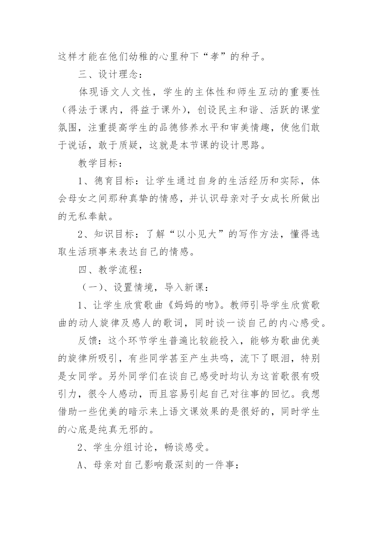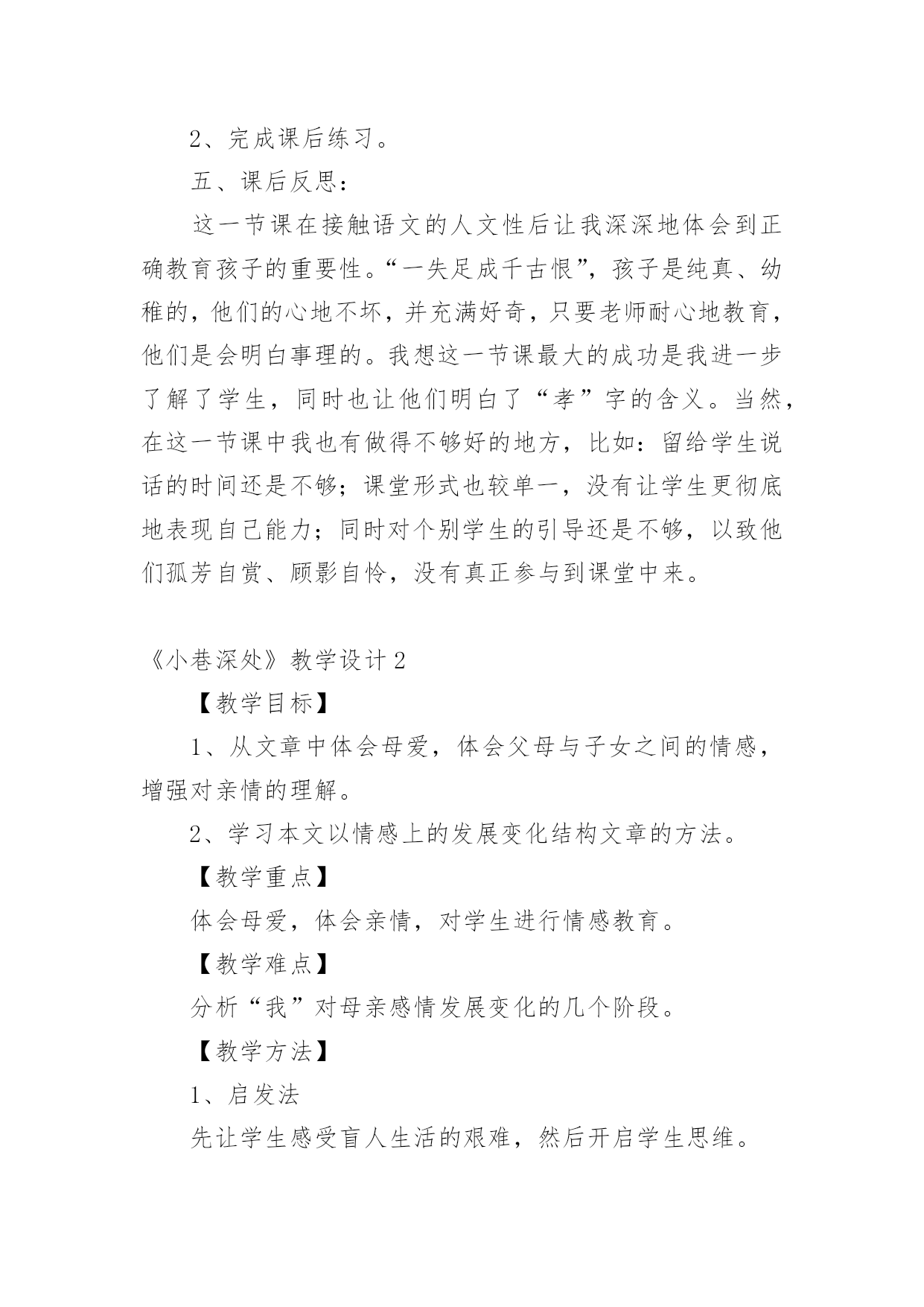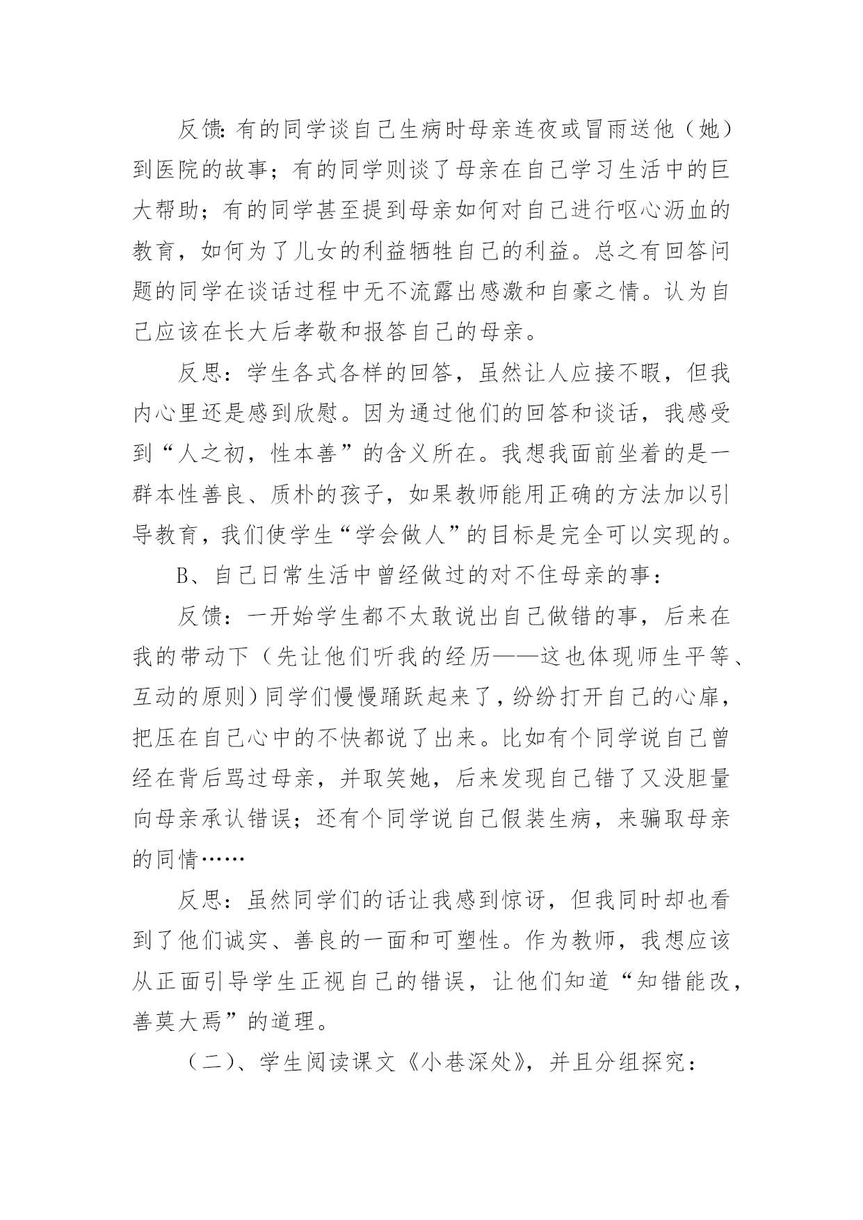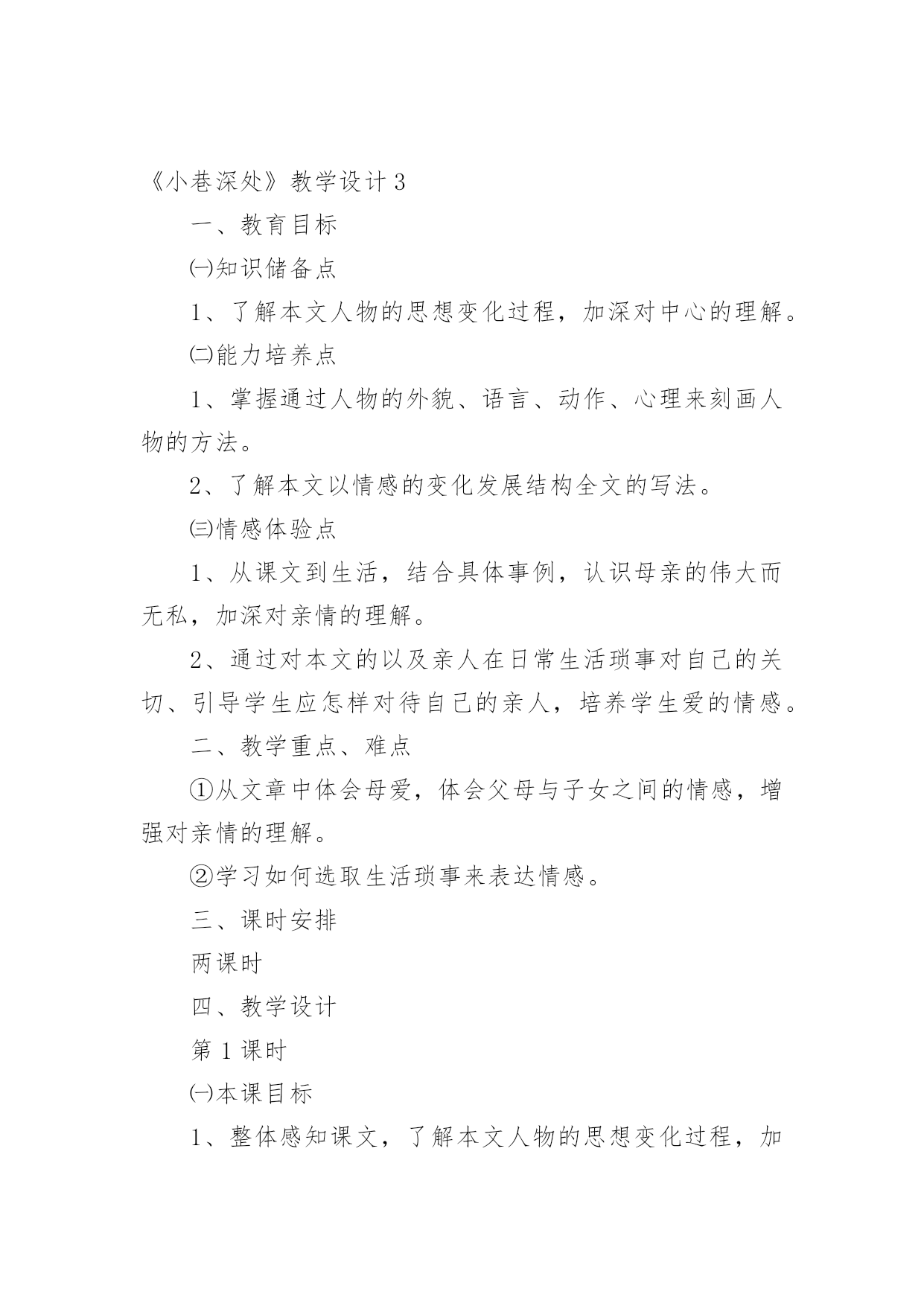 《小巷深处》教学设计《小巷深处》教学设计9篇作为一名人民教师,就有可能用到教学设计,教学设计是一个系统化规划教学系统的过程。写教学设计需要注意哪些格式呢?以下是小编为大家整理的《小巷深处》教学设计,欢迎阅读与收藏。《小巷深处》教学设计1一、教材分析:这篇课文是语文出版社,七年级上册的第六课,是一篇回忆性的抒情散文,抒发了养母对“我”深切的爱和“我”对养母的感情。文章富有感染力,很适合初中生学习。它的语言浅显明了,但情感内涵丰富,可以通过此文教育学生尊敬和爱戴自己的母亲。教学重点、难点:1、体会母爱的无私和伟大,加深儿女对母亲的理解;2、学习如何选取生活琐事来表达自己的内心情感。二、学生分析:学生刚离家到学校念书不久,普遍都有思乡、思家、思亲情结。特别是思念自己的母亲。但是他们又搞不懂自己离不开母亲的真正原因。这正是学生的天真幼稚之处,也是为人处世肤浅的一面。他们的真情需要熏陶、需要教育,只有这样才能在他们幼稚的心里种下“孝”的种子。三、设计理念:体现语文人文性,学生的主体性和师生互动的重要性(得法于课内,得益于课外),创设民主和谐、活跃的课堂氛围,注重提高学生的品德修养水平和审美情趣,使他们敢于说话,敢于质疑,这就是本节课的设计思路。教学目标:1、德育目标:让学生通过自身的生活经历和实际,体会母女之间那种真挚的情感,并认识母亲对子女成长所做出的无私奉献。2、知识目标:了解“以小见大”的写作方法,懂得选取生活琐事来表达自己的情感。四、教学流程:(一)、设置情境,导入新课:1、让学生欣赏歌曲《妈妈的吻》。教师引导学生欣赏歌曲的动人旋律及感人的歌词,同时谈一谈自己的内心感受。反馈:这个环节学生普遍比较能投入,能够为歌曲优美的旋律所吸引,有些同学甚至产生共鸣,流下了眼泪,特别是女同学。另外同学们在谈自己感受时均认为这首歌很有吸引力,很令人感动,而且容易引起自己对往事的回忆。我想借助一些优美的暗示来上语文课效果的是很好的,同时学生的心底是纯真无邪的。2、学生分组讨论,畅谈感受。A、母亲对自己影响最深刻的一件事:反馈:有的同学谈自己生病时母亲连夜或冒雨送他(她)到医院的故事;有的同学则谈了母亲在自己学习生活中的巨大帮助;有的同学甚至提到母亲如何对自己进行呕心沥血的教育,如何为了儿女的利益牺牲自己的利益。总之有回答问题的同学在谈话过程中无不流露出感激和自豪之情。认为自己应该在长大后孝敬和报答自己的母亲。反思:学生各式各样的回答,虽然让人应接不暇,但我内心里还是感到欣慰。因为通过他们的回答和谈话,我感受到“人之初,性本善”的含义所在。我想我面前坐着的是一群本性善良、质朴的孩子,如果教师能用正确的方法加以引导教育,我们使学生“学会做人”的目标是完全可以实现的。B、自己日常生活中曾经做过的对不住母亲的事:反馈:一开始学生都不太敢说出自己做错的事,后来在我的带动下(先让他们听我的经历——这也体现师生平等、互动的原则)同学们慢慢踊跃起来了,纷纷打开自己的心扉,把压在自己心中的不快都说了出来。比如有个同学说自己曾经在背后骂过母亲,并取笑她,后来发现自己错了又没胆量向母亲承认错误;还有个同学说自己假装生病,来骗取母亲的同情……反思:虽然同学们的话让我感到惊讶,但我同时却也看到了他们诚实、善良的一面和可塑性。作为教师,我想应该从正面引导学生正视自己的错误,让他们知道“知错能改,善莫大焉”的道理。(二)、学生阅读课文《小巷深处》,并且分组探究:1、课文中的“小莉”是如何对待自己的母亲的?(主要通过哪些描写)2、应如何评价她的这种行为?反馈:对于第一个问题,学生们的讨论相对活跃,但是回答的答案比较统一。一般是:喜欢→反感→讨厌→感动。学生能够较全面地去发现问题。而对于第二个问题,学生们则由讨论转化为争论,主要形成两种观点:1、对“小莉”的行为应持批评态度,因为她忘恩负义,没有尽到做女儿的责任,对不起自己的养母;2、认为“小莉”的做法值得同情,可以理解。因为她是一个被捡来的孩子,有自卑的一面。同时她还是一个孩子,是老师、家长没有教育好她。而且她知错能改的做法也是值得表扬的。反思:暂且不管谁对谁错,就这一环节同学们的表现来说,已经达到了“学生为主体”的教学目标。另外,我们也发现了学生自身拥有的人文性。这便是语文教学最需要,也是我们一直在寻找的。我想如果能以此为基点,紧紧结合课改新理念,我们的语文教育一定会取得突破性的进展。给学生多一些思考、说话的空间和时间,多走近学生、了解学生,和他们一起学习、一起探究,这应该成为语文老师的一种习惯。(三)、布置作业:1、调查自己母亲的生日并准备祝贺方式(写一写自己的设想);2、完成课后练习。五、课后反思:这一节课在接触语文的人文性后让我深深地体会到正确教育孩子的重要性。“一失足成千古恨”,孩子是纯真、幼稚的,他们的心地不坏,
