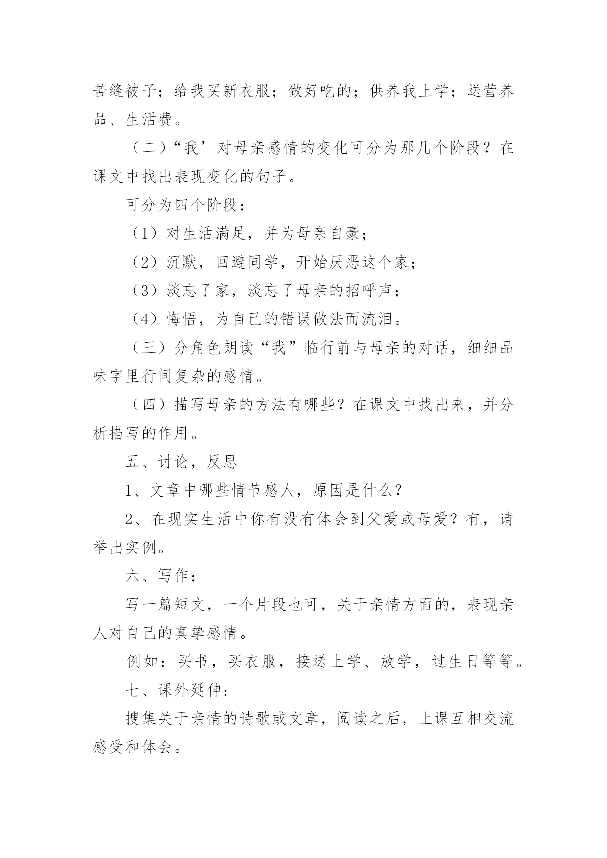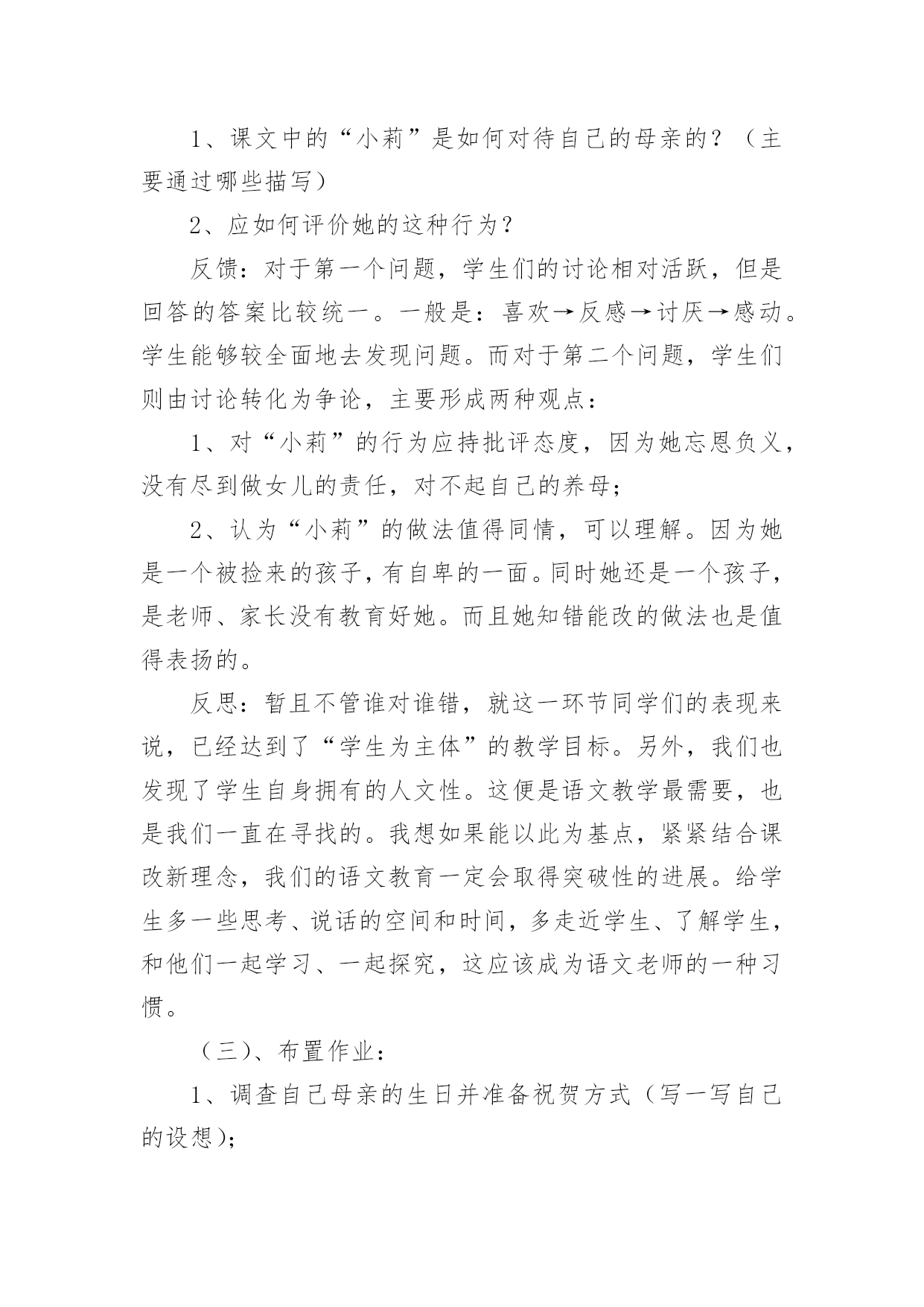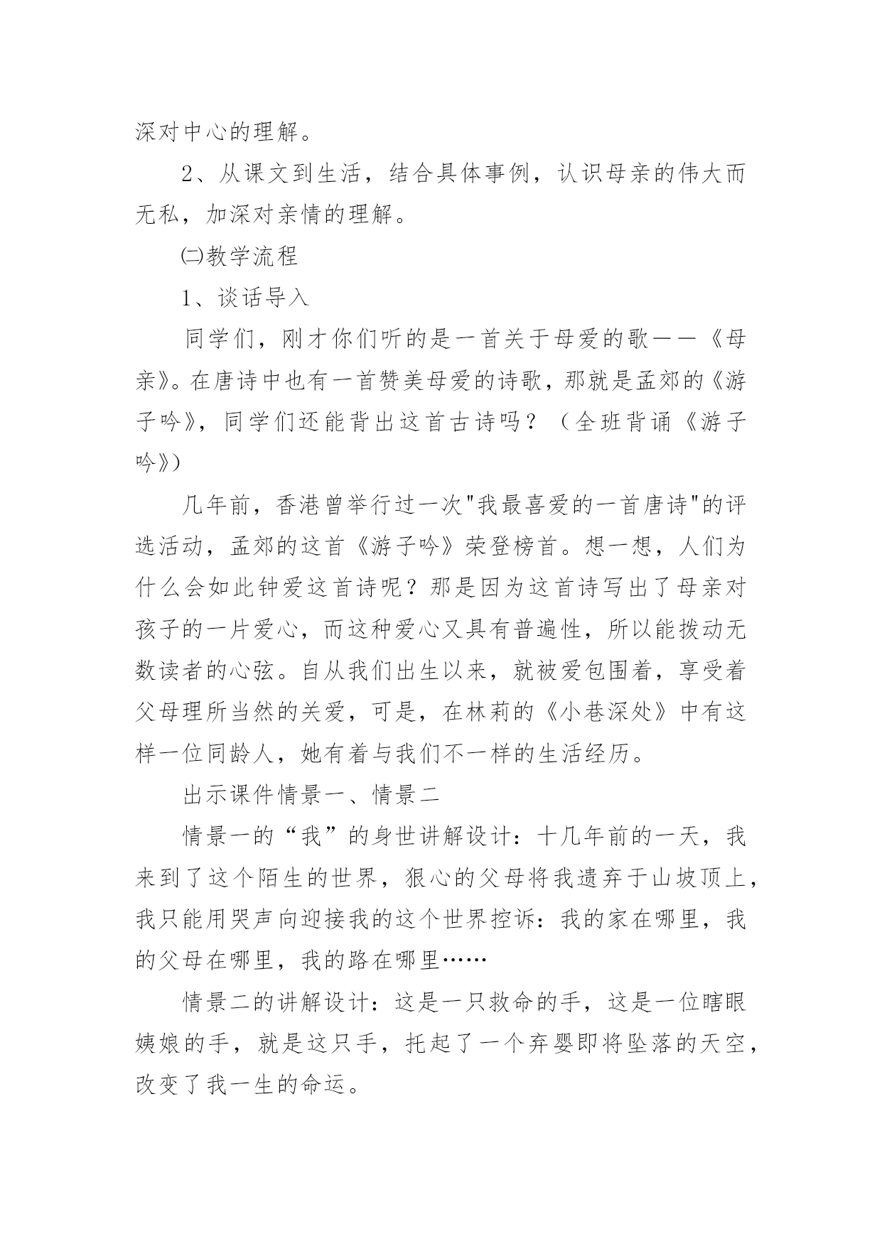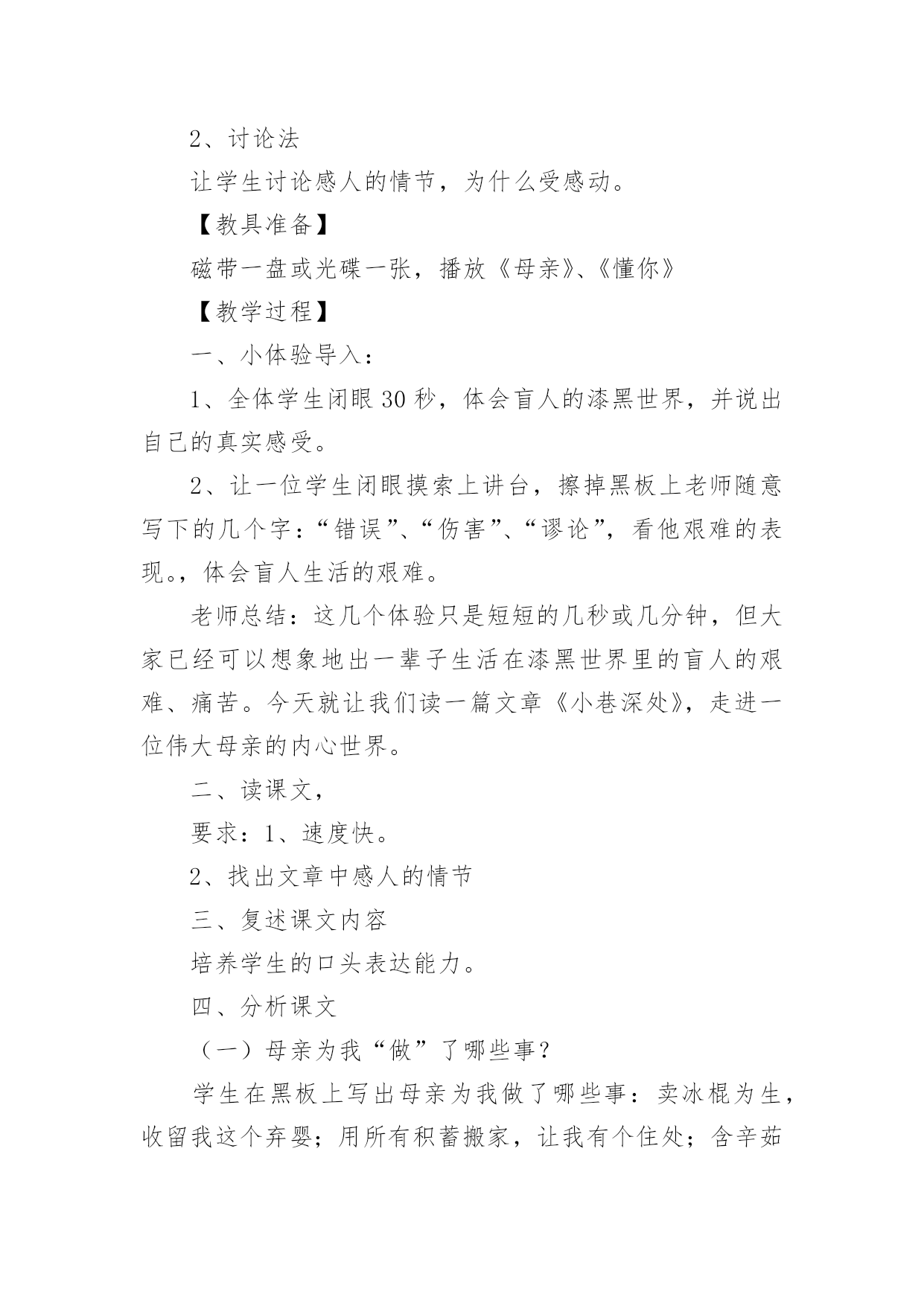 《小巷深处》教学设计《小巷深处》教学设计9篇作为一名人民教师,就有可能用到教学设计,教学设计是一个系统化规划教学系统的过程。写教学设计需要注意哪些格式呢?以下是小编为大家整理的《小巷深处》教学设计,欢迎阅读与收藏。《小巷深处》教学设计1一、教材分析:这篇课文是语文出版社,七年级上册的第六课,是一篇回忆性的抒情散文,抒发了养母对“我”深切的爱和“我”对养母的感情。文章富有感染力,很适合初中生学习。它的语言浅显明了,但情感内涵丰富,可以通过此文教育学生尊敬和爱戴自己的母亲。教学重点、难点:1、体会母爱的无私和伟大,加深儿女对母亲的理解;2、学习如何选取生活琐事来表达自己的内心情感。二、学生分析:学生刚离家到学校念书不久,普遍都有思乡、思家、思亲情结。特别是思念自己的母亲。但是他们又搞不懂自己离不开母亲的真正原因。这正是学生的天真幼稚之处,也是为人处世肤浅的一面。他们的真情需要熏陶、需要教育,只有这样才能在他们幼稚的心里种下“孝”的种子。三、设计理念:体现语文人文性,学生的主体性和师生互动的重要性(得法于课内,得益于课外),创设民主和谐、活跃的课堂氛围,注重提高学生的品德修养水平和审美情趣,使他们敢于说话,敢于质疑,这就是本节课的设计思路。教学目标:1、德育目标:让学生通过自身的生活经历和实际,体会母女之间那种真挚的情感,并认识母亲对子女成长所做出的无私奉献。2、知识目标:了解“以小见大”的写作方法,懂得选取生活琐事来表达自己的情感。四、教学流程:(一)、设置情境,导入新课:1、让学生欣赏歌曲《妈妈的吻》。教师引导学生欣赏歌曲的动人旋律及感人的歌词,同时谈一谈自己的内心感受。反馈:这个环节学生普遍比较能投入,能够为歌曲优美的旋律所吸引,有些同学甚至产生共鸣,流下了眼泪,特别是女同学。另外同学们在谈自己感受时均认为这首歌很有吸引力,很令人感动,而且容易引起自己对往事的回忆。我想借助一些优美的暗示来上语文课效果的是很好的,同时学生的心底是纯真无邪的。2、学生分组讨论,畅谈感受。A、母亲对自己影响最深刻的一件事:反馈:有的同学谈自己生病时母亲连夜或冒雨送他(她)到医院的故事;有的同学则谈了母亲在自己学习生活中的巨大帮助;有的同学甚至提到母亲如何对自己进行呕心沥血的教育,如何为了儿女的利益牺牲自己的利益。总之有回答问题的同学在谈话过程中无不流露出感激和自豪之情。认为自己应该在长大后孝敬和报答自己的母亲。反思:学生各式各样的回答,虽然让人应接不暇,但我内心里还是感到欣慰。因为通过他们的回答和谈话,我感受到“人之初,性本善”的含义所在。我想我面前坐着的是一群本性善良、质朴的孩子,如果教师能用正确的方法加以引导教育,我们使学生“学会做人”的目标是完全可以实现的。B、自己日常生活中曾经做过的对不住母亲的事:反馈:一开始学生都不太敢说出自己做错的事,后来在我的带动下(先让他们听我的经历——这也体现师生平等、互动的原则)同学们慢慢踊跃起来了,纷纷打开自己的心扉,把压在自己心中的不快都说了出来。比如有个同学说自己曾经在背后骂过母亲,并取笑她,后来发现自己错了又没胆量向母亲承认错误;还有个同学说自己假装生病,来骗取母亲的同情……反思:虽然同学们的话让我感到惊讶,但我同时却也看到了他们诚实、善良的一面和可塑性。作为教师,我想应该从正面引导学生正视自己的错误,让他们知道“知错能改,善莫大焉”的道理。(二)、学生阅读课文《小巷深处》,并且分组探究:1、课文中的“小莉”是如何对待自己的母亲的?(主要通过哪些描写)2、应如何评价她的这种行为?反馈:对于第一个问题,学生们的讨论相对活跃,但是回答的答案比较统一。一般是:喜欢→反感→讨厌→感动。学生能够较全面地去发现问题。而对于第二个问题,学生们则由讨论转化为争论,主要形成两种观点:1、对“小莉”的行为应持批评态度,因为她忘恩负义,没有尽到做女儿的责任,对不起自己的养母;2、认为“小莉”的做法值得同情,可以理解。因为她是一个被捡来的孩子,有自卑的一面。同时她还是一个孩子,是老师、家长没有教育好她。而且她知错能改的做法也是值得表扬的。反思:暂且不管谁对谁错,就这一环节同学们的表现来说,已经达到了“学生为主体”的教学目标。另外,我们也发现了学生自身拥有的人文性。这便是语文教学最需要,也是我们一直在寻找的。我想如果能以此为基点,紧紧结合课改新理念,我们的语文教育一定会取得突破性的进展。给学生多一些思考、说话的空间和时间,多走近学生、了解学生,和他们一起学习、一起探究,这应该成为语文老师的一种习惯。(三)、布置作业:1、调查自己母亲的生日并准备祝贺方式(写一写自己的设想);2、完成课后练习。五、课后反思:这一节课在接触语文的人文性后让我深深地体会到正确教育孩子的重要性。“一失足成千古恨”,孩子是纯真、幼稚的,他们的心地不坏,