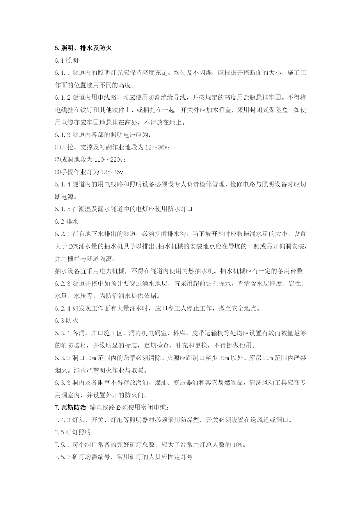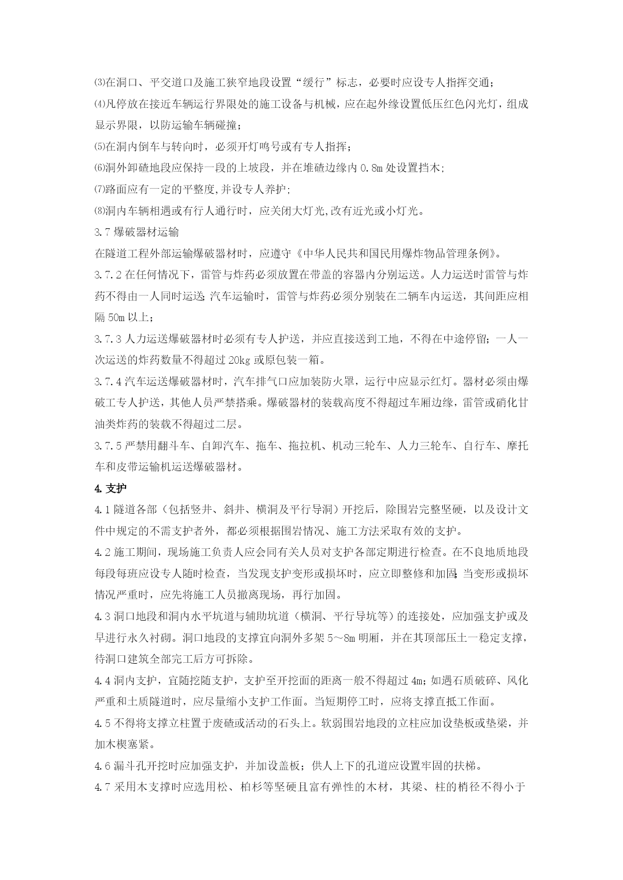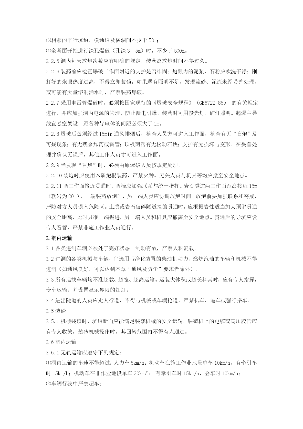 中交一公局天大高速四标隧道施工安全技术交底为了提高高工人的安全意识,使工程顺利进行,我项目部特制定以下隧道施工安全技术交底。希望有关人员严格遵守各项规章制度及安全操作规程,不违章作业和伤害他人:1、一般规定1.1.施工场地应作出详细的部署和安置,出碴、进料及材料堆放场地应妥善布置,弃碴场地应设置在不堵塞河流、不污染环境、不毁坏农田的地段。对风、水、电等设施作出统一安排,并在进洞前基本完成。1.2.进洞前应先作好洞口工程,稳定好洞口的边坡和仰坡,作出天沟、边沟等排水设施,确保地表水不致危及隧道的施工安全。1.3.隧道施工的各班组间,应建立完善的交接班制度,并将施工、安全等情况记载于交接班的记录簿内,工地值班负责人应认真检查交接班情况。1.4.所有进入隧道工地的人员,必须按规定配带安全防护用品,遵章守纪,听从指挥。1.5.遇有不良地质地段施工时,应按照先治水、短开挖、弱爆破、强支护、早衬砌的原则稳步前进。如设计文件中指明有不良地质情况时,必要时应进行超前钻孔,探明情况,采取预防措施。2.开挖、凿孔及爆破2.1开挖及凿孔开挖人员到达工作地点时,应首先检查工作面是否处于安全状态,并检查支护是否牢固,顶板和两帮是否稳定,如有松动的石、土块或裂缝应先予以清除或支护。2.1.2人工开挖土质隧道时,操作人员必须互相配合,并保持必要的安全操作距离。2.1.3机械凿岩时,宜采用湿式凿岩机或带有捕尘器的凿岩机。2.1.4站在碴堆上作业时,应注意碴堆的稳定,防止滑坍伤人。2.1.5风钻钻眼时,应先检查机身、螺栓、卡套、弹簧和支架是否正常完好;管子接头是否牢固,有无漏风;钻杆有无不直、带伤以及钻孔堵塞现象;湿式凿岩机的供水是否正常;干式凿岩机的捕尘设施是否良好。不合要求者应予修理或更换。2.1.6带支架的风钻钻眼时,必须将支架安置稳妥。风钻卡钻时应用板钳松动拔出,不可敲打,未关风前不得拆除钻杆。2.1.7在工作面内不得拆卸、修理风、电钻。2.1.8严禁在残眼中继续钻眼。2.2爆破2.2.1装药与钻孔不宜平行作业。爆破作业和爆破器材加工人员严禁穿着化纤衣物。2.2.4进行爆破时,所有人员应撤离现场,其安全距离为:⑴独头巷道不少于200m;⑵相邻的上下坑道内不少于100m;⑶相邻的平行坑道,横通道及横洞间不少于50m;⑷全断面开挖进行深孔爆破(孔深3—5m)时,不少于500m。2.2.5洞内每天放炮次数应有明确的规定,装药离放炮时间不得过久。2.2.6装药前应检查爆破工作面附近的支护是否牢固;炮眼内的泥浆,石粉应吹洗干净;刚打好的炮眼热度过高,不得立即装药。如果遇有照明不足,发现流砂、泥流未经妥善处理,或可能有大量溶洞涌水时,严禁装药爆破。2.2.7采用电雷管爆破时,必须按国家现行的《爆破安全规程》(GB6722-86)的有关规定进行,并应加强洞内电源的管理,防止漏电引爆。装药时可用投光灯、矿灯照明。起爆主导线宜悬空架设,距各种导电体的间距必须大于1m。2.2.8爆破后必须经过15min通风排烟后,检查人员方可进入工作面,检查有无“盲炮”及可疑现象;有无残余炸药或雷管;顶板两帮有无松动石块;支护有无损坏与变形。在妥善处理并确认无误后,其他工作人员才可进入工作面。2.2.9当发现“盲炮”时,必须由原爆破人员按规定处理。2.2.10装炮时应使用木质炮棍装药,严禁火种。无关人员与机具等均应撤至安全地点。2.2.11两工作面接近贯通时,两端应加强联系与统一指挥。岩石隧道两工作面距离接近15m(软岩为20m),一端装药放炮时,另一端人员应协调放炮时间。放炮前要加强联系和警戒,严防对方人员误入危险区。土质或岩石破碎隧道接的贯通时,应根据岩性适当加大预留贯通的安全距离,此时只准一端掘进,另一端人员和机具应撤离至安全地点。贯通后的导坑应设专人看管,严禁非施工作业人员通行。3.洞内运输3.1各类进洞车辆必须处于完好状态,制动有效,严禁人料混载。3.2进洞的各类机械与车辆,宜选用带净化装置的柴油机动力,燃烧汽油的车辆和机械不得进洞(如通风良好,可以达到本章“通风及防尘”要求者除外)。3.3所有运载车辆均不准超载、超宽、超高运输。运装大体积或超长料具时,应有专人指挥,专车运输,并设置显示界限的红灯。3.4进出隧道的人员应走人行道,不得与机械或车辆抢道,严禁扒车、追车或强行搭车。3.5装碴3.5.1机械装碴时,坑道断面应能满足装载机械的安全运转,装碴机上的电缆或高压胶管应有专人收放,装碴机械操作时,其回转范围内不得有人通过。3.6洞内运输3.6.1无轨运输应遵守下列规定:⑴洞内运输的车速不得超过:人力车5km/h;机动车在施工作业地段单车10km/h,有牵引车时15km/h;机动车在非作业地段单车20km/h,有牵引车时15km/h,会车时10km/h;⑵车辆行驶中严禁超