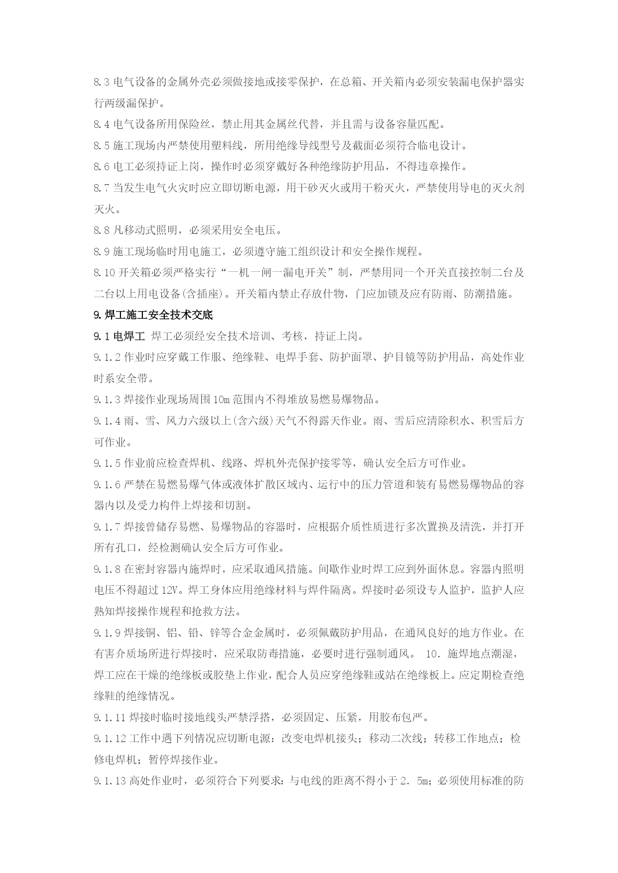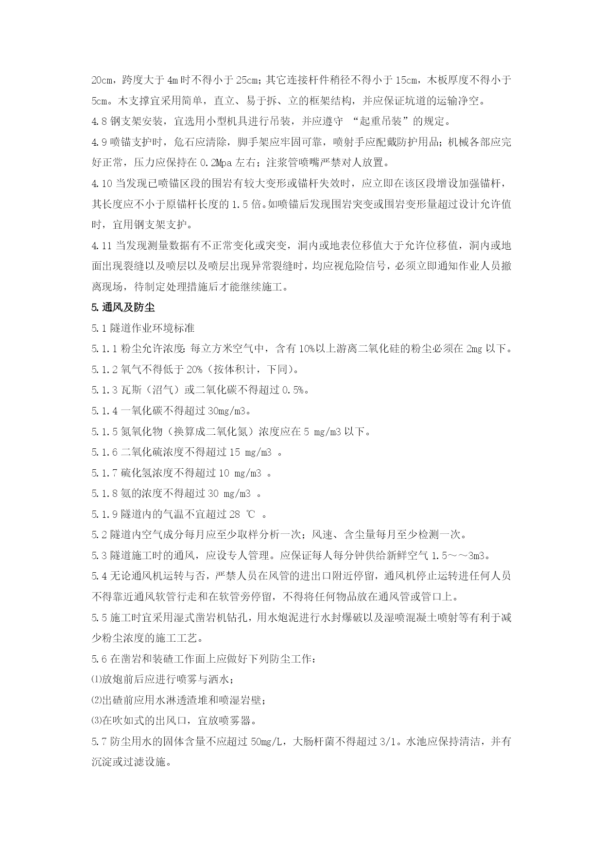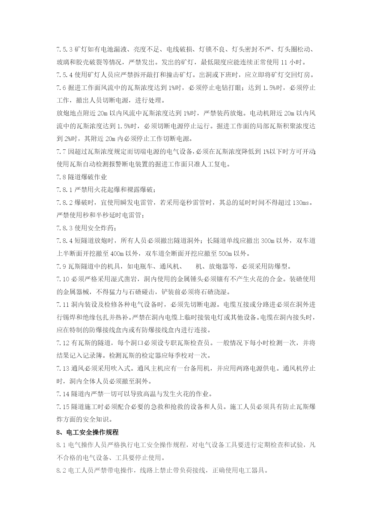 中交一公局天大高速四标隧道施工安全技术交底为了提高高工人的安全意识,使工程顺利进行,我项目部特制定以下隧道施工安全技术交底。希望有关人员严格遵守各项规章制度及安全操作规程,不违章作业和伤害他人:1、一般规定1.1.施工场地应作出详细的部署和安置,出碴、进料及材料堆放场地应妥善布置,弃碴场地应设置在不堵塞河流、不污染环境、不毁坏农田的地段。对风、水、电等设施作出统一安排,并在进洞前基本完成。1.2.进洞前应先作好洞口工程,稳定好洞口的边坡和仰坡,作出天沟、边沟等排水设施,确保地表水不致危及隧道的施工安全。1.3.隧道施工的各班组间,应建立完善的交接班制度,并将施工、安全等情况记载于交接班的记录簿内,工地值班负责人应认真检查交接班情况。1.4.所有进入隧道工地的人员,必须按规定配带安全防护用品,遵章守纪,听从指挥。1.5.遇有不良地质地段施工时,应按照先治水、短开挖、弱爆破、强支护、早衬砌的原则稳步前进。如设计文件中指明有不良地质情况时,必要时应进行超前钻孔,探明情况,采取预防措施。2.开挖、凿孔及爆破2.1开挖及凿孔开挖人员到达工作地点时,应首先检查工作面是否处于安全状态,并检查支护是否牢固,顶板和两帮是否稳定,如有松动的石、土块或裂缝应先予以清除或支护。2.1.2人工开挖土质隧道时,操作人员必须互相配合,并保持必要的安全操作距离。2.1.3机械凿岩时,宜采用湿式凿岩机或带有捕尘器的凿岩机。2.1.4站在碴堆上作业时,应注意碴堆的稳定,防止滑坍伤人。2.1.5风钻钻眼时,应先检查机身、螺栓、卡套、弹簧和支架是否正常完好;管子接头是否牢固,有无漏风;钻杆有无不直、带伤以及钻孔堵塞现象;湿式凿岩机的供水是否正常;干式凿岩机的捕尘设施是否良好。不合要求者应予修理或更换。2.1.6带支架的风钻钻眼时,必须将支架安置稳妥。风钻卡钻时应用板钳松动拔出,不可敲打,未关风前不得拆除钻杆。2.1.7在工作面内不得拆卸、修理风、电钻。2.1.8严禁在残眼中继续钻眼。2.2爆破2.2.1装药与钻孔不宜平行作业。爆破作业和爆破器材加工人员严禁穿着化纤衣物。2.2.4进行爆破时,所有人员应撤离现场,其安全距离为:⑴独头巷道不少于200m;⑵相邻的上下坑道内不少于100m;⑶相邻的平行坑道,横通道及横洞间不少于50m;⑷全断面开挖进行深孔爆破(孔深3—5m)时,不少于500m。2.2.5洞内每天放炮次数应有明确的规定,装药离放炮时间不得过久。2.2.6装药前应检查爆破工作面附近的支护是否牢固;炮眼内的泥浆,石粉应吹洗干净;刚打好的炮眼热度过高,不得立即装药。如果遇有照明不足,发现流砂、泥流未经妥善处理,或可能有大量溶洞涌水时,严禁装药爆破。2.2.7采用电雷管爆破时,必须按国家现行的《爆破安全规程》(GB6722-86)的有关规定进行,并应加强洞内电源的管理,防止漏电引爆。装药时可用投光灯、矿灯照明。起爆主导线宜悬空架设,距各种导电体的间距必须大于1m。2.2.8爆破后必须经过15min通风排烟后,检查人员方可进入工作面,检查有无“盲炮”及可疑现象;有无残余炸药或雷管;顶板两帮有无松动石块;支护有无损坏与变形。在妥善处理并确认无误后,其他工作人员才可进入工作面。2.2.9当发现“盲炮”时,必须由原爆破人员按规定处理。2.2.10装炮时应使用木质炮棍装药,严禁火种。无关人员与机具等均应撤至安全地点。2.2.11两工作面接近贯通时,两端应加强联系与统一指挥。岩石隧道两工作面距离接近15m(软岩为20m),一端装药放炮时,另一端人员应协调放炮时间。放炮前要加强联系和警戒,严防对方人员误入危险区。土质或岩石破碎隧道接的贯通时,应根据岩性适当加大预留贯通的安全距离,此时只准一端掘进,另一端人员和机具应撤离至安全地点。贯通后的导坑应设专人看管,严禁非施工作业人员通行。3.洞内运输3.1各类进洞车辆必须处于完好状态,制动有效,严禁人料混载。3.2进洞的各类机械与车辆,宜选用带净化装置的柴油机动力,燃烧汽油的车辆和机械不得进洞(如通风良好,可以达到本章“通风及防尘”要求者除外)。3.3所有运载车辆均不准超载、超宽、超高运输。运装大体积或超长料具时,应有专人指挥,专车运输,并设置显示界限的红灯。3.4进出隧道的人员应走人行道,不得与机械或车辆抢道,严禁扒车、追车或强行搭车。3.5装碴3.5.1机械装碴时,坑道断面应能满足装载机械的安全运转,装碴机上的电缆或高压胶管应有专人收放,装碴机械操作时,其回转范围内不得有人通过。3.6洞内运输3.6.1无轨运输应遵守下列规定:⑴洞内运输的车速不得超过:人力车5km/h;机动车在施工作业地段单车10km/h,有牵引车时15km/h;机动车在非作业地段单车20km/h,有牵引车时15km/h,会车时10km/h;⑵车辆行驶中严禁超