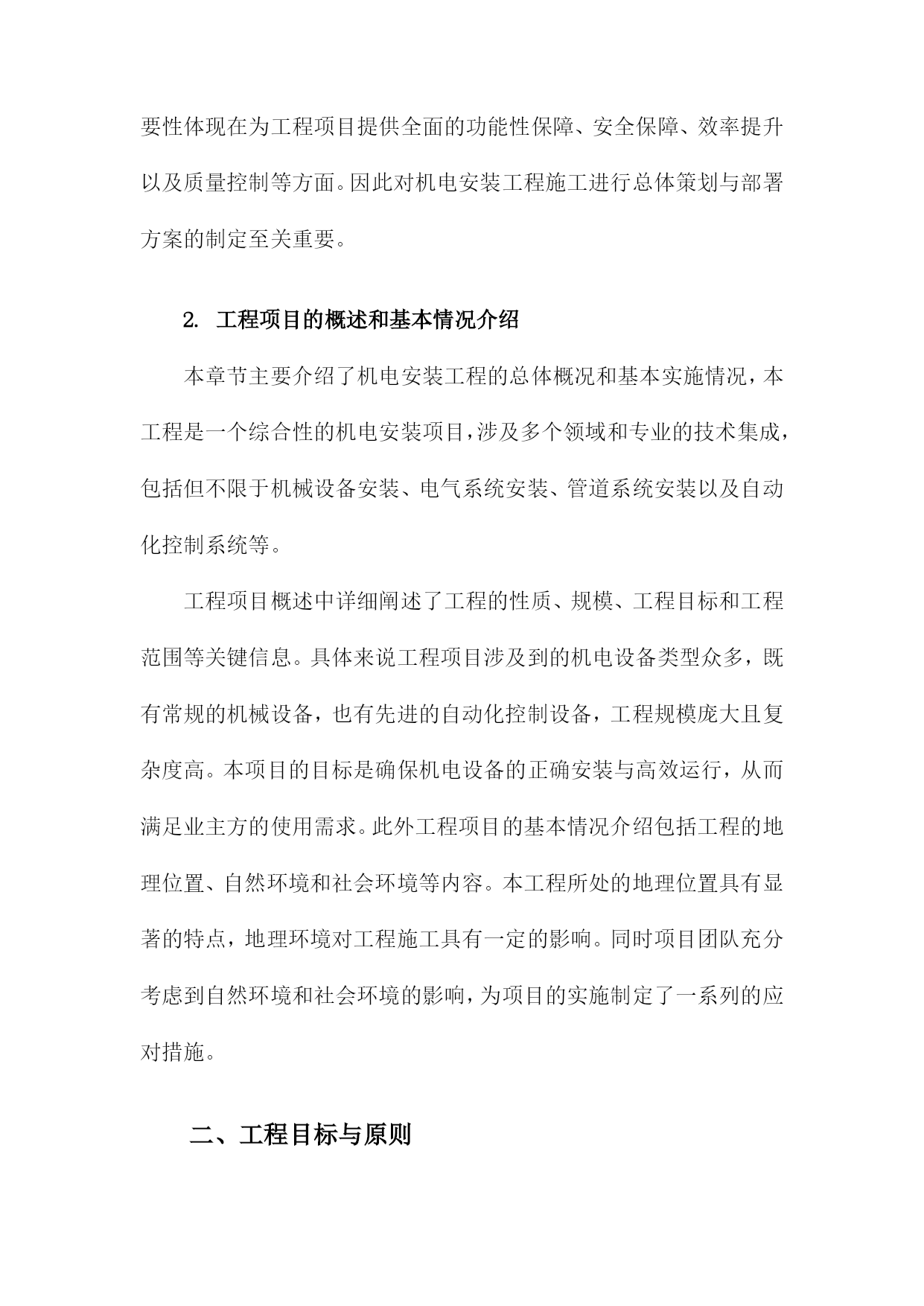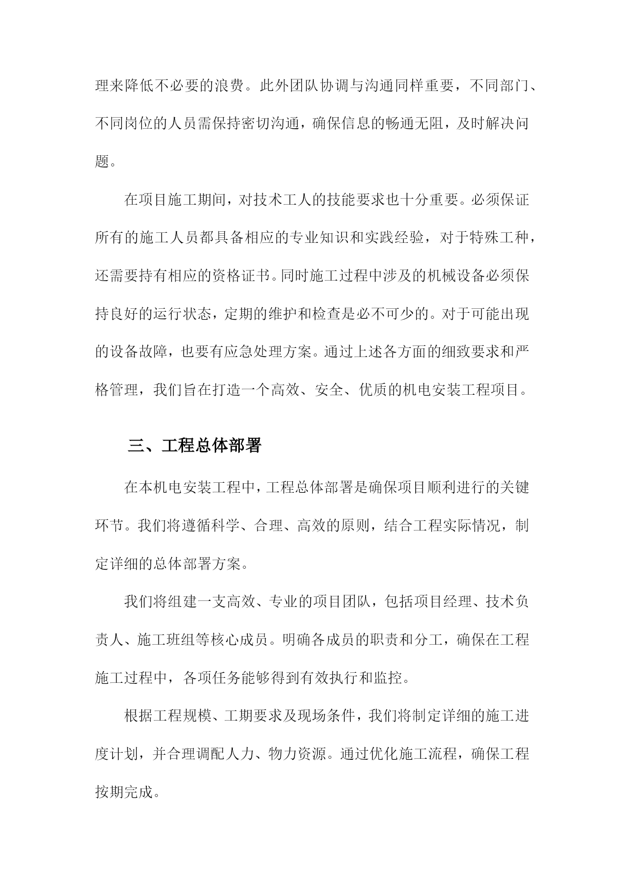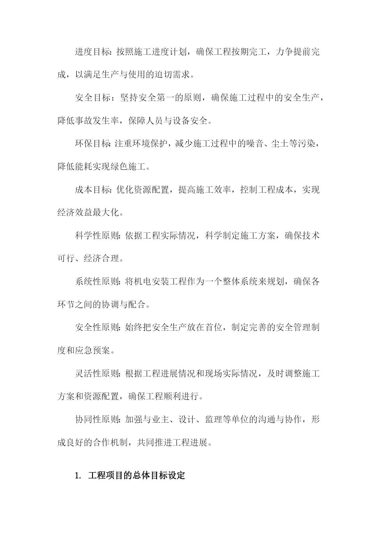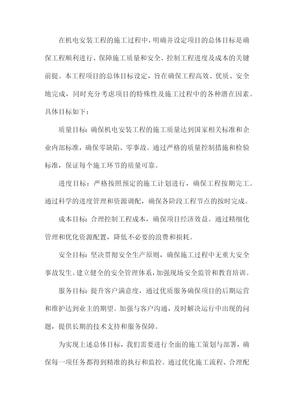 机电安装工程施工总体策划与部署方案一、内容综述随着工业化进程的加速,机电安装工程在各个领域的重要性日益凸显。机电安装工程的施工质量直接影响着整个项目的运行效率和安全性能。因此针对机电安装工程的施工总体策划与部署方案进行深入研究,具有重要的现实意义。本文旨在阐述机电安装工程施工的总体策划与部署方案,以确保工程顺利进行,提高施工效率与质量。本文首先概述了机电安装工程的背景、目的及重要性。接着分析了机电安装工程施工的总体策划原则,包括安全优先、质量为本、效率至上等基本原则。在此基础上,详细阐述了施工部署方案的各个环节,包括施工前准备、施工过程管理、施工后验收等。同时本文还探讨了施工过程中可能遇到的关键问题及其解决方案,以确保施工过程的顺利进行。总体来说本文着重介绍了机电安装工程施工总体策划与部署方案的框架、内容及实施要点。通过科学合理的策划与部署,旨在确保机电安装工程的施工质量、安全、进度和成本得到有效控制,为项目的顺利实施提供有力保障。1.简述机电安装工程的背景及重要性随着现代工业技术的快速发展,机电安装工程在各类工程项目中的地位愈发重要。其背景在于社会对机电设施的需求不断增长,对工程的精准性、安全性和高效性提出了更高的标准。机电安装工程广泛应用于建筑、能源、交通、制造等多个领域,涉及到设备的安装、调试、运行及维护保养等多个环节,是确保工程项目顺利运行的关键组成部分。功能性保障:机电安装工程为工程项目提供核心的动力和系统支持,如供电系统、空调系统、给排水系统、自动化控制系统等,确保项目的正常运转和功能性需求得到满足。安全保障:机电安装工程中的设备安全和系统运行安全直接关系到人员安全和财产安全。不合理的安装可能会导致设备的损坏甚至人员伤亡,因此科学的机电安装工程规划部署至关重要。效率提升:高效的机电安装能够缩短项目工期,减少不必要的资源浪费,从而节约成本。同时合理的安装方案还可以提高设备的运行效率和使用寿命,为企业带来长远的经济效益。质量控制:机电安装工程的质量直接关系到整个项目的质量水平,高质量的机电安装工作能够确保项目的稳定运行和减少后期维护成本。机电安装工程的背景源于社会发展与科技进步的必然趋势,其重要性体现在为工程项目提供全面的功能性保障、安全保障、效率提升以及质量控制等方面。因此对机电安装工程施工进行总体策划与部署方案的制定至关重要。2.工程项目的概述和基本情况介绍本章节主要介绍了机电安装工程的总体概况和基本实施情况,本工程是一个综合性的机电安装项目,涉及多个领域和专业的技术集成,包括但不限于机械设备安装、电气系统安装、管道系统安装以及自动化控制系统等。工程项目概述中详细阐述了工程的性质、规模、工程目标和工程范围等关键信息。具体来说工程项目涉及到的机电设备类型众多,既有常规的机械设备,也有先进的自动化控制设备,工程规模庞大且复杂度高。本项目的目标是确保机电设备的正确安装与高效运行,从而满足业主方的使用需求。此外工程项目的基本情况介绍包括工程的地理位置、自然环境和社会环境等内容。本工程所处的地理位置具有显著的特点,地理环境对工程施工具有一定的影响。同时项目团队充分考虑到自然环境和社会环境的影响,为项目的实施制定了一系列的应对措施。二、工程目标与原则进度目标:按照施工进度计划,确保工程按期完工,力争提前完成,以满足生产与使用的迫切需求。安全目标:坚持安全第一的原则,确保施工过程中的安全生产,降低事故发生率,保障人员与设备安全。环保目标:注重环境保护,减少施工过程中的噪音、尘土等污染,降低能耗实现绿色施工。成本目标:优化资源配置,提高施工效率,控制工程成本,实现经济效益最大化。科学性原则:依据工程实际情况,科学制定施工方案,确保技术可行、经济合理。系统性原则:将机电安装工程作为一个整体系统来规划,确保各环节之间的协调与配合。安全性原则:始终把安全生产放在首位,制定完善的安全管理制度和应急预案。灵活性原则:根据工程进展情况和现场实际情况,及时调整施工方案和资源配置,确保工程顺利进行。协同性原则:加强与业主、设计、监理等单位的沟通与协作,形成良好的合作机制,共同推进工程进展。1.工程项目的总体目标设定在机电安装工程的施工过程中,明确并设定项目的总体目标是确保工程顺利进行、保障施工质量和安全、控制工程进度及成本的关键前提。本工程项目的总体目标设定,旨在确保工程高效、优质、安全地完成,同时充分考虑项目的特殊性及施工过程中的各种潜在因素。具体目标如下:质量目标:确保机电安装工程的施工质量达到国家相关标准和企业内部标准,确保零缺陷、零事故。通过严格的质量控制措施和检验标准,保证每个施工环节的质量可靠。进度目标:严格按照预定的施工计划进行,确保工程按期完工。通过科学的进度管理和资源调配,