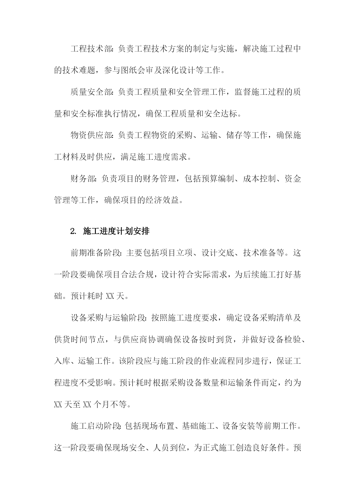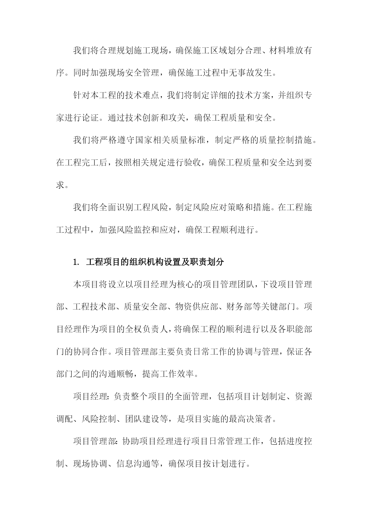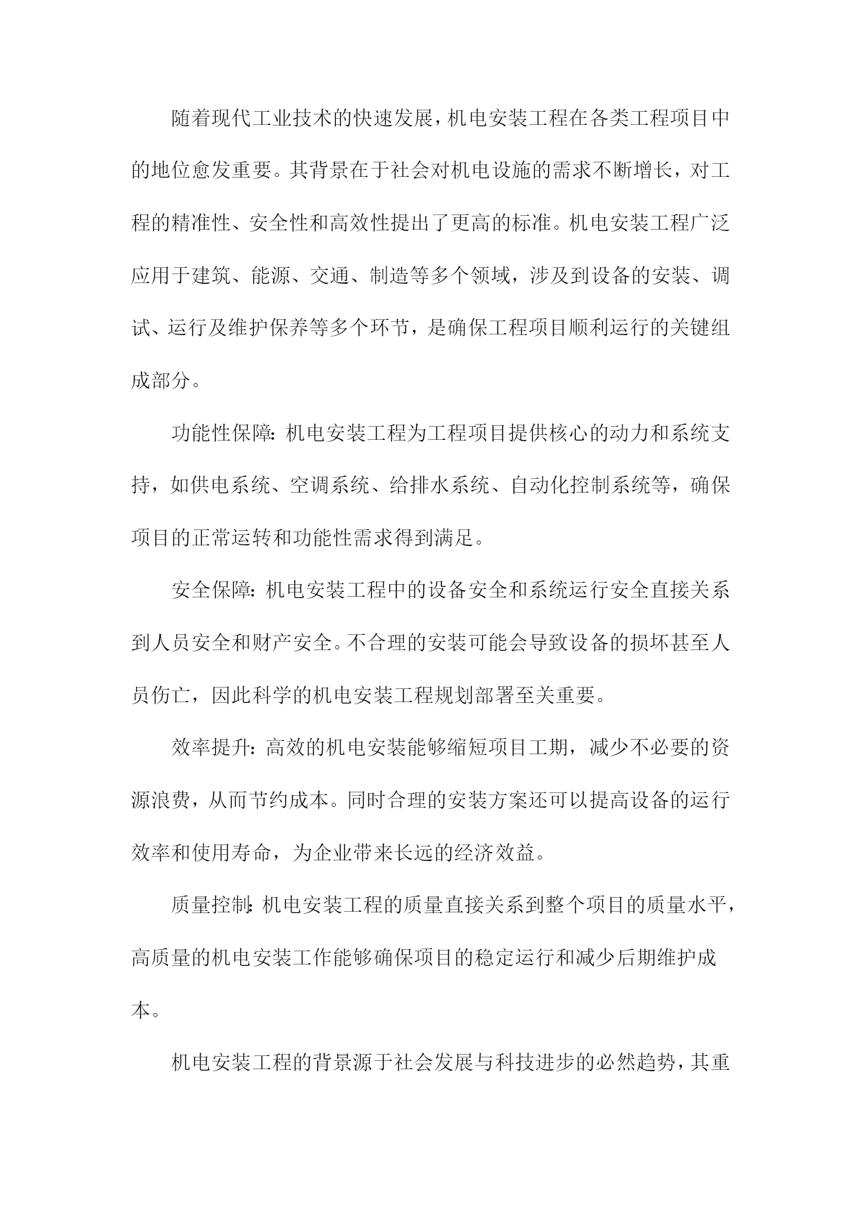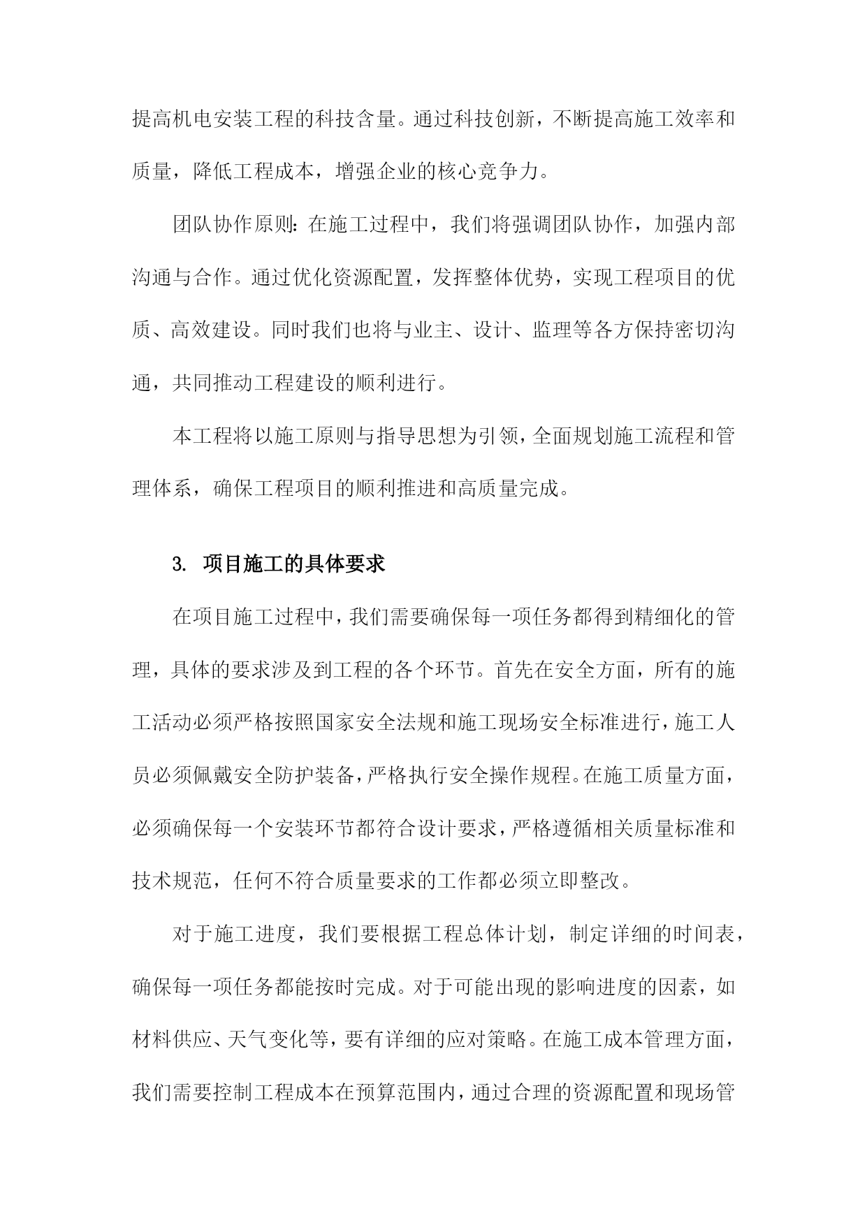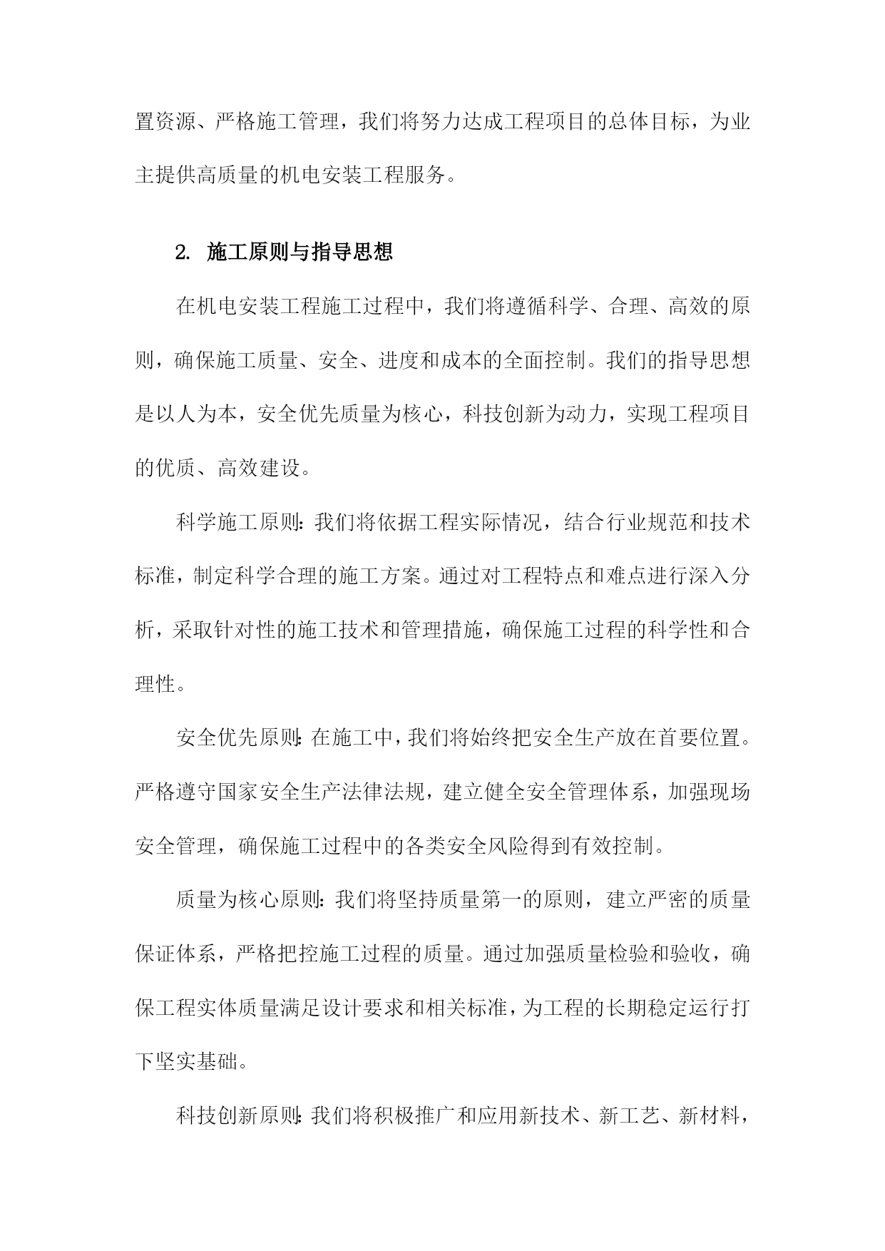 机电安装工程施工总体策划与部署方案一、内容综述随着工业化进程的加速,机电安装工程在各个领域的重要性日益凸显。机电安装工程的施工质量直接影响着整个项目的运行效率和安全性能。因此针对机电安装工程的施工总体策划与部署方案进行深入研究,具有重要的现实意义。本文旨在阐述机电安装工程施工的总体策划与部署方案,以确保工程顺利进行,提高施工效率与质量。本文首先概述了机电安装工程的背景、目的及重要性。接着分析了机电安装工程施工的总体策划原则,包括安全优先、质量为本、效率至上等基本原则。在此基础上,详细阐述了施工部署方案的各个环节,包括施工前准备、施工过程管理、施工后验收等。同时本文还探讨了施工过程中可能遇到的关键问题及其解决方案,以确保施工过程的顺利进行。总体来说本文着重介绍了机电安装工程施工总体策划与部署方案的框架、内容及实施要点。通过科学合理的策划与部署,旨在确保机电安装工程的施工质量、安全、进度和成本得到有效控制,为项目的顺利实施提供有力保障。1.简述机电安装工程的背景及重要性随着现代工业技术的快速发展,机电安装工程在各类工程项目中的地位愈发重要。其背景在于社会对机电设施的需求不断增长,对工程的精准性、安全性和高效性提出了更高的标准。机电安装工程广泛应用于建筑、能源、交通、制造等多个领域,涉及到设备的安装、调试、运行及维护保养等多个环节,是确保工程项目顺利运行的关键组成部分。功能性保障:机电安装工程为工程项目提供核心的动力和系统支持,如供电系统、空调系统、给排水系统、自动化控制系统等,确保项目的正常运转和功能性需求得到满足。安全保障:机电安装工程中的设备安全和系统运行安全直接关系到人员安全和财产安全。不合理的安装可能会导致设备的损坏甚至人员伤亡,因此科学的机电安装工程规划部署至关重要。效率提升:高效的机电安装能够缩短项目工期,减少不必要的资源浪费,从而节约成本。同时合理的安装方案还可以提高设备的运行效率和使用寿命,为企业带来长远的经济效益。质量控制:机电安装工程的质量直接关系到整个项目的质量水平,高质量的机电安装工作能够确保项目的稳定运行和减少后期维护成本。机电安装工程的背景源于社会发展与科技进步的必然趋势,其重要性体现在为工程项目提供全面的功能性保障、安全保障、效率提升以及质量控制等方面。因此对机电安装工程施工进行总体策划与部署方案的制定至关重要。2.工程项目的概述和基本情况介绍本章节主要介绍了机电安装工程的总体概况和基本实施情况,本工程是一个综合性的机电安装项目,涉及多个领域和专业的技术集成,包括但不限于机械设备安装、电气系统安装、管道系统安装以及自动化控制系统等。工程项目概述中详细阐述了工程的性质、规模、工程目标和工程范围等关键信息。具体来说工程项目涉及到的机电设备类型众多,既有常规的机械设备,也有先进的自动化控制设备,工程规模庞大且复杂度高。本项目的目标是确保机电设备的正确安装与高效运行,从而满足业主方的使用需求。此外工程项目的基本情况介绍包括工程的地理位置、自然环境和社会环境等内容。本工程所处的地理位置具有显著的特点,地理环境对工程施工具有一定的影响。同时项目团队充分考虑到自然环境和社会环境的影响,为项目的实施制定了一系列的应对措施。二、工程目标与原则进度目标:按照施工进度计划,确保工程按期完工,力争提前完成,以满足生产与使用的迫切需求。安全目标:坚持安全第一的原则,确保施工过程中的安全生产,降低事故发生率,保障人员与设备安全。环保目标:注重环境保护,减少施工过程中的噪音、尘土等污染,降低能耗实现绿色施工。成本目标:优化资源配置,提高施工效率,控制工程成本,实现经济效益最大化。科学性原则:依据工程实际情况,科学制定施工方案,确保技术可行、经济合理。系统性原则:将机电安装工程作为一个整体系统来规划,确保各环节之间的协调与配合。安全性原则:始终把安全生产放在首位,制定完善的安全管理制度和应急预案。灵活性原则:根据工程进展情况和现场实际情况,及时调整施工方案和资源配置,确保工程顺利进行。协同性原则:加强与业主、设计、监理等单位的沟通与协作,形成良好的合作机制,共同推进工程进展。1.工程项目的总体目标设定在机电安装工程的施工过程中,明确并设定项目的总体目标是确保工程顺利进行、保障施工质量和安全、控制工程进度及成本的关键前提。本工程项目的总体目标设定,旨在确保工程高效、优质、安全地完成,同时充分考虑项目的特殊性及施工过程中的各种潜在因素。具体目标如下:质量目标:确保机电安装工程的施工质量达到国家相关标准和企业内部标准,确保零缺陷、零事故。通过严格的质量控制措施和检验标准,保证每个施工环节的质量可靠。进度目标:严格按照预定的施工计划进行,确保工程按期完工。通过科学的进度管理和资源调配,