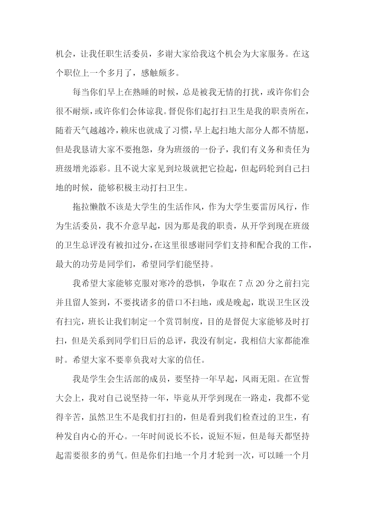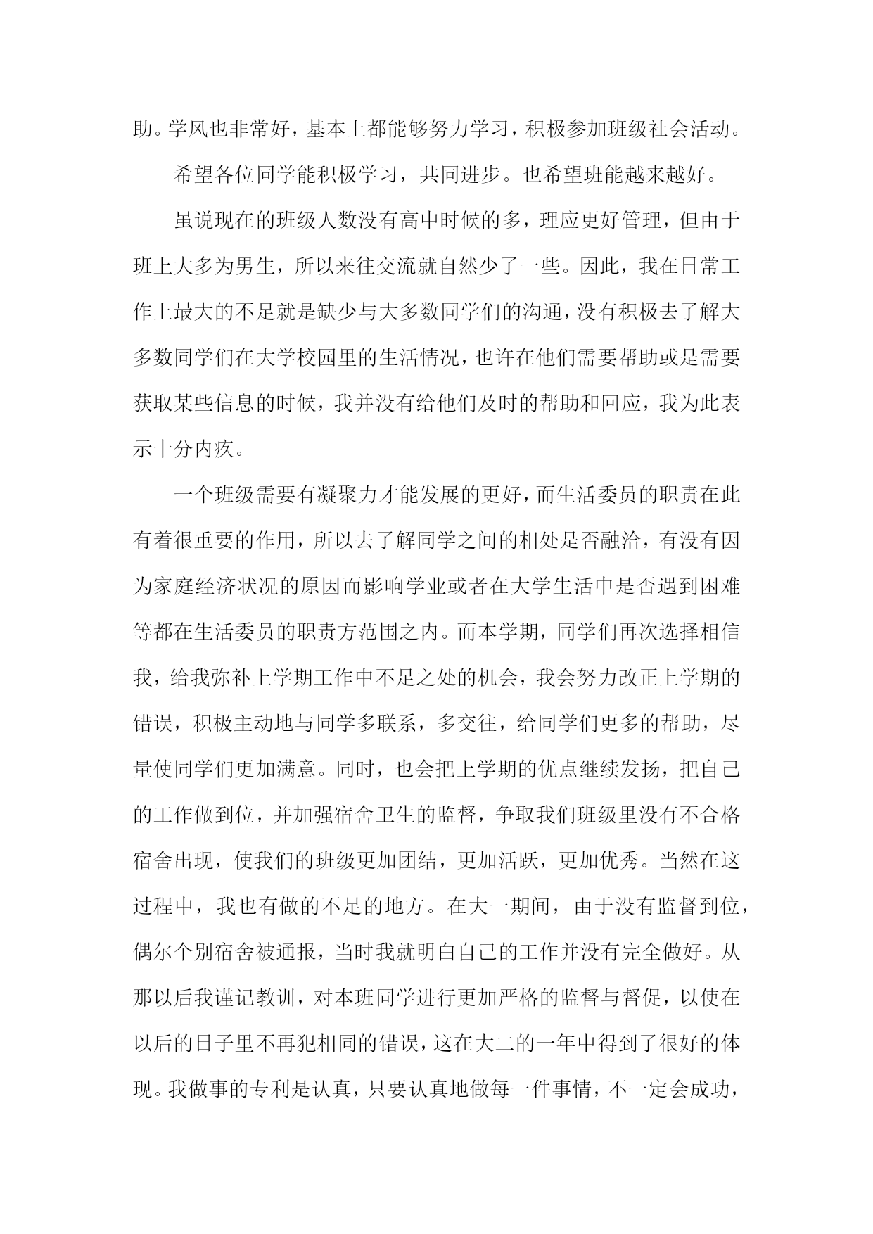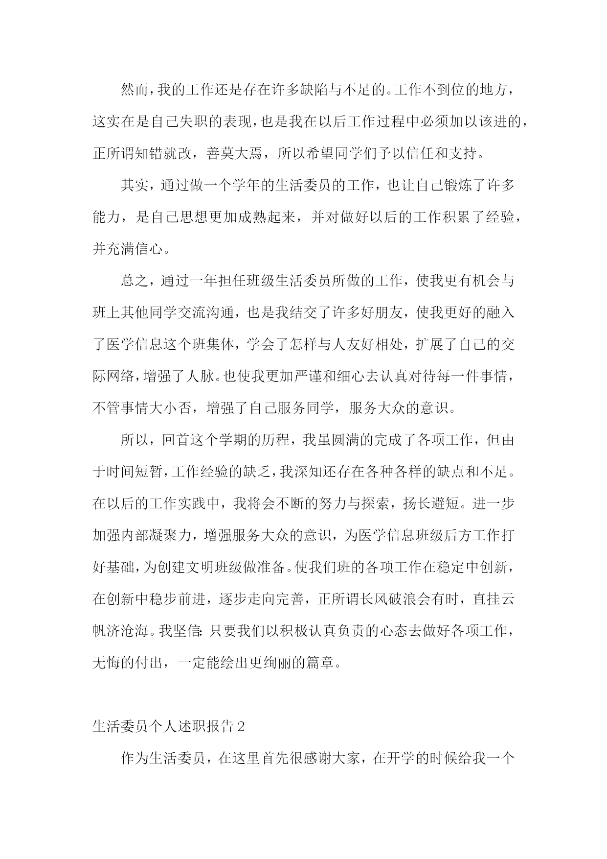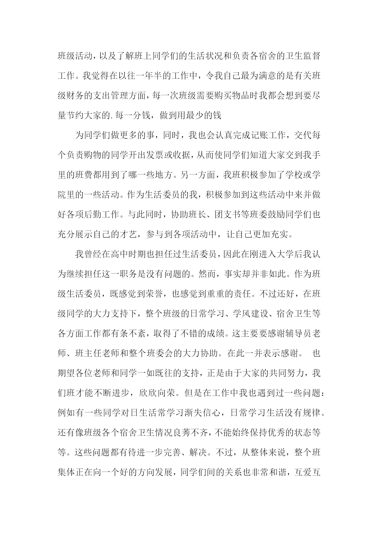 生活委员个人述职报告生活委员个人述职报告1长风破浪会有时,直挂云帆济沧海。斗转星移,时间飞逝,不觉中一个学年已经结束。作为医学信息1002班的生活委员,我在领导和老师的关怀和指导下,以及医学信息1002班班委与全体同学全力配合与协助下,依照中南大学湘雅医学院的工作宗旨及发展方向,努力配合学院及系里的各项工作,并且经过我同学们的共同努力,创新工作模式,改进工作方法,整体上完成了学期初定的工作计划,并取得了不错的成绩。现把本学年的工作,感触收获颇多:从表面看,生活委员就是干后勤的,如查寝,管理班级财务等等,但实际却并非如此。作为一个班级的生活委员,我深知自己的基本工作主要有以下几点:1。保持班级坏境卫生。2。管理班费。3。保证每周到寝室检查。4。团结和协助其他班委做好班级其他工作。在很多人眼中,这些事情是微乎其微的,但是如果要秉承同学眼里无小事的原则去把它们做好,也是要花一番心思的。比如说班级卫生和管理班费这两项工作来说吧,大一一年里,每次做完实验就安排同学做值日,保证实验室内的干净,为其他同学创造良好的环境。管理班费也是较为棘手的事情,因为这直接关系到同学们的切身利益问题,俗话说得好谈钱伤感情,特别是在处理班费分配问题的时候,一定要特别慎重和严谨。同时班上的日常的开销我必须仔细登记核对,以确保无差错,并且定期将其明细表向同学们公布。然而,我的工作还是存在许多缺陷与不足的。工作不到位的地方,这实在是自己失职的表现,也是我在以后工作过程中必须加以该进的,正所谓知错就改,善莫大焉,所以希望同学们予以信任和支持。其实,通过做一个学年的生活委员的工作,也让自己锻炼了许多能力,是自己思想更加成熟起来,并对做好以后的工作积累了经验,并充满信心。总之,通过一年担任班级生活委员所做的工作,使我更有机会与班上其他同学交流沟通,也是我结交了许多好朋友,使我更好的融入了医学信息这个班集体,学会了怎样与人友好相处,扩展了自己的交际网络,增强了人脉。也使我更加严谨和细心去认真对待每一件事情,不管事情大小否,增强了自己服务同学,服务大众的意识。所以,回首这个学期的历程,我虽圆满的完成了各项工作,但由于时间短暂,工作经验的缺乏,我深知还存在各种各样的缺点和不足。在以后的工作实践中,我将会不断的努力与探索,扬长避短。进一步加强内部凝聚力,增强服务大众的意识,为医学信息班级后方工作打好基础,为创建文明班级做准备。使我们班的各项工作在稳定中创新,在创新中稳步前进,逐步走向完善,正所谓长风破浪会有时,直挂云帆济沧海。我坚信:只要我们以积极认真负责的心态去做好各项工作,无悔的付出,一定能绘出更绚丽的篇章。生活委员个人述职报告2作为生活委员,在这里首先很感谢大家,在开学的时候给我一个机会,让我任职生活委员,多谢大家给我这个机会为大家服务。在这个职位上一个多月了,感触颇多。每当你们早上在熟睡的时候,总是被我无情的打扰,或许你们会很不耐烦,或许你们会体谅我。督促你们起打扫卫生是我的职责所在,随着天气越越冷,赖床也就成了习惯,早上起扫地大部分人都不情愿,但是我恳请大家不要抱怨,身为班级的一份子,我们有义务和责任为班级增光添彩。且不说大家见到垃圾就把它捡起,但起码轮到自己扫地的时候,能够积极主动打扫卫生。拖拉懒散不该是大学生的生活作风,作为大学生要雷厉风行,作为生活委员,我不介意早起,因为那是我的职责,从开学到现在班级的卫生总评没有被扣过分,在这里很感谢同学们支持和配合我的工作,最大的功劳是同学们,希望同学们能坚持。我希望大家能够克服对寒冷的恐惧,争取在7点20分之前扫完并且留人签到,不要找诸多的借口不扫地,或是晚起,耽误卫生区没有扫完,班长让我们制定一个赏罚制度,目的是督促大家能够及时打扫,但是关系到同学们日后的总评,我没有制定,我相信大家都能准时。希望大家不要辜负我对大家的信任。我是学生会生活部的成员,要坚持一年早起,风雨无阻。在宣誓大会上,我对自己说坚持一年,毕竟从开学到现在一路走,我都不觉得辛苦,虽然卫生不是我们打扫的,但是看到我们检查过的卫生,有种发自内心的开心。一年时间说长不长,说短不短,但是每天都坚持起需要很多的勇气。但是你们扫地一个月才轮到一次,可以睡一个月的懒觉,早起一周,我知道早起很辛苦,我知道扫地很累,暂不说我要坚持一年累不累,不要你们像我一样早起,但至少到自己扫地的时候,能够按时。在工作中我难免会出现一些失误,希望大家能够及时给我提出,我只想全心全意为班级服务,因为我是班级的一份子。做自己力所能及的事。我希望在我的工作中尽量不出现一些不该有的错误。希望我的工作能够越越好。生活委员个人述职报告3光阴似箭,时光如梭,转眼间大学半个学期已经走过。一个学期以来,我们由原先的居住在祖国各地到机缘巧合分进一个班,变成一个班集体;由互不相识到打打闹闹、开开心心地相处,