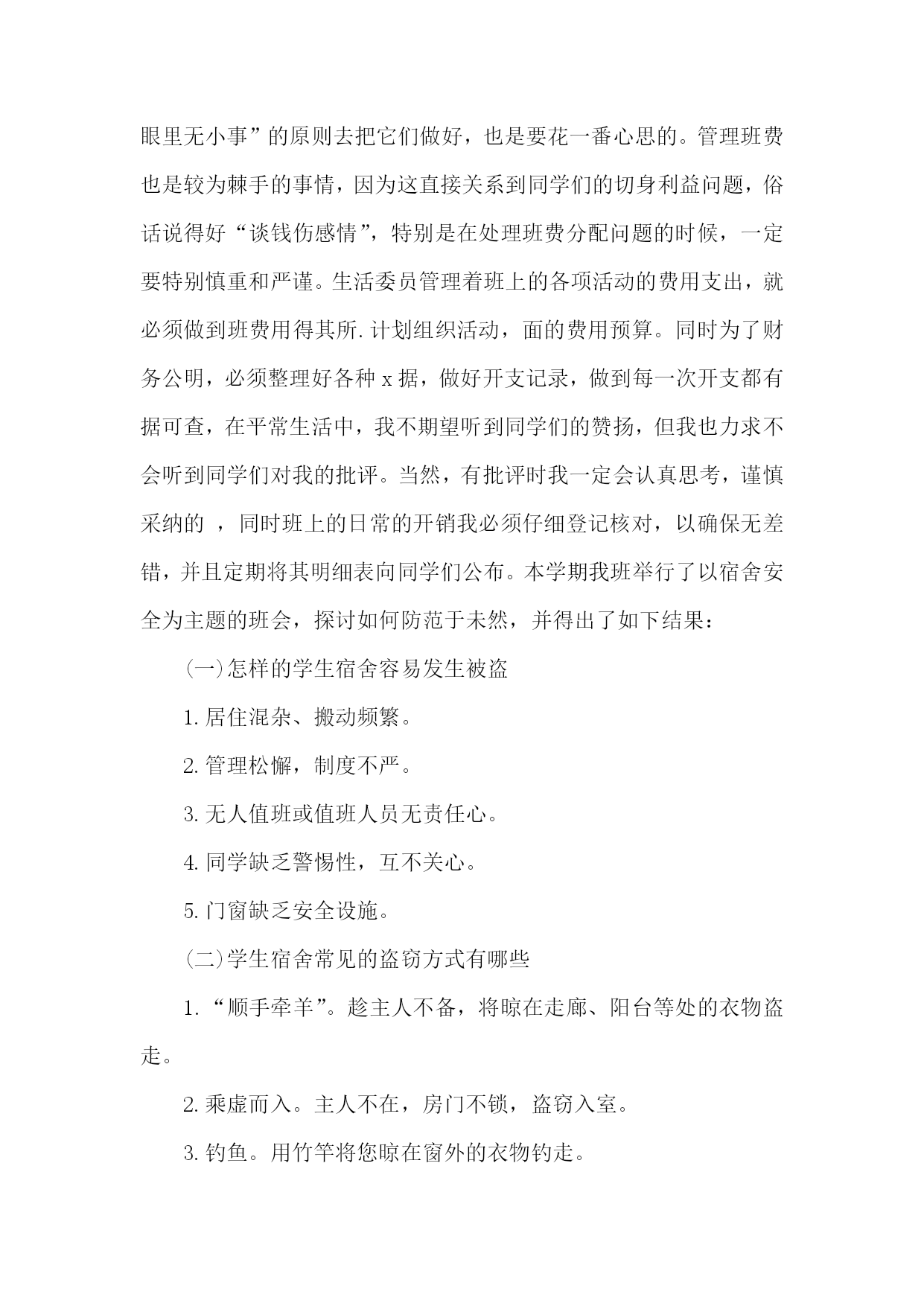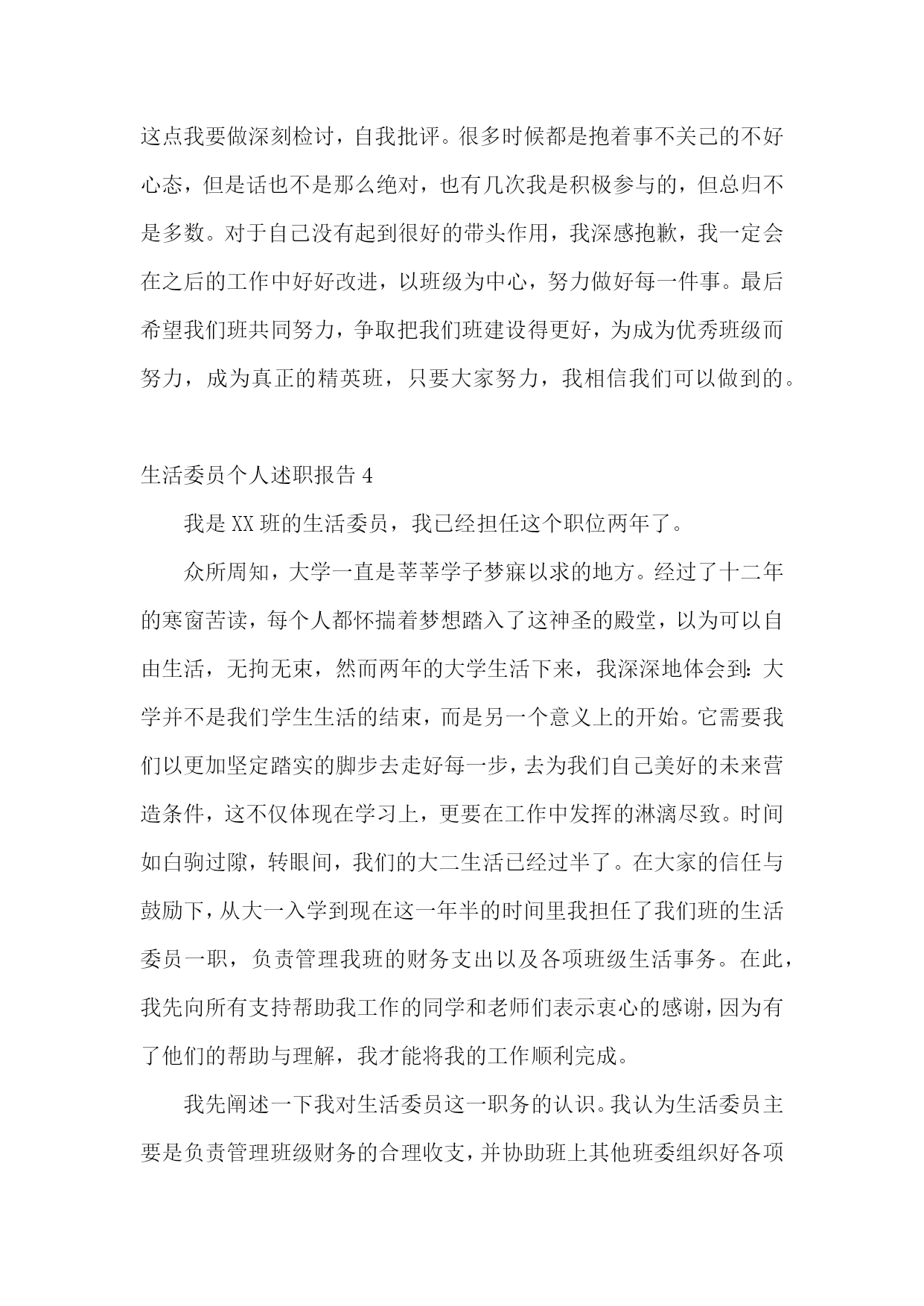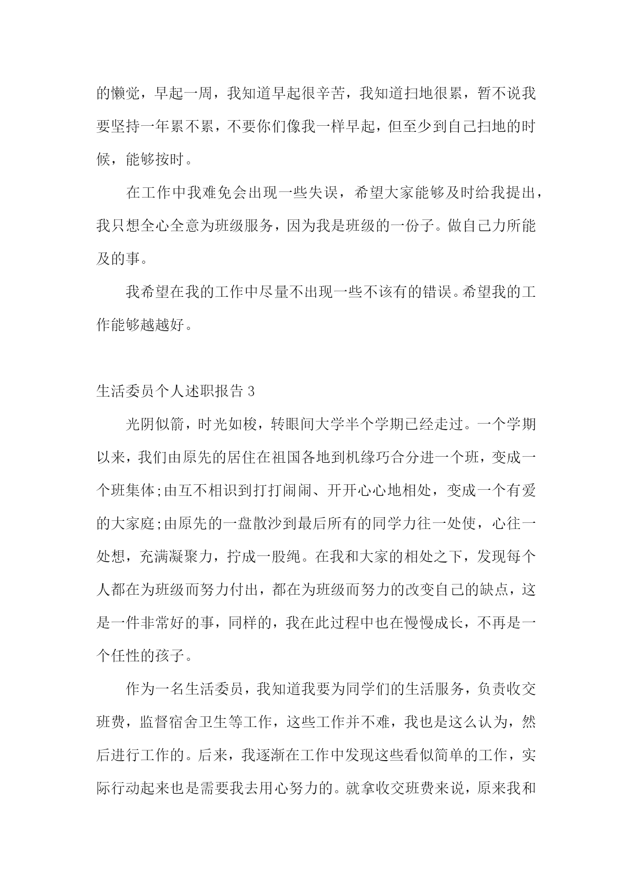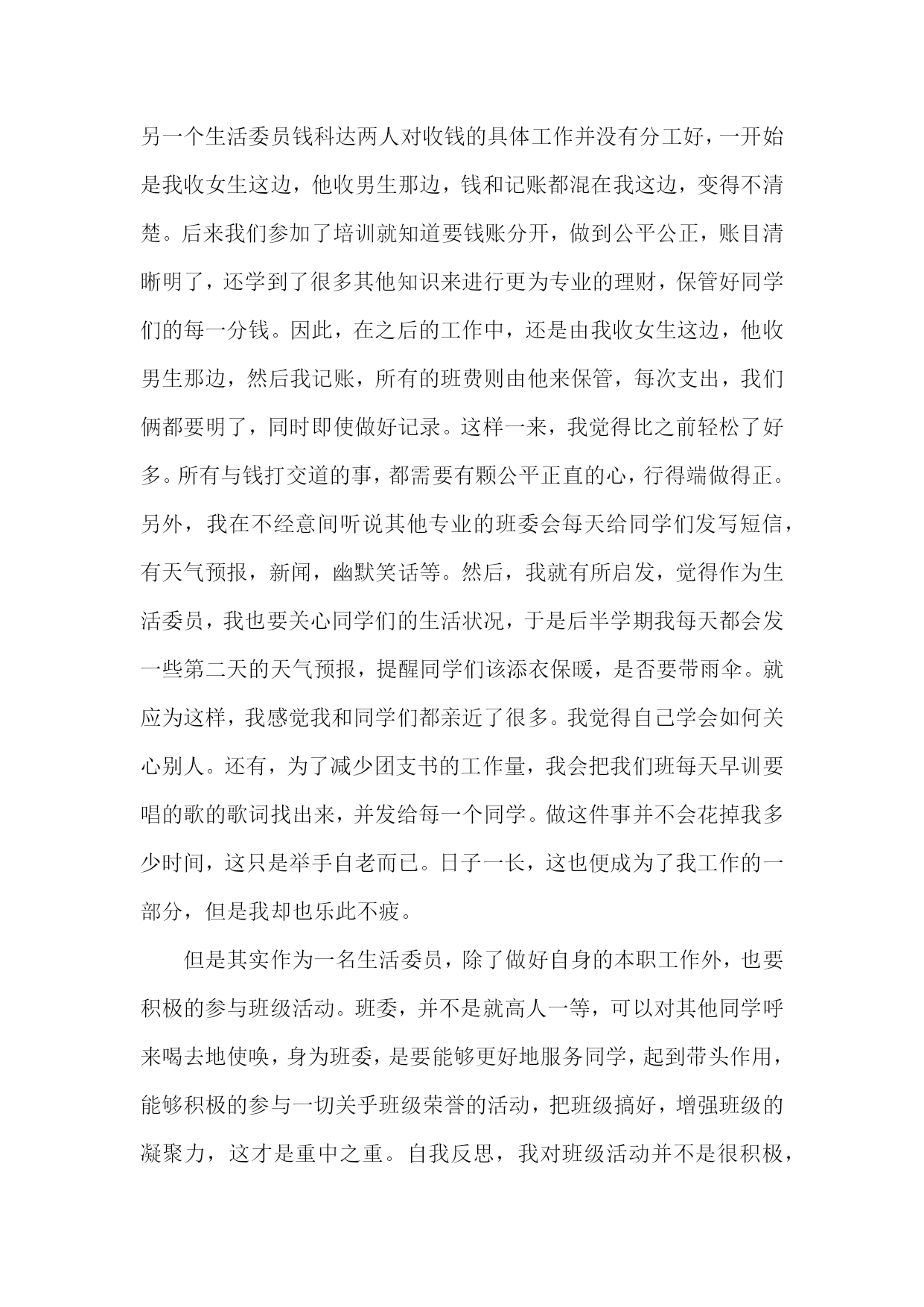 生活委员个人述职报告生活委员个人述职报告1长风破浪会有时,直挂云帆济沧海。斗转星移,时间飞逝,不觉中一个学年已经结束。作为医学信息1002班的生活委员,我在领导和老师的关怀和指导下,以及医学信息1002班班委与全体同学全力配合与协助下,依照中南大学湘雅医学院的工作宗旨及发展方向,努力配合学院及系里的各项工作,并且经过我同学们的共同努力,创新工作模式,改进工作方法,整体上完成了学期初定的工作计划,并取得了不错的成绩。现把本学年的工作,感触收获颇多:从表面看,生活委员就是干后勤的,如查寝,管理班级财务等等,但实际却并非如此。作为一个班级的生活委员,我深知自己的基本工作主要有以下几点:1。保持班级坏境卫生。2。管理班费。3。保证每周到寝室检查。4。团结和协助其他班委做好班级其他工作。在很多人眼中,这些事情是微乎其微的,但是如果要秉承同学眼里无小事的原则去把它们做好,也是要花一番心思的。比如说班级卫生和管理班费这两项工作来说吧,大一一年里,每次做完实验就安排同学做值日,保证实验室内的干净,为其他同学创造良好的环境。管理班费也是较为棘手的事情,因为这直接关系到同学们的切身利益问题,俗话说得好谈钱伤感情,特别是在处理班费分配问题的时候,一定要特别慎重和严谨。同时班上的日常的开销我必须仔细登记核对,以确保无差错,并且定期将其明细表向同学们公布。然而,我的工作还是存在许多缺陷与不足的。工作不到位的地方,这实在是自己失职的表现,也是我在以后工作过程中必须加以该进的,正所谓知错就改,善莫大焉,所以希望同学们予以信任和支持。其实,通过做一个学年的生活委员的工作,也让自己锻炼了许多能力,是自己思想更加成熟起来,并对做好以后的工作积累了经验,并充满信心。总之,通过一年担任班级生活委员所做的工作,使我更有机会与班上其他同学交流沟通,也是我结交了许多好朋友,使我更好的融入了医学信息这个班集体,学会了怎样与人友好相处,扩展了自己的交际网络,增强了人脉。也使我更加严谨和细心去认真对待每一件事情,不管事情大小否,增强了自己服务同学,服务大众的意识。所以,回首这个学期的历程,我虽圆满的完成了各项工作,但由于时间短暂,工作经验的缺乏,我深知还存在各种各样的缺点和不足。在以后的工作实践中,我将会不断的努力与探索,扬长避短。进一步加强内部凝聚力,增强服务大众的意识,为医学信息班级后方工作打好基础,为创建文明班级做准备。使我们班的各项工作在稳定中创新,在创新中稳步前进,逐步走向完善,正所谓长风破浪会有时,直挂云帆济沧海。我坚信:只要我们以积极认真负责的心态去做好各项工作,无悔的付出,一定能绘出更绚丽的篇章。生活委员个人述职报告2作为生活委员,在这里首先很感谢大家,在开学的时候给我一个机会,让我任职生活委员,多谢大家给我这个机会为大家服务。在这个职位上一个多月了,感触颇多。每当你们早上在熟睡的时候,总是被我无情的打扰,或许你们会很不耐烦,或许你们会体谅我。督促你们起打扫卫生是我的职责所在,随着天气越越冷,赖床也就成了习惯,早上起扫地大部分人都不情愿,但是我恳请大家不要抱怨,身为班级的一份子,我们有义务和责任为班级增光添彩。且不说大家见到垃圾就把它捡起,但起码轮到自己扫地的时候,能够积极主动打扫卫生。拖拉懒散不该是大学生的生活作风,作为大学生要雷厉风行,作为生活委员,我不介意早起,因为那是我的职责,从开学到现在班级的卫生总评没有被扣过分,在这里很感谢同学们支持和配合我的工作,最大的功劳是同学们,希望同学们能坚持。我希望大家能够克服对寒冷的恐惧,争取在7点20分之前扫完并且留人签到,不要找诸多的借口不扫地,或是晚起,耽误卫生区没有扫完,班长让我们制定一个赏罚制度,目的是督促大家能够及时打扫,但是关系到同学们日后的总评,我没有制定,我相信大家都能准时。希望大家不要辜负我对大家的信任。我是学生会生活部的成员,要坚持一年早起,风雨无阻。在宣誓大会上,我对自己说坚持一年,毕竟从开学到现在一路走,我都不觉得辛苦,虽然卫生不是我们打扫的,但是看到我们检查过的卫生,有种发自内心的开心。一年时间说长不长,说短不短,但是每天都坚持起需要很多的勇气。但是你们扫地一个月才轮到一次,可以睡一个月的懒觉,早起一周,我知道早起很辛苦,我知道扫地很累,暂不说我要坚持一年累不累,不要你们像我一样早起,但至少到自己扫地的时候,能够按时。在工作中我难免会出现一些失误,希望大家能够及时给我提出,我只想全心全意为班级服务,因为我是班级的一份子。做自己力所能及的事。我希望在我的工作中尽量不出现一些不该有的错误。希望我的工作能够越越好。生活委员个人述职报告3光阴似箭,时光如梭,转眼间大学半个学期已经走过。一个学期以来,我们由原先的居住在祖国各地到机缘巧合分进一个班,变成一个班集体;由互不相识到打打闹闹、开开心心地相处,