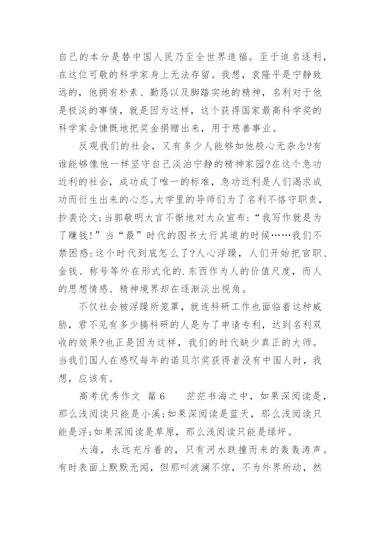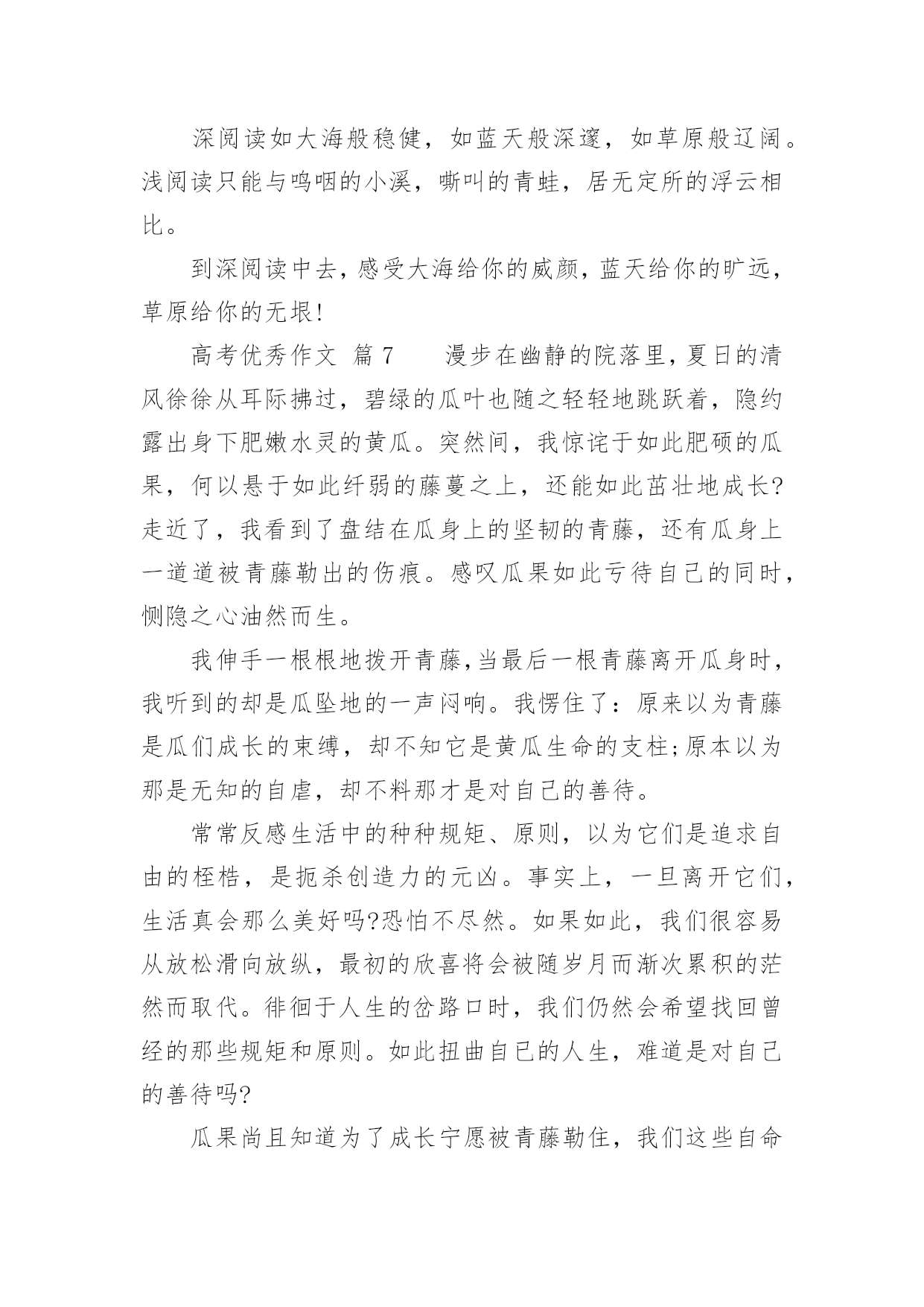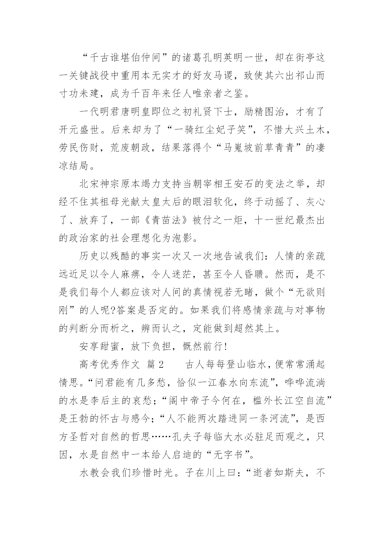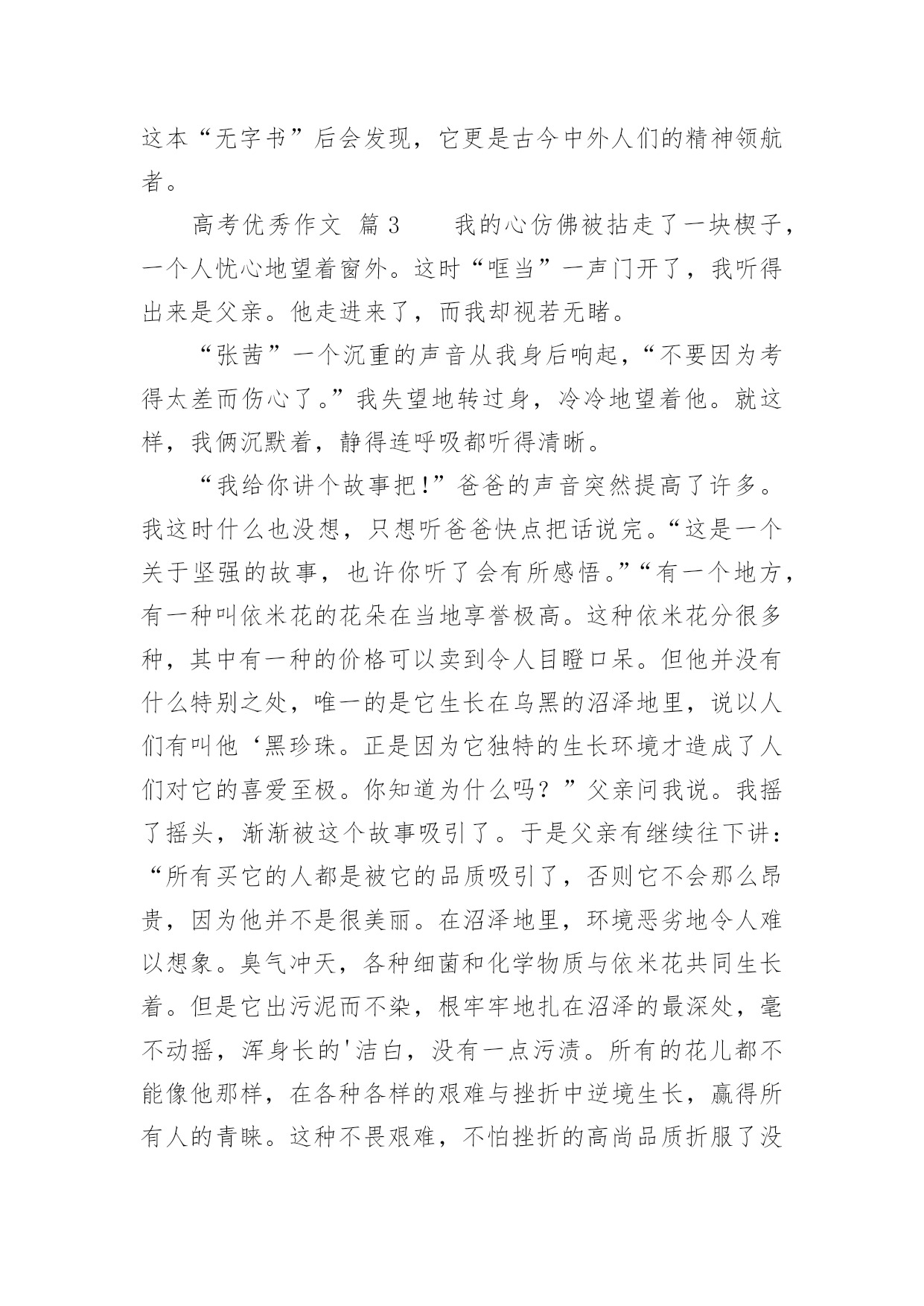 高考优秀作文高考优秀作文(精选54篇)在日常学习、工作和生活中,大家都经常看到作文的身影吧,作文要求篇章结构完整,一定要避免无结尾作文的出现。相信很多朋友都对写作文感到非常苦恼吧,下面是小编帮大家整理的高考优秀作文,欢迎阅读与收藏。高考优秀作文篇1哲人云:“爱可以使一朵鲜花变成一座花园,也可以使一滴水变成一条小溪。”在漫漫的人生旅途中,人的心灵需要翱翔于蓝天,接受风刀霜剑的洗礼;需要游弋于大海,接受惊涛骇浪的考验;需要驰骋于荒原,接受荆棘沼泽的磨石厉……所有这一切,都足以让一颗心遍体鳞伤、疲惫不堪,唯有真情的爱能将这伤口抚平,使心灵恢复活力,因为,爱是甜蜜的。然而,爱在给人以安慰、鼓励和支持的同时,却悄无声息地给心灵那锐利的目光遮上了一层幕布。正如花丛给人以芬芳艳丽,却挡住了前行的山路;湖泊给人以清澈空灵,却倒映出虚假的幻景;美酒给人以香醇醉清洌,却模糊了眼中的目标。甜蜜,有时也能成为一种负担。人,毕竟是感性的动物,然而现实却要求我们用理智的目光来认知客观事物,背负着亲情、友情、爱情种种甜蜜的负担,即便是最最理智的人也可能作出错误的`判断。“千古谁堪伯仲间”的诸葛孔明英明一世,却在街亭这一关键战役中重用本无实才的好友马谡,致使其六出祁山而寸功未建,成为千百年来任人唯亲者之鉴。一代明君唐明皇即位之初礼贤下士,励精图治,才有了开元盛世。后来却为了“一骑红尘妃子笑”,不惜大兴土木,劳民伤财,荒废朝政,结果落得个“马嵬坡前草青青”的凄凉结局。北宋神宗原本竭力支持当朝宰相王安石的变法之举,却经不住其祖母光献太皇太后的眼泪软化,终于动摇了、灰心了、放弃了,一部《青苗法》被付之一炬,十一世纪最杰出的政治家的社会理想化为泡影。历史以残酷的事实一次又一次地告诫我们:人情的亲疏远近足以令人麻痹,令人迷茫,甚至令人昏聩。然而,是不是我们每个人都应该对人间的真情视若无睹,做个“无欲则刚”的人呢?答案是否定的。如果我们将感情亲疏与对事物的判断分而析之,辨而认之,定能做到超然其上。安享甜蜜,放下负担,慨然前行!高考优秀作文篇2古人每每登山临水,便常常涌起情思。“问君能有几多愁,恰似一江春水向东流”,哗哗流淌的水是李后主的哀愁;“阁中帝子今何在,槛外长江空自流”是王勃的怀古与感今;“人不能两次踏进同一条河流”,是西方圣哲对自然的哲思……孔夫子每临大水必驻足而观之,只因,水是自然中一本给人启迪的“无字书”。水教会我们珍惜时光。子在川上曰:“逝者如斯夫,不舍昼夜。”江河中日夜不息奔腾的水,几千年来就这么流淌,给人以时光流淌光阴逝去的直观感受,让人“哀吾生之须臾,羡长江之无穷”。古人以水为滴漏,那滴答的声音无疑更证明了时光的流逝。既然时光匆匆,何不收拾好行囊,赶快上路?休要负了那“造物者之无尽藏”的美好大千世界。水是地球的血液,泽被万物,教会人奉献。“随风潜入夜,润物细无声。”春雨绵绵,甘露四下,以自我之躯体使万物复苏、百草抽芽,这何不是一种奉献精神?“上善若水,水善利万物而不争,处众人之所恶,故几于道”,这告诉我们,水不仅仅滋润万物、奉献自己,还具有一种无私的“不争”精神,惠泽万物却不矜不伐,使人敬仰。水带给人小大之辨的哲学思考。秋水时至,百川灌河,泾流之大,两涘诸崖不辨牛马。河伯沾沾自喜,直到行至东海方才“望洋兴叹”、幡然醒悟,小与大是相对的',心有敬畏,不至沦落为“蜩与学鸠”。水教会了我们“志”与“远方”。王开岭在一文中写道:一个朋友画了一条绝美的江河,我问曰何以画成,答曰,想象这是一条有远方的水。流水方能不腐。“问渠那得清如许,为有源头活水来”。有生命力的水,是“有远方的”,是流动的。孔子评价水“万折也必东,故有志”。不朽之水,从不停下脚步,始终坚韧地向东流去,即使途中弯路重重,最终也不改其“志”。知者乐水。水,是我们维持生命的必需品。阅读“水”这本“无字书”后会发现,它更是古今中外人们的精神领航者。高考优秀作文篇3我的心仿佛被拈走了一块楔子,一个人忧心地望着窗外。这时“哐当”一声门开了,我听得出来是父亲。他走进来了,而我却视若无睹。“张茜”一个沉重的声音从我身后响起,“不要因为考得太差而伤心了。”我失望地转过身,冷冷地望着他。就这样,我俩沉默着,静得连呼吸都听得清晰。“我给你讲个故事把!”爸爸的声音突然提高了许多。我这时什么也没想,只想听爸爸快点把话说完。“这是一个关于坚强的故事,也许你听了会有所感悟。”“有一个地方,有一种叫依米花的花朵在当地享誉极高。这种依米花分很多种,其中有一种的价格可以卖到令人目瞪口呆。但他并没有什么特别之处,唯一的是它生长在乌黑的沼泽地里,说以人们有叫他‘黑珍珠。正是因为它独特的生长环境才造成了人们对它的喜爱至极。你知道为什么吗?”父亲问我说。我摇了摇头,渐渐被这个故事吸引了。于是父亲有继续往下讲:“所有买它的人都是被它的