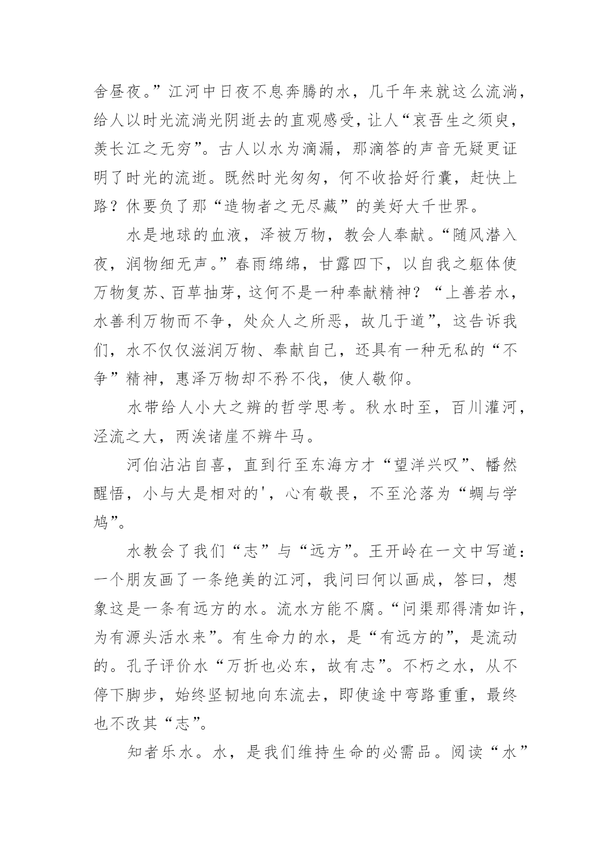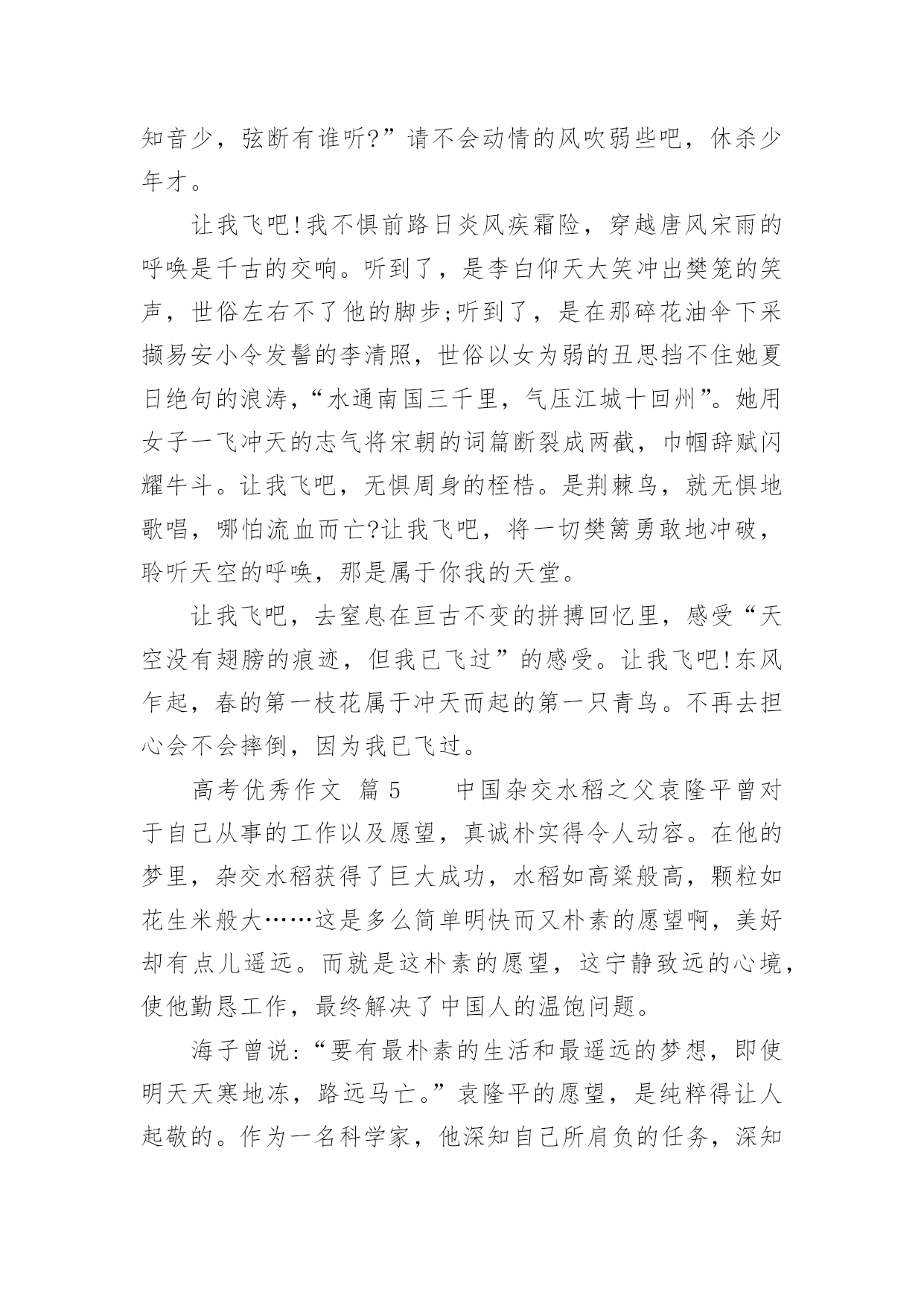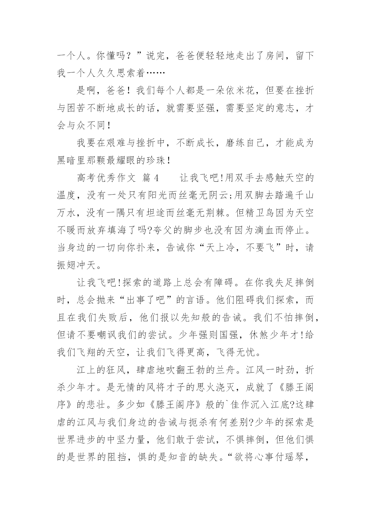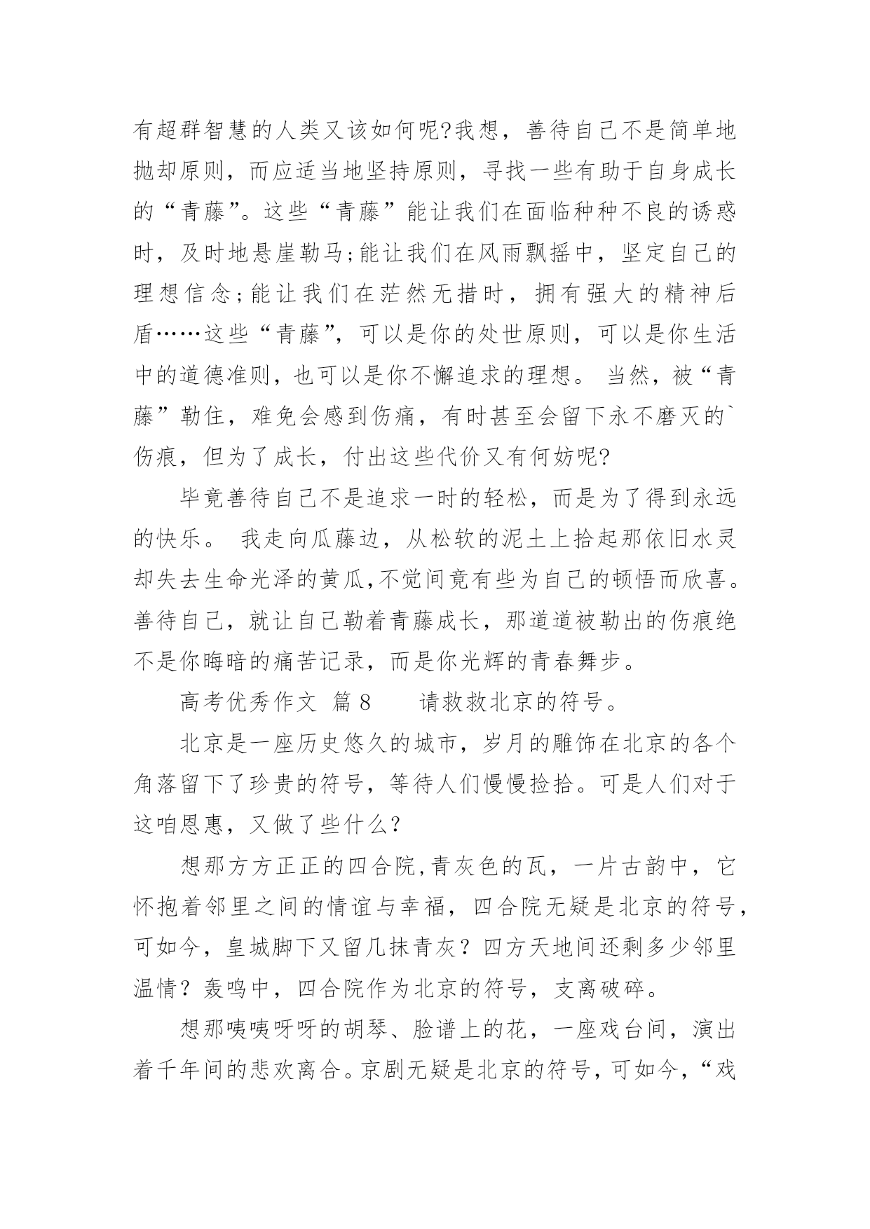 高考优秀作文高考优秀作文(精选54篇)在日常学习、工作和生活中,大家都经常看到作文的身影吧,作文要求篇章结构完整,一定要避免无结尾作文的出现。相信很多朋友都对写作文感到非常苦恼吧,下面是小编帮大家整理的高考优秀作文,欢迎阅读与收藏。高考优秀作文篇1哲人云:“爱可以使一朵鲜花变成一座花园,也可以使一滴水变成一条小溪。”在漫漫的人生旅途中,人的心灵需要翱翔于蓝天,接受风刀霜剑的洗礼;需要游弋于大海,接受惊涛骇浪的考验;需要驰骋于荒原,接受荆棘沼泽的磨石厉……所有这一切,都足以让一颗心遍体鳞伤、疲惫不堪,唯有真情的爱能将这伤口抚平,使心灵恢复活力,因为,爱是甜蜜的。然而,爱在给人以安慰、鼓励和支持的同时,却悄无声息地给心灵那锐利的目光遮上了一层幕布。正如花丛给人以芬芳艳丽,却挡住了前行的山路;湖泊给人以清澈空灵,却倒映出虚假的幻景;美酒给人以香醇醉清洌,却模糊了眼中的目标。甜蜜,有时也能成为一种负担。人,毕竟是感性的动物,然而现实却要求我们用理智的目光来认知客观事物,背负着亲情、友情、爱情种种甜蜜的负担,即便是最最理智的人也可能作出错误的`判断。“千古谁堪伯仲间”的诸葛孔明英明一世,却在街亭这一关键战役中重用本无实才的好友马谡,致使其六出祁山而寸功未建,成为千百年来任人唯亲者之鉴。一代明君唐明皇即位之初礼贤下士,励精图治,才有了开元盛世。后来却为了“一骑红尘妃子笑”,不惜大兴土木,劳民伤财,荒废朝政,结果落得个“马嵬坡前草青青”的凄凉结局。北宋神宗原本竭力支持当朝宰相王安石的变法之举,却经不住其祖母光献太皇太后的眼泪软化,终于动摇了、灰心了、放弃了,一部《青苗法》被付之一炬,十一世纪最杰出的政治家的社会理想化为泡影。历史以残酷的事实一次又一次地告诫我们:人情的亲疏远近足以令人麻痹,令人迷茫,甚至令人昏聩。然而,是不是我们每个人都应该对人间的真情视若无睹,做个“无欲则刚”的人呢?答案是否定的。如果我们将感情亲疏与对事物的判断分而析之,辨而认之,定能做到超然其上。安享甜蜜,放下负担,慨然前行!高考优秀作文篇2古人每每登山临水,便常常涌起情思。“问君能有几多愁,恰似一江春水向东流”,哗哗流淌的水是李后主的哀愁;“阁中帝子今何在,槛外长江空自流”是王勃的怀古与感今;“人不能两次踏进同一条河流”,是西方圣哲对自然的哲思……孔夫子每临大水必驻足而观之,只因,水是自然中一本给人启迪的“无字书”。水教会我们珍惜时光。子在川上曰:“逝者如斯夫,不舍昼夜。”江河中日夜不息奔腾的水,几千年来就这么流淌,给人以时光流淌光阴逝去的直观感受,让人“哀吾生之须臾,羡长江之无穷”。古人以水为滴漏,那滴答的声音无疑更证明了时光的流逝。既然时光匆匆,何不收拾好行囊,赶快上路?休要负了那“造物者之无尽藏”的美好大千世界。水是地球的血液,泽被万物,教会人奉献。“随风潜入夜,润物细无声。”春雨绵绵,甘露四下,以自我之躯体使万物复苏、百草抽芽,这何不是一种奉献精神?“上善若水,水善利万物而不争,处众人之所恶,故几于道”,这告诉我们,水不仅仅滋润万物、奉献自己,还具有一种无私的“不争”精神,惠泽万物却不矜不伐,使人敬仰。水带给人小大之辨的哲学思考。秋水时至,百川灌河,泾流之大,两涘诸崖不辨牛马。河伯沾沾自喜,直到行至东海方才“望洋兴叹”、幡然醒悟,小与大是相对的',心有敬畏,不至沦落为“蜩与学鸠”。水教会了我们“志”与“远方”。王开岭在一文中写道:一个朋友画了一条绝美的江河,我问曰何以画成,答曰,想象这是一条有远方的水。流水方能不腐。“问渠那得清如许,为有源头活水来”。有生命力的水,是“有远方的”,是流动的。孔子评价水“万折也必东,故有志”。不朽之水,从不停下脚步,始终坚韧地向东流去,即使途中弯路重重,最终也不改其“志”。知者乐水。水,是我们维持生命的必需品。阅读“水”这本“无字书”后会发现,它更是古今中外人们的精神领航者。高考优秀作文篇3我的心仿佛被拈走了一块楔子,一个人忧心地望着窗外。这时“哐当”一声门开了,我听得出来是父亲。他走进来了,而我却视若无睹。“张茜”一个沉重的声音从我身后响起,“不要因为考得太差而伤心了。”我失望地转过身,冷冷地望着他。就这样,我俩沉默着,静得连呼吸都听得清晰。“我给你讲个故事把!”爸爸的声音突然提高了许多。我这时什么也没想,只想听爸爸快点把话说完。“这是一个关于坚强的故事,也许你听了会有所感悟。”“有一个地方,有一种叫依米花的花朵在当地享誉极高。这种依米花分很多种,其中有一种的价格可以卖到令人目瞪口呆。但他并没有什么特别之处,唯一的是它生长在乌黑的沼泽地里,说以人们有叫他‘黑珍珠。正是因为它独特的生长环境才造成了人们对它的喜爱至极。你知道为什么吗?”父亲问我说。我摇了摇头,渐渐被这个故事吸引了。于是父亲有继续往下讲:“所有买它的人都是被它的