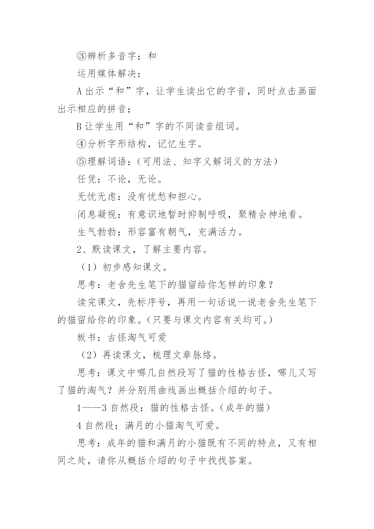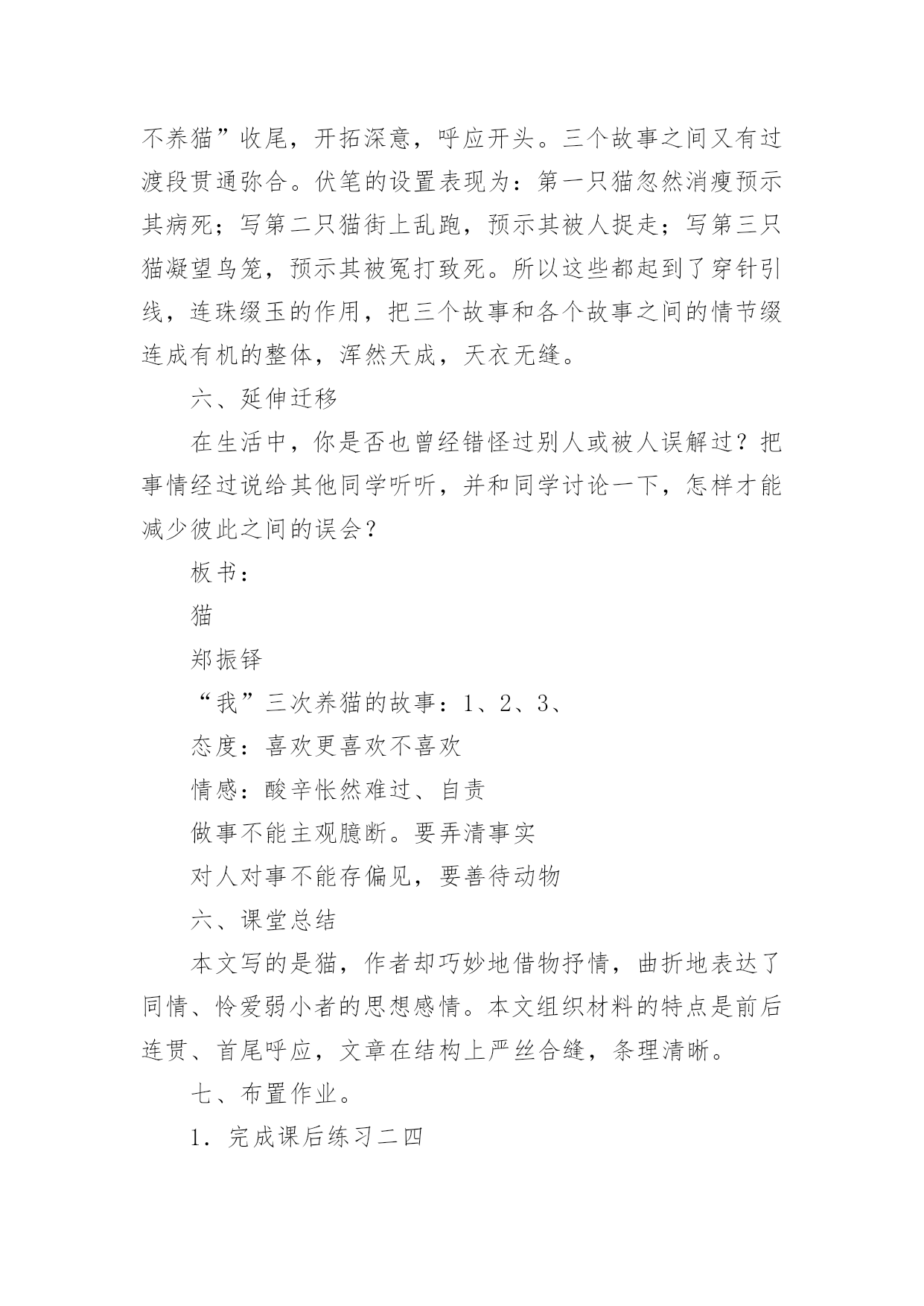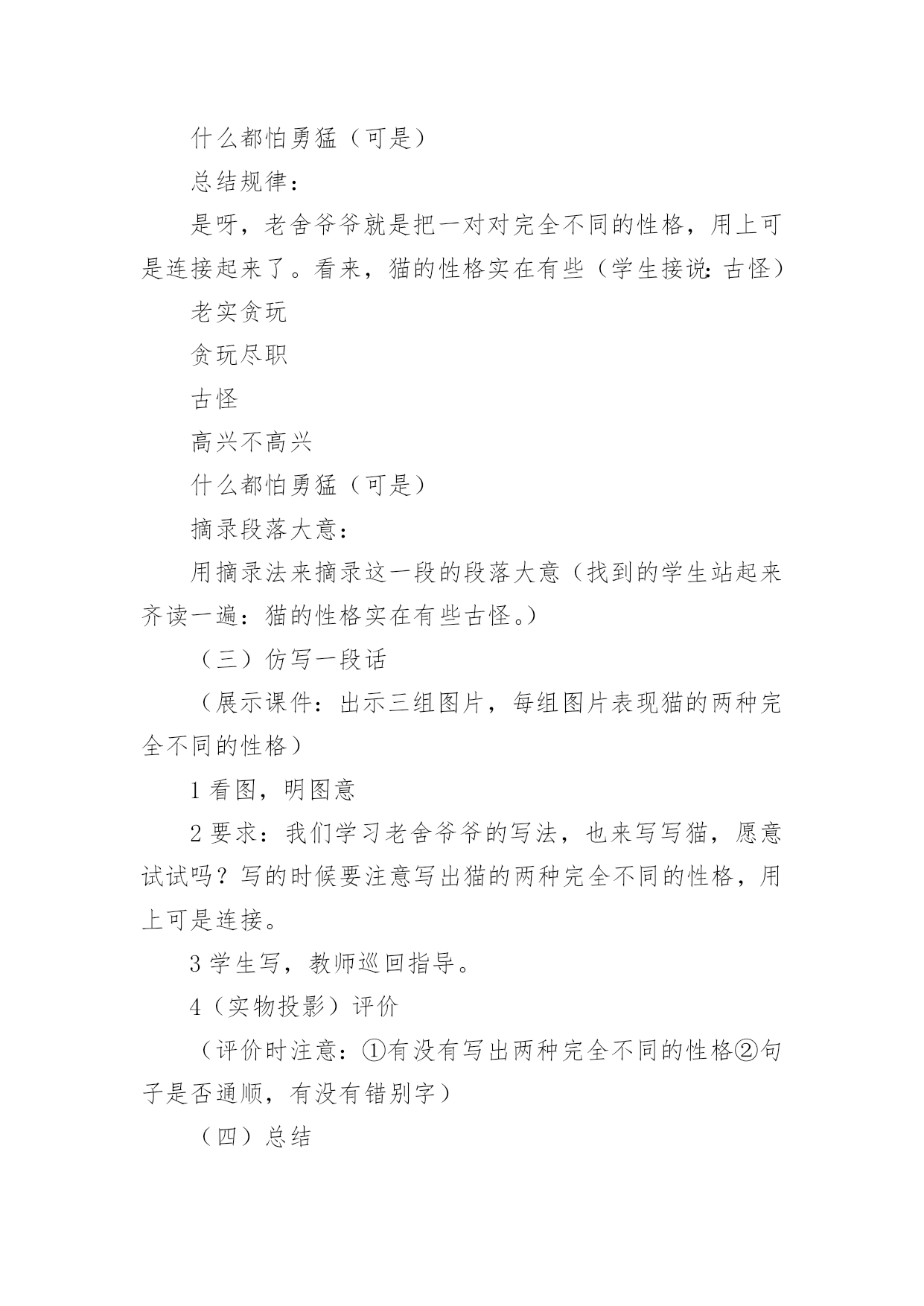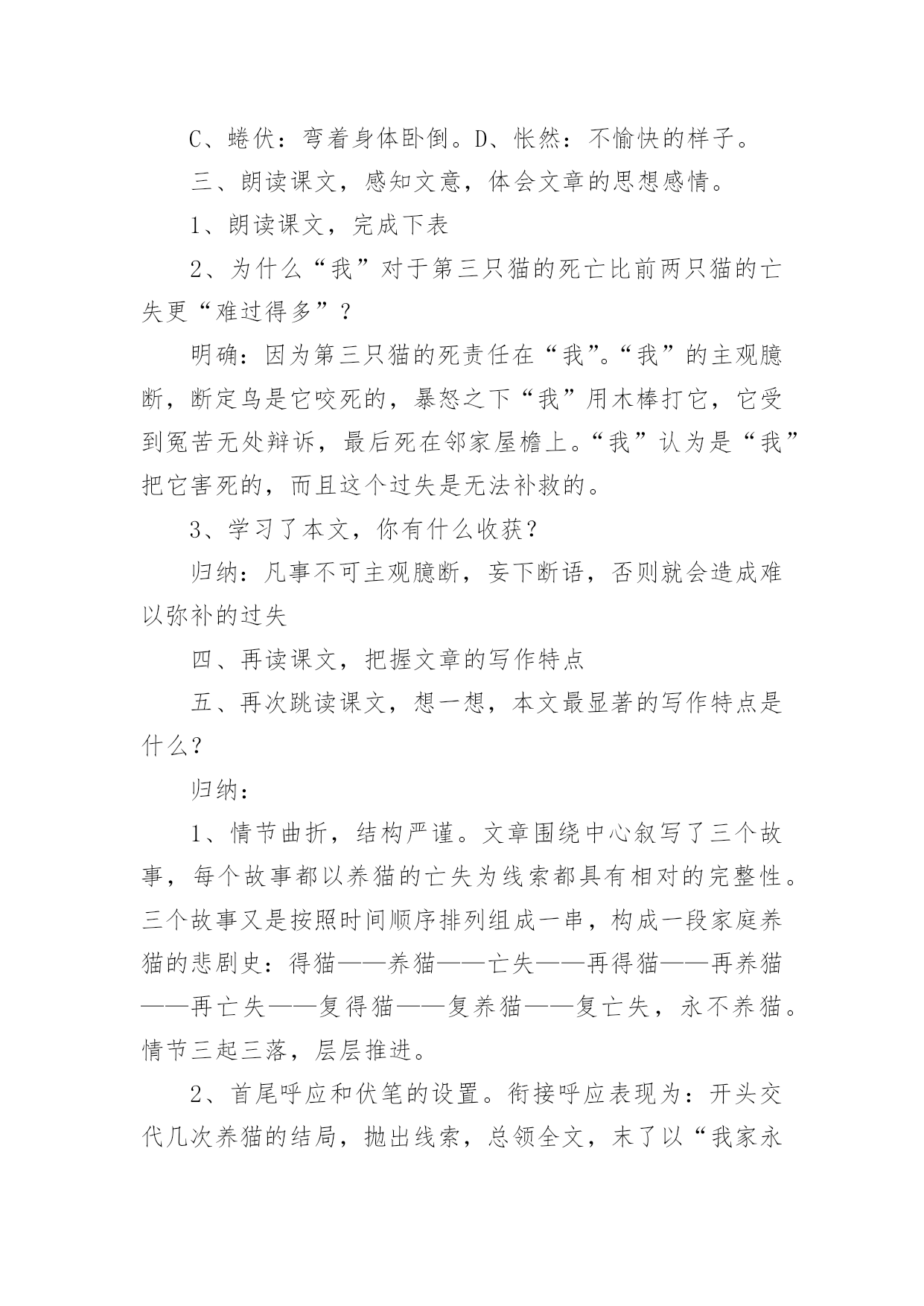 《猫》教学设计小学语文《猫》教学设计作为一位优秀的人民教师,就有可能用到教学设计,借助教学设计可以让教学工作更加有效地进行。你知道什么样的教学设计才能切实有效地帮助到我们吗?下面是小编为大家整理的小学语文《猫》教学设计,供大家参考借鉴,希望可以帮助到有需要的朋友。《猫》教学设计1一、教学目标1、有感情地朗读课文第一段,体会猫的古怪和可爱。2、学习可是的写法,仿写一段话。3、用摘录法概括第一段段落大意。二、教学过程(一)整体感悟课文1导入:很多同学都觉得猫实在很可爱,老舍爷爷这篇《猫》就写得特别好,那他到底怎么写的呢?大家读读第一大段,多读几遍,选一个最喜欢的自然段,待会儿准备读给大家听。我们还要比一比,看谁读得好。2反馈:第一自然段:通过说为什么喜欢这个自然段的理由,体会到猫的可爱,产生对猫的喜爱。第二自然段:你为什么喜欢第2自然段?(学生边说理由,教师边指导朗读)第三自然段:喜欢这一自然段的人站起来读一遍(二)感悟写作规律摘录词语1学生把描写猫性格的词语找出来,写在纸上。2学生写,教师巡回指导3(实物投影)反馈4齐读一遍词语规律感悟咱们来看看这些词语,它们之间好象有什么联系,把它们放到课文中再去读一读,你发现了什么?(学生读完后,小组讨论)(出示课件:第三自然段内容)1、学生回答,得出结论:描写性格的词语是一对对写的,前后表现的性格完全不同。2、指名读(要求读出前后完全不同的感觉)3、还有什么发现?(两种性格之间是用可是连接的)[课件中可是两字变红]4、找出相同写法的自然段,也读出前后不同的感觉。(学生读一对性格,教师随机出现相应的板书)老实贪玩贪玩尽职高兴不高兴什么都怕勇猛(可是)总结规律:是呀,老舍爷爷就是把一对对完全不同的性格,用上可是连接起来了。看来,猫的性格实在有些(学生接说:古怪)老实贪玩贪玩尽职古怪高兴不高兴什么都怕勇猛(可是)摘录段落大意:用摘录法来摘录这一段的段落大意(找到的学生站起来齐读一遍:猫的性格实在有些古怪。)(三)仿写一段话(展示课件:出示三组图片,每组图片表现猫的两种完全不同的性格)1看图,明图意2要求:我们学习老舍爷爷的写法,也来写写猫,愿意试试吗?写的时候要注意写出猫的两种完全不同的性格,用上可是连接。3学生写,教师巡回指导。4(实物投影)评价(评价时注意:①有没有写出两种完全不同的性格②句子是否通顺,有没有错别字)(四)总结今天,我们通过反复朗读,既找到了段落大意,又把学到的知识运用到了写作中去。同学们的收获都很大。《猫》教学设计2教学目标:1、学习掌握本课的生字词。2、感知课文内容,体会文章的思想感情及蕴涵的人生哲理。3、学习文章的写作特色。教学的重点:学习文章的写作特色。教学方法:朗读法,引导法,讨论法教学过程:一、语言导入猫是大家都很熟悉的一种小动物。很多家庭因为猫惹人喜爱而养它。我国著名作家郑振铎先生,他家也曾养过三只小猫。从养这三只小猫的过程中,他领悟到了一些生活的哲理和做人的道理。究竟是什么样的哲理呢?今天,我们一起来学习郑振铎先生的散文《猫》。板书课题、作者)二、预习检测1、给下列黑体字注音。污涩()怂恿()蜷伏()惩戒()怅然()诅骂()红棱()2、下列词语中解释不正确的一项是()A、怂恿:鼓动别人去做。B、预警:预备警察C、蜷伏:弯着身体卧倒。D、怅然:不愉快的样子。三、朗读课文,感知文意,体会文章的思想感情。1、朗读课文,完成下表2、为什么“我”对于第三只猫的死亡比前两只猫的亡失更“难过得多”?明确:因为第三只猫的死责任在“我”。“我”的主观臆断,断定鸟是它咬死的,暴怒之下“我”用木棒打它,它受到冤苦无处辩诉,最后死在邻家屋檐上。“我”认为是“我”把它害死的,而且这个过失是无法补救的。3、学习了本文,你有什么收获?归纳:凡事不可主观臆断,妄下断语,否则就会造成难以弥补的过失四、再读课文,把握文章的写作特点五、再次跳读课文,想一想,本文最显著的写作特点是什么?归纳:1、情节曲折,结构严谨。文章围绕中心叙写了三个故事,每个故事都以养猫的亡失为线索都具有相对的完整性。三个故事又是按照时间顺序排列组成一串,构成一段家庭养猫的悲剧史:得猫——养猫——亡失——再得猫——再养猫——再亡失——复得猫——复养猫——复亡失,永不养猫。情节三起三落,层层推进。2、首尾呼应和伏笔的设置。衔接呼应表现为:开头交代几次养猫的结局,抛出线索,总领全文,末了以“我家永不养猫”收尾,开拓深意,呼应开头。三个故事之间又有过渡段贯通弥合。伏笔的设置表现为:第一只猫忽然消瘦预示其病死;写第二只猫街上乱跑,预示其被人捉走;写第三只猫凝望鸟笼,预示其被冤打致死。所以这些都起到了穿针引线,连珠缀玉的作用,把三个故事和各个故事之间的情节缀连成有机的整体,浑然天成,天衣无缝。六、延伸迁移在生活中,你是否也曾经错怪过