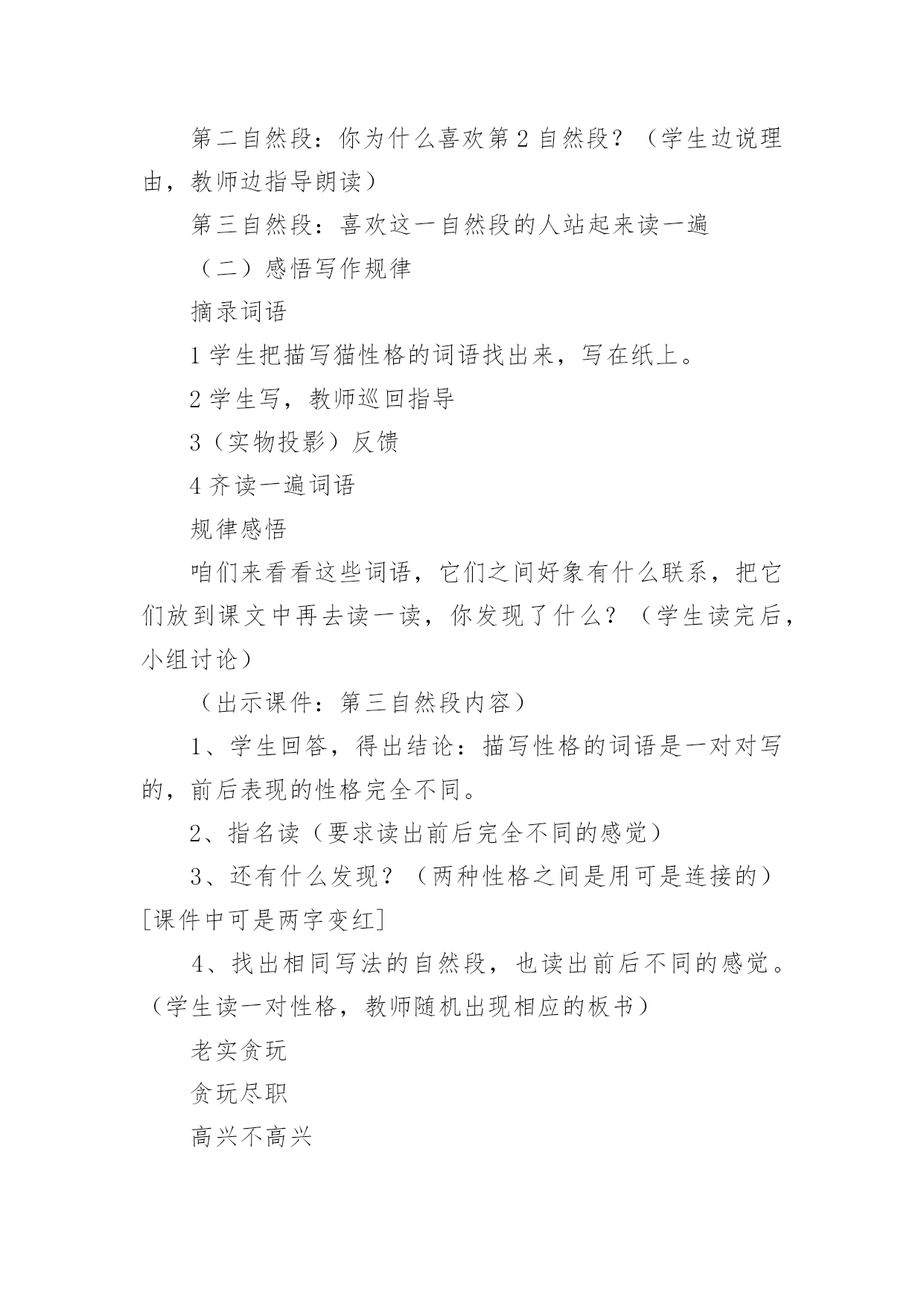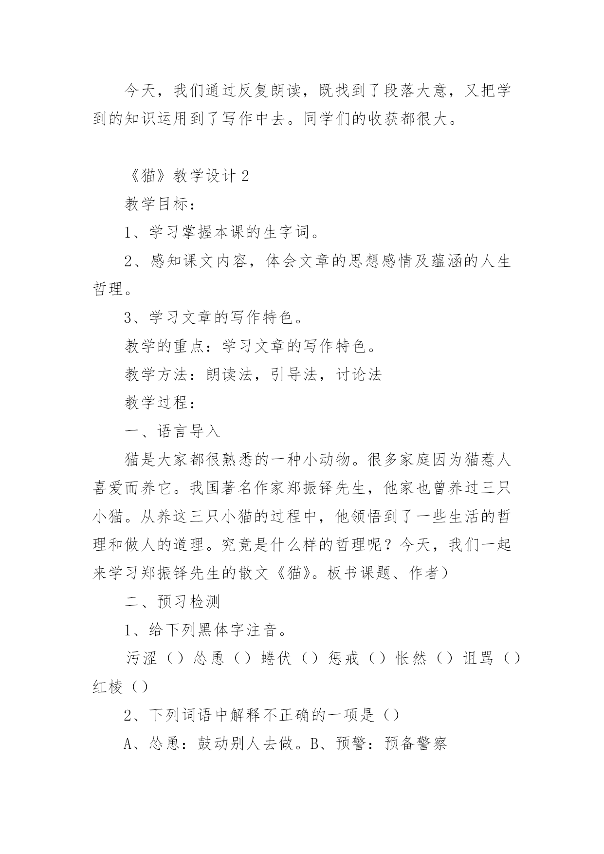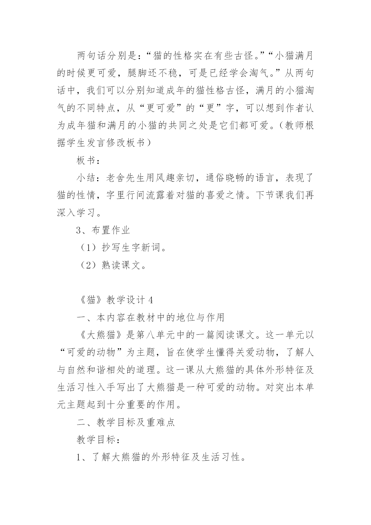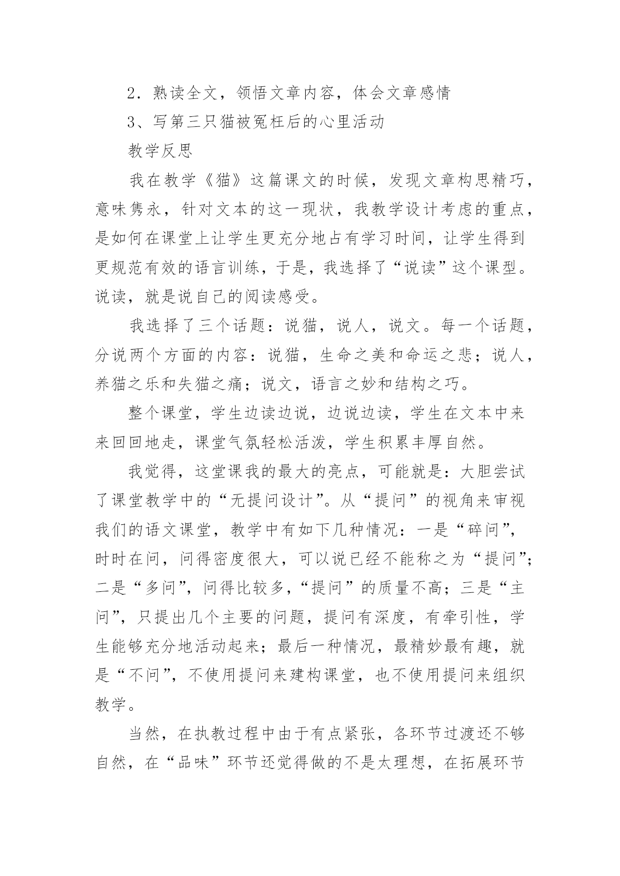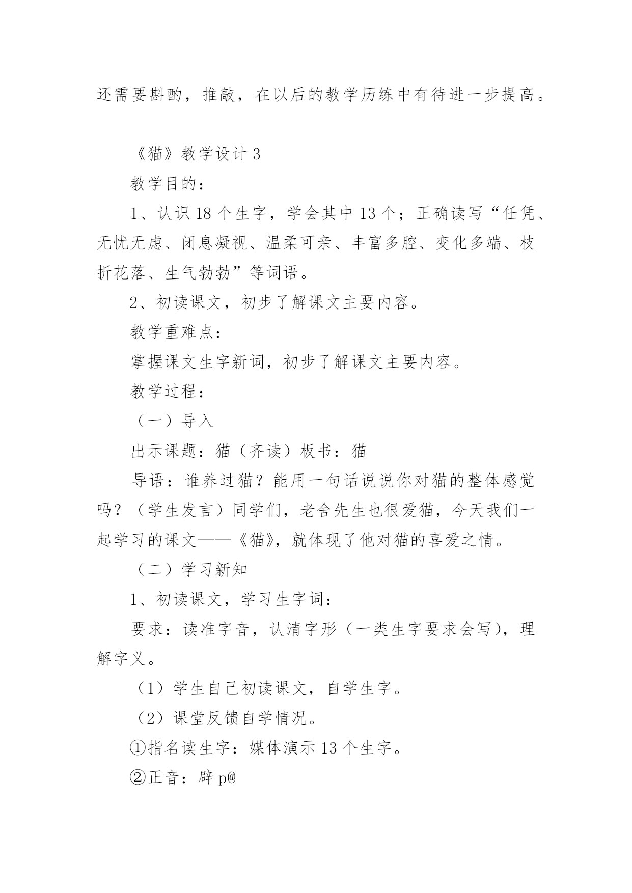 《猫》教学设计小学语文《猫》教学设计作为一位优秀的人民教师,就有可能用到教学设计,借助教学设计可以让教学工作更加有效地进行。你知道什么样的教学设计才能切实有效地帮助到我们吗?下面是小编为大家整理的小学语文《猫》教学设计,供大家参考借鉴,希望可以帮助到有需要的朋友。《猫》教学设计1一、教学目标1、有感情地朗读课文第一段,体会猫的古怪和可爱。2、学习可是的写法,仿写一段话。3、用摘录法概括第一段段落大意。二、教学过程(一)整体感悟课文1导入:很多同学都觉得猫实在很可爱,老舍爷爷这篇《猫》就写得特别好,那他到底怎么写的呢?大家读读第一大段,多读几遍,选一个最喜欢的自然段,待会儿准备读给大家听。我们还要比一比,看谁读得好。2反馈:第一自然段:通过说为什么喜欢这个自然段的理由,体会到猫的可爱,产生对猫的喜爱。第二自然段:你为什么喜欢第2自然段?(学生边说理由,教师边指导朗读)第三自然段:喜欢这一自然段的人站起来读一遍(二)感悟写作规律摘录词语1学生把描写猫性格的词语找出来,写在纸上。2学生写,教师巡回指导3(实物投影)反馈4齐读一遍词语规律感悟咱们来看看这些词语,它们之间好象有什么联系,把它们放到课文中再去读一读,你发现了什么?(学生读完后,小组讨论)(出示课件:第三自然段内容)1、学生回答,得出结论:描写性格的词语是一对对写的,前后表现的性格完全不同。2、指名读(要求读出前后完全不同的感觉)3、还有什么发现?(两种性格之间是用可是连接的)[课件中可是两字变红]4、找出相同写法的自然段,也读出前后不同的感觉。(学生读一对性格,教师随机出现相应的板书)老实贪玩贪玩尽职高兴不高兴什么都怕勇猛(可是)总结规律:是呀,老舍爷爷就是把一对对完全不同的性格,用上可是连接起来了。看来,猫的性格实在有些(学生接说:古怪)老实贪玩贪玩尽职古怪高兴不高兴什么都怕勇猛(可是)摘录段落大意:用摘录法来摘录这一段的段落大意(找到的学生站起来齐读一遍:猫的性格实在有些古怪。)(三)仿写一段话(展示课件:出示三组图片,每组图片表现猫的两种完全不同的性格)1看图,明图意2要求:我们学习老舍爷爷的写法,也来写写猫,愿意试试吗?写的时候要注意写出猫的两种完全不同的性格,用上可是连接。3学生写,教师巡回指导。4(实物投影)评价(评价时注意:①有没有写出两种完全不同的性格②句子是否通顺,有没有错别字)(四)总结今天,我们通过反复朗读,既找到了段落大意,又把学到的知识运用到了写作中去。同学们的收获都很大。《猫》教学设计2教学目标:1、学习掌握本课的生字词。2、感知课文内容,体会文章的思想感情及蕴涵的人生哲理。3、学习文章的写作特色。教学的重点:学习文章的写作特色。教学方法:朗读法,引导法,讨论法教学过程:一、语言导入猫是大家都很熟悉的一种小动物。很多家庭因为猫惹人喜爱而养它。我国著名作家郑振铎先生,他家也曾养过三只小猫。从养这三只小猫的过程中,他领悟到了一些生活的哲理和做人的道理。究竟是什么样的哲理呢?今天,我们一起来学习郑振铎先生的散文《猫》。板书课题、作者)二、预习检测1、给下列黑体字注音。污涩()怂恿()蜷伏()惩戒()怅然()诅骂()红棱()2、下列词语中解释不正确的一项是()A、怂恿:鼓动别人去做。B、预警:预备警察C、蜷伏:弯着身体卧倒。D、怅然:不愉快的样子。三、朗读课文,感知文意,体会文章的思想感情。1、朗读课文,完成下表2、为什么“我”对于第三只猫的死亡比前两只猫的亡失更“难过得多”?明确:因为第三只猫的死责任在“我”。“我”的主观臆断,断定鸟是它咬死的,暴怒之下“我”用木棒打它,它受到冤苦无处辩诉,最后死在邻家屋檐上。“我”认为是“我”把它害死的,而且这个过失是无法补救的。3、学习了本文,你有什么收获?归纳:凡事不可主观臆断,妄下断语,否则就会造成难以弥补的过失四、再读课文,把握文章的写作特点五、再次跳读课文,想一想,本文最显著的写作特点是什么?归纳:1、情节曲折,结构严谨。文章围绕中心叙写了三个故事,每个故事都以养猫的亡失为线索都具有相对的完整性。三个故事又是按照时间顺序排列组成一串,构成一段家庭养猫的悲剧史:得猫——养猫——亡失——再得猫——再养猫——再亡失——复得猫——复养猫——复亡失,永不养猫。情节三起三落,层层推进。2、首尾呼应和伏笔的设置。衔接呼应表现为:开头交代几次养猫的结局,抛出线索,总领全文,末了以“我家永不养猫”收尾,开拓深意,呼应开头。三个故事之间又有过渡段贯通弥合。伏笔的设置表现为:第一只猫忽然消瘦预示其病死;写第二只猫街上乱跑,预示其被人捉走;写第三只猫凝望鸟笼,预示其被冤打致死。所以这些都起到了穿针引线,连珠缀玉的作用,把三个故事和各个故事之间的情节缀连成有机的整体,浑然天成,天衣无缝。六、延伸迁移在生活中,你是否也曾经错怪过
