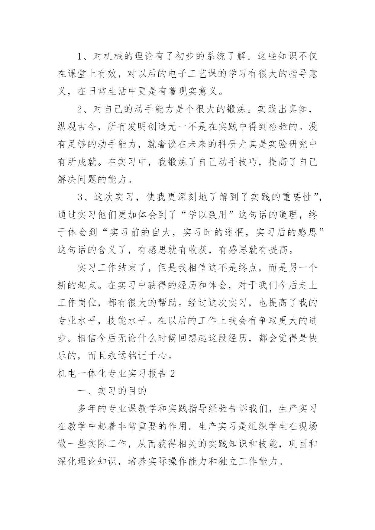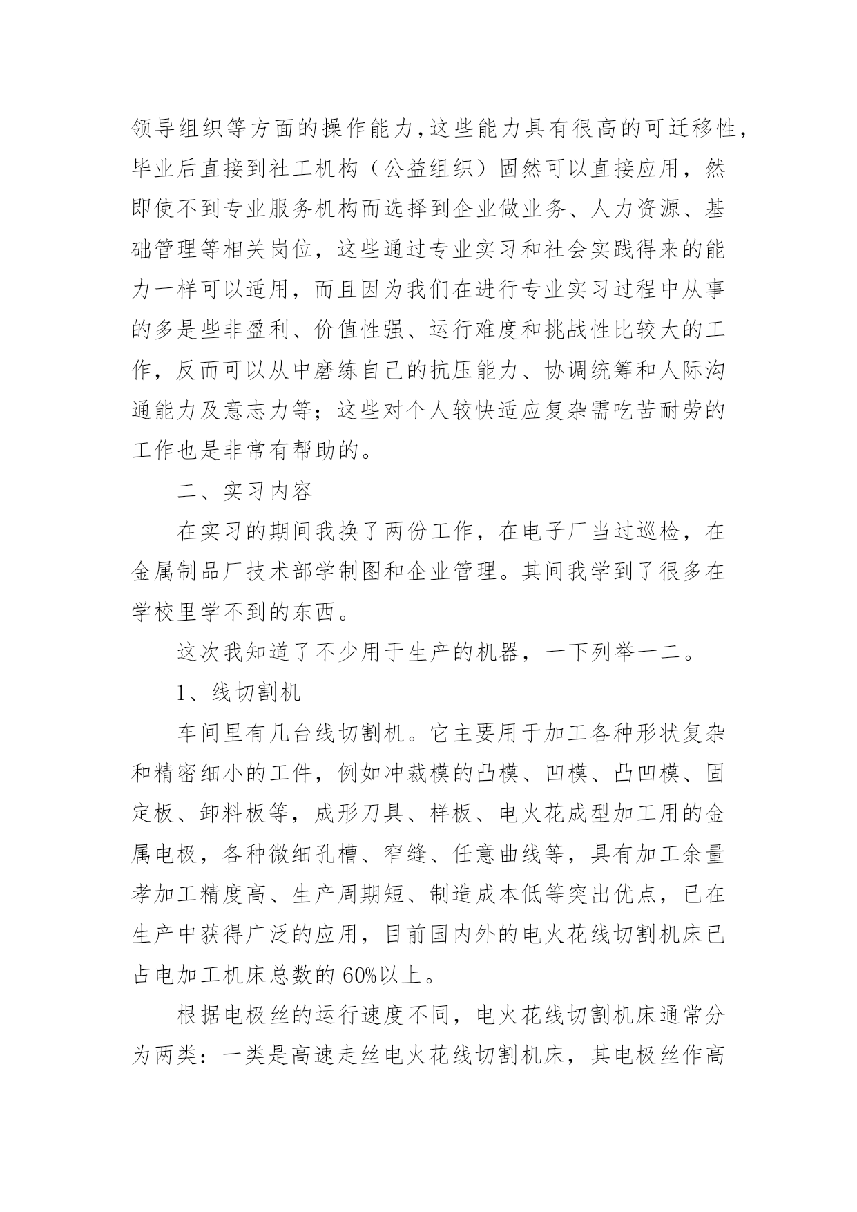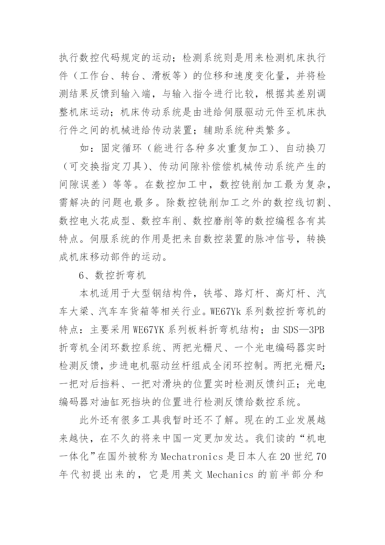 机电一体化专业实习报告机电一体化专业实习报告随着社会不断地进步,报告与我们愈发关系密切,报告具有成文事后性的特点。那么你真正懂得怎么写好报告吗?下面是小编帮大家整理的机电一体化专业实习报告,希望对大家有所帮助。机电一体化专业实习报告1实践单位:x市路桥x机电厂实践课题:机电一体化的实践实践内容:一、实习的认识与意义高校学生实习的重要性目前在人才市场上,许多高校的毕业生频频被用人单位以没有工作经验为由拒之门外。究其原因关键在于实践动手能力较差。多数学生只会纸上谈兵,上岗还需培训。但如果在校学习期间或毕业前期能妥善的进行实习的锻炼和培养将会极大地迅速提高学生的专业素质与能力,为进一步了解、掌握和提高知识水平,调动学生学习、钻研的积极性和为未来毕业求职打下良好实践基础因此,开展高校学生的实习工作是高校教学过程的一个重要环节,是实现高校人才培养目标的有效途径和重要保证。实习可以增强自己在人际沟通、团队合作、语言表达、领导组织等方面的操作能力,这些能力具有很高的可迁移性,毕业后直接到社工机构(公益组织)固然可以直接应用,然即使不到专业服务机构而选择到企业做业务、人力资源、基础管理等相关岗位,这些通过专业实习和社会实践得来的能力一样可以适用,而且因为我们在进行专业实习过程中从事的多是些非盈利、价值性强、运行难度和挑战性比较大的工作,反而可以从中磨练自己的抗压能力、协调统筹和人际沟通能力及意志力等;这些对个人较快适应复杂需吃苦耐劳的工作也是非常有帮助的。二、实习内容在实习的期间我换了两份工作,在电子厂当过巡检,在金属制品厂技术部学制图和企业管理。其间我学到了很多在学校里学不到的东西。这次我知道了不少用于生产的机器,一下列举一二。1、线切割机车间里有几台线切割机。它主要用于加工各种形状复杂和精密细小的工件,例如冲裁模的凸模、凹模、凸凹模、固定板、卸料板等,成形刀具、样板、电火花成型加工用的金属电极,各种微细孔槽、窄缝、任意曲线等,具有加工余量孝加工精度高、生产周期短、制造成本低等突出优点,已在生产中获得广泛的应用,目前国内外的电火花线切割机床已占电加工机床总数的60%以上。根据电极丝的运行速度不同,电火花线切割机床通常分为两类:一类是高速走丝电火花线切割机床,其电极丝作高速往复运动,一般走丝速度为8~10m/s,电极丝可重复使用,加工速度较高,但快速走丝容易造成电极丝抖动和反向时停顿,使加工质量下降,是我国生产和使用的主要机种,也是我国独创的电火花线切割加工模式;另一类是低速走丝电火花线切割机床,其电极丝作低速单向运动,一般走丝速度低于x,电极丝放电后不再使用,工作平稳、均匀、抖动孝加工质量较好,但加工速度较低,是国外生产和使用的主要机种。2、冲床冲床简单的说就是一种冲压的机床,它可以产生一个很强的冲击力。它要和模具配合使用。例如,我要在一批铁皮上做出同样的方孔或其它什么形状的孔,那就用冲床了。首先用硬度大的材料做出模具,一公一母(上下模具)。将铁皮放在公母之间冲床一冲击,公进入母,铁皮就冲出你要的形状了。3、加工中心加工中心是指备有刀库,具有自动换刀功能,对工件一次装夹后进行多工序加工的数控机床。加工中心是高度机电一体化的产品,工件装夹后,数控系统能控制机床按不同工序自动选择、更换刀具,自动对刀、自动改变主轴转速、进给量等,可连续完成钻、镗、铣、铰、攻丝等多种工序。因而大大减少了工件装夹时间,测量和机床调整等辅助工序时间,对加工形状比较复杂,精度要求较高,品种更换频繁的零件具有良好的经济效果。加工中心通常以主轴与工作台相对位置分类,分为卧式、立式和万能加工中心。(1)卧式加工中心:是指主轴轴线与工作台平行设置的加工中心,主要适用于加工箱体类零件。(2)立式加工中心:是指主轴轴线与工作台垂直设置的加工中心,主要适用于加工板类、盘类、模具及小型壳体类复杂零件。(3)万能加工中心(又称多轴联动型加工中心):是指通过加工主轴轴线与工作台回转轴线的角度可控制联动变化,完成复杂空间曲面加工的加工中心。适用于具有复杂空间曲面的叶轮转子、模具、刃具等工件的加工。加工中心采用的标准是机床工具行业内控标准。主要有JB/GQ1140—89《加工中心精度》,JB/GQ1140—89《加工中心精度附则》,JB/GQ1141—89《加工中心技术条件》。标准规定了加工中心的几何精度和工作精度的要求及检验方法。加工中心检验时还须参照JB2670—82《金属切削机床精度检验通则》和GB9061—88《金属切削机床通用技术条件》等标准进行。加工中心按其精度等级可分为普通级和精密级。检验项目一般在30项以上,其细目及检验条件、方法在标准中均有明确规定。一台加工中心全项验收工作是比较复杂的一般需要使用如激光干涉仪、三座标测量机等大型高精度仪器,对机床的机械、电器、液压、气动、
