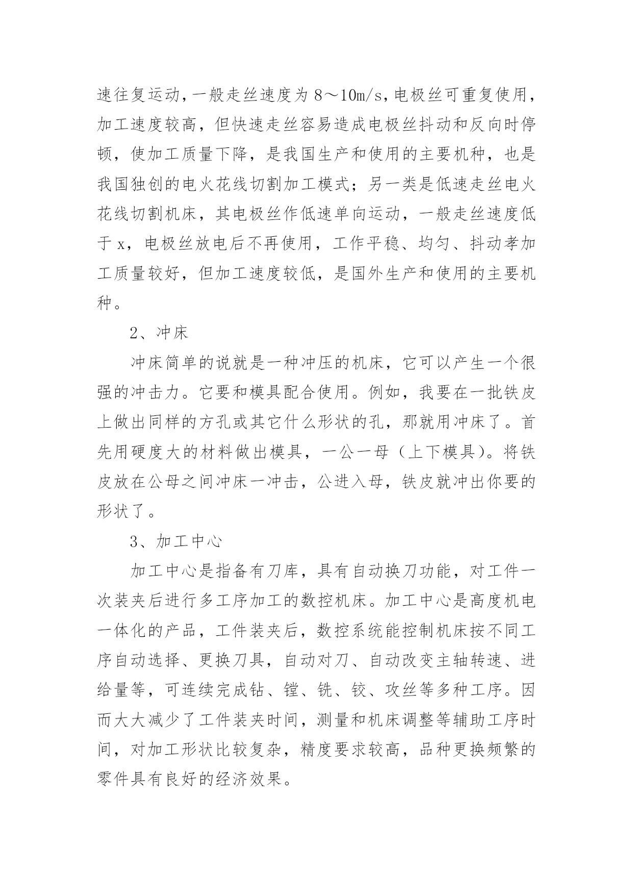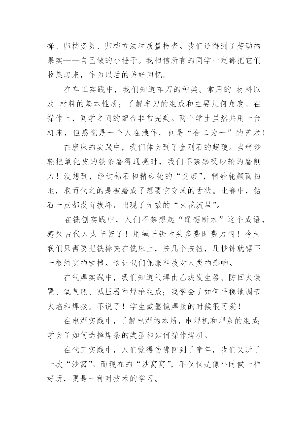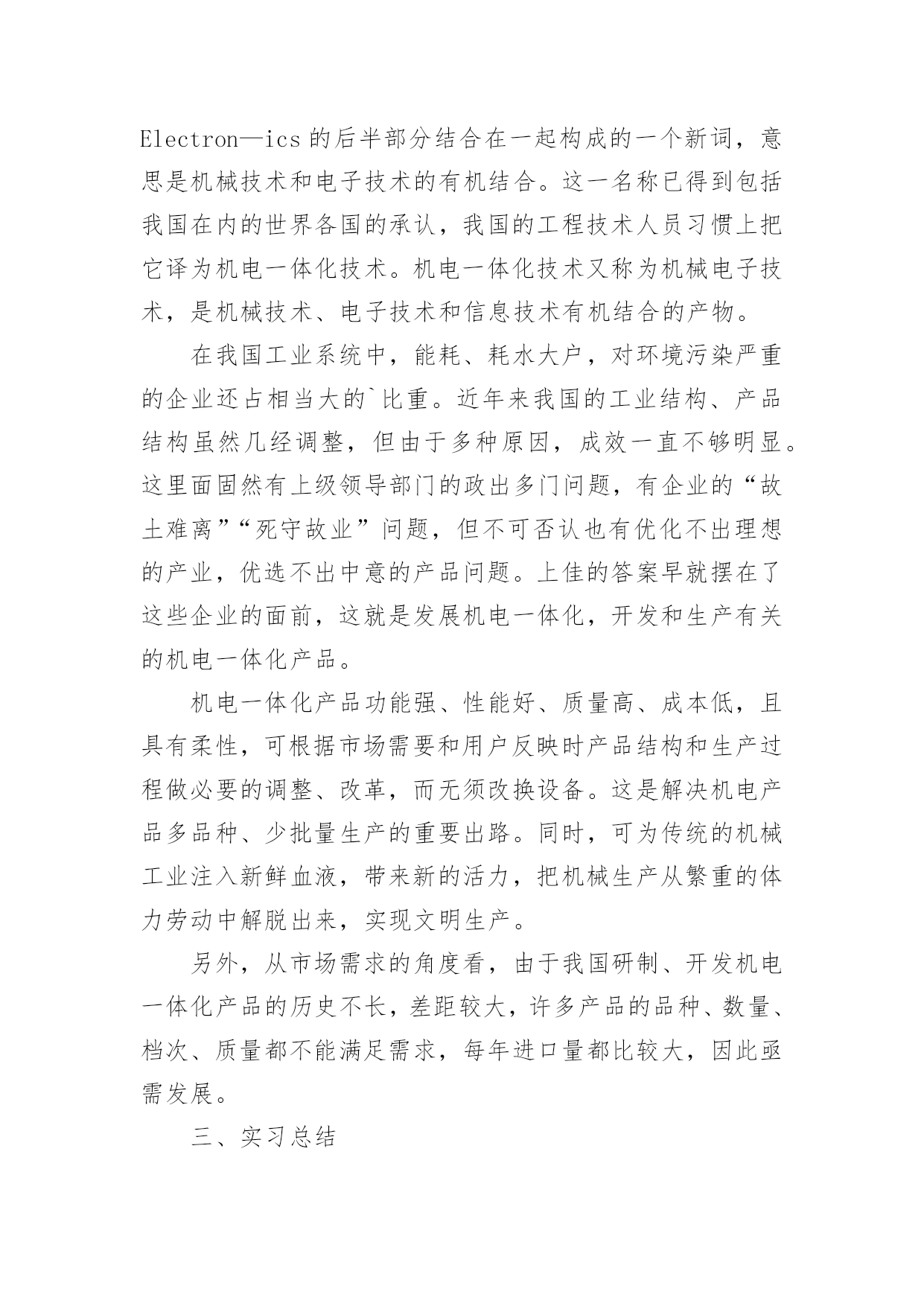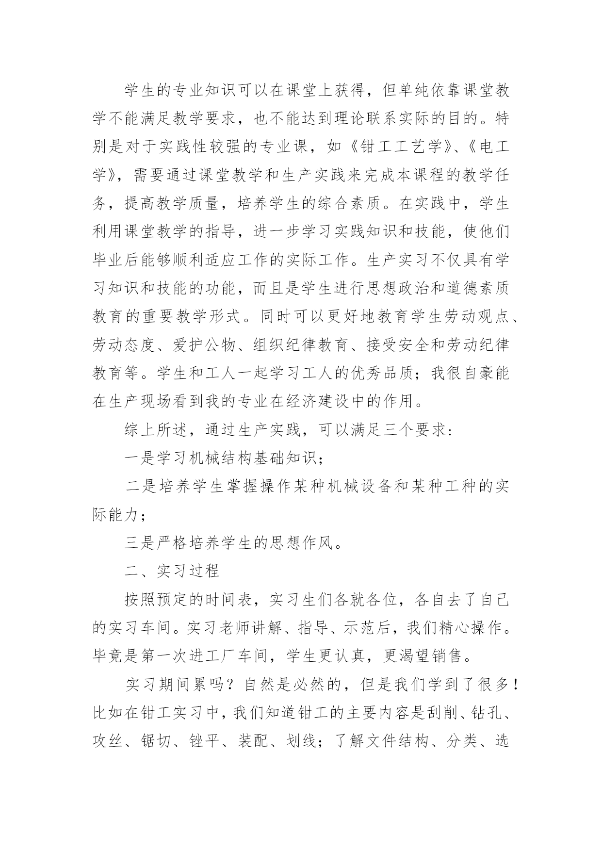 机电一体化专业实习报告机电一体化专业实习报告随着社会不断地进步,报告与我们愈发关系密切,报告具有成文事后性的特点。那么你真正懂得怎么写好报告吗?下面是小编帮大家整理的机电一体化专业实习报告,希望对大家有所帮助。机电一体化专业实习报告1实践单位:x市路桥x机电厂实践课题:机电一体化的实践实践内容:一、实习的认识与意义高校学生实习的重要性目前在人才市场上,许多高校的毕业生频频被用人单位以没有工作经验为由拒之门外。究其原因关键在于实践动手能力较差。多数学生只会纸上谈兵,上岗还需培训。但如果在校学习期间或毕业前期能妥善的进行实习的锻炼和培养将会极大地迅速提高学生的专业素质与能力,为进一步了解、掌握和提高知识水平,调动学生学习、钻研的积极性和为未来毕业求职打下良好实践基础因此,开展高校学生的实习工作是高校教学过程的一个重要环节,是实现高校人才培养目标的有效途径和重要保证。实习可以增强自己在人际沟通、团队合作、语言表达、领导组织等方面的操作能力,这些能力具有很高的可迁移性,毕业后直接到社工机构(公益组织)固然可以直接应用,然即使不到专业服务机构而选择到企业做业务、人力资源、基础管理等相关岗位,这些通过专业实习和社会实践得来的能力一样可以适用,而且因为我们在进行专业实习过程中从事的多是些非盈利、价值性强、运行难度和挑战性比较大的工作,反而可以从中磨练自己的抗压能力、协调统筹和人际沟通能力及意志力等;这些对个人较快适应复杂需吃苦耐劳的工作也是非常有帮助的。二、实习内容在实习的期间我换了两份工作,在电子厂当过巡检,在金属制品厂技术部学制图和企业管理。其间我学到了很多在学校里学不到的东西。这次我知道了不少用于生产的机器,一下列举一二。1、线切割机车间里有几台线切割机。它主要用于加工各种形状复杂和精密细小的工件,例如冲裁模的凸模、凹模、凸凹模、固定板、卸料板等,成形刀具、样板、电火花成型加工用的金属电极,各种微细孔槽、窄缝、任意曲线等,具有加工余量孝加工精度高、生产周期短、制造成本低等突出优点,已在生产中获得广泛的应用,目前国内外的电火花线切割机床已占电加工机床总数的60%以上。根据电极丝的运行速度不同,电火花线切割机床通常分为两类:一类是高速走丝电火花线切割机床,其电极丝作高速往复运动,一般走丝速度为8~10m/s,电极丝可重复使用,加工速度较高,但快速走丝容易造成电极丝抖动和反向时停顿,使加工质量下降,是我国生产和使用的主要机种,也是我国独创的电火花线切割加工模式;另一类是低速走丝电火花线切割机床,其电极丝作低速单向运动,一般走丝速度低于x,电极丝放电后不再使用,工作平稳、均匀、抖动孝加工质量较好,但加工速度较低,是国外生产和使用的主要机种。2、冲床冲床简单的说就是一种冲压的机床,它可以产生一个很强的冲击力。它要和模具配合使用。例如,我要在一批铁皮上做出同样的方孔或其它什么形状的孔,那就用冲床了。首先用硬度大的材料做出模具,一公一母(上下模具)。将铁皮放在公母之间冲床一冲击,公进入母,铁皮就冲出你要的形状了。3、加工中心加工中心是指备有刀库,具有自动换刀功能,对工件一次装夹后进行多工序加工的数控机床。加工中心是高度机电一体化的产品,工件装夹后,数控系统能控制机床按不同工序自动选择、更换刀具,自动对刀、自动改变主轴转速、进给量等,可连续完成钻、镗、铣、铰、攻丝等多种工序。因而大大减少了工件装夹时间,测量和机床调整等辅助工序时间,对加工形状比较复杂,精度要求较高,品种更换频繁的零件具有良好的经济效果。加工中心通常以主轴与工作台相对位置分类,分为卧式、立式和万能加工中心。(1)卧式加工中心:是指主轴轴线与工作台平行设置的加工中心,主要适用于加工箱体类零件。(2)立式加工中心:是指主轴轴线与工作台垂直设置的加工中心,主要适用于加工板类、盘类、模具及小型壳体类复杂零件。(3)万能加工中心(又称多轴联动型加工中心):是指通过加工主轴轴线与工作台回转轴线的角度可控制联动变化,完成复杂空间曲面加工的加工中心。适用于具有复杂空间曲面的叶轮转子、模具、刃具等工件的加工。加工中心采用的标准是机床工具行业内控标准。主要有JB/GQ1140—89《加工中心精度》,JB/GQ1140—89《加工中心精度附则》,JB/GQ1141—89《加工中心技术条件》。标准规定了加工中心的几何精度和工作精度的要求及检验方法。加工中心检验时还须参照JB2670—82《金属切削机床精度检验通则》和GB9061—88《金属切削机床通用技术条件》等标准进行。加工中心按其精度等级可分为普通级和精密级。检验项目一般在30项以上,其细目及检验条件、方法在标准中均有明确规定。一台加工中心全项验收工作是比较复杂的一般需要使用如激光干涉仪、三座标测量机等大型高精度仪器,对机床的机械、电器、液压、气动、