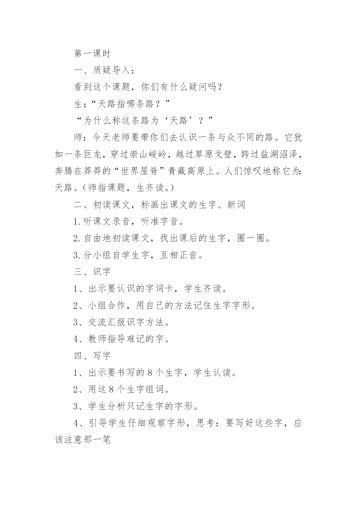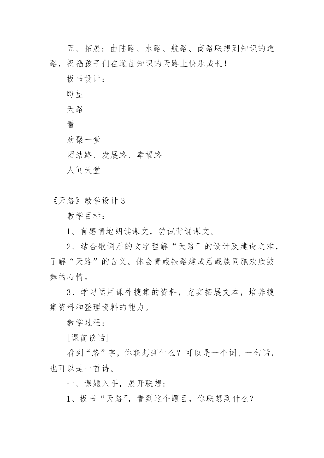 《天路》教学设计作为一名为他人授业解惑的教育工作者,就不得不需要编写教学设计,教学设计是把教学原理转化为教学材料和教学活动的计划。那么写教学设计需要注意哪些问题呢?下面是小编为大家收集的《天路》教学设计,欢迎大家借鉴与参考,希望对大家有所帮助。《天路》教学设计1教材分析:本文是北师大版第八册教材第10单元的第一篇课文。课文与其它文章不同,第一部分为《天路》歌词,第二部分为“[青藏铁路简介]”是为了帮助学生更好地了解青藏铁路。《天路》介绍了青藏铁路称为天路的原因。在高寒缺氧、自然环境恶劣生态环境脆弱、施工条件异常艰苦的条件下建成后藏族同胞欢欣鼓舞的心情。教学目标:1、有感情地朗读课文。2、结合歌词后的文字理解“天路”的含义。感受天路修建之难,意义之大。3、体会青藏铁路建成后藏族同胞欢欣鼓舞的心情。教学重难点:结合《青藏铁路简介》理解“天路”的含义,了解青藏铁路建成的历史意义。教学准备:课件及课外收集有关青藏铁路的资料教学课时:一课时设计理念:通过听、看、读、唱,给孩子们创设一个良好的情景,使孩子们将自己手中的资料融入到文本中,通过不同形式的读来感悟青藏铁路建成后人们欢欣鼓舞的心情。教学过程:一、导入1、课前欣赏视频《火车带我去拉萨》2、由课前活动引入课题—————天路。今天,老师带同学们一起认识这条与众不同的路,她犹如一条巨龙穿过崇山峻岭,越过草原戈壁,跨国盐湖沼泽,奔腾在茫茫的青藏高原上,人们惊叹的称它为“天路”。二、课题质疑:1、看到这个课题,同学们有什么问题要提吗?2、鼓励提问题的学生。三、展示资料,引导整理资料,进行学法指导。1、学生展示收集资料。2、引导整理手中的资料。一类是:青藏高原恶劣的环境。(课件出示有关恶劣环境词语)一类是:青藏铁路世界之最。(课件出示)四、结合资料及简介理解“天路”1、用自己喜欢的.方式读简介部分,思考:你从那些地方体会到青藏铁路是一条神奇的天路?圈一圈、画一画,在书中做批注。2、学生回报3、教师相机总结。青藏铁路海拔之高、线路之长、修建之难、作用之大……所以我们称它为“天路”。(PPT课件,感受天路)4、说话练习:理解青藏铁路为什么被称为“天路”?谁能用关联词语“因为……所以……”来说一说青藏铁路为什么被称其为“天路”呢?。五、品读歌词。1、听录音范读,感知十个情感2、指名读歌词1、2节,说一说这两个小节表达了作者怎样的美好愿望?(盼)3、你从哪里看出来的?4、感情朗读1、2小节,读出期盼之情。5、带着虔诚指名读这3、4、5小节。谁能用一个字来概括?6、体会意义之大。欣赏图片体会藏族人民欢欣鼓舞的心情7、感情朗读,读出赞美欢欣鼓舞的心情拓展:请你想想它还是一条什么路?8、感情朗读全文。(范读—齐读—男女生分组读)六、总结全文。七、升华感情,欣赏《天路》mtv,师生唱板书设计:盼天路团结路、发展路、幸福路赞《天路》教学设计2教学目标:1、掌握生字、新词,有感情地朗读并背诵课文。2、结合歌词后的文字理解天路的设计及建设之难,理解天路的含义。3、通过学习,体会青藏铁路建成后藏族同胞欢欣鼓舞的心情。教学重难点:1、理解天路的含义。2、培养学生搜集资料和整理资料的能力。教学准备:1、学生搜集关于青藏铁路的资料。2、教师准备小黑板和多媒体资料。课时设计:第二课时设计意图:通过听、读、悟、唱四个方面给孩子创设一个良好的情景,使孩子们将自己动手搜集到的资料融入到文本中,通过不同形式的读来深刻感悟建成青藏铁路后人们欢欣鼓舞的心情。让动听的歌、感人的故事和孩子们快乐的歌唱把这首诗歌表现得淋漓尽致。教学过程:一、激情导入:1、孩子蜜看多媒体资料2、观看后谈感受二、带着喜悦的心情齐读全诗三、悟课文:1、师问:你知道当时工人们是在怎样的条件下修建铁路的.吗?(生汇报搜集的资料,并感悟到当时环境的恶劣,修建的艰难。)2、指明读2、3小节谈感想1)生勾画出如果铁路修到我家乡,给家乡带来的变化2)教师导读,生感悟青藏铁路建成后会带来的变化3)从重点词盼望中感悟人们对铁路的渴望3、师汇报搜集的资料,并用一个老兵的故事感染孩子们的心灵4、男女生对比读第2和第4自然段,体会人们实现愿望的心情5、师加感叹词啊,生齐读第5小节。让学生体会铁路修到我家乡,人们的激动与开心。四、观看多媒体并齐唱《天路》五、拓展:由陆路、水路、航路、商路联想到知识的道路,祝福孩子们在通往知识的天路上快乐成长!板书设计:盼望天路看欢聚一堂团结路、发展路、幸福路人间天堂《天路》教学设计3教学目标:1、有感情地朗读课文,尝试背诵课文。2、结合歌词后的文字理解“天路”的设计及建设之难,了解“天路”的含义。体会青藏铁路建成后藏族同胞欢欣鼓舞的心情。3、学习运用课外搜集的资料,充实拓展文本,培养搜集资料和整理资料的能力。教学过程:[课前谈话]看到“路”字,你联想
