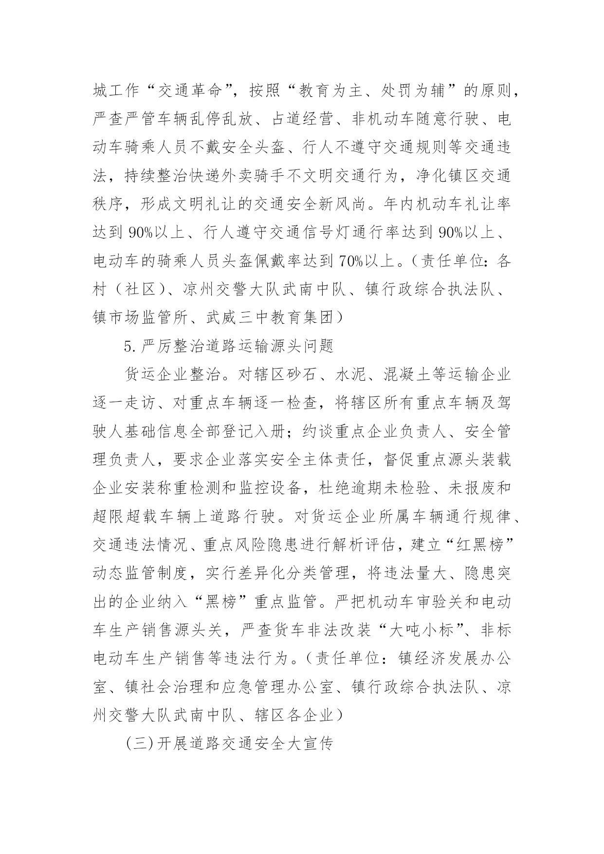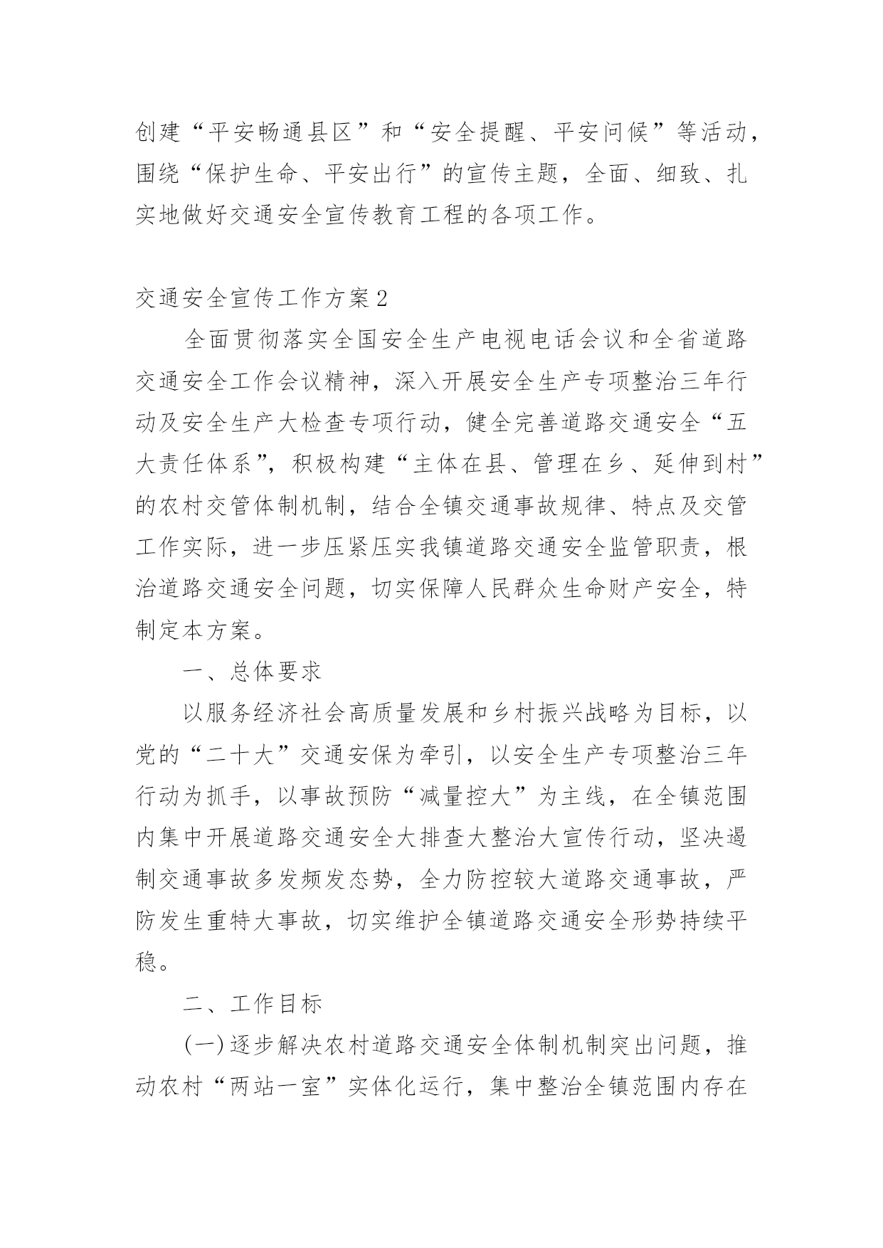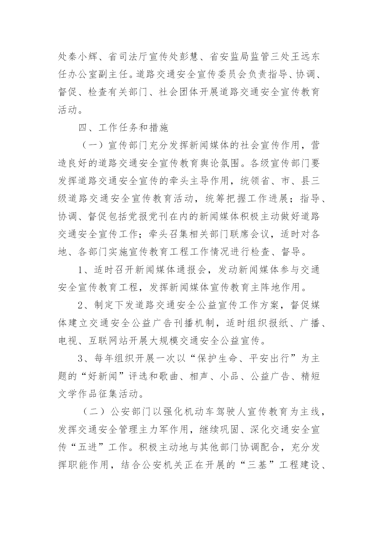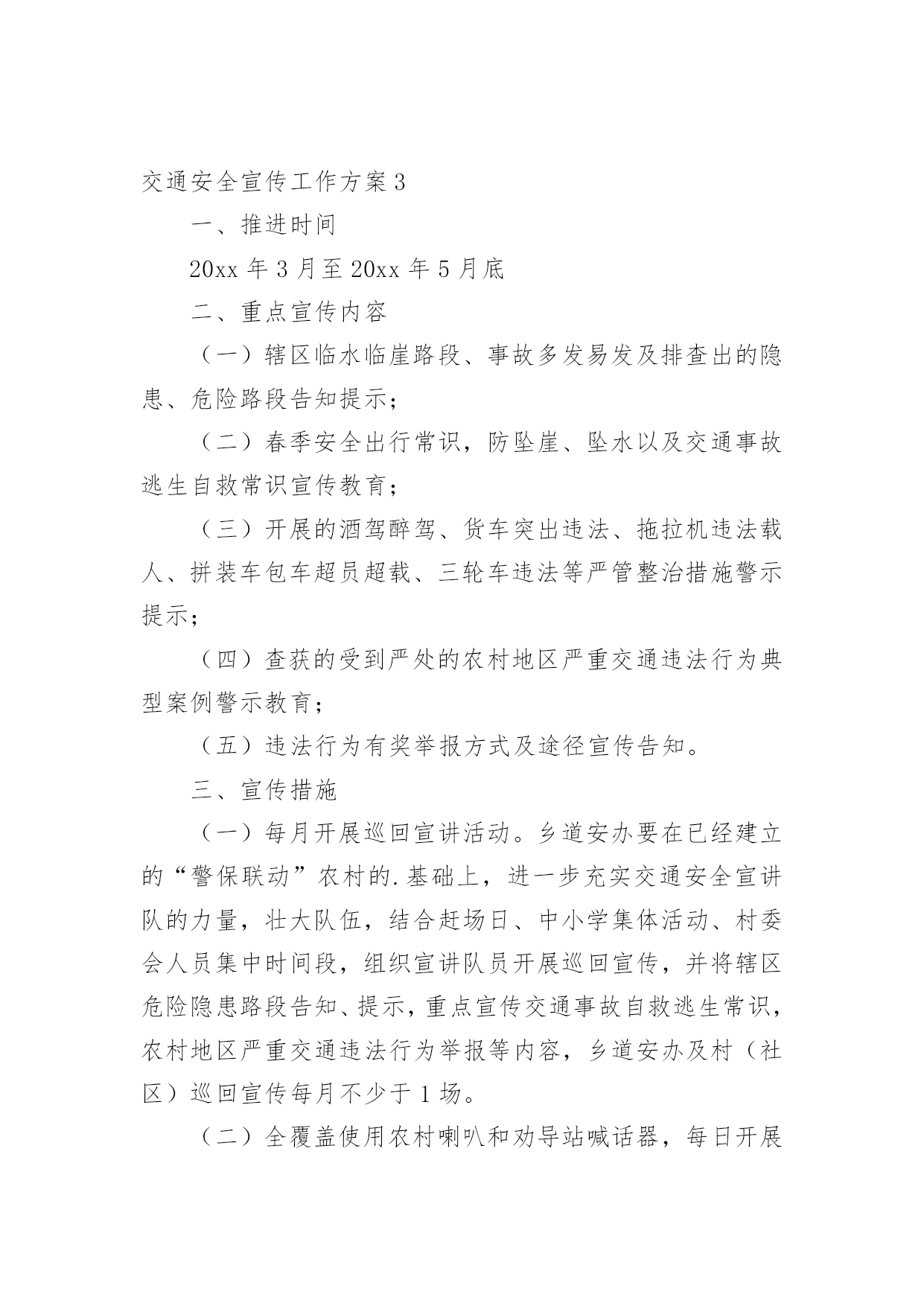 交通安全宣传工作方案为了确保事情或工作扎实开展,通常会被要求事先制定方案,方案是在案前得出的方法计划。写方案需要注意哪些格式呢?以下是小编帮大家整理的交通安全宣传工作方案,欢迎大家借鉴与参考,希望对大家有所帮助。交通安全宣传工作方案1为深入贯彻落实预防道路交通事故“五整顿”、“三加强”工作措施,扎实推进道路交通安全宣传教育工作,根据中宣部、公安部等五部局《“保护生命、平安出行”交通安全宣传教育工程实施方案》,中共江西省委宣传部、江西省公安厅、江西省教育厅、江西省交通厅、江西省司法厅、江西省安监局共同决定,从现在起至在全省实施“保护生命,平安出行”道路交通安全宣传教育工程,现提出如下实施方案:一、指导思想以邓小平理论和“三个代表”重要思想为指导,以科学发展观统领全局,按照“政府领导、部门负责、齐抓共管”的总体要求,坚持标本兼治、重在治本的原则,以实施“保护生命、平安出行”交通安全宣传教育工程为载体,充分利用社会力量和现代传媒,结合荣辱观教育,大力开展道路交通安全宣传教育活动,提高全民道路交通安全意识、法治意识和交通文明意识,打造安全、畅通、和谐的道路交通环境。二、工作目标以保障人民群众生命财产安全为根本出发点、以遏制重特大道路交通事故为重点、以“保护生命,安全出行”为交通安全宣传教育工程总主题,通过三年的努力,形成省、市、县三级宣传、公安、教育、交通、司法、安全监管部门齐抓共管的交通安全宣传工作机制,落实宣传教育责任,逐步实现交通安全宣传组织社会化、宣传工作制度化、宣传形式多样化、宣传内容系统化;普及交通安全法规和安全常识,使广大机动车驾驶人、农村村民、城镇居民、在校学生、农民工等交通参与者的交通法治观念和安全意识明显增强,实现道路交通违法明显减少,交通事故明显下降,最终达到保护人民群众生命财产安全、保障社会经济持续健康发展、维护社会政治稳定的`工作目标。三、组织领导在各级党委、政府的领导下,各部门分工负责,齐抓共管,形成道路交通安全宣传教育全社会参与的格局。成立省、市、县(市、区)三级道路交通安全宣传委员会,委员会成员由相关部门分管领导组成。省委宣传部陈东有副部长任省道路交通安全宣传委员会主任,省公安厅罗永银副厅长、省教育厅王占铭副厅长、省交通厅万明副厅长、省司法厅邓奕强副厅长、省安全生产监督管理局许学政副局长任副主任。委员会下设办公室,地点设在省公安厅交警总队。办公室主任由省公安厅交警总队主持工作的郁耀平副总队长担任,省委宣传部宣传处处长鄢平原、省公安厅交警总队调研员龙毅任常务副主任,省教育厅基础教育处何少加、省交通厅运安处秦小辉、省司法厅宣传处彭慧、省安监局监管三处王远东任办公室副主任。道路交通安全宣传委员会负责指导、协调、督促、检查有关部门、社会团体开展道路交通安全宣传教育活动。四、工作任务和措施(一)宣传部门充分发挥新闻媒体的社会宣传作用,营造良好的道路交通安全宣传教育舆论氛围。各级宣传部门要发挥道路交通安全宣传的牵头主导作用,统领省、市、县三级道路交通安全宣传教育活动,统筹把握工作进展;指导、协调、督促包括党报党刊在内的新闻媒体积极主动做好道路交通安全宣传工作;牵头召集相关部门联席会议,适时对各地、各部门实施宣传教育工程工作情况进行检查、督导。1、适时召开新闻媒体通报会,发动新闻媒体参与交通安全宣传教育工程,发挥新闻媒体宣传教育主阵地作用。2、制定下发道路交通安全公益宣传工作方案,督促媒体建立交通安全公益广告刊播机制,适时组织报纸、广播、电视、互联网站开展大规模交通安全公益宣传。3、每年组织开展一次以“保护生命、平安出行”为主题的“好新闻”评选和歌曲、相声、小品、公益广告、精短文学作品征集活动。(二)公安部门以强化机动车驾驶人宣传教育为主线,发挥交通安全管理主力军作用,继续巩固、深化交通安全宣传“五进”工作。积极主动地与其他部门协调配合,充分发挥职能作用,结合公安机关正在开展的“三基”工程建设、创建“平安畅通县区”和“安全提醒、平安问候”等活动,围绕“保护生命、平安出行”的宣传主题,全面、细致、扎实地做好交通安全宣传教育工程的各项工作。交通安全宣传工作方案2全面贯彻落实全国安全生产电视电话会议和全省道路交通安全工作会议精神,深入开展安全生产专项整治三年行动及安全生产大检查专项行动,健全完善道路交通安全“五大责任体系”,积极构建“主体在县、管理在乡、延伸到村”的农村交管体制机制,结合全镇交通事故规律、特点及交管工作实际,进一步压紧压实我镇道路交通安全监管职责,根治道路交通安全问题,切实保障人民群众生命财产安全,特制定本方案。一、总体要求以服务经济社会高质量发展和乡村振兴战略为目标,以党的“二十大”交通安保为牵引,以安全生产专项整治三年行动为抓手,以事故预防“减量控大”为主线,在全镇范围内集中开展道路交通安全大排查大