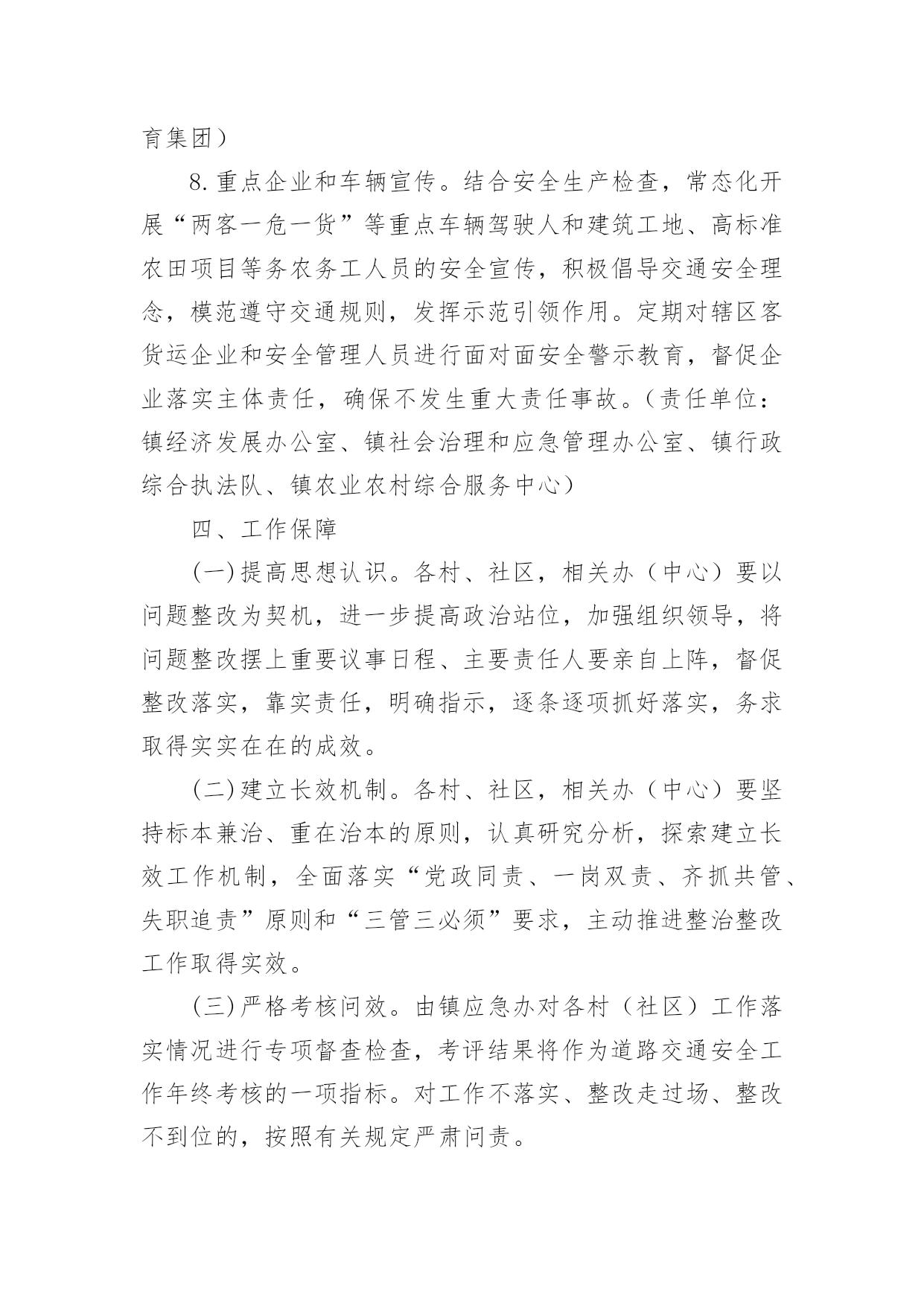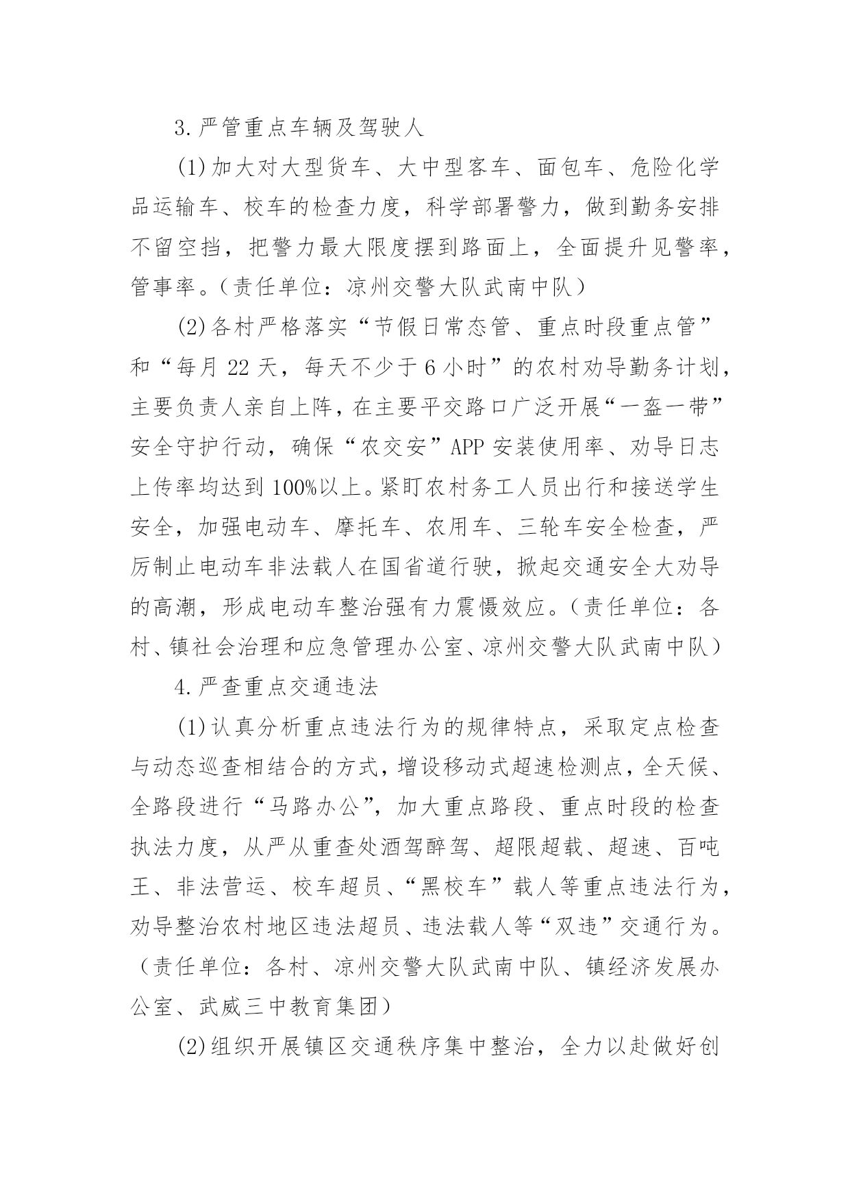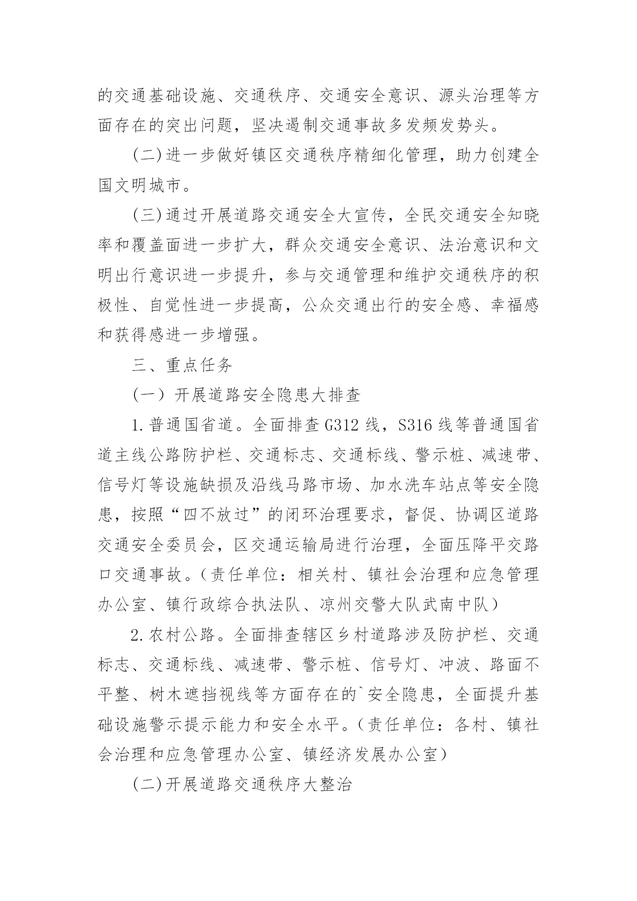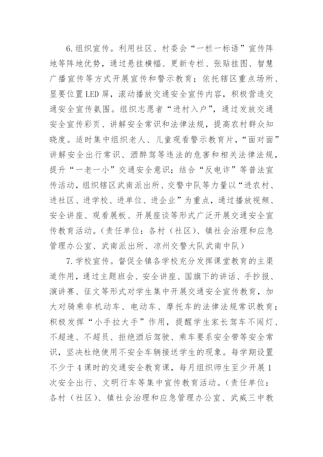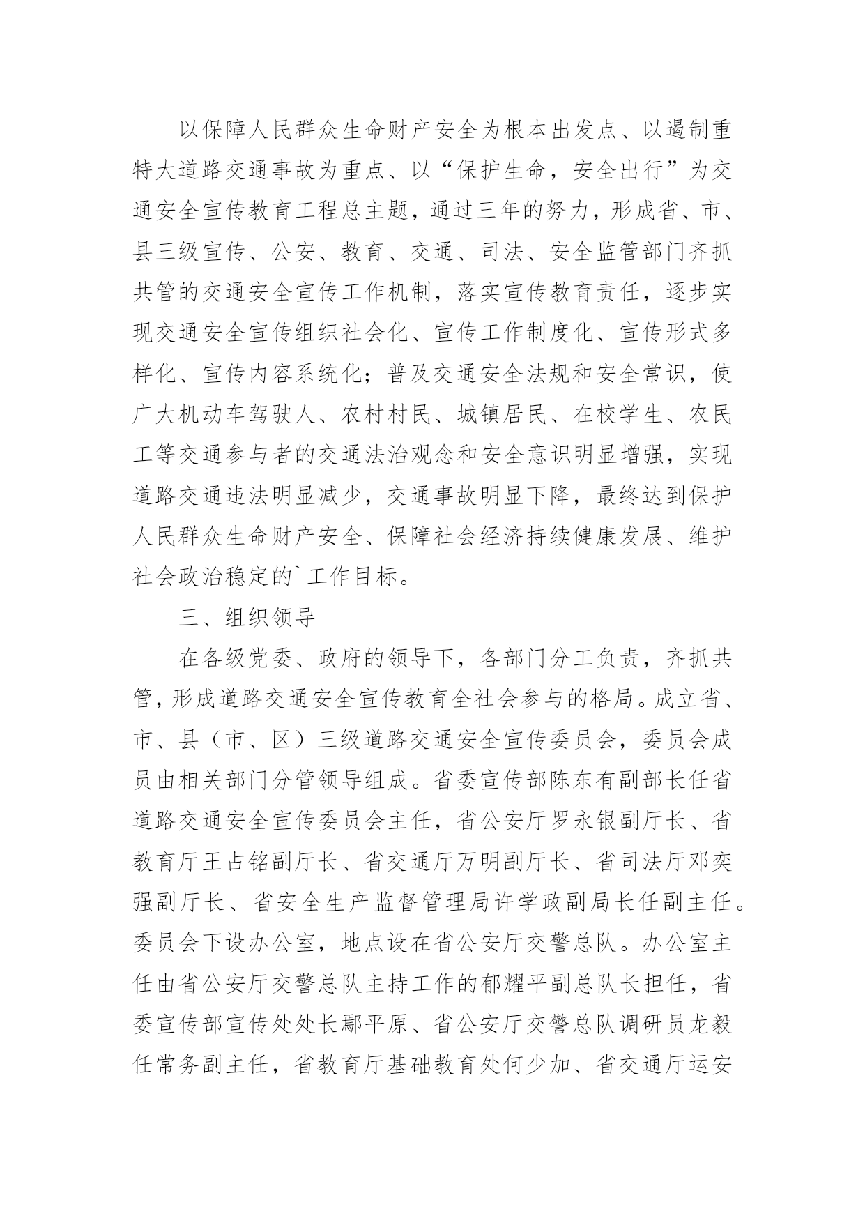 交通安全宣传工作方案为了确保事情或工作扎实开展,通常会被要求事先制定方案,方案是在案前得出的方法计划。写方案需要注意哪些格式呢?以下是小编帮大家整理的交通安全宣传工作方案,欢迎大家借鉴与参考,希望对大家有所帮助。交通安全宣传工作方案1为深入贯彻落实预防道路交通事故“五整顿”、“三加强”工作措施,扎实推进道路交通安全宣传教育工作,根据中宣部、公安部等五部局《“保护生命、平安出行”交通安全宣传教育工程实施方案》,中共江西省委宣传部、江西省公安厅、江西省教育厅、江西省交通厅、江西省司法厅、江西省安监局共同决定,从现在起至在全省实施“保护生命,平安出行”道路交通安全宣传教育工程,现提出如下实施方案:一、指导思想以邓小平理论和“三个代表”重要思想为指导,以科学发展观统领全局,按照“政府领导、部门负责、齐抓共管”的总体要求,坚持标本兼治、重在治本的原则,以实施“保护生命、平安出行”交通安全宣传教育工程为载体,充分利用社会力量和现代传媒,结合荣辱观教育,大力开展道路交通安全宣传教育活动,提高全民道路交通安全意识、法治意识和交通文明意识,打造安全、畅通、和谐的道路交通环境。二、工作目标以保障人民群众生命财产安全为根本出发点、以遏制重特大道路交通事故为重点、以“保护生命,安全出行”为交通安全宣传教育工程总主题,通过三年的努力,形成省、市、县三级宣传、公安、教育、交通、司法、安全监管部门齐抓共管的交通安全宣传工作机制,落实宣传教育责任,逐步实现交通安全宣传组织社会化、宣传工作制度化、宣传形式多样化、宣传内容系统化;普及交通安全法规和安全常识,使广大机动车驾驶人、农村村民、城镇居民、在校学生、农民工等交通参与者的交通法治观念和安全意识明显增强,实现道路交通违法明显减少,交通事故明显下降,最终达到保护人民群众生命财产安全、保障社会经济持续健康发展、维护社会政治稳定的`工作目标。三、组织领导在各级党委、政府的领导下,各部门分工负责,齐抓共管,形成道路交通安全宣传教育全社会参与的格局。成立省、市、县(市、区)三级道路交通安全宣传委员会,委员会成员由相关部门分管领导组成。省委宣传部陈东有副部长任省道路交通安全宣传委员会主任,省公安厅罗永银副厅长、省教育厅王占铭副厅长、省交通厅万明副厅长、省司法厅邓奕强副厅长、省安全生产监督管理局许学政副局长任副主任。委员会下设办公室,地点设在省公安厅交警总队。办公室主任由省公安厅交警总队主持工作的郁耀平副总队长担任,省委宣传部宣传处处长鄢平原、省公安厅交警总队调研员龙毅任常务副主任,省教育厅基础教育处何少加、省交通厅运安处秦小辉、省司法厅宣传处彭慧、省安监局监管三处王远东任办公室副主任。道路交通安全宣传委员会负责指导、协调、督促、检查有关部门、社会团体开展道路交通安全宣传教育活动。四、工作任务和措施(一)宣传部门充分发挥新闻媒体的社会宣传作用,营造良好的道路交通安全宣传教育舆论氛围。各级宣传部门要发挥道路交通安全宣传的牵头主导作用,统领省、市、县三级道路交通安全宣传教育活动,统筹把握工作进展;指导、协调、督促包括党报党刊在内的新闻媒体积极主动做好道路交通安全宣传工作;牵头召集相关部门联席会议,适时对各地、各部门实施宣传教育工程工作情况进行检查、督导。1、适时召开新闻媒体通报会,发动新闻媒体参与交通安全宣传教育工程,发挥新闻媒体宣传教育主阵地作用。2、制定下发道路交通安全公益宣传工作方案,督促媒体建立交通安全公益广告刊播机制,适时组织报纸、广播、电视、互联网站开展大规模交通安全公益宣传。3、每年组织开展一次以“保护生命、平安出行”为主题的“好新闻”评选和歌曲、相声、小品、公益广告、精短文学作品征集活动。(二)公安部门以强化机动车驾驶人宣传教育为主线,发挥交通安全管理主力军作用,继续巩固、深化交通安全宣传“五进”工作。积极主动地与其他部门协调配合,充分发挥职能作用,结合公安机关正在开展的“三基”工程建设、创建“平安畅通县区”和“安全提醒、平安问候”等活动,围绕“保护生命、平安出行”的宣传主题,全面、细致、扎实地做好交通安全宣传教育工程的各项工作。交通安全宣传工作方案2全面贯彻落实全国安全生产电视电话会议和全省道路交通安全工作会议精神,深入开展安全生产专项整治三年行动及安全生产大检查专项行动,健全完善道路交通安全“五大责任体系”,积极构建“主体在县、管理在乡、延伸到村”的农村交管体制机制,结合全镇交通事故规律、特点及交管工作实际,进一步压紧压实我镇道路交通安全监管职责,根治道路交通安全问题,切实保障人民群众生命财产安全,特制定本方案。一、总体要求以服务经济社会高质量发展和乡村振兴战略为目标,以党的“二十大”交通安保为牵引,以安全生产专项整治三年行动为抓手,以事故预防“减量控大”为主线,在全镇范围内集中开展道路交通安全大排查大