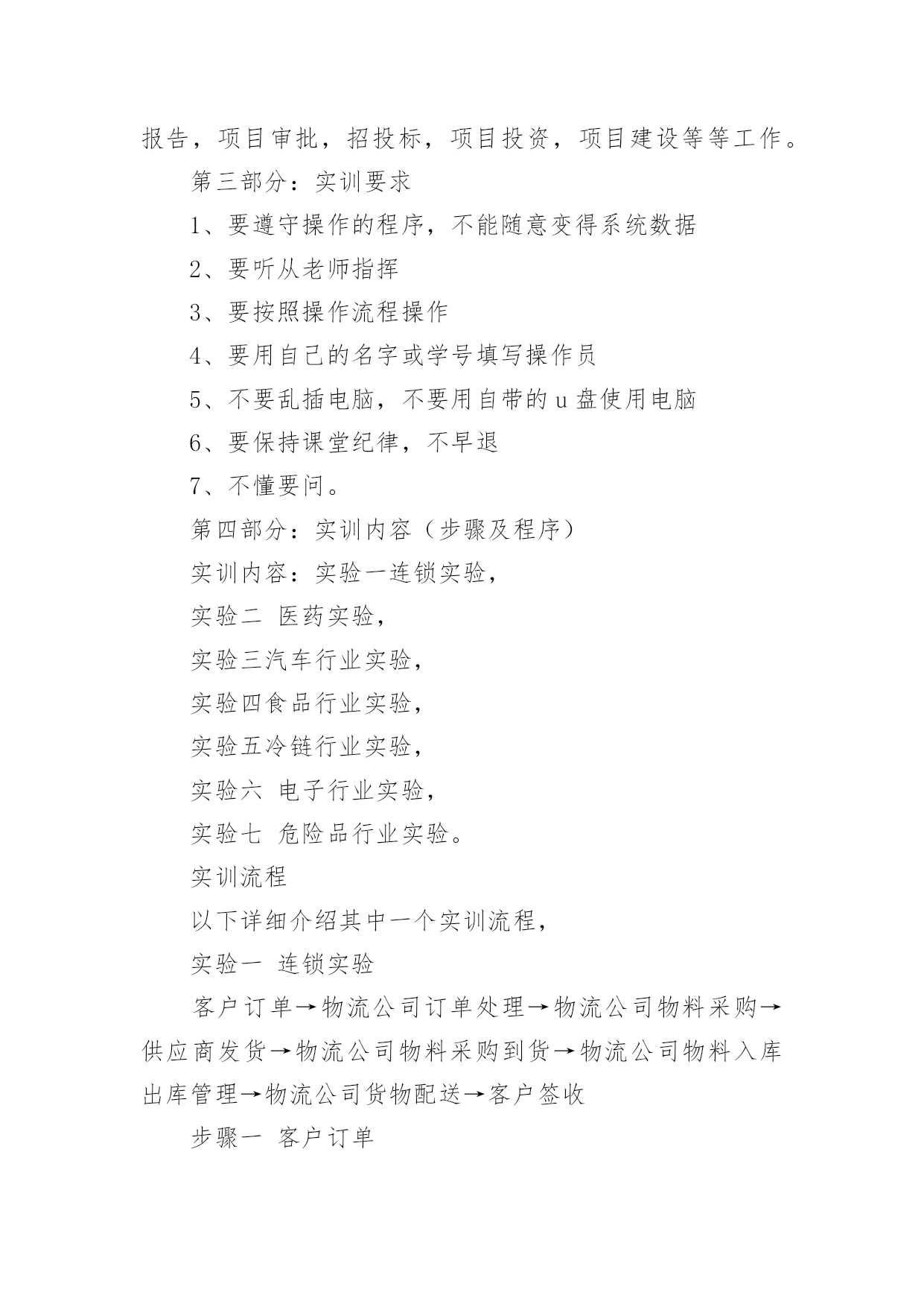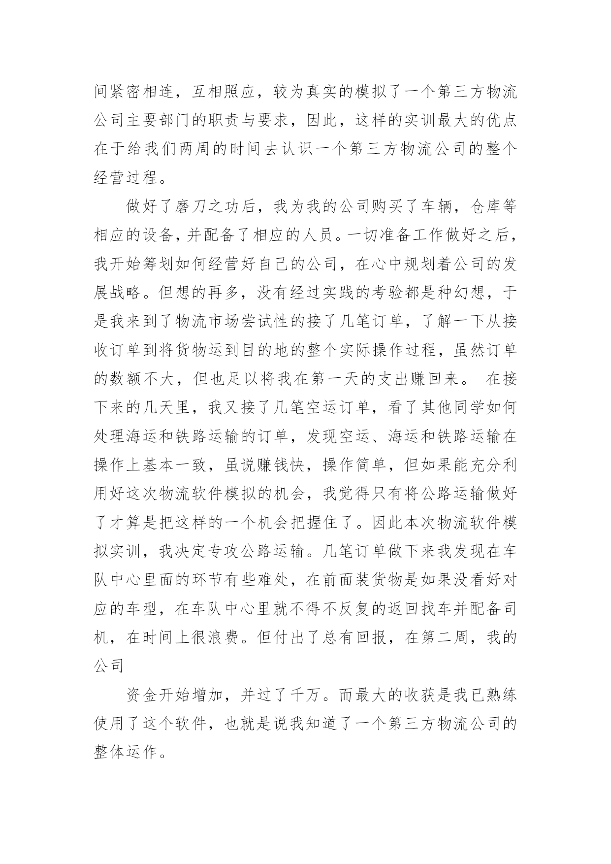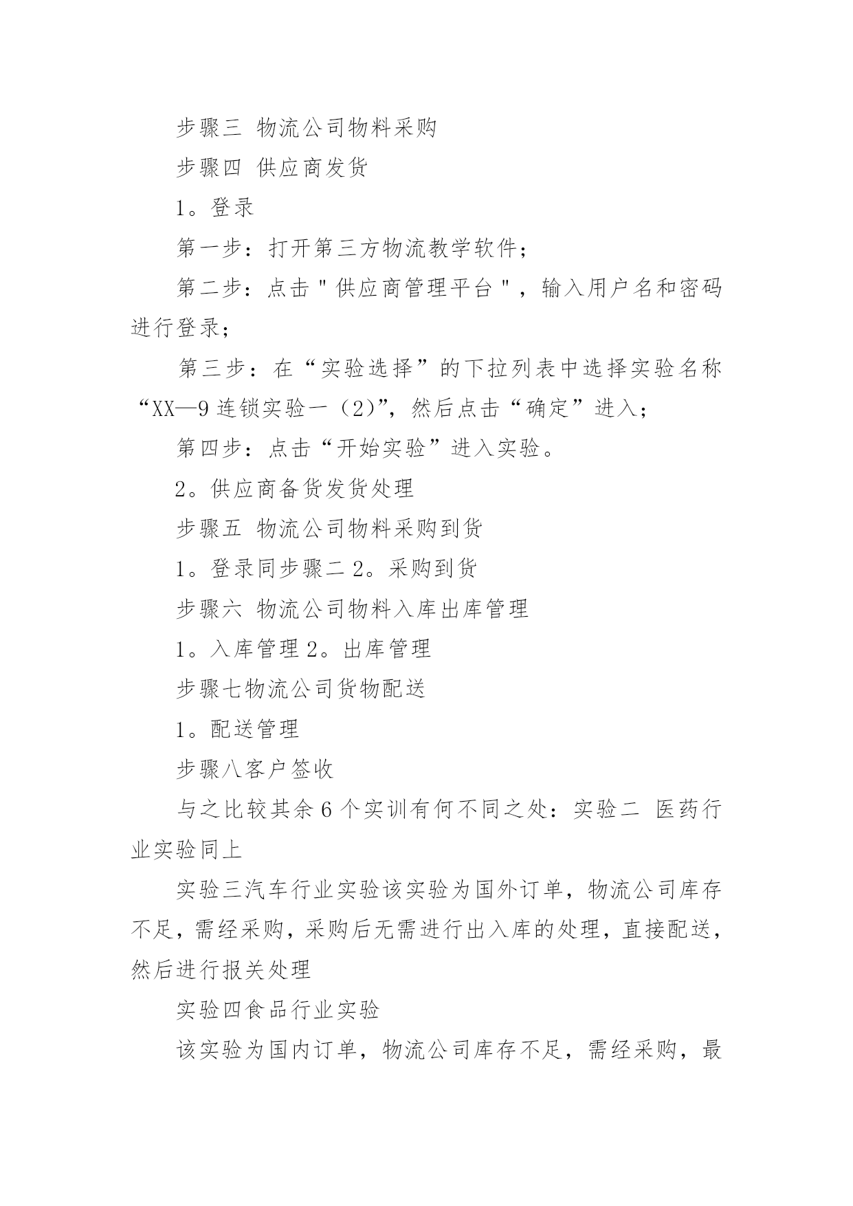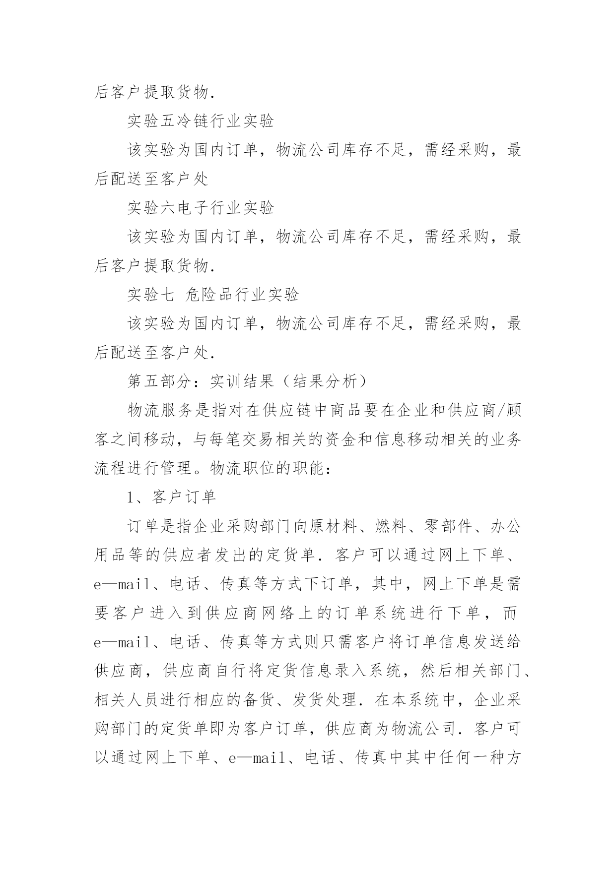 物流软件模拟实训报告物流软件模拟实训报告在不断进步的时代,接触并使用报告的人越来越多,不同的报告内容同样也是不同的。在写之前,可以先参考范文,以下是小编整理的物流软件模拟实训报告,仅供参考,希望能够帮助到大家。物流软件模拟实训报告1该实训是通过软件模拟进行的第三方物流实训,主要讲述了实训的内容和过程,并对第三方物流的发展做出了展望。第一部分:实训目的目的是我们通过参与物流软件系统在电脑上的操作,加深对物流流程的了解和掌握。通过理论与实践相结合,培养我们的创新能力,实际操作能力,为步入社会和工作打下良好的基矗通过学习深圳诺思科技的第三方物流软件,结合实际情况,了解产品从客户发出订货单到客户的到货签收的一个商业流通过程,加深对课本理论知识的认识!了解并掌握物流行业中,各行业的运作流程.使我们能快速投身社会实践当中!第二部分:实训准备(包含实训设备及器材)(港航系实训室,物流管理综合模拟实训室)电脑系统深圳诺思科技公司的第三方物流软件,同时本系为了建设实验室本系老师做了大量的工作,包括一些项目规划,可行性报告,项目审批,招投标,项目投资,项目建设等等工作。第三部分:实训要求1、要遵守操作的程序,不能随意变得系统数据2、要听从老师指挥3、要按照操作流程操作4、要用自己的名字或学号填写操作员5、不要乱插电脑,不要用自带的u盘使用电脑6、要保持课堂纪律,不早退7、不懂要问。第四部分:实训内容(步骤及程序)实训内容:实验一连锁实验,实验二医药实验,实验三汽车行业实验,实验四食品行业实验,实验五冷链行业实验,实验六电子行业实验,实验七危险品行业实验。实训流程以下详细介绍其中一个实训流程,实验一连锁实验客户订单→物流公司订单处理→物流公司物料采购→供应商发货→物流公司物料采购到货→物流公司物料入库出库管理→物流公司货物配送→客户签收步骤一客户订单1。客户登录第一步:打开第三方物流教学软件;第二步:点击"客户管理综合平台",输入用户名和密码进行登录。第三步:登录后,在实验选择的下拉列表中选中要进行的实验“XX—9连锁实验一(2)”,然后点击“确定”进入实验。2。客户订单第一步:点击“订单录入”进入;第二步:点击“新增”进行增加新的订单;第三步:输入订单相关信息;第四步;增加物料明细。步骤二物流公司订单处理1。登录第一步:打开第三方物流教学软件;第二步:点击"客户管理综合平台",输入用户名和密码进行登录。第二步:点击"模拟实验平台",输入用户名和密码进行登录;第三步:在“实验选择”的下拉列表中选择实验名称“连锁实验”,“角色”选择“订单管理员”或“综合管理员”,然后点击“确定”进入;第四步:点击“开始实验”进入实验。2。处理客户订单步骤三物流公司物料采购步骤四供应商发货1。登录第一步:打开第三方物流教学软件;第二步:点击"供应商管理平台",输入用户名和密码进行登录;第三步:在“实验选择”的下拉列表中选择实验名称“XX—9连锁实验一(2)”,然后点击“确定”进入;第四步:点击“开始实验”进入实验。2。供应商备货发货处理步骤五物流公司物料采购到货1。登录同步骤二2。采购到货步骤六物流公司物料入库出库管理1。入库管理2。出库管理步骤七物流公司货物配送1。配送管理步骤八客户签收与之比较其余6个实训有何不同之处:实验二医药行业实验同上实验三汽车行业实验该实验为国外订单,物流公司库存不足,需经采购,采购后无需进行出入库的处理,直接配送,然后进行报关处理实验四食品行业实验该实验为国内订单,物流公司库存不足,需经采购,最后客户提取货物.实验五冷链行业实验该实验为国内订单,物流公司库存不足,需经采购,最后配送至客户处实验六电子行业实验该实验为国内订单,物流公司库存不足,需经采购,最后客户提取货物.实验七危险品行业实验该实验为国内订单,物流公司库存不足,需经采购,最后配送至客户处.第五部分:实训结果(结果分析)物流服务是指对在供应链中商品要在企业和供应商/顾客之间移动,与每笔交易相关的资金和信息移动相关的业务流程进行管理。物流职位的职能:1、客户订单订单是指企业采购部门向原材料、燃料、零部件、办公用品等的供应者发出的定货单.客户可以通过网上下单、e—mail、电话、传真等方式下订单,其中,网上下单是需要客户进入到供应商网络上的订单系统进行下单,而e—mail、电话、传真等方式则只需客户将订单信息发送给供应商,供应商自行将定货信息录入系统,然后相关部门、相关人员进行相应的备货、发货处理.在本系统中,企业采购部门的定货单即为客户订单,供应商为物流公司.客户可以通过网上下单、e—mail、电话、传真中其中任何一种方式进行下订单。2、供应商管理供应商也就是供货商.在本系统中,供应商的下游就是物流公司,物流公司的下游就是实际的客户,因此物流公司即是上游供应商的客户,也是下游