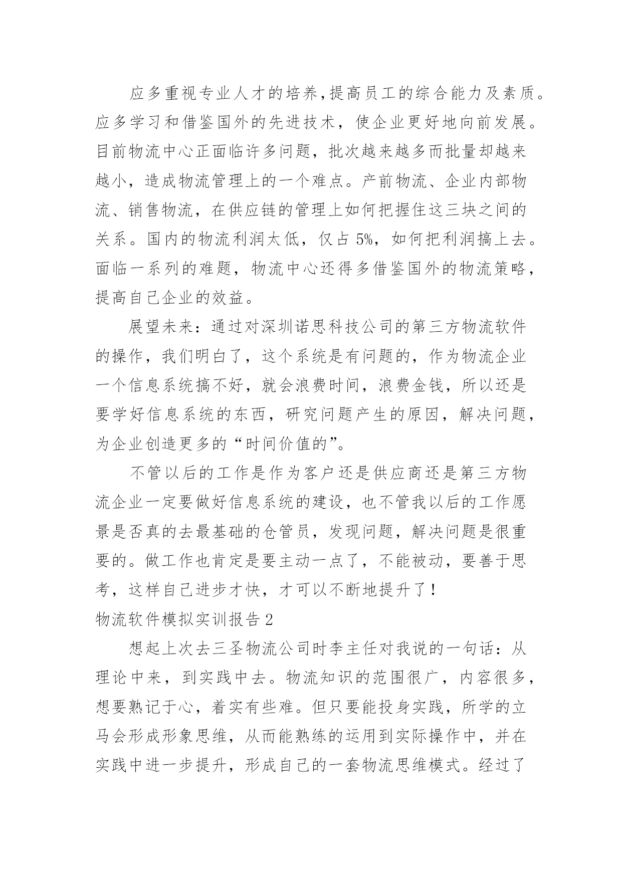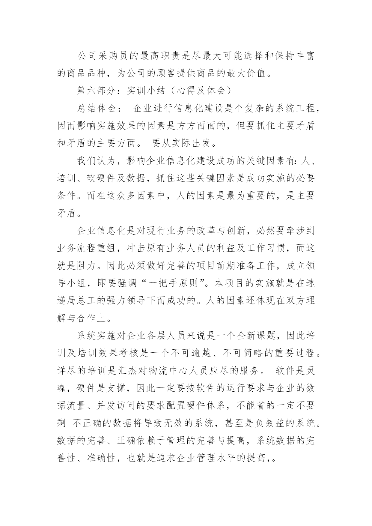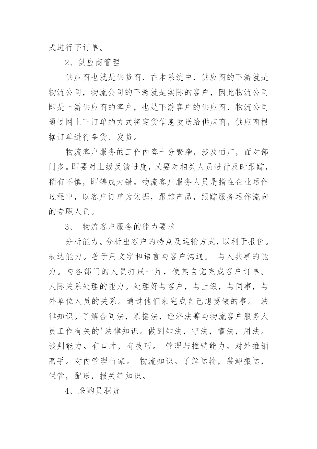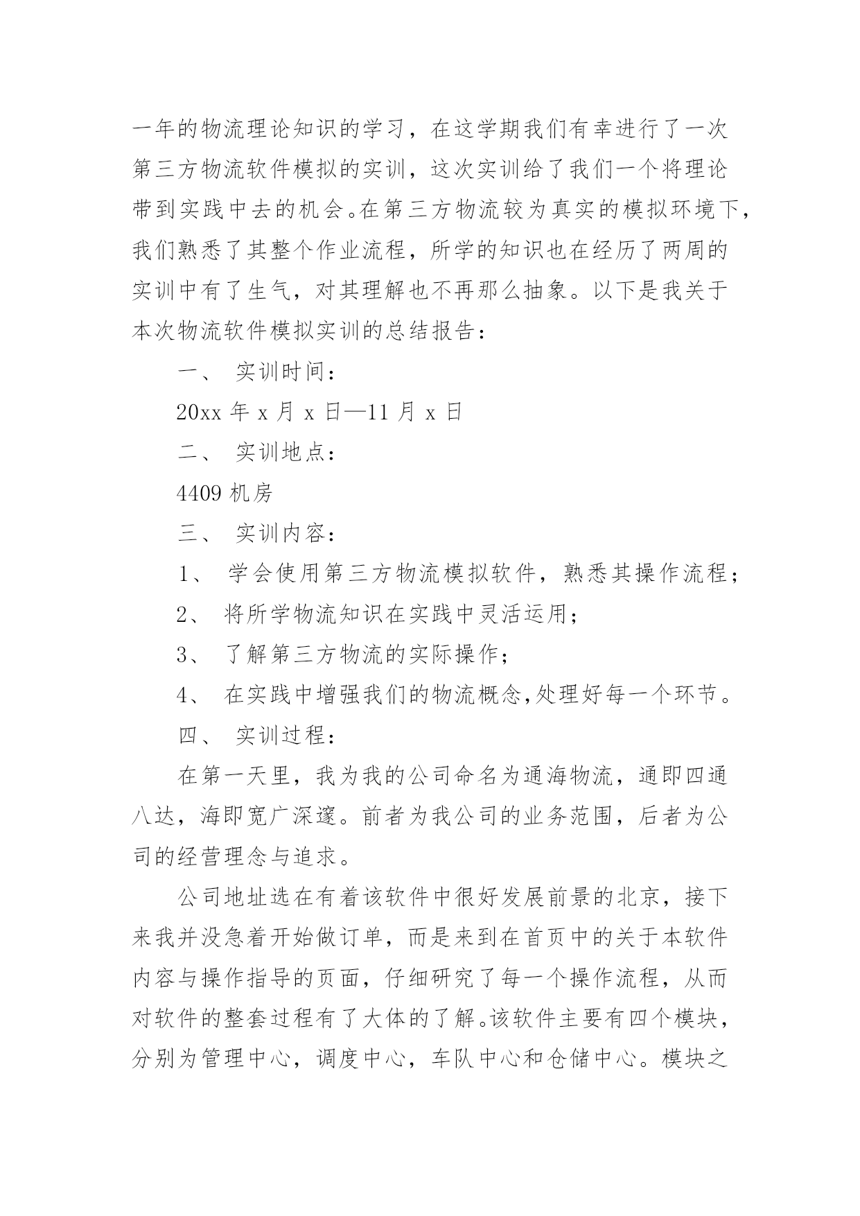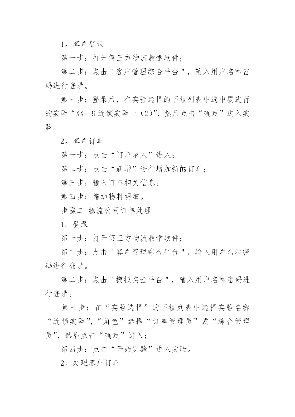 物流软件模拟实训报告物流软件模拟实训报告在不断进步的时代,接触并使用报告的人越来越多,不同的报告内容同样也是不同的。在写之前,可以先参考范文,以下是小编整理的物流软件模拟实训报告,仅供参考,希望能够帮助到大家。物流软件模拟实训报告1该实训是通过软件模拟进行的第三方物流实训,主要讲述了实训的内容和过程,并对第三方物流的发展做出了展望。第一部分:实训目的目的是我们通过参与物流软件系统在电脑上的操作,加深对物流流程的了解和掌握。通过理论与实践相结合,培养我们的创新能力,实际操作能力,为步入社会和工作打下良好的基矗通过学习深圳诺思科技的第三方物流软件,结合实际情况,了解产品从客户发出订货单到客户的到货签收的一个商业流通过程,加深对课本理论知识的认识!了解并掌握物流行业中,各行业的运作流程.使我们能快速投身社会实践当中!第二部分:实训准备(包含实训设备及器材)(港航系实训室,物流管理综合模拟实训室)电脑系统深圳诺思科技公司的第三方物流软件,同时本系为了建设实验室本系老师做了大量的工作,包括一些项目规划,可行性报告,项目审批,招投标,项目投资,项目建设等等工作。第三部分:实训要求1、要遵守操作的程序,不能随意变得系统数据2、要听从老师指挥3、要按照操作流程操作4、要用自己的名字或学号填写操作员5、不要乱插电脑,不要用自带的u盘使用电脑6、要保持课堂纪律,不早退7、不懂要问。第四部分:实训内容(步骤及程序)实训内容:实验一连锁实验,实验二医药实验,实验三汽车行业实验,实验四食品行业实验,实验五冷链行业实验,实验六电子行业实验,实验七危险品行业实验。实训流程以下详细介绍其中一个实训流程,实验一连锁实验客户订单→物流公司订单处理→物流公司物料采购→供应商发货→物流公司物料采购到货→物流公司物料入库出库管理→物流公司货物配送→客户签收步骤一客户订单1。客户登录第一步:打开第三方物流教学软件;第二步:点击"客户管理综合平台",输入用户名和密码进行登录。第三步:登录后,在实验选择的下拉列表中选中要进行的实验“XX—9连锁实验一(2)”,然后点击“确定”进入实验。2。客户订单第一步:点击“订单录入”进入;第二步:点击“新增”进行增加新的订单;第三步:输入订单相关信息;第四步;增加物料明细。步骤二物流公司订单处理1。登录第一步:打开第三方物流教学软件;第二步:点击"客户管理综合平台",输入用户名和密码进行登录。第二步:点击"模拟实验平台",输入用户名和密码进行登录;第三步:在“实验选择”的下拉列表中选择实验名称“连锁实验”,“角色”选择“订单管理员”或“综合管理员”,然后点击“确定”进入;第四步:点击“开始实验”进入实验。2。处理客户订单步骤三物流公司物料采购步骤四供应商发货1。登录第一步:打开第三方物流教学软件;第二步:点击"供应商管理平台",输入用户名和密码进行登录;第三步:在“实验选择”的下拉列表中选择实验名称“XX—9连锁实验一(2)”,然后点击“确定”进入;第四步:点击“开始实验”进入实验。2。供应商备货发货处理步骤五物流公司物料采购到货1。登录同步骤二2。采购到货步骤六物流公司物料入库出库管理1。入库管理2。出库管理步骤七物流公司货物配送1。配送管理步骤八客户签收与之比较其余6个实训有何不同之处:实验二医药行业实验同上实验三汽车行业实验该实验为国外订单,物流公司库存不足,需经采购,采购后无需进行出入库的处理,直接配送,然后进行报关处理实验四食品行业实验该实验为国内订单,物流公司库存不足,需经采购,最后客户提取货物.实验五冷链行业实验该实验为国内订单,物流公司库存不足,需经采购,最后配送至客户处实验六电子行业实验该实验为国内订单,物流公司库存不足,需经采购,最后客户提取货物.实验七危险品行业实验该实验为国内订单,物流公司库存不足,需经采购,最后配送至客户处.第五部分:实训结果(结果分析)物流服务是指对在供应链中商品要在企业和供应商/顾客之间移动,与每笔交易相关的资金和信息移动相关的业务流程进行管理。物流职位的职能:1、客户订单订单是指企业采购部门向原材料、燃料、零部件、办公用品等的供应者发出的定货单.客户可以通过网上下单、e—mail、电话、传真等方式下订单,其中,网上下单是需要客户进入到供应商网络上的订单系统进行下单,而e—mail、电话、传真等方式则只需客户将订单信息发送给供应商,供应商自行将定货信息录入系统,然后相关部门、相关人员进行相应的备货、发货处理.在本系统中,企业采购部门的定货单即为客户订单,供应商为物流公司.客户可以通过网上下单、e—mail、电话、传真中其中任何一种方式进行下订单。2、供应商管理供应商也就是供货商.在本系统中,供应商的下游就是物流公司,物流公司的下游就是实际的客户,因此物流公司即是上游供应商的客户,也是下游