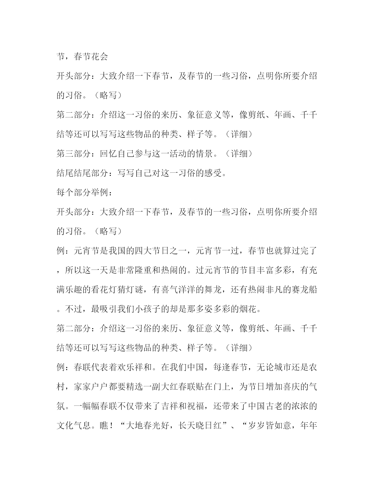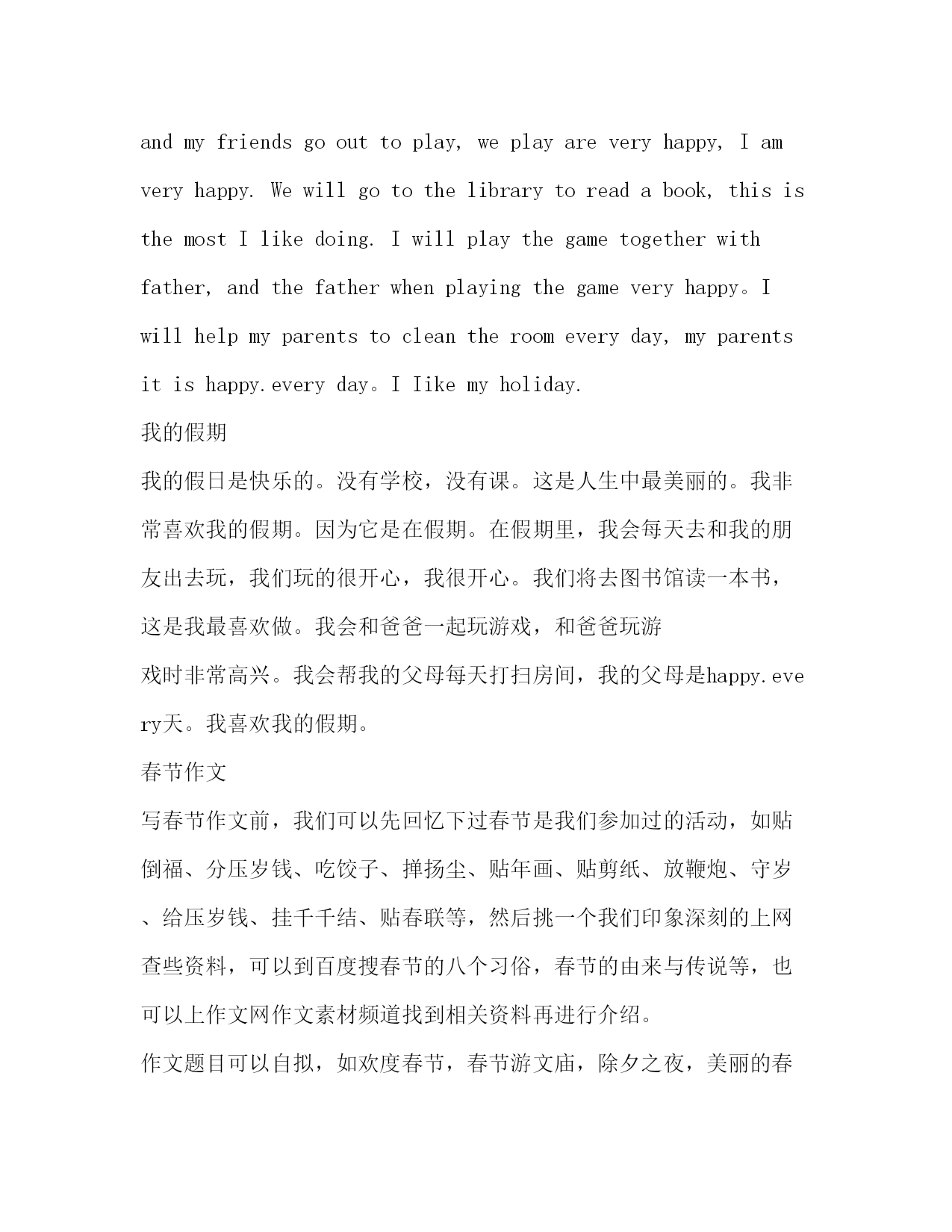PAGE此资料由网络收集而来,如有侵权请告知上传者立即删除。资料共分享,我们负责传递知识。寒假生活英语作文篇一:寒假英语作文寒假生活(WINTERLIFE)Whenwinterholidayisaroundcorner,Ihavesomanyplans,butnowIjustlikecoughpotato.????MysisterandIsleepinthemorning,myparentsgetmadatus.Theyforceustogetup,welockthebedroomdooruntilwearebothhungry.Ha...????Becauseoffinalexams,ourskininbadcondition,mysistersaidthatsleepingisgoodforskin.Yeah,femaledocareabouttheirappearenceallthetime.????Afternoonbelongstofriend.Callthemoutandgoshoppingtoghter.Wegossipallthepeopleweknow.Thisfeelingissocool,youmayfindthatfriendissoimportantintheworld,nooncanlivewithoutthem.????Mydayissimple.篇二:我的假期英语作文MyholidayMyholidaysihappy。Noschool,noclass.Thislifeisthemostbeautiful。IveryIikeMyholiday。Becauseitishappy.inholiday.。Duringtheholiday,Iwillgoeverydaytoandmyfriendsgoouttoplay,weplayareveryhappy,Iamveryhappy.Wewillgotothelibrarytoreadabook,thisisthemostIlikedoing.Iwillplaythegametogetherwithfather,andthefatherwhenplayingthegameveryhappy。Iwillhelpmyparentstocleantheroomeveryday,myparentsitishappy.everyday。IIikemyholiday.我的假期我的假日是快乐的。没有学校,没有课。这是人生中最美丽的。我非常喜欢我的假期。因为它是在假期。在假期里,我会每天去和我的朋友出去玩,我们玩的很开心,我很开心。我们将去图书馆读一本书,这是我最喜欢做。我会和爸爸一起玩游戏,和爸爸玩游戏时非常高兴。我会帮我的父母每天打扫房间,我的父母是happy.every天。我喜欢我的假期。春节作文写春节作文前,我们可以先回忆下过春节是我们参加过的活动,如贴倒福、分压岁钱、吃饺子、掸扬尘、贴年画、贴剪纸、放鞭炮、守岁、给压岁钱、挂千千结、贴春联等,然后挑一个我们印象深刻的上网查些资料,可以到百度搜春节的八个习俗,春节的由来与传说等,也可以上作文网作文素材频道找到相关资料再进行介绍。作文题目可以自拟,如欢度春节,春节游文庙,除夕之夜,美丽的春节,春节花会开头部分:大致介绍一下春节,及春节的一些习俗,点明你所要介绍的习俗。(略写)第二部分:介绍这一习俗的来历、象征意义等,像剪纸、年画、千千结等还可以写写这些物品的种类、样子等。(详细)第三部分:回忆自己参与这一活动的情景。(详细)结尾结尾部分:写写自己对这一习俗的感受。每个部分举例:开头部分:大致介绍一下春节,及春节的一些习俗,点明你所要介绍的习俗。(略写)例:元宵节是我国的四大节日之一,元宵节一过,春节也就算过完了,所以这一天是非常隆重和热闹的。过元宵节的节目丰富多彩,有充满乐趣的看花灯猜灯谜,有喜气洋洋的舞龙,还有热闹非凡的赛龙船。不过,最吸引我们小孩子的却是那多姿多彩的烟花。第二部分:介绍这一习俗的来历、象征意义等,像剪纸、年画、千千结等还可以写写这些物品的种类、样子等。(详细)例:春联代表着欢乐祥和。在我们中国,每逢春节,无论城市还是农村,家家户户都要精选一副大红春联贴在门上,为节日增加喜庆的气氛。一幅幅春联不仅带来了吉祥和祝福,还带来了中国古老的浓浓的文化气息。瞧!“大地春光好,长天晓日红”、“岁岁皆如意,年年尽平安”、“江山万里如画,神州四时皆春”、“春风送春处处***美,喜鹊报喜家家喜事多”……幅幅春联让千家万户喜气盈门。春联的种类比较多。按照使用场所,可分为门心、框对、横批、春条、斗方等。因此,贴的位置也不同,如“门心”贴在门板上端中心部位;”横