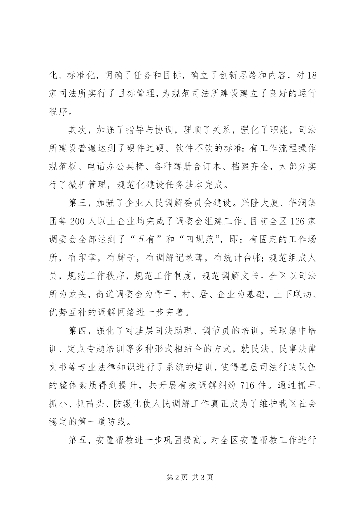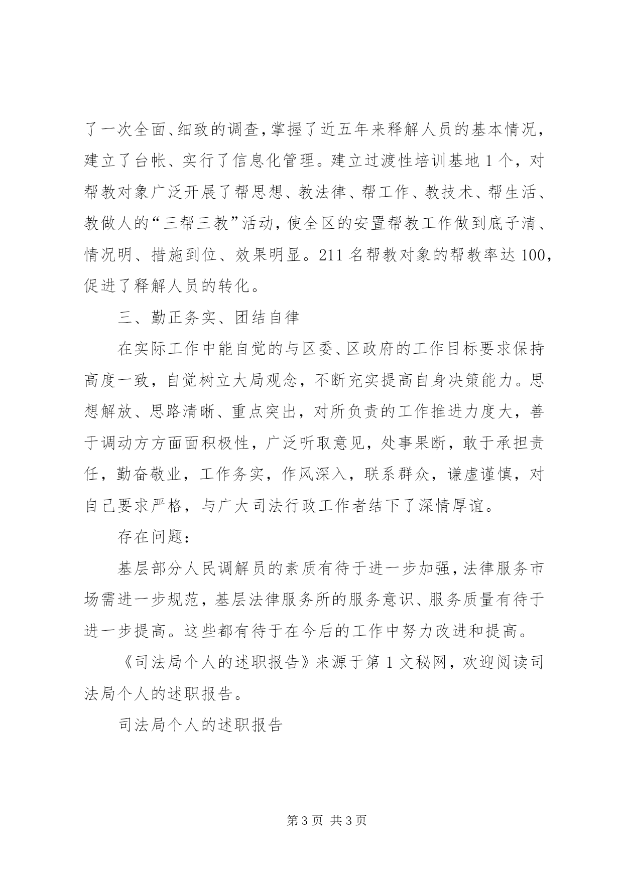 第PAGE\*Arabic\*MERGEFORMAT3页共NUMPAGES\*MERGEFORMAT3页司法局个人的述职报告一年来,在区委、区政府的领导下,认真实践“三个代表”重要思想,大力弘扬求真务实精神,突出改革、保障、拓展、规范的主题,抓指导、促发展、强素质、树形象,有力促进了基层司法行政工作的健康发展,为我区建立良好的社会秩序、生活秩序和工作秩序作出了积极的贡献。主要表现在三个方面:一、加强政治思想的学习,提高了理论和实践的能力我认真学习“三个代表”重要思想和十六届五中、六中全会精神,特别是在参加保持共产党员先进性教育活动中,力作表率,以高度的责任心、良好的精神状态、积极主动的态度参加教育活动,自觉做到全时、全程、全力、全身心的投入教育活动。在教育活动中,坚持“三学”,即参加集体学、坚持个人学、结合实际学;“三严”,即严要求、严标准、严对待;做到“八真”,即谈心活动做到真诚、征求意见做到真心、撰写党性分析做到真像、参加民主生活会做到真情、提出评议做到真准、反馈评议做到真实、共同提高做到真帮。通过教育活动,真正起到了先锋模范作用。二、改革创新、与时俱进,提升了基层司法行政工作水平在实际工作中,我以努力奋斗、不断进取为动力,以维护和保障社会稳定为重点,充分发挥职能作用,努力探索新时期基层司法行政工作新特点、新方法、新措施。首先,对基层司法行政工作进行了全面调查论证,细化、量化、标准化,明确了任务和目标,确立了创新思路和内容,对18家司法所实行了目标管理,为规范司法所建设建立了良好的运行程序。其次,加强了指导与协调,理顺了关系,强化了职能,司法所建设普遍达到了硬件过硬、软件不软的标准:有工作流程操作规范板、电话办公桌椅、各种薄册合订本、档案齐全,大部分实行了微机管理,规范化建设任务基本完成。第三,加强了企业人民调解委员会建设。兴隆大厦、华润集团等200人以上企业均完成了调委会组建工作。目前全区126家调委会全部达到了“五有”和“四规范”,即:有固定的工作场所,有印章,有牌子,有调解记录薄,有统计台帐;规范组成人员,规范工作秩序,规范工作制度,规范调解文书。全区以司法所为龙头,街道调委会为骨干,村、居、企业为基础,上下联动、优势互补的调解网络进一步完善。第四,强化了对基层司法助理、调节员的培训,采取集中培训、定点专题培训等多种形式相结合的方式,就民法、民事法律文书等专业法律知识进行了系统的培训,使得基层司法行政队伍的整体素质得到提升,共开展有效调解纠纷716件。通过抓早、抓小、抓苗头、防激化使人民调解工作真正成为了维护我区社会稳定的第一道防线。第五,安置帮教进一步巩固提高。对全区安置帮教工作进行了一次全面、细致的调查,掌握了近五年来释解人员的基本情况,建立了台帐、实行了信息化管理。建立过渡性培训基地1个,对帮教对象广泛开展了帮思想、教法律、帮工作、教技术、帮生活、教做人的“三帮三教”活动,使全区的安置帮教工作做到底子清、情况明、措施到位、效果明显。211名帮教对象的帮教率达100,促进了释解人员的转化。三、勤正务实、团结自律在实际工作中能自觉的与区委、区政府的工作目标要求保持高度一致,自觉树立大局观念,不断充实提高自身决策能力。思想解放、思路清晰、重点突出,对所负责的工作推进力度大,善于调动方方面面积极性,广泛听取意见,处事果断,敢于承担责任,勤奋敬业,工作务实,作风深入,联系群众,谦虚谨慎,对自己要求严格,与广大司法行政工作者结下了深情厚谊。存在问题:基层部分人民调解员的素质有待于进一步加强,法律服务市场需进一步规范,基层法律服务所的服务意识、服务质量有待于进一步提高。这些都有待于在今后的工作中努力改进和提高。《司法局个人的述职报告》来源于第1文秘网,欢迎阅读司法局个人的述职报告。司法局个人的述职报告