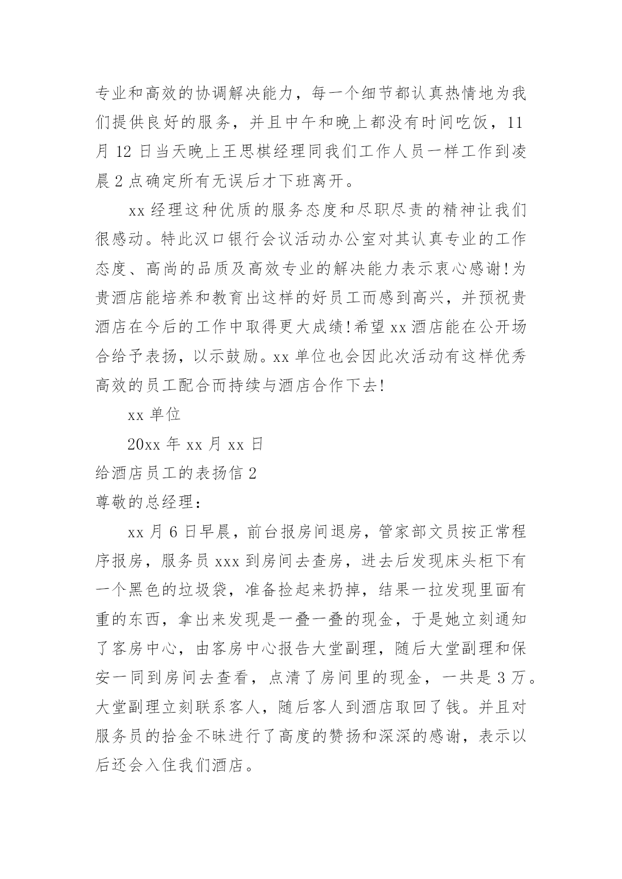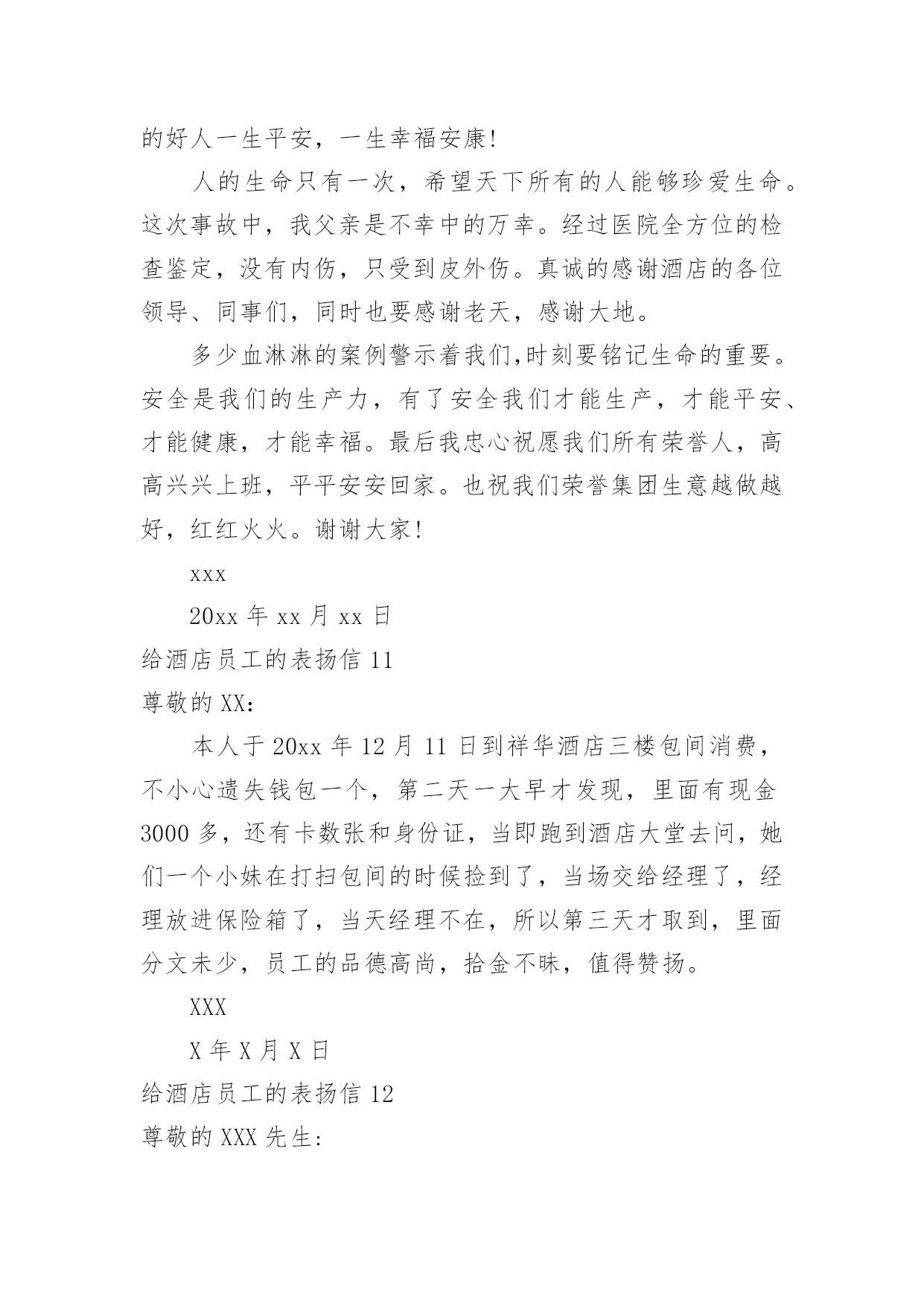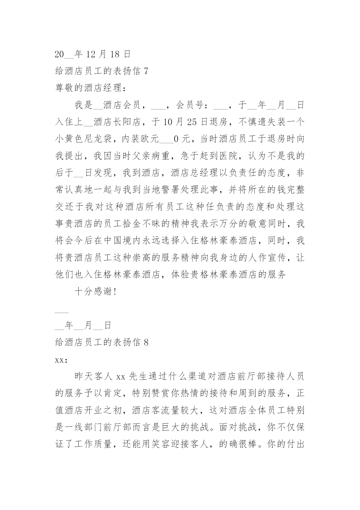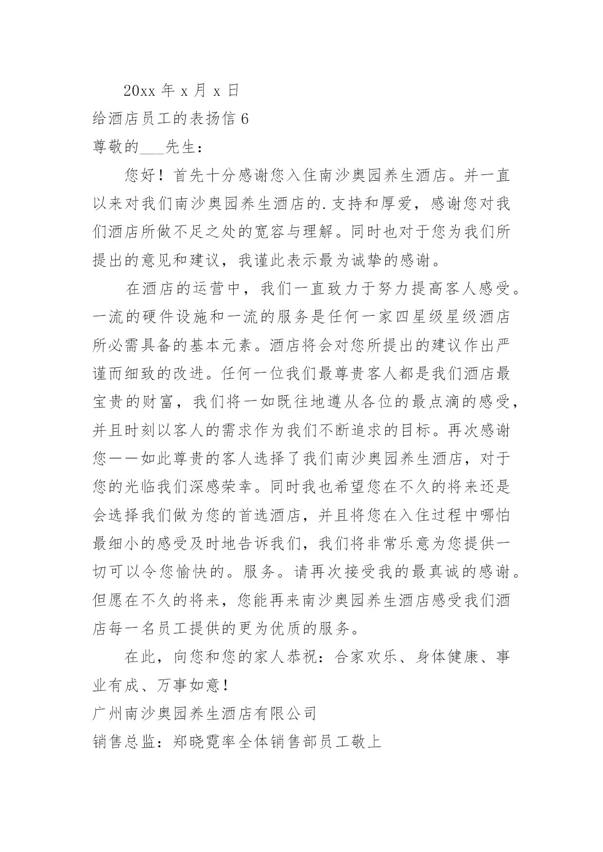 给酒店员工的表扬信给酒店员工的表扬信在生活中,需要使用表扬信的事情愈发增多,表扬信一般均有感谢的成分,尤其是表扬的事迹同写信人有关时,更要在表扬信中表达出自己的谢意。为了让您在写表扬信中更加简单方便,下面是小编收集整理的给酒店员工的表扬信,仅供参考,希望能够帮助到大家。给酒店员工的表扬信1xxx酒店负责人:您好!首先我为xxx能培养出xxx这样认真负责的优质员工而致敬!我是xx是xxx的(负责人)。我行于xx年xx月xx日在贵酒店举行重要会议活动,此次活动对于我行来说意义重大,安排到酒店入住的客人都是xx成员,所以xx领导层非常重视。整个活动前期由酒店的xx经理接待,后期所有细节都是由xx经理亲自来协调和落实。针对此次xx会的活动我行分别设有5个分管部门分别负责住房,餐饮,会议,布展及礼品等细节,因中间有同事突然病倒,所以交接上有些出入,变动也在所难免。11月12日(星期日)____早上七点就来到酒店,自己一个人和我们5个分管部门负责人对接,对于我们提出房间要求和会议调整等细节问题,她都表现出专业和高效的协调解决能力,每一个细节都认真热情地为我们提供良好的服务,并且中午和晚上都没有时间吃饭,11月12日当天晚上王思棋经理同我们工作人员一样工作到凌晨2点确定所有无误后才下班离开。xx经理这种优质的服务态度和尽职尽责的精神让我们很感动。特此汉口银行会议活动办公室对其认真专业的工作态度、高尚的品质及高效专业的解决能力表示衷心感谢!为贵酒店能培养和教育出这样的好员工而感到高兴,并预祝贵酒店在今后的工作中取得更大成绩!希望xx酒店能在公开场合给予表扬,以示鼓励。xx单位也会因此次活动有这样优秀高效的员工配合而持续与酒店合作下去!xx单位20xx年xx月xx日给酒店员工的表扬信2尊敬的总经理:xx月6日早晨,前台报房间退房,管家部文员按正常程序报房,服务员xxx到房间去查房,进去后发现床头柜下有一个黑色的垃圾袋,准备捡起来扔掉,结果一拉发现里面有重的东西,拿出来发现是一叠一叠的现金,于是她立刻通知了客房中心,由客房中心报告大堂副理,随后大堂副理和保安一同到房间去查看,点清了房间里的现金,一共是3万。大堂副理立刻联系客人,随后客人到酒店取回了钱。并且对服务员的拾金不昧进行了高度的赞扬和深深的感谢,表示以后还会入住我们酒店。这是自酒店成立以来员工捡到的最大一笔的现金,刘莲君的行为展现了四星级酒店员工的素质和风采,为酒店赢得了荣誉。酒店领导根据酒店相关奖罚条例特对她奖励00元并在全酒店进行通报表扬,同时号召全体员工向他们学习,全心全意为客人的服务,继续发扬拾金不昧的精神,为酒店的发展多做贡献。xxxxx年xx月6日给酒店员工的表扬信3xxx酒店负责人:您好!首先我为xxxx能培养出xx这样认真负责的优质员工而致敬!我是xxx是xx的(负责人)。我行于x年x月x日在贵酒店举行重要会议活动,此次活动对于我行来说意义重大,安排到酒店入住的客人都是x成员,所以xx领导层非常重视。整个活动前期由酒店的xx经理接待,后期所有细节都是由xx经理亲自来协调和落实。针对此次x会的活动我行分别设有5个分管部门分别负责住房,餐饮,会议,布展及礼品等细节,因中间有同事突然病倒,所以交接上有些出入,变动也在所难免。11月12日(星期日)xx早上七点就来到酒店,自己一个人和我们5个分管部门负责人对接,对于我们提出房间要求和会议调整等细节问题,她都表现出专业和高效的协调解决能力,每一个细节都认真热情地为我们提供良好的服务,并且中午和晚上都没有时间吃饭,11月12日当天晚上王思棋经理同我们工作人员一样工作到凌晨2点确定所有无误后才下班离开。xx经理这种优质的服务态度和尽职尽责的精神让我们很感动。特此汉口银行会议活动办公室对其认真专业的工作态度、高尚的品质及高效专业的解决能力表示衷心感谢!为贵酒店能培养和教育出这样的好员工而感到高兴,并预祝贵酒店在今后的工作中取得更大成绩!希望xx酒店能在公开场合给予表扬,以示鼓励。x单位也会因此次活动有这样优秀高效的员工配合而持续与酒店合作下去!xxx20xx年xx月xx日给酒店员工的表扬信4酒店的领导:我是xx酒店会员,xxx,会员号:xxx,于xx年xx月xx日入住上xx酒店长阳店,于10月25日退房,不慎遗失装一个小黄色尼龙袋,内装欧元xxx0元,当时酒店员工于退房时向我提出,我因当时父亲病重,急于赶到医院,认为不是我的后于26日发现,我到酒店,酒店总经理以负责任的态度,非常认真地一起与我到当地警署处理此事,并将所在的钱完整交还于我.对这种酒店所有员工这种任负责的态度和处理这事贵酒店的员工拾金不昧的精神我表示万分的敬意.同时,我将会今后在中国境内永远选择入住xx豪泰酒店,同时,我将贵酒店员工这种崇高的服务精神向我身边的人作宣传,让他