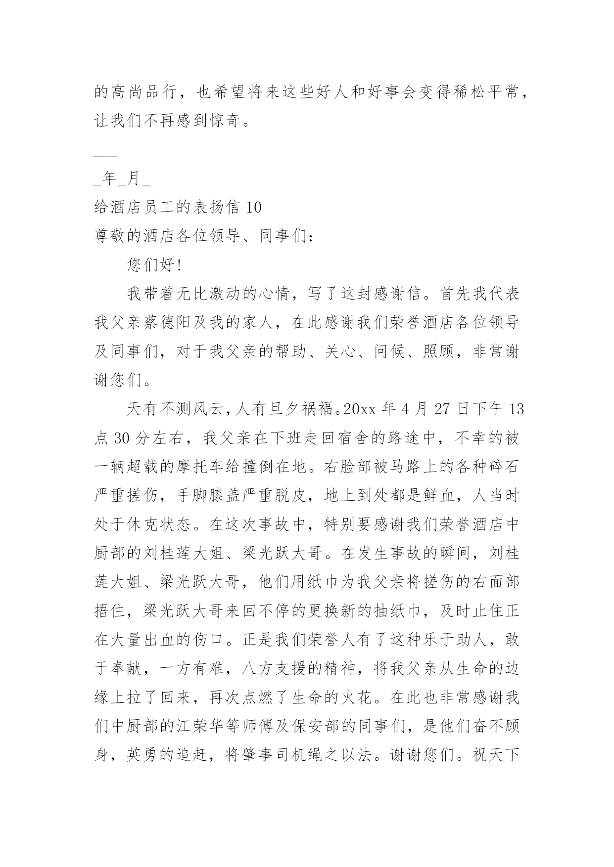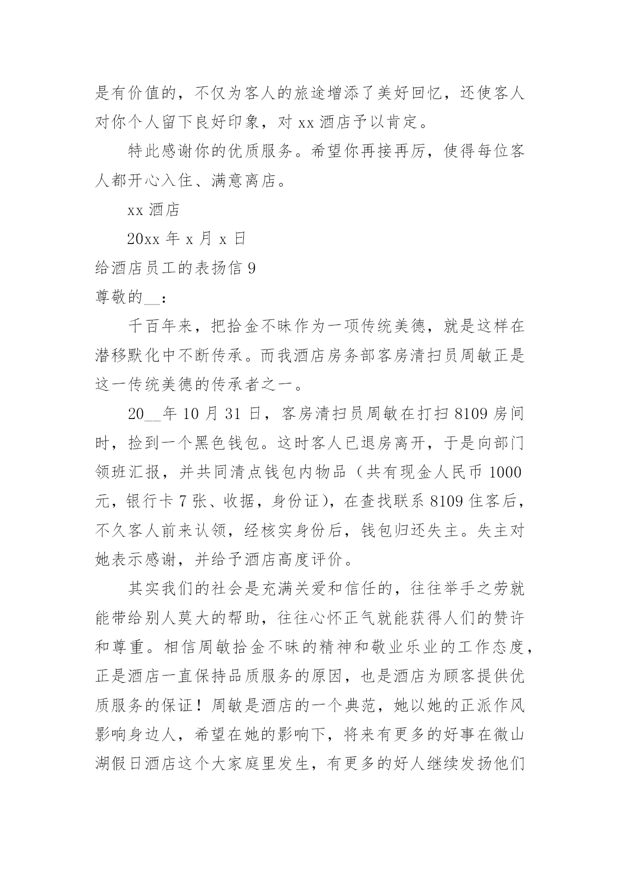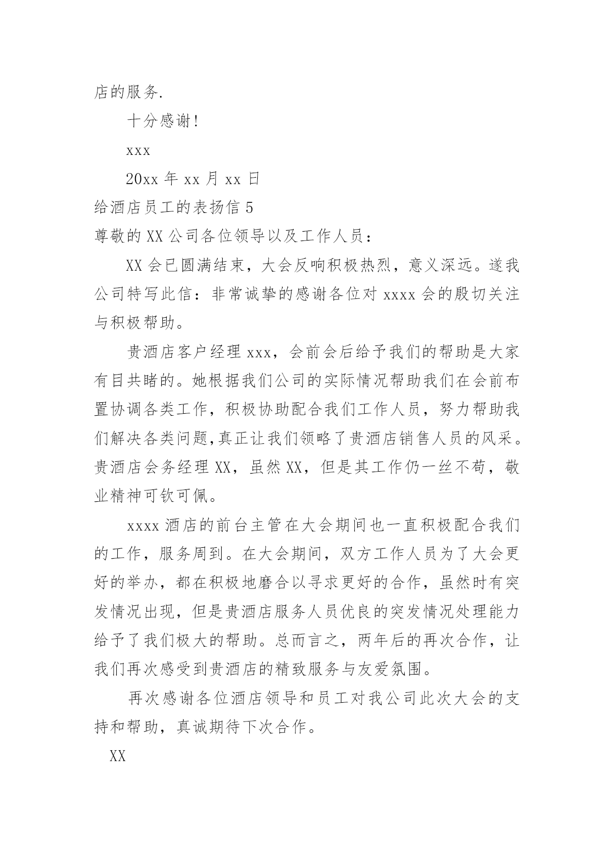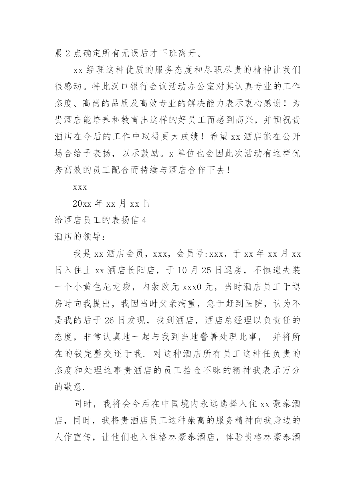 给酒店员工的表扬信给酒店员工的表扬信在生活中,需要使用表扬信的事情愈发增多,表扬信一般均有感谢的成分,尤其是表扬的事迹同写信人有关时,更要在表扬信中表达出自己的谢意。为了让您在写表扬信中更加简单方便,下面是小编收集整理的给酒店员工的表扬信,仅供参考,希望能够帮助到大家。给酒店员工的表扬信1xxx酒店负责人:您好!首先我为xxx能培养出xxx这样认真负责的优质员工而致敬!我是xx是xxx的(负责人)。我行于xx年xx月xx日在贵酒店举行重要会议活动,此次活动对于我行来说意义重大,安排到酒店入住的客人都是xx成员,所以xx领导层非常重视。整个活动前期由酒店的xx经理接待,后期所有细节都是由xx经理亲自来协调和落实。针对此次xx会的活动我行分别设有5个分管部门分别负责住房,餐饮,会议,布展及礼品等细节,因中间有同事突然病倒,所以交接上有些出入,变动也在所难免。11月12日(星期日)____早上七点就来到酒店,自己一个人和我们5个分管部门负责人对接,对于我们提出房间要求和会议调整等细节问题,她都表现出专业和高效的协调解决能力,每一个细节都认真热情地为我们提供良好的服务,并且中午和晚上都没有时间吃饭,11月12日当天晚上王思棋经理同我们工作人员一样工作到凌晨2点确定所有无误后才下班离开。xx经理这种优质的服务态度和尽职尽责的精神让我们很感动。特此汉口银行会议活动办公室对其认真专业的工作态度、高尚的品质及高效专业的解决能力表示衷心感谢!为贵酒店能培养和教育出这样的好员工而感到高兴,并预祝贵酒店在今后的工作中取得更大成绩!希望xx酒店能在公开场合给予表扬,以示鼓励。xx单位也会因此次活动有这样优秀高效的员工配合而持续与酒店合作下去!xx单位20xx年xx月xx日给酒店员工的表扬信2尊敬的总经理:xx月6日早晨,前台报房间退房,管家部文员按正常程序报房,服务员xxx到房间去查房,进去后发现床头柜下有一个黑色的垃圾袋,准备捡起来扔掉,结果一拉发现里面有重的东西,拿出来发现是一叠一叠的现金,于是她立刻通知了客房中心,由客房中心报告大堂副理,随后大堂副理和保安一同到房间去查看,点清了房间里的现金,一共是3万。大堂副理立刻联系客人,随后客人到酒店取回了钱。并且对服务员的拾金不昧进行了高度的赞扬和深深的感谢,表示以后还会入住我们酒店。这是自酒店成立以来员工捡到的最大一笔的现金,刘莲君的行为展现了四星级酒店员工的素质和风采,为酒店赢得了荣誉。酒店领导根据酒店相关奖罚条例特对她奖励00元并在全酒店进行通报表扬,同时号召全体员工向他们学习,全心全意为客人的服务,继续发扬拾金不昧的精神,为酒店的发展多做贡献。xxxxx年xx月6日给酒店员工的表扬信3xxx酒店负责人:您好!首先我为xxxx能培养出xx这样认真负责的优质员工而致敬!我是xxx是xx的(负责人)。我行于x年x月x日在贵酒店举行重要会议活动,此次活动对于我行来说意义重大,安排到酒店入住的客人都是x成员,所以xx领导层非常重视。整个活动前期由酒店的xx经理接待,后期所有细节都是由xx经理亲自来协调和落实。针对此次x会的活动我行分别设有5个分管部门分别负责住房,餐饮,会议,布展及礼品等细节,因中间有同事突然病倒,所以交接上有些出入,变动也在所难免。11月12日(星期日)xx早上七点就来到酒店,自己一个人和我们5个分管部门负责人对接,对于我们提出房间要求和会议调整等细节问题,她都表现出专业和高效的协调解决能力,每一个细节都认真热情地为我们提供良好的服务,并且中午和晚上都没有时间吃饭,11月12日当天晚上王思棋经理同我们工作人员一样工作到凌晨2点确定所有无误后才下班离开。xx经理这种优质的服务态度和尽职尽责的精神让我们很感动。特此汉口银行会议活动办公室对其认真专业的工作态度、高尚的品质及高效专业的解决能力表示衷心感谢!为贵酒店能培养和教育出这样的好员工而感到高兴,并预祝贵酒店在今后的工作中取得更大成绩!希望xx酒店能在公开场合给予表扬,以示鼓励。x单位也会因此次活动有这样优秀高效的员工配合而持续与酒店合作下去!xxx20xx年xx月xx日给酒店员工的表扬信4酒店的领导:我是xx酒店会员,xxx,会员号:xxx,于xx年xx月xx日入住上xx酒店长阳店,于10月25日退房,不慎遗失装一个小黄色尼龙袋,内装欧元xxx0元,当时酒店员工于退房时向我提出,我因当时父亲病重,急于赶到医院,认为不是我的后于26日发现,我到酒店,酒店总经理以负责任的态度,非常认真地一起与我到当地警署处理此事,并将所在的钱完整交还于我.对这种酒店所有员工这种任负责的态度和处理这事贵酒店的员工拾金不昧的精神我表示万分的敬意.同时,我将会今后在中国境内永远选择入住xx豪泰酒店,同时,我将贵酒店员工这种崇高的服务精神向我身边的人作宣传,让他