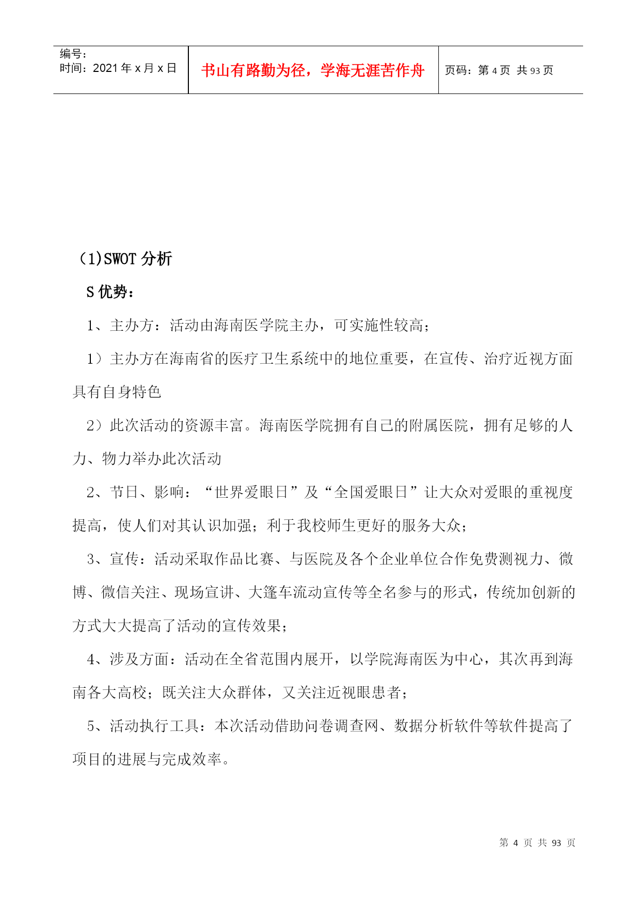 ——海南医学院第19届全国爱眼日系列活动一三营销2014年11月一三营销参赛队伍参赛队伍相信心灵的力量,营销为你呵护参赛口号摘掉眼镜笑看蓝天活动主题团队成员王丽荣肖鹏程黄汝燕李丽玲单铖燕薛田田目录一、项目背景·························1二、项目调研·······················`··4(1)Swot分析··························5(2)项目可行性调研························6三、项目策划···························8(1)活动目的···························9(2)活动主题··························`·9(3)目标公众·························`··9(4)策略选择··························`·9(5)策划详情···························10宣传作品征集赛························11海南省高校爱眼知识巡回讲座··················一五漫画展····························19免费修理、清洗眼镜······················23仿近视眼体验活动·······················27大型公益文艺汇演暨募捐活动··················35免费治疗高度近视眼及配置近视眼镜···············42(6)项目阶段···························45(6)活动设计··························`46四、媒体传播·························`··49(1)市场分析···························50(2)媒体选择···························51(3)媒体计划···························53(4)传播策略·······················`····56五、项目执行························`···57(1)活动开展···························58(2)物资准备·······················`····64项目评估···························65(1)宣传作品征集大赛及漫画展···················66(2)海南省高校爱眼知识巡回讲座···············`···68(3)仿近视眼体验活动····················`···70(4)大型公益募捐活动·····················`··72(5)免费修理、清洗眼镜···················`···74(6)免费治疗高度近视眼及配置近视眼镜·············`··76七、附录··························`···781)附录一:关于近视眼的调查问卷·················782)附录二:近视眼调查问卷(针对大学生)的回收结果数据······81附录三:关于邀请海南省省长参加公益募捐开幕式讲话的信函····83PAGE\*MERGEFORMAT1PAGE\*MERGEFORMAT0项目背景编号:时间:2021年x月x日书山有路勤为径,学海无涯苦作舟页码:第PAGE88页共NUMPAGES93页第PAGE\*MERGEFORMAT88页共NUMPAGES\*MERGEFORMAT93页(1)近视眼在中国据相关数据调查显示,我国学生的近视率已居世界第二位,近视人数高居世界第一。我国中学生近视率达70%以上,小学生近视率达40%以上,全国3亿多中小学生,每年新入学儿童近3000万,其中2.5亿学生不同程度上属于不良视力。在全国学生体质健康调研最新数据也表明大学生更甚超过9成患有近视。这些数据可谓是触目惊心,拯救近视,刻不容缓。近视常发期及其与不近视比例该图为海南医学院近视比例(2)项目单位及活动单位金十字计划工作委员会是中华国际医学交流基金发起全国性公益项目,为了推动近视眼防控工作深入开展,专门设立了中华金十字近视眼防控工程组委会,计划在全国范围内,面向青少