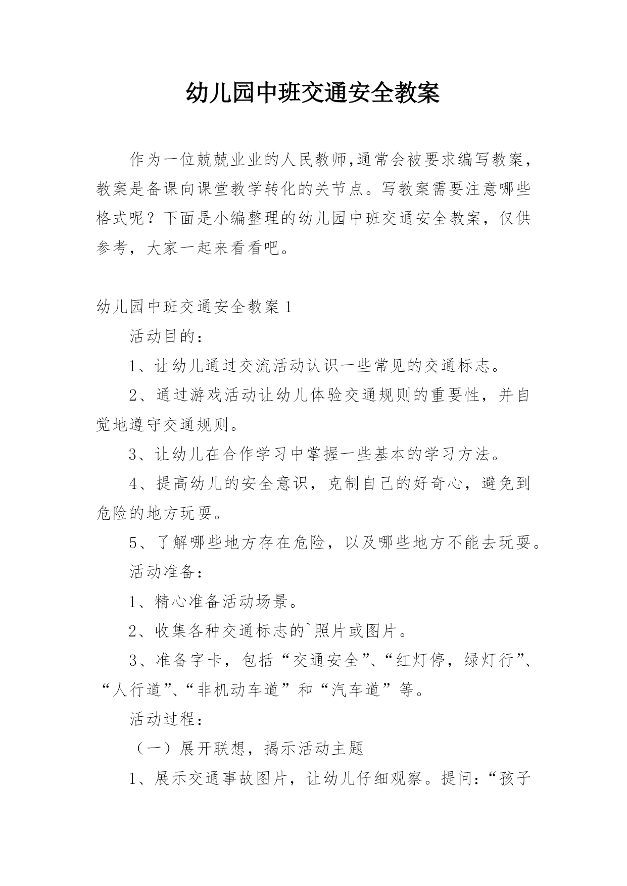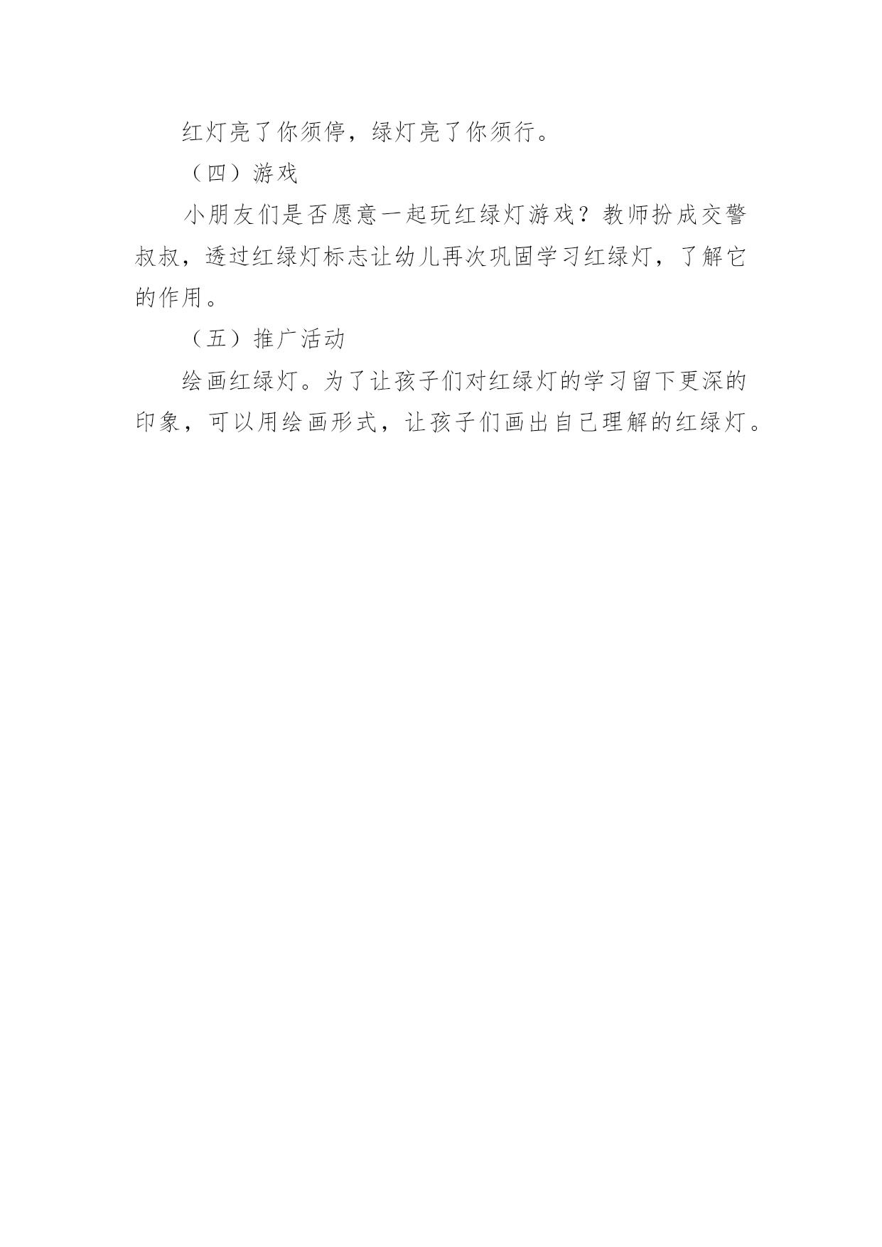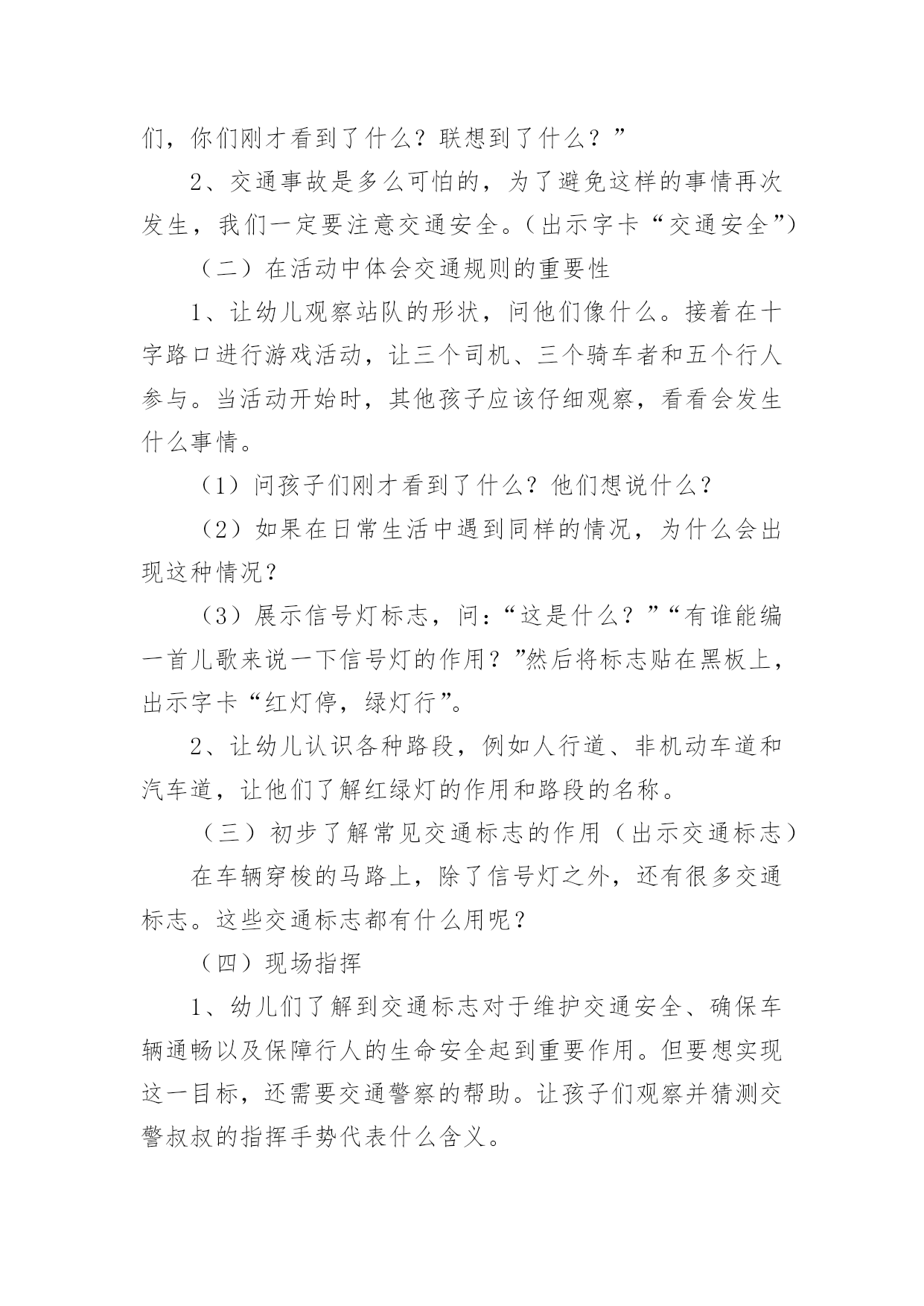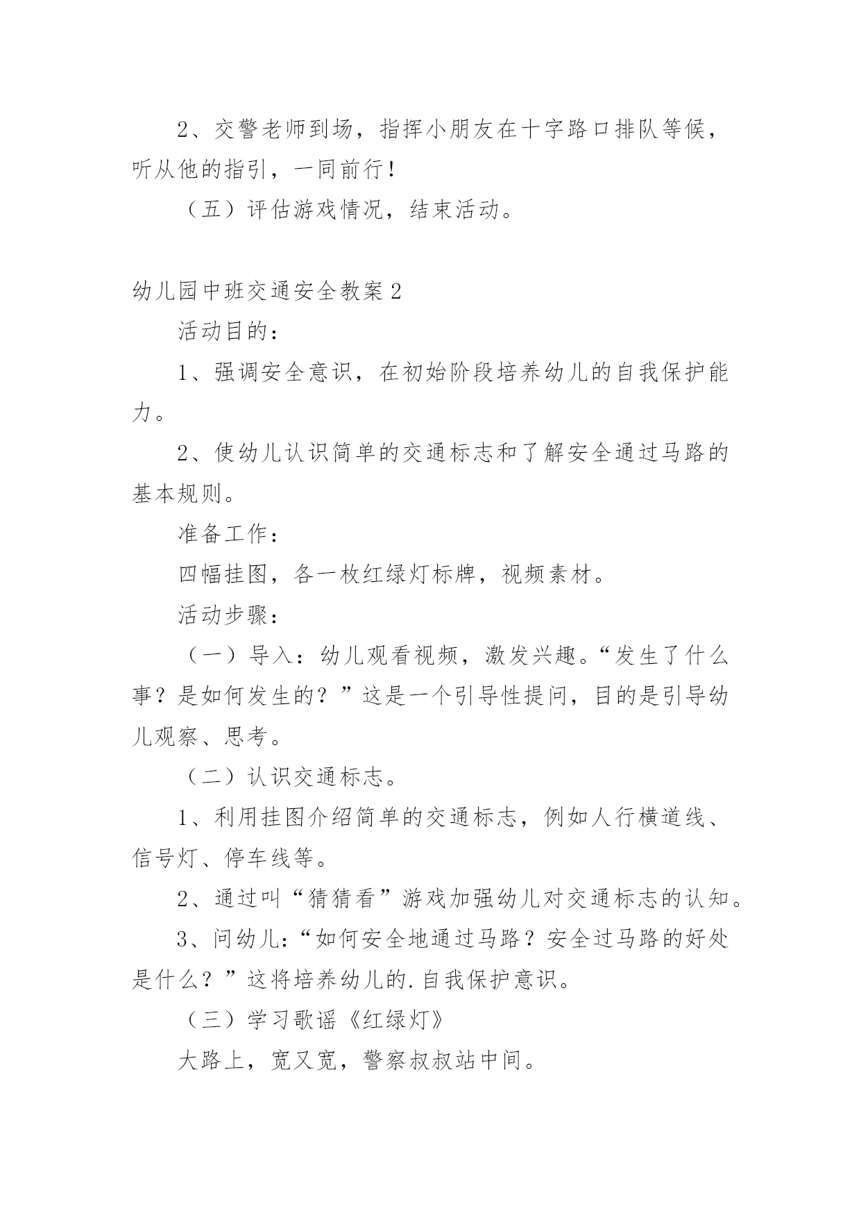 幼儿园中班交通安全教案作为一位兢兢业业的人民教师,通常会被要求编写教案,教案是备课向课堂教学转化的关节点。写教案需要注意哪些格式呢?下面是小编整理的幼儿园中班交通安全教案,仅供参考,大家一起来看看吧。幼儿园中班交通安全教案1活动目的:1、让幼儿通过交流活动认识一些常见的交通标志。2、通过游戏活动让幼儿体验交通规则的重要性,并自觉地遵守交通规则。3、让幼儿在合作学习中掌握一些基本的学习方法。4、提高幼儿的安全意识,克制自己的好奇心,避免到危险的地方玩耍。5、了解哪些地方存在危险,以及哪些地方不能去玩耍。活动准备:1、精心准备活动场景。2、收集各种交通标志的`照片或图片。3、准备字卡,包括“交通安全”、“红灯停,绿灯行”、“人行道”、“非机动车道”和“汽车道”等。活动过程:(一)展开联想,揭示活动主题1、展示交通事故图片,让幼儿仔细观察。提问:“孩子们,你们刚才看到了什么?联想到了什么?”2、交通事故是多么可怕的,为了避免这样的事情再次发生,我们一定要注意交通安全。(出示字卡“交通安全”)(二)在活动中体会交通规则的重要性1、让幼儿观察站队的形状,问他们像什么。接着在十字路口进行游戏活动,让三个司机、三个骑车者和五个行人参与。当活动开始时,其他孩子应该仔细观察,看看会发生什么事情。(1)问孩子们刚才看到了什么?他们想说什么?(2)如果在日常生活中遇到同样的情况,为什么会出现这种情况?(3)展示信号灯标志,问:“这是什么?”“有谁能编一首儿歌来说一下信号灯的作用?”然后将标志贴在黑板上,出示字卡“红灯停,绿灯行”。2、让幼儿认识各种路段,例如人行道、非机动车道和汽车道,让他们了解红绿灯的作用和路段的名称。(三)初步了解常见交通标志的作用(出示交通标志)在车辆穿梭的马路上,除了信号灯之外,还有很多交通标志。这些交通标志都有什么用呢?(四)现场指挥1、幼儿们了解到交通标志对于维护交通安全、确保车辆通畅以及保障行人的生命安全起到重要作用。但要想实现这一目标,还需要交通警察的帮助。让孩子们观察并猜测交警叔叔的指挥手势代表什么含义。2、交警老师到场,指挥小朋友在十字路口排队等候,听从他的指引,一同前行!(五)评估游戏情况,结束活动。幼儿园中班交通安全教案2活动目的:1、强调安全意识,在初始阶段培养幼儿的自我保护能力。2、使幼儿认识简单的交通标志和了解安全通过马路的基本规则。准备工作:四幅挂图,各一枚红绿灯标牌,视频素材。活动步骤:(一)导入:幼儿观看视频,激发兴趣。“发生了什么事?是如何发生的?”这是一个引导性提问,目的是引导幼儿观察、思考。(二)认识交通标志。1、利用挂图介绍简单的交通标志,例如人行横道线、信号灯、停车线等。2、通过叫“猜猜看”游戏加强幼儿对交通标志的认知。3、问幼儿:“如何安全地通过马路?安全过马路的好处是什么?”这将培养幼儿的.自我保护意识。(三)学习歌谣《红绿灯》大路上,宽又宽,警察叔叔站中间。红灯亮了你须停,绿灯亮了你须行。(四)游戏小朋友们是否愿意一起玩红绿灯游戏?教师扮成交警叔叔,透过红绿灯标志让幼儿再次巩固学习红绿灯,了解它的作用。(五)推广活动绘画红绿灯。为了让孩子们对红绿灯的学习留下更深的印象,可以用绘画形式,让孩子们画出自己理解的红绿灯。