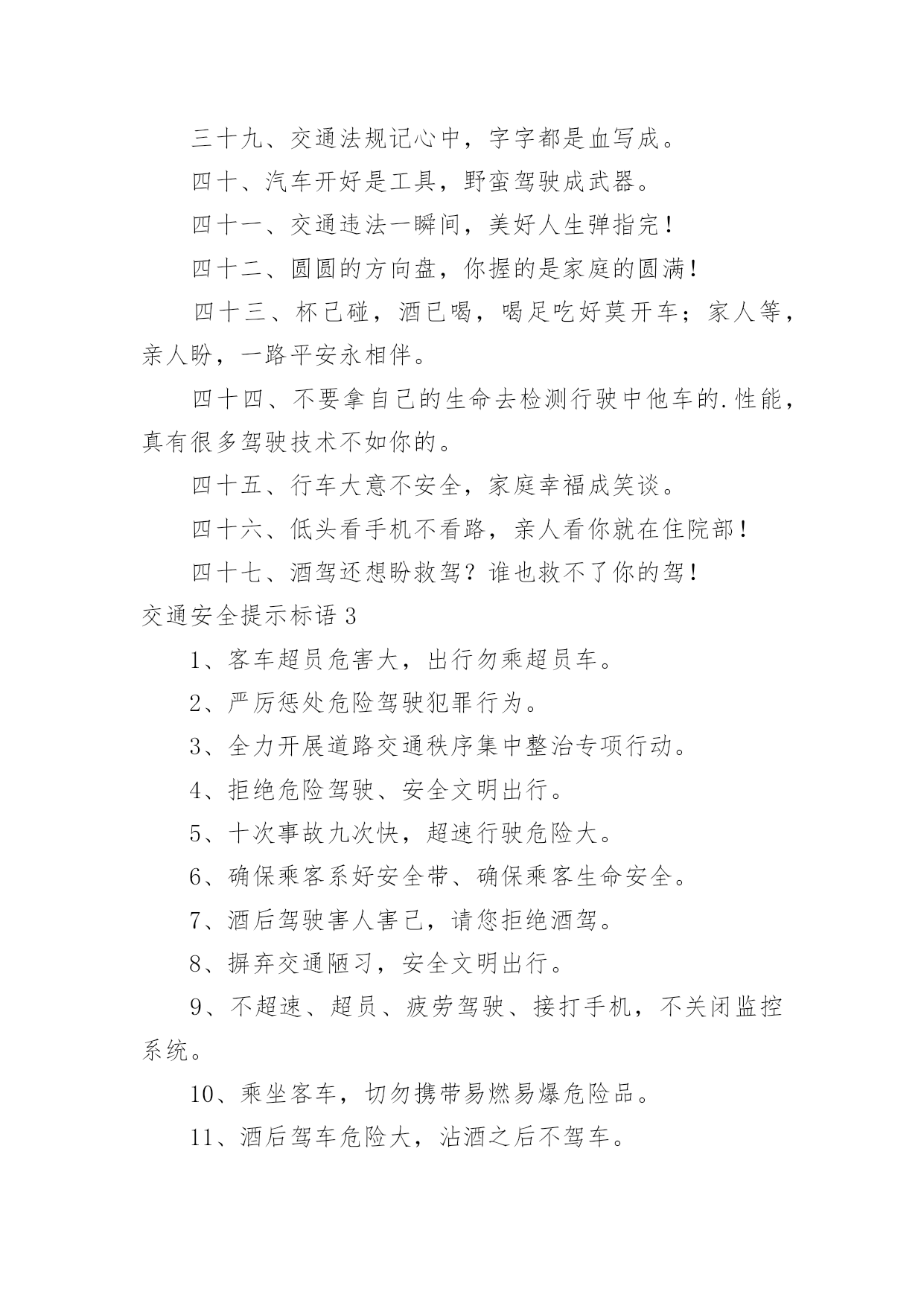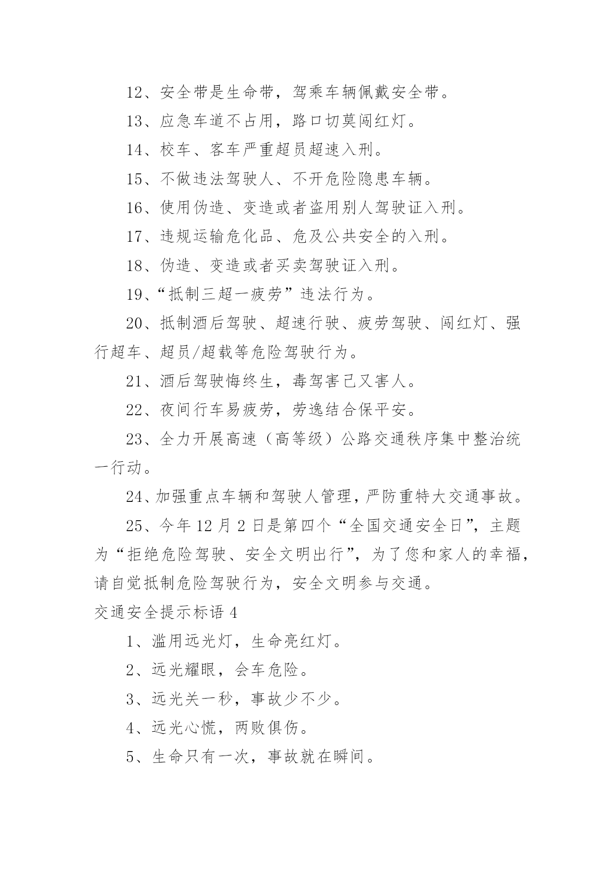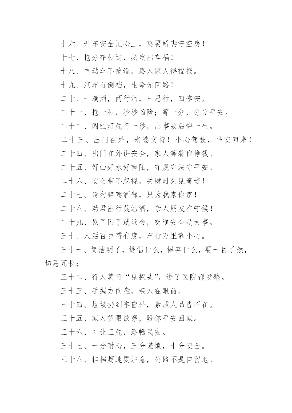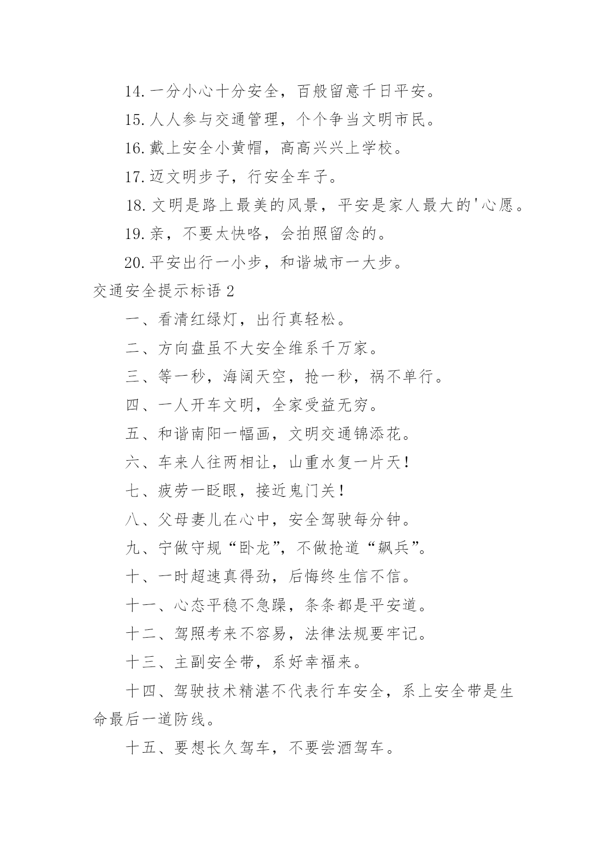 交通安全提示标语交通安全提示标语在日常学习、工作或生活中,大家都知道一些经典的标语吧,标语对人们的思维是有一定的感性作用的。那么你有真正了解过标语吗?以下是小编为大家收集的交通安全提示标语,欢迎阅读与收藏。交通安全提示标语11.红灯绿灯平安灯,实线虚线生命线。2.良药苦口利于病,交通法规利于行。3.行车时刻讲安全,全家老少能团圆。4.你对违章存侥幸,事故对你不留情。5.多骑车,少开车,拥堵少心舒畅。6.念好安全经,一生保安宁。7.大车让小车,小车让大车,车车相让;大人帮儿童,儿童帮老人,人人相帮。8.人车互礼让,道路更通畅。9.走路靠边,礼让率先。10.酒逢知己千杯少,酒后驾驶一口多。11.车可修复,人无再生。12.做谦让君子,享平安日子。13.请不要把斑马线当成起跑线。14.一分小心十分安全,百般留意千日平安。15.人人参与交通管理,个个争当文明市民。16.戴上安全小黄帽,高高兴兴上学校。17.迈文明步子,行安全车子。18.文明是路上最美的风景,平安是家人最大的'心愿。19.亲,不要太快咯,会拍照留念的。20.平安出行一小步,和谐城市一大步。交通安全提示标语2一、看清红绿灯,出行真轻松。二、方向盘虽不大安全维系千万家。三、等一秒,海阔天空,抢一秒,祸不单行。四、一人开车文明,全家受益无穷。五、和谐南阳一幅画,文明交通锦添花。六、车来人往两相让,山重水复一片天!七、疲劳一眨眼,接近鬼门关!八、父母妻儿在心中,安全驾驶每分钟。九、宁做守规“卧龙”,不做抢道“飙兵”。十、一时超速真得劲,后悔终生信不信。十一、心态平稳不急躁,条条都是平安道。十二、驾照考来不容易,法律法规要牢记。十三、主副安全带,系好幸福来。十四、驾驶技术精湛不代表行车安全,系上安全带是生命最后一道防线。十五、要想长久驾车,不要尝酒驾车。十六、开车安全记心上,莫要娇妻守空房!十七、抢分夺秒过,必定出车祸!十八、电动车不抢道,路人家人得福报。十九、汽车有倒档,生命无回路!二十、一滴酒,两行泪,三思行,四季安。二十一、抢一秒,秒秒凶险;等一分,分分平安。二十二、闯红灯先行一秒,出事故后悔一生。二十三、出门在外,老婆交待!小心驾驶,平安回来!二十四、出门在外讲安全,家人等着你挣钱。二十五、好山好水好南阳,守规守法守平安。二十六、安全带不忽视,关键时刻见奇迹!二十七、请勿醉驾酒驾,只为我家你家!二十八、劝君出行莫沾酒,亲人朋友在守候!二十九、累了困了就歇会,交通安全是大事。三十、人活百岁需有度,车行万里靠小心。三十一、简洁明了,提倡什么,摒弃什么,要一目了然,切忌冗长;三十二、行人莫行“鬼探头”,进了医院都发愁。三十三、手握方向盘,亲人在眼前。三十四、垃圾扔到车窗外,素质人品皆不在。三十五、家人望眼欲穿,盼你平安回家。三十六、礼让三先,路畅民安。三十七、一分耐心,三分谨慎,十分安全。三十八、挂档超速要注意,公路不是自留地。三十九、交通法规记心中,字字都是血写成。四十、汽车开好是工具,野蛮驾驶成武器。四十一、交通违法一瞬间,美好人生弹指完!四十二、圆圆的方向盘,你握的是家庭的圆满!四十三、杯己碰,酒已喝,喝足吃好莫开车;家人等,亲人盼,一路平安永相伴。四十四、不要拿自己的生命去检测行驶中他车的.性能,真有很多驾驶技术不如你的。四十五、行车大意不安全,家庭幸福成笑谈。四十六、低头看手机不看路,亲人看你就在住院部!四十七、酒驾还想盼救驾?谁也救不了你的驾!交通安全提示标语31、客车超员危害大,出行勿乘超员车。2、严厉惩处危险驾驶犯罪行为。3、全力开展道路交通秩序集中整治专项行动。4、拒绝危险驾驶、安全文明出行。5、十次事故九次快,超速行驶危险大。6、确保乘客系好安全带、确保乘客生命安全。7、酒后驾驶害人害己,请您拒绝酒驾。8、摒弃交通陋习,安全文明出行。9、不超速、超员、疲劳驾驶、接打手机,不关闭监控系统。10、乘坐客车,切勿携带易燃易爆危险品。11、酒后驾车危险大,沾酒之后不驾车。12、安全带是生命带,驾乘车辆佩戴安全带。13、应急车道不占用,路口切莫闯红灯。14、校车、客车严重超员超速入刑。15、不做违法驾驶人、不开危险隐患车辆。16、使用伪造、变造或者盗用别人驾驶证入刑。17、违规运输危化品、危及公共安全的入刑。18、伪造、变造或者买卖驾驶证入刑。19、“抵制三超一疲劳”违法行为。20、抵制酒后驾驶、超速行驶、疲劳驾驶、闯红灯、强行超车、超员/超载等危险驾驶行为。21、酒后驾驶悔终生,毒驾害己又害人。22、夜间行车易疲劳,劳逸结合保平安。23、全力开展高速(高等级)公路交通秩序集中整治统一行动。24、加强重点车辆和驾驶人管理,严防重特大交通事故。25、今年12月2日是第四个“全国交通安全日”,主题为“拒绝危险驾驶、安全文明出行”,为了您和家人的幸福,请自觉抵制危险驾驶行