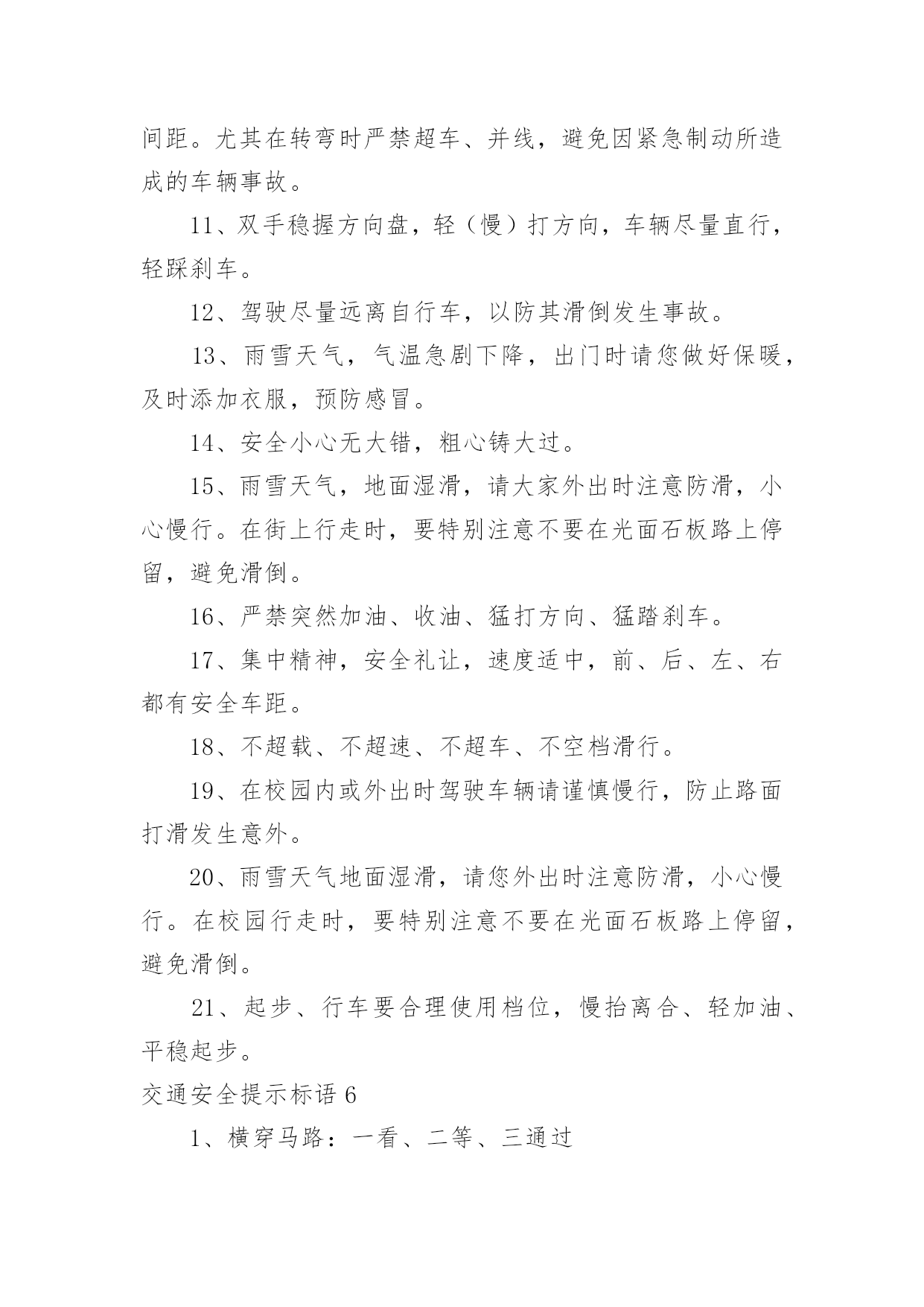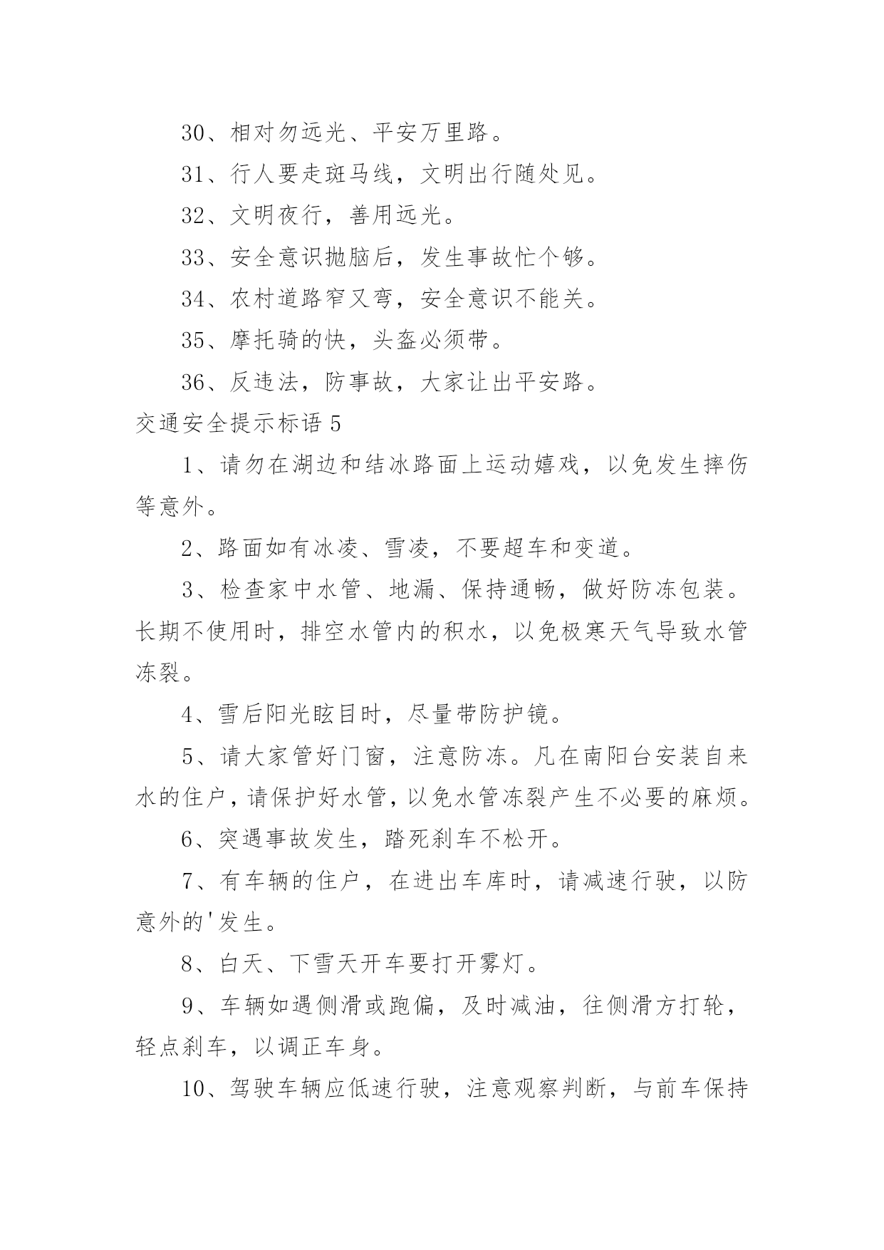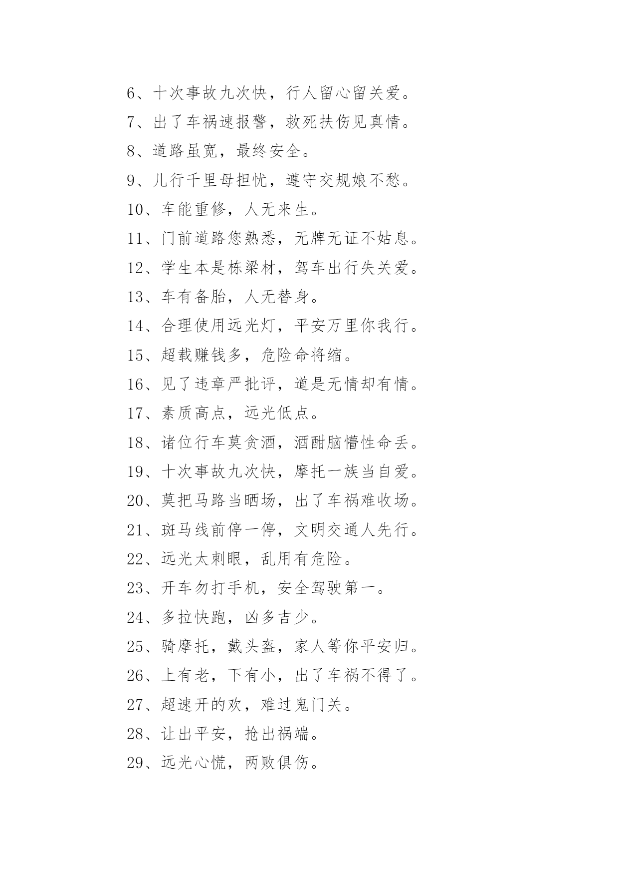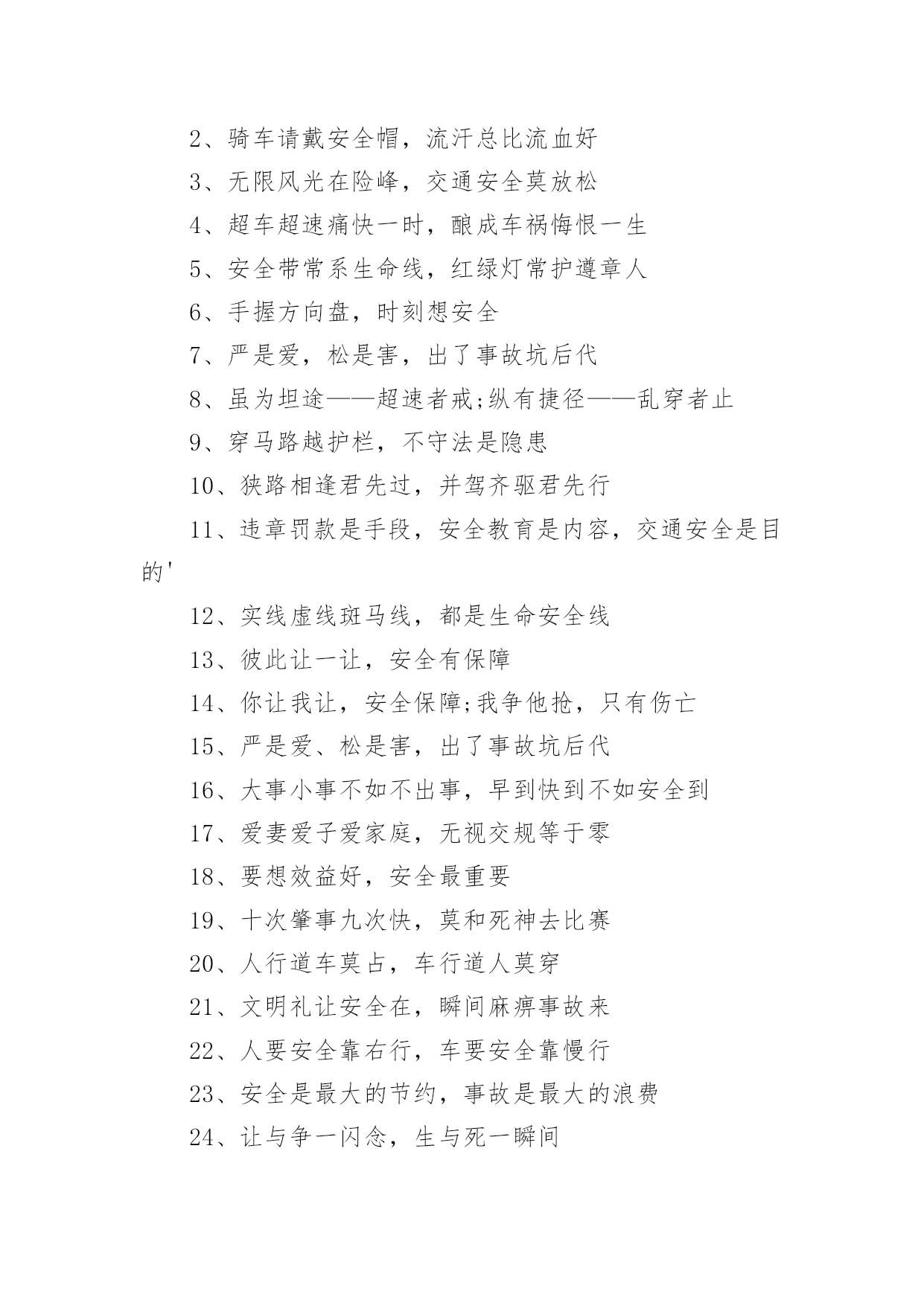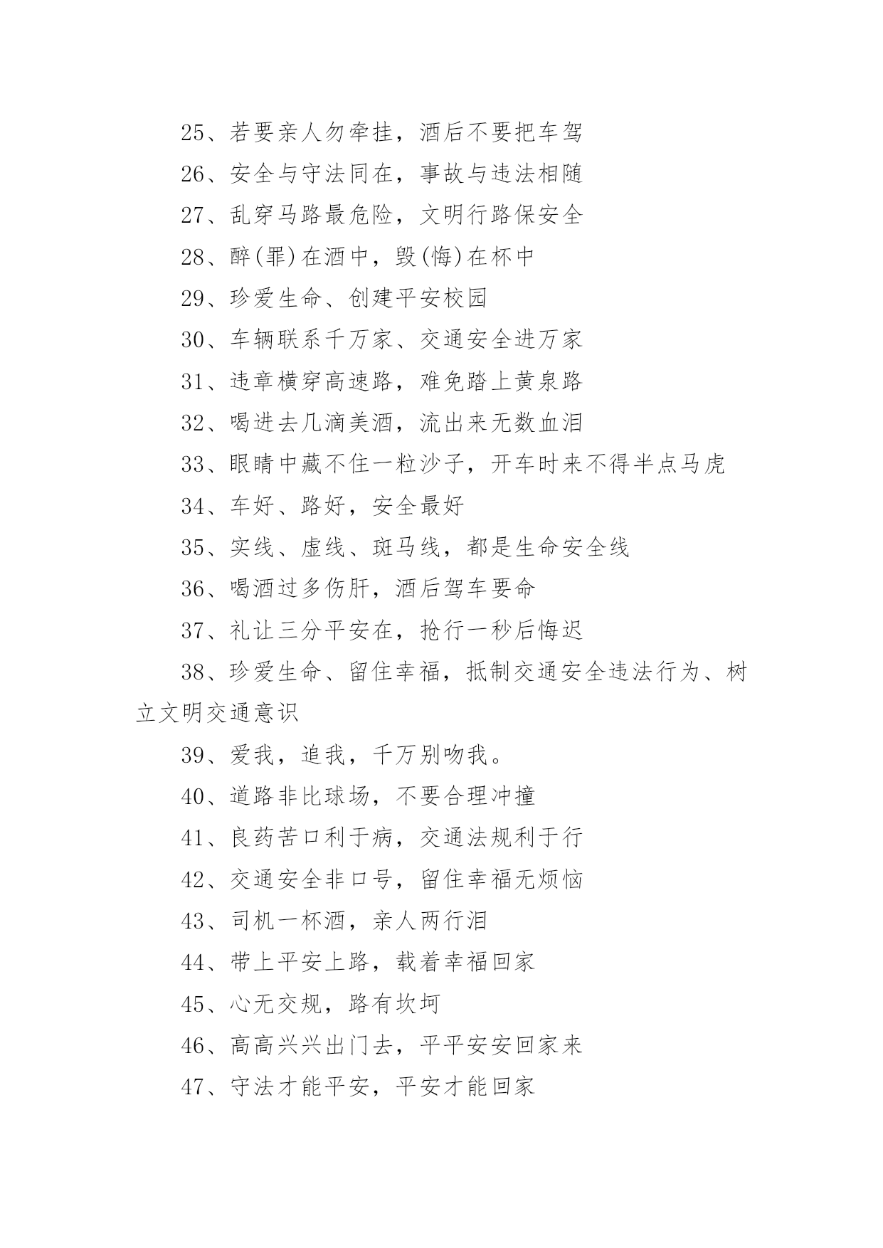交通安全提示标语交通安全提示标语在日常学习、工作或生活中,大家都知道一些经典的标语吧,标语对人们的思维是有一定的感性作用的。那么你有真正了解过标语吗?以下是小编为大家收集的交通安全提示标语,欢迎阅读与收藏。交通安全提示标语11.红灯绿灯平安灯,实线虚线生命线。2.良药苦口利于病,交通法规利于行。3.行车时刻讲安全,全家老少能团圆。4.你对违章存侥幸,事故对你不留情。5.多骑车,少开车,拥堵少心舒畅。6.念好安全经,一生保安宁。7.大车让小车,小车让大车,车车相让;大人帮儿童,儿童帮老人,人人相帮。8.人车互礼让,道路更通畅。9.走路靠边,礼让率先。10.酒逢知己千杯少,酒后驾驶一口多。11.车可修复,人无再生。12.做谦让君子,享平安日子。13.请不要把斑马线当成起跑线。14.一分小心十分安全,百般留意千日平安。15.人人参与交通管理,个个争当文明市民。16.戴上安全小黄帽,高高兴兴上学校。17.迈文明步子,行安全车子。18.文明是路上最美的风景,平安是家人最大的'心愿。19.亲,不要太快咯,会拍照留念的。20.平安出行一小步,和谐城市一大步。交通安全提示标语2一、看清红绿灯,出行真轻松。二、方向盘虽不大安全维系千万家。三、等一秒,海阔天空,抢一秒,祸不单行。四、一人开车文明,全家受益无穷。五、和谐南阳一幅画,文明交通锦添花。六、车来人往两相让,山重水复一片天!七、疲劳一眨眼,接近鬼门关!八、父母妻儿在心中,安全驾驶每分钟。九、宁做守规“卧龙”,不做抢道“飙兵”。十、一时超速真得劲,后悔终生信不信。十一、心态平稳不急躁,条条都是平安道。十二、驾照考来不容易,法律法规要牢记。十三、主副安全带,系好幸福来。十四、驾驶技术精湛不代表行车安全,系上安全带是生命最后一道防线。十五、要想长久驾车,不要尝酒驾车。十六、开车安全记心上,莫要娇妻守空房!十七、抢分夺秒过,必定出车祸!十八、电动车不抢道,路人家人得福报。十九、汽车有倒档,生命无回路!二十、一滴酒,两行泪,三思行,四季安。二十一、抢一秒,秒秒凶险;等一分,分分平安。二十二、闯红灯先行一秒,出事故后悔一生。二十三、出门在外,老婆交待!小心驾驶,平安回来!二十四、出门在外讲安全,家人等着你挣钱。二十五、好山好水好南阳,守规守法守平安。二十六、安全带不忽视,关键时刻见奇迹!二十七、请勿醉驾酒驾,只为我家你家!二十八、劝君出行莫沾酒,亲人朋友在守候!二十九、累了困了就歇会,交通安全是大事。三十、人活百岁需有度,车行万里靠小心。三十一、简洁明了,提倡什么,摒弃什么,要一目了然,切忌冗长;三十二、行人莫行“鬼探头”,进了医院都发愁。三十三、手握方向盘,亲人在眼前。三十四、垃圾扔到车窗外,素质人品皆不在。三十五、家人望眼欲穿,盼你平安回家。三十六、礼让三先,路畅民安。三十七、一分耐心,三分谨慎,十分安全。三十八、挂档超速要注意,公路不是自留地。三十九、交通法规记心中,字字都是血写成。四十、汽车开好是工具,野蛮驾驶成武器。四十一、交通违法一瞬间,美好人生弹指完!四十二、圆圆的方向盘,你握的是家庭的圆满!四十三、杯己碰,酒已喝,喝足吃好莫开车;家人等,亲人盼,一路平安永相伴。四十四、不要拿自己的生命去检测行驶中他车的.性能,真有很多驾驶技术不如你的。四十五、行车大意不安全,家庭幸福成笑谈。四十六、低头看手机不看路,亲人看你就在住院部!四十七、酒驾还想盼救驾?谁也救不了你的驾!交通安全提示标语31、客车超员危害大,出行勿乘超员车。2、严厉惩处危险驾驶犯罪行为。3、全力开展道路交通秩序集中整治专项行动。4、拒绝危险驾驶、安全文明出行。5、十次事故九次快,超速行驶危险大。6、确保乘客系好安全带、确保乘客生命安全。7、酒后驾驶害人害己,请您拒绝酒驾。8、摒弃交通陋习,安全文明出行。9、不超速、超员、疲劳驾驶、接打手机,不关闭监控系统。10、乘坐客车,切勿携带易燃易爆危险品。11、酒后驾车危险大,沾酒之后不驾车。12、安全带是生命带,驾乘车辆佩戴安全带。13、应急车道不占用,路口切莫闯红灯。14、校车、客车严重超员超速入刑。15、不做违法驾驶人、不开危险隐患车辆。16、使用伪造、变造或者盗用别人驾驶证入刑。17、违规运输危化品、危及公共安全的入刑。18、伪造、变造或者买卖驾驶证入刑。19、“抵制三超一疲劳”违法行为。20、抵制酒后驾驶、超速行驶、疲劳驾驶、闯红灯、强行超车、超员/超载等危险驾驶行为。21、酒后驾驶悔终生,毒驾害己又害人。22、夜间行车易疲劳,劳逸结合保平安。23、全力开展高速(高等级)公路交通秩序集中整治统一行动。24、加强重点车辆和驾驶人管理,严防重特大交通事故。25、今年12月2日是第四个“全国交通安全日”,主题为“拒绝危险驾驶、安全文明出行”,为了您和家人的幸福,请自觉抵制危险驾驶行