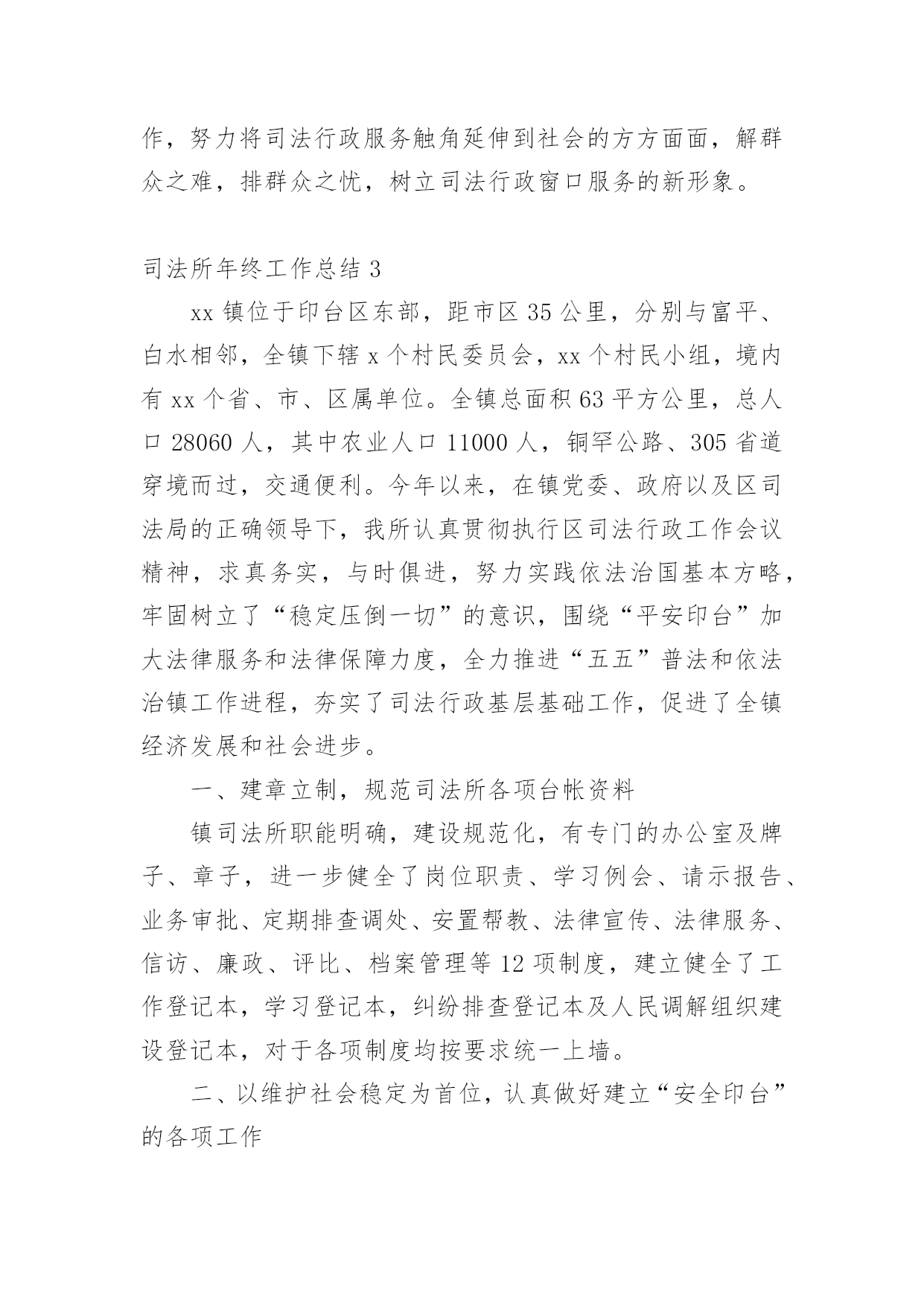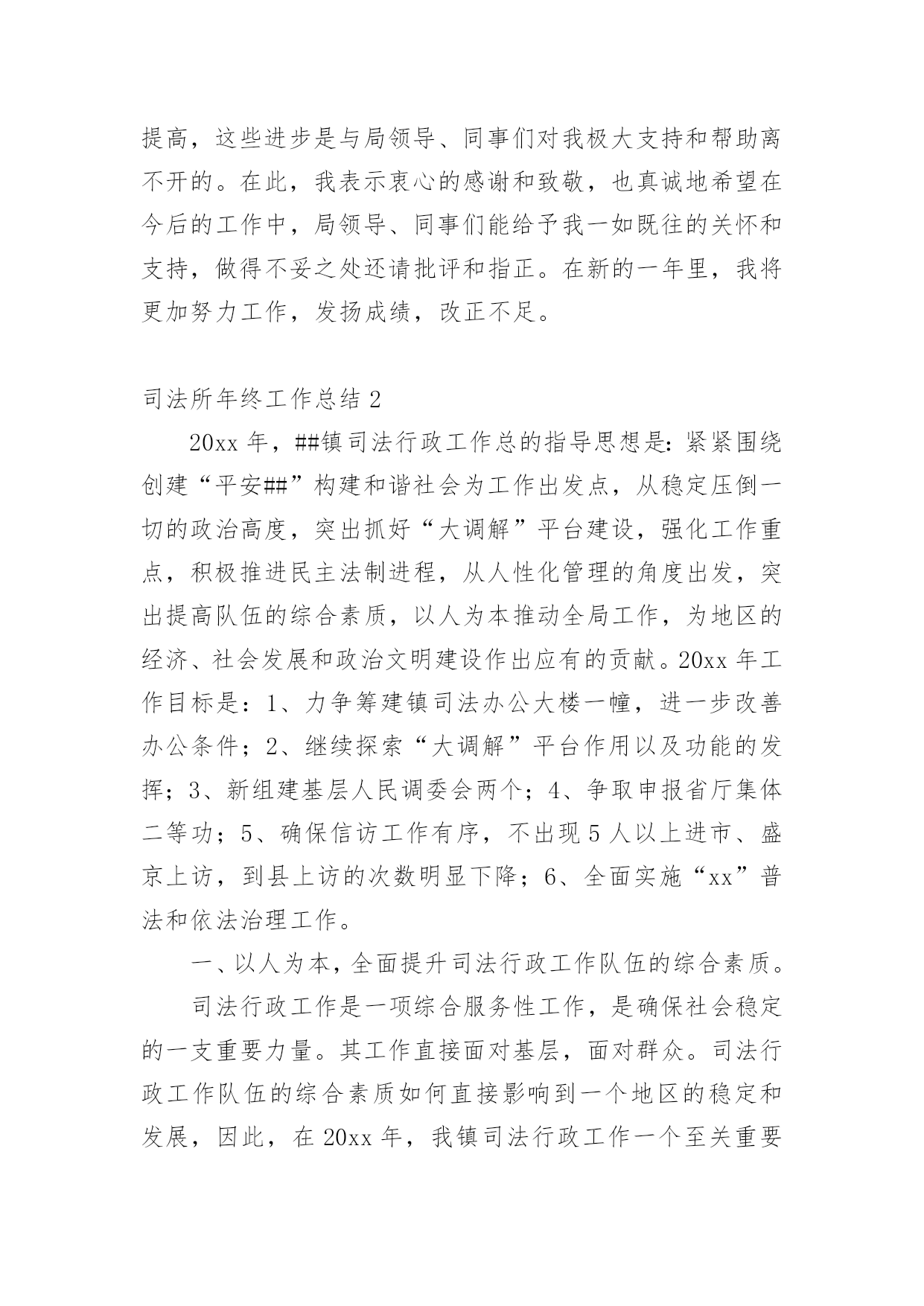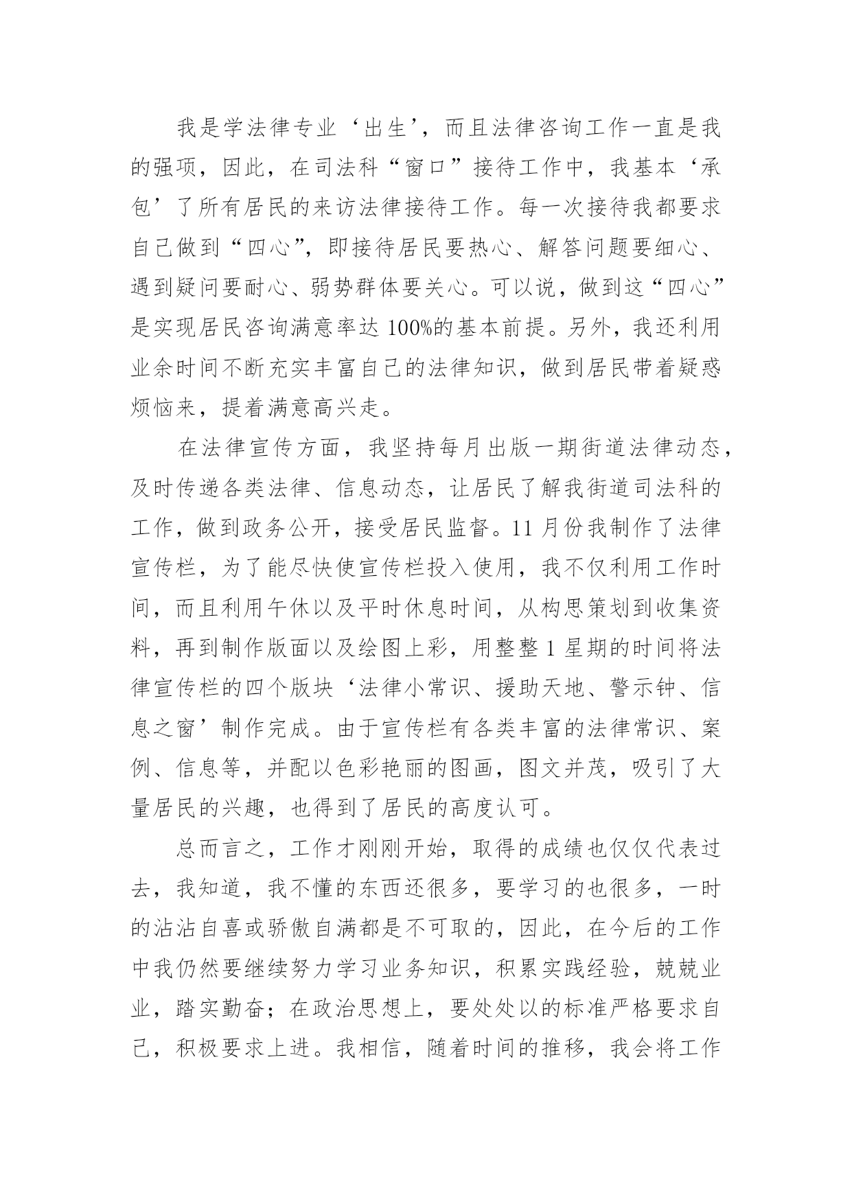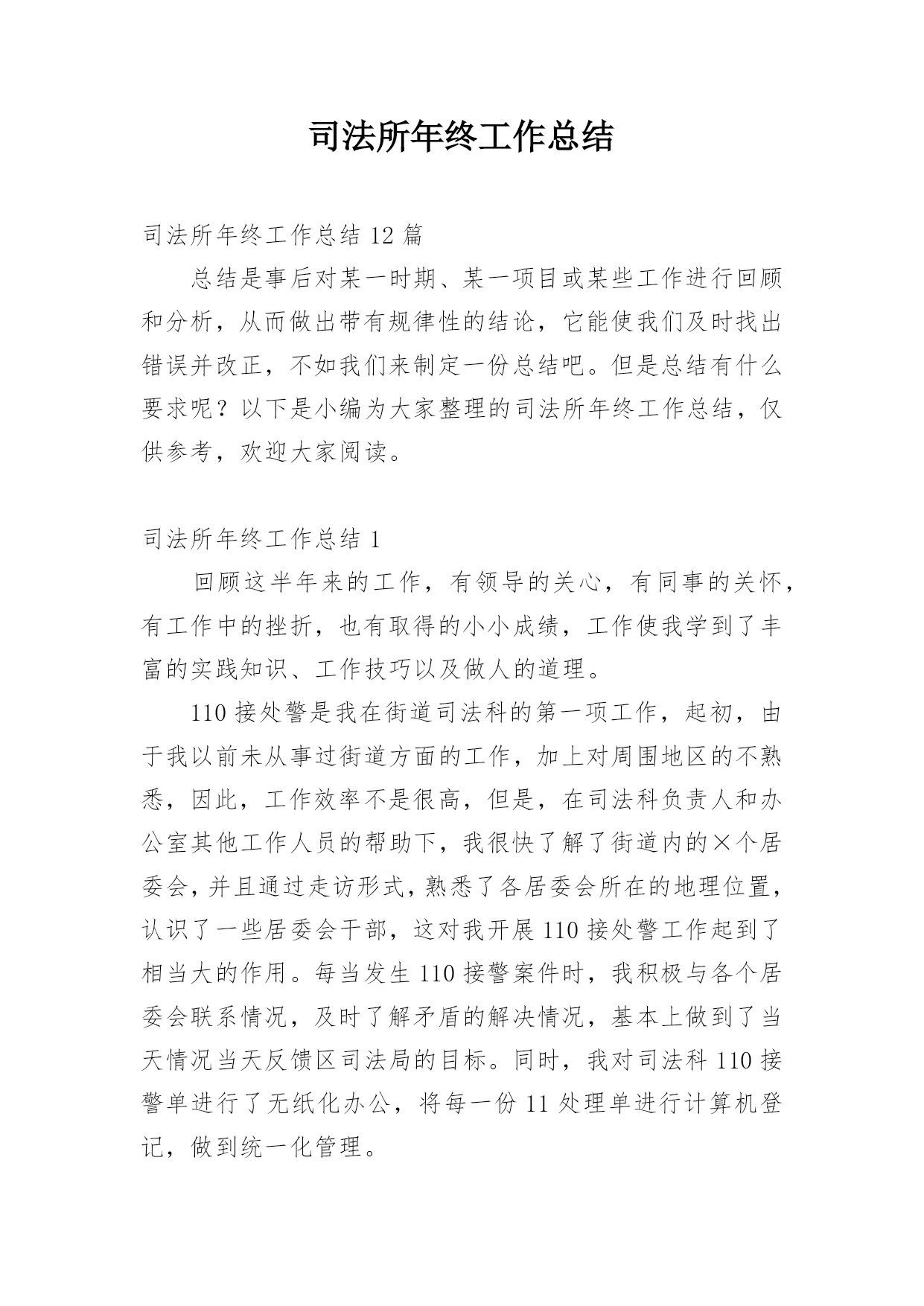司法所年终工作总结司法所年终工作总结12篇总结是事后对某一时期、某一项目或某些工作进行回顾和分析,从而做出带有规律性的结论,它能使我们及时找出错误并改正,不如我们来制定一份总结吧。但是总结有什么要求呢?以下是小编为大家整理的司法所年终工作总结,仅供参考,欢迎大家阅读。司法所年终工作总结1回顾这半年来的工作,有领导的关心,有同事的关怀,有工作中的挫折,也有取得的小小成绩,工作使我学到了丰富的实践知识、工作技巧以及做人的道理。110接处警是我在街道司法科的第一项工作,起初,由于我以前未从事过街道方面的工作,加上对周围地区的不熟悉,因此,工作效率不是很高,但是,在司法科负责人和办公室其他工作人员的帮助下,我很快了解了街道内的×个居委会,并且通过走访形式,熟悉了各居委会所在的地理位置,认识了一些居委会干部,这对我开展110接处警工作起到了相当大的作用。每当发生110接警案件时,我积极与各个居委会联系情况,及时了解矛盾的解决情况,基本上做到了当天情况当天反馈区司法局的目标。同时,我对司法科110接警单进行了无纸化办公,将每一份11处理单进行计算机登记,做到统一化管理。我是学法律专业‘出生’,而且法律咨询工作一直是我的强项,因此,在司法科“窗口”接待工作中,我基本‘承包’了所有居民的来访法律接待工作。每一次接待我都要求自己做到“四心”,即接待居民要热心、解答问题要细心、遇到疑问要耐心、弱势群体要关心。可以说,做到这“四心”是实现居民咨询满意率达100%的基本前提。另外,我还利用业余时间不断充实丰富自己的法律知识,做到居民带着疑惑烦恼来,提着满意高兴走。在法律宣传方面,我坚持每月出版一期街道法律动态,及时传递各类法律、信息动态,让居民了解我街道司法科的工作,做到政务公开,接受居民监督。11月份我制作了法律宣传栏,为了能尽快使宣传栏投入使用,我不仅利用工作时间,而且利用午休以及平时休息时间,从构思策划到收集资料,再到制作版面以及绘图上彩,用整整1星期的时间将法律宣传栏的四个版块‘法律小常识、援助天地、警示钟、信息之窗’制作完成。由于宣传栏有各类丰富的法律常识、案例、信息等,并配以色彩艳丽的图画,图文并茂,吸引了大量居民的兴趣,也得到了居民的高度认可。总而言之,工作才刚刚开始,取得的成绩也仅仅代表过去,我知道,我不懂的东西还很多,要学习的也很多,一时的沾沾自喜或骄傲自满都是不可取的,因此,在今后的工作中我仍然要继续努力学习业务知识,积累实践经验,兢兢业业,踏实勤奋;在政治思想上,要处处以的标准严格要求自己,积极要求上进。我相信,随着时间的推移,我会将工作做得更好。在各位领导的指导下,在同志们的支持和帮助下,我紧紧围绕我局的中心工作,充分发挥岗位职能,不断改进工作方法,较好地履行了工作职责,完成工作任务。现将工作情况作以简要汇报。一是勤于学习,提高政治水平和业务素质。利用工作和业余时间系统地学习各项理论知识,经过不断积累经验,能够较为从容地处理日常工作中出现的各类问题,保证本岗位各项工作的'正常运行,在实施各项工作的过程中,没出现过明显失误。二是勤于动笔,增强文字功底和思维能力。为提高自身写作能力,我从已经成型的材料入手,边写边改,边练边记,在这方面,各位领导和同志们给予我很多建议帮助,使我荣获河北省财政系统公文写作比赛优秀奖。三是勤于沟通,加强关系处理和主动补位。能与其他股室人员密切配合,互相支持,保证整体工作不出现纰漏。在工作中明确工作原则,本职工作要保质保量完成,不属于自己本职工作范围的,也要配合其他人员按时完成,做到主动帮忙、热情服务。虽然这一年的工作中我取得一些成绩,但还存在一定的问题和不足。一是工作有急躁情绪,有时工作急于求成,反而影响了工作的进度和质量;二是处理部分工作时还不能得心应手,当出现新的主题活动时,显得无从着手。20xx年,我从思想认识上、业务及理论知识上有了明显提高,这些进步是与局领导、同事们对我极大支持和帮助离不开的。在此,我表示衷心的感谢和致敬,也真诚地希望在今后的工作中,局领导、同事们能给予我一如既往的关怀和支持,做得不妥之处还请批评和指正。在新的一年里,我将更加努力工作,发扬成绩,改正不足。司法所年终工作总结220xx年,##镇司法行政工作总的指导思想是:紧紧围绕创建“平安##”构建和谐社会为工作出发点,从稳定压倒一切的政治高度,突出抓好“大调解”平台建设,强化工作重点,积极推进民主法制进程,从人性化管理的角度出发,突出提高队伍的综合素质,以人为本推动全局工作,为地区的经济、社会发展和政治文明建设作出应有的贡献。20xx年工作目标是:1、力争筹建镇司法办公大楼一幢,进一步改善办公条件;2、继续探索“大调解”平台作用以及功能的发挥;3、新组建基层人民调委会两个;4、争取申报省厅集体二等功;5、确保信访工作有序,